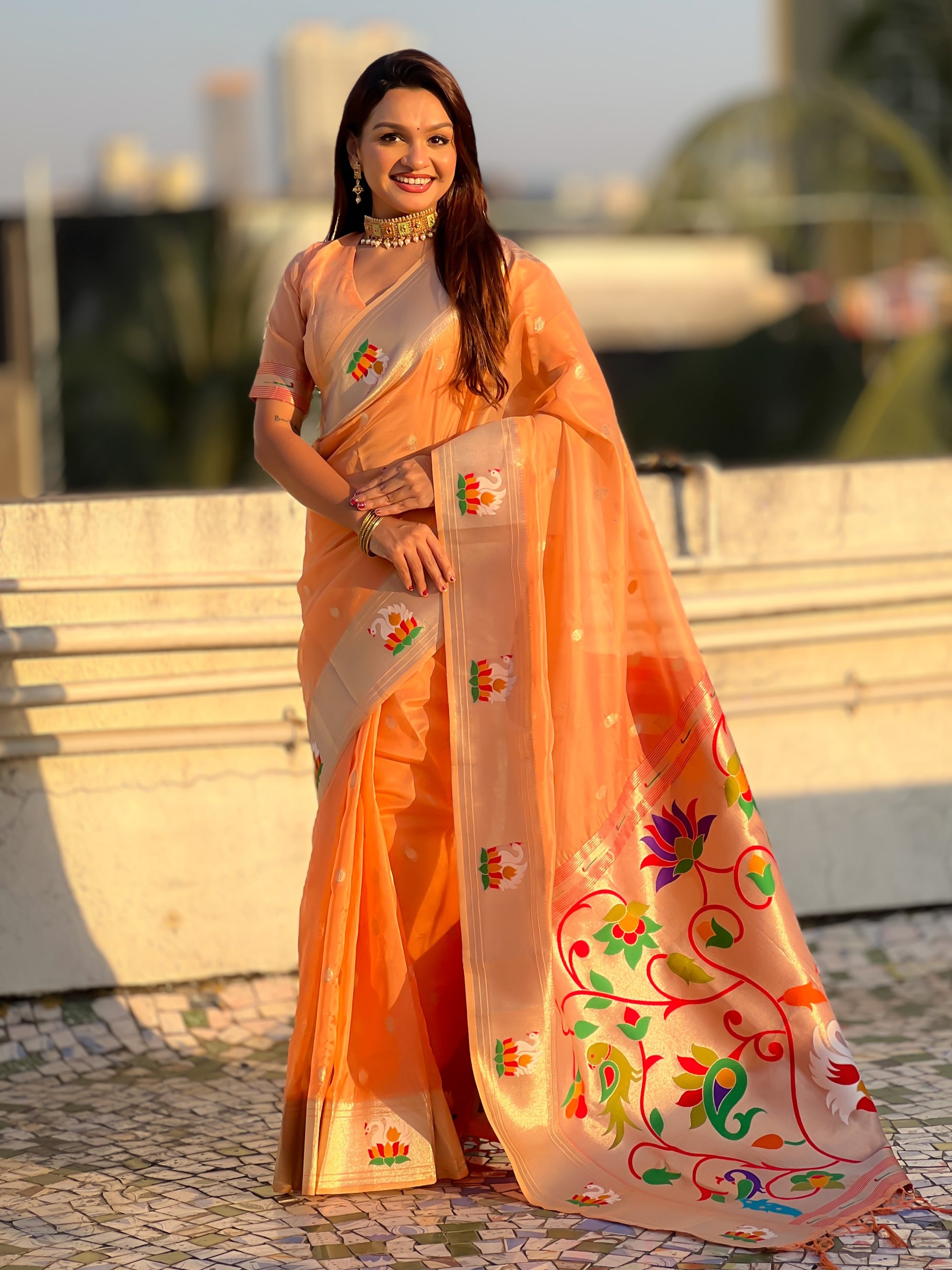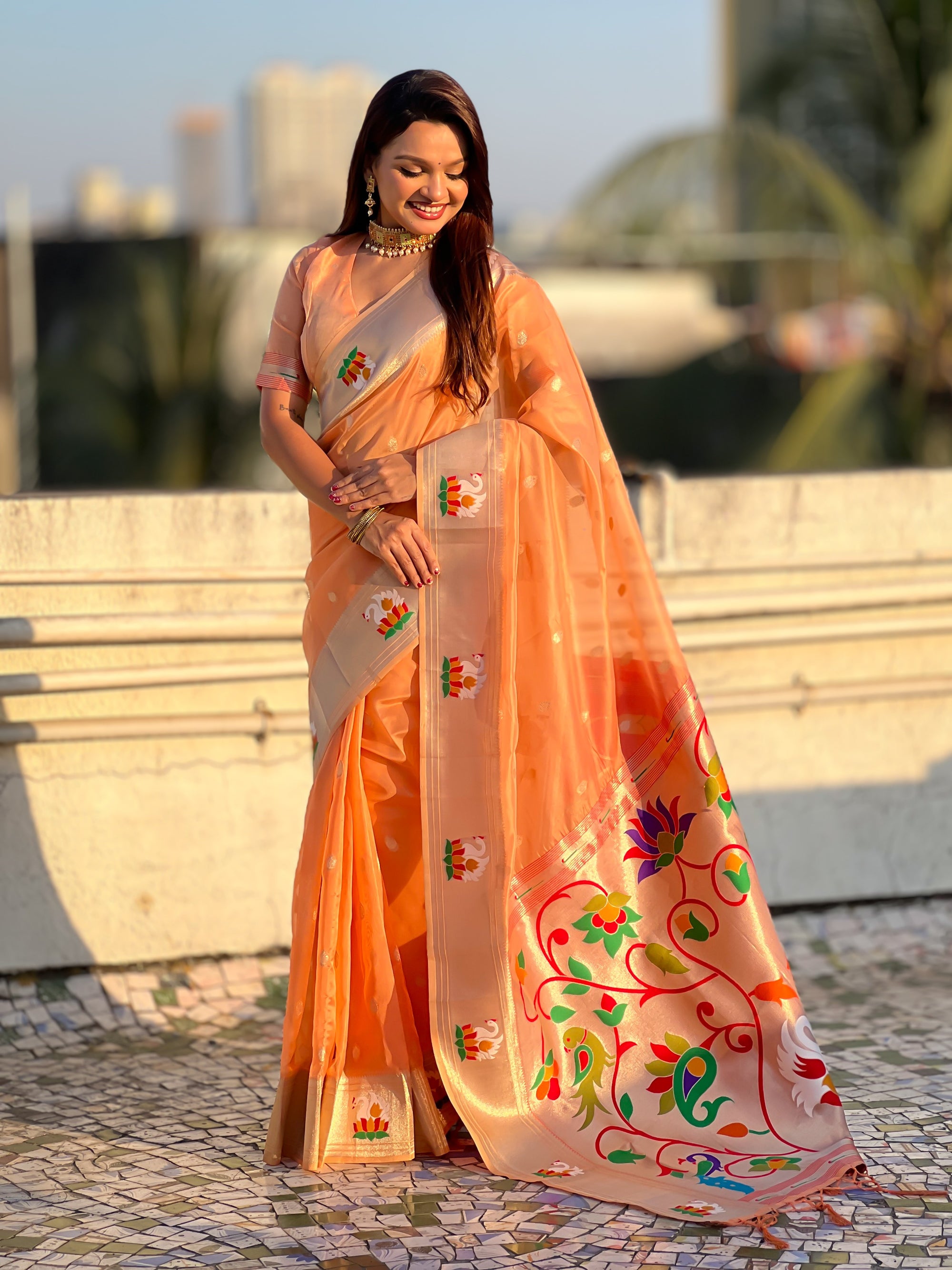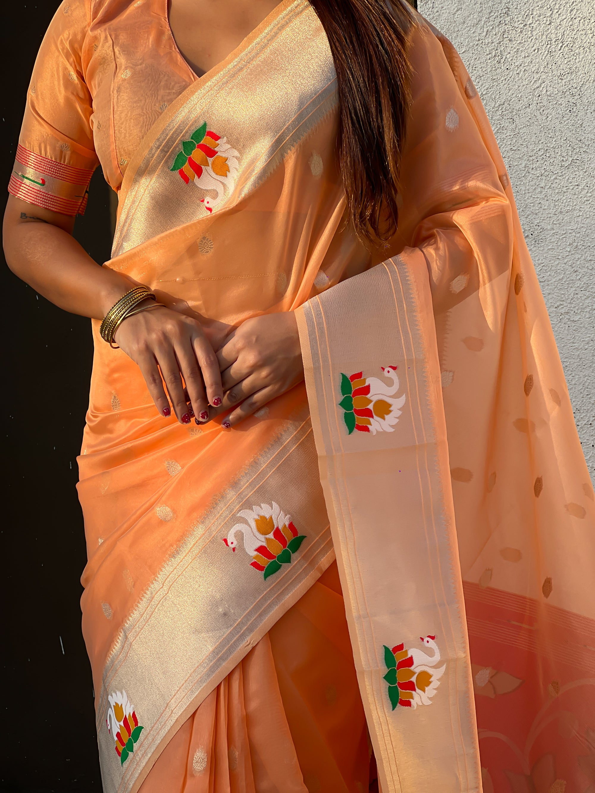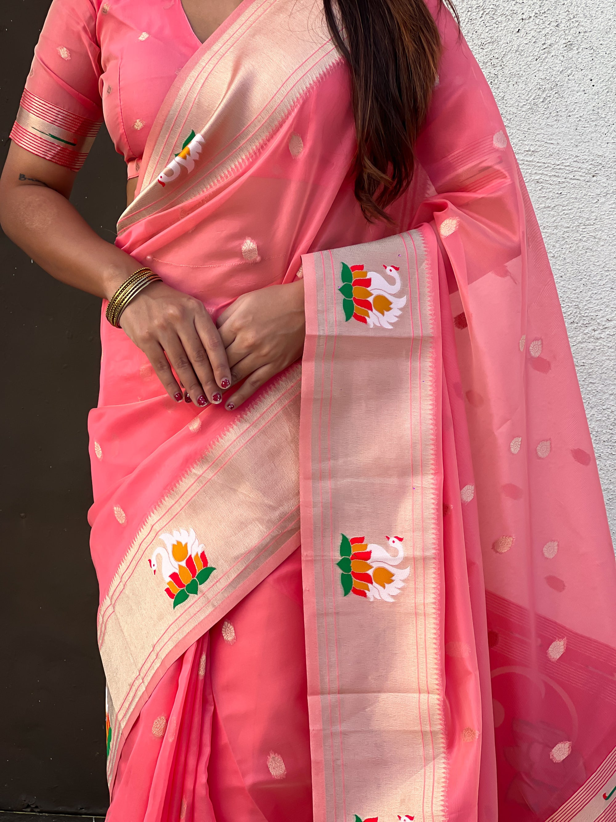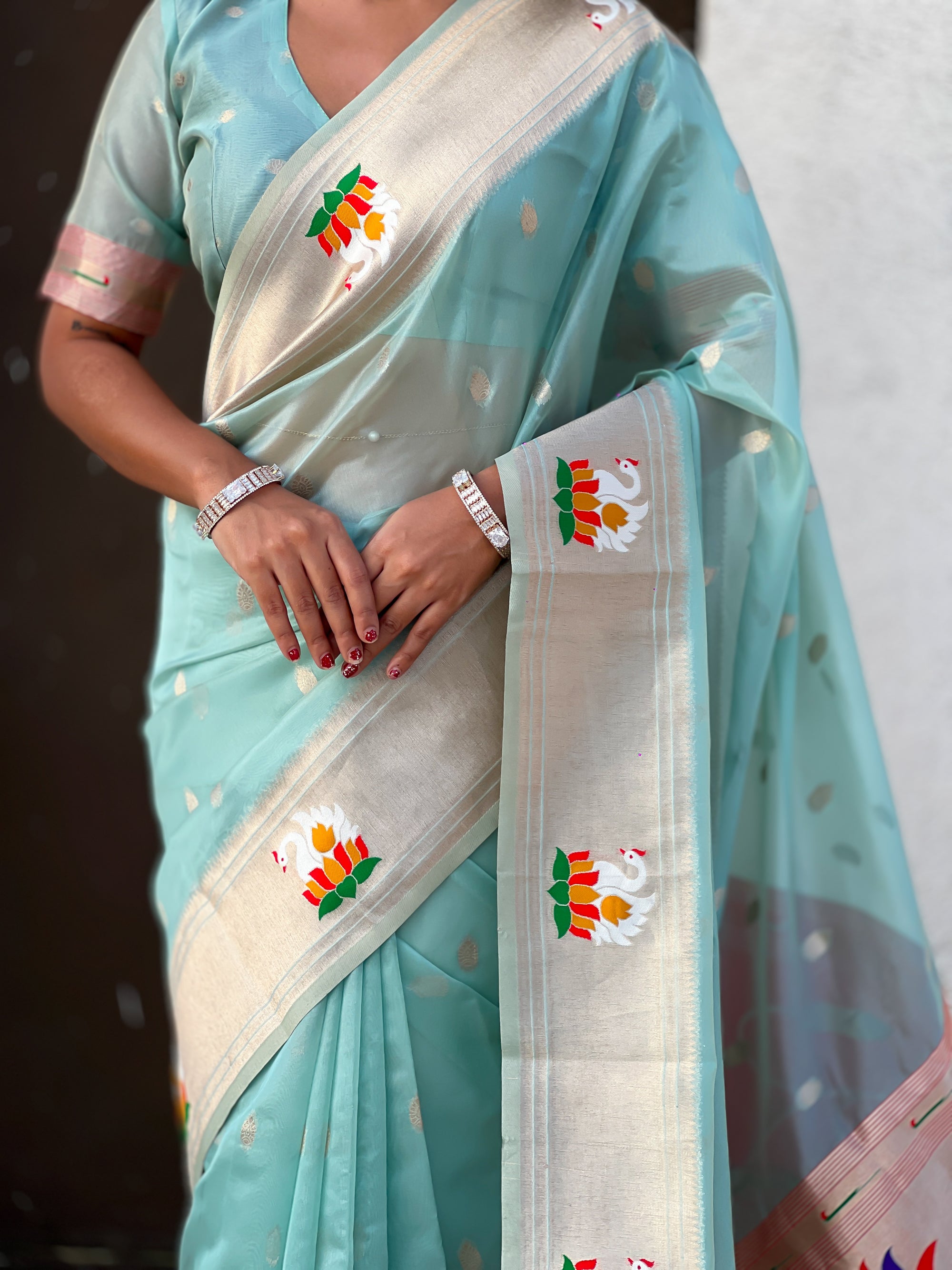 Organza silk sarees are known for their lightweight, airy texture and sheer elegance. Crafted from fine silk, these sarees feature a delicate and crisp fabric that drapes beautifully. Often adorned with intricate embroidery or minimalistic designs, organza silk sarees offer a sophisticated and graceful look, making them perfect for weddings, receptions, and festive occasions.
