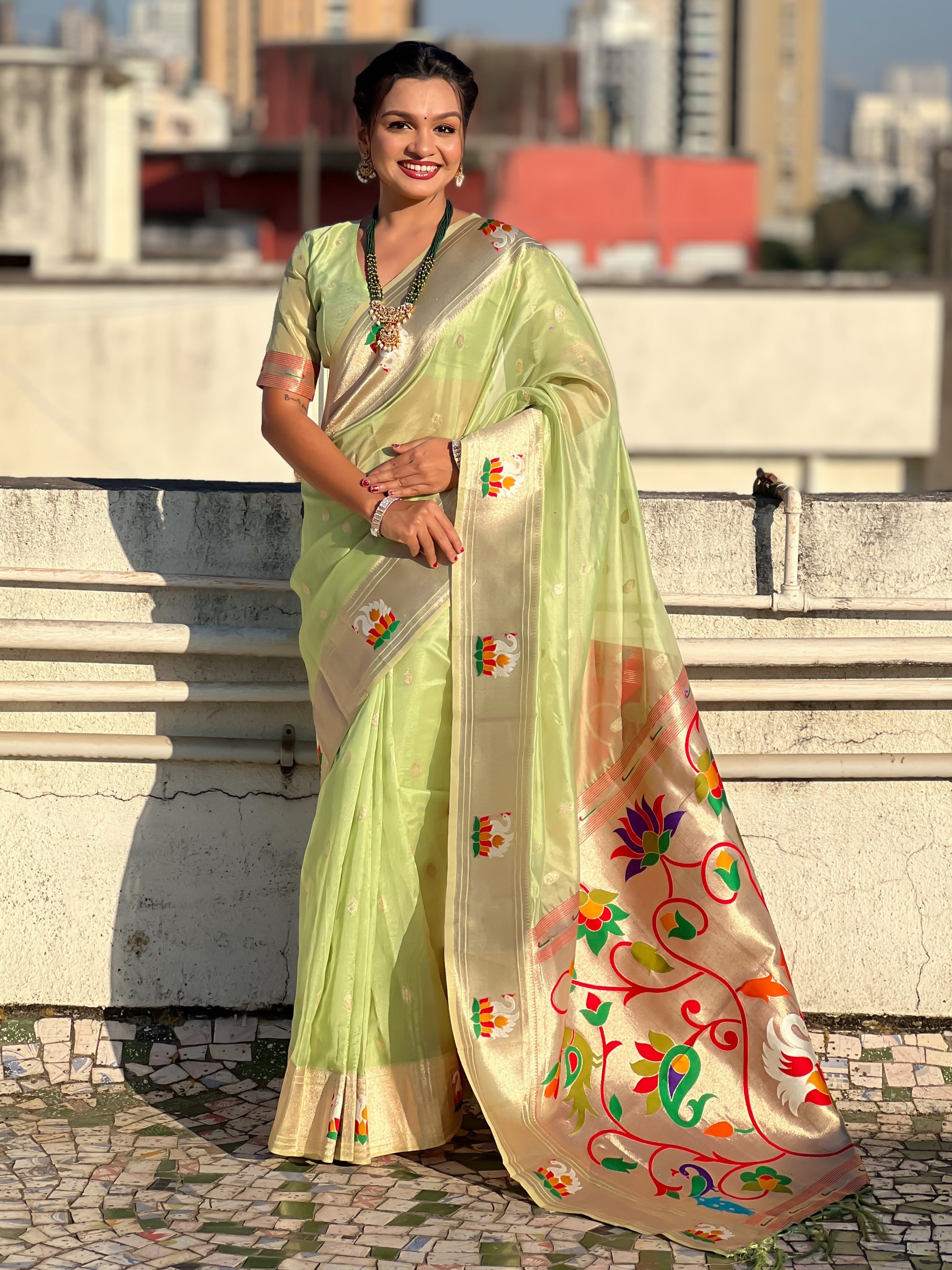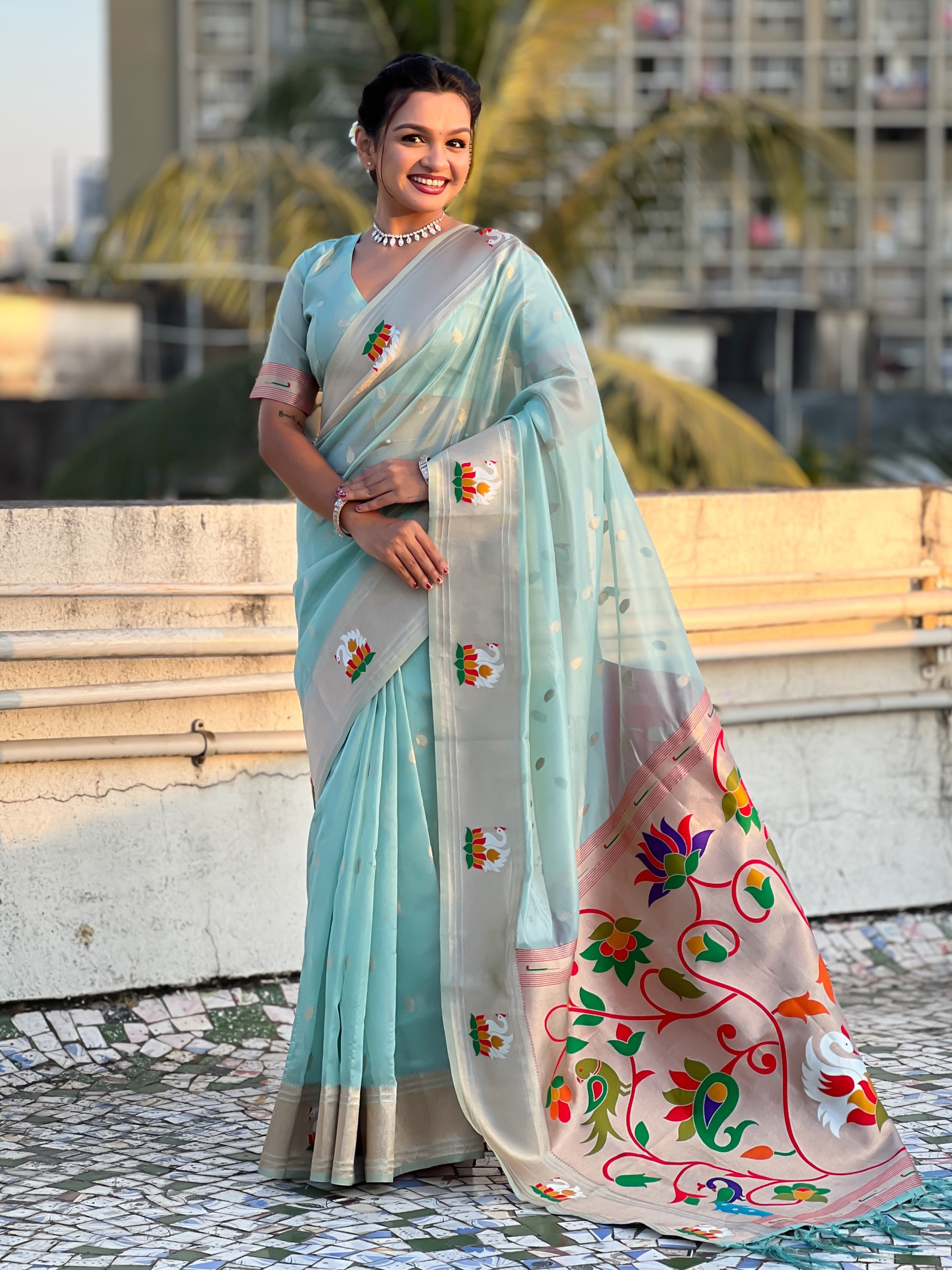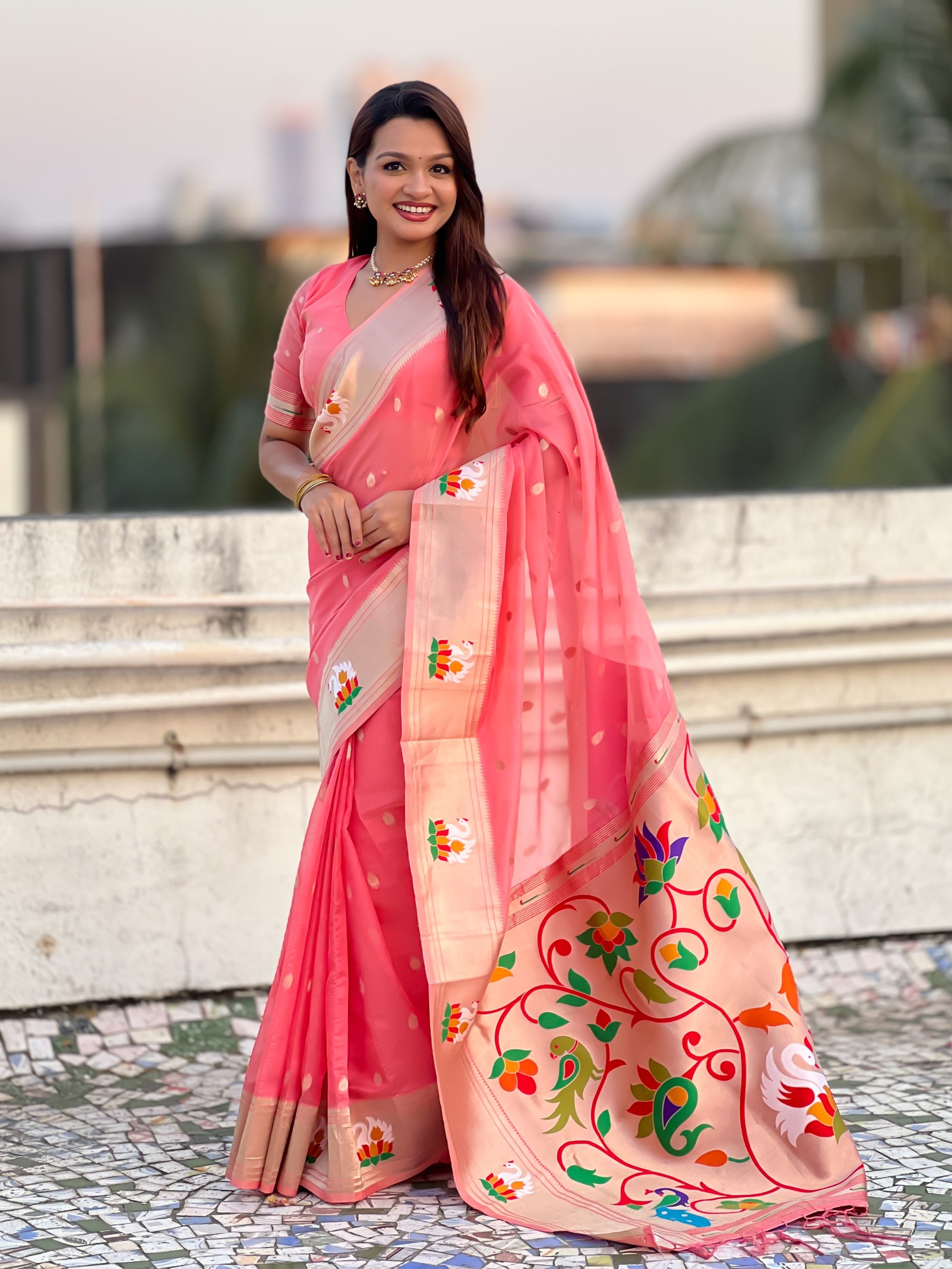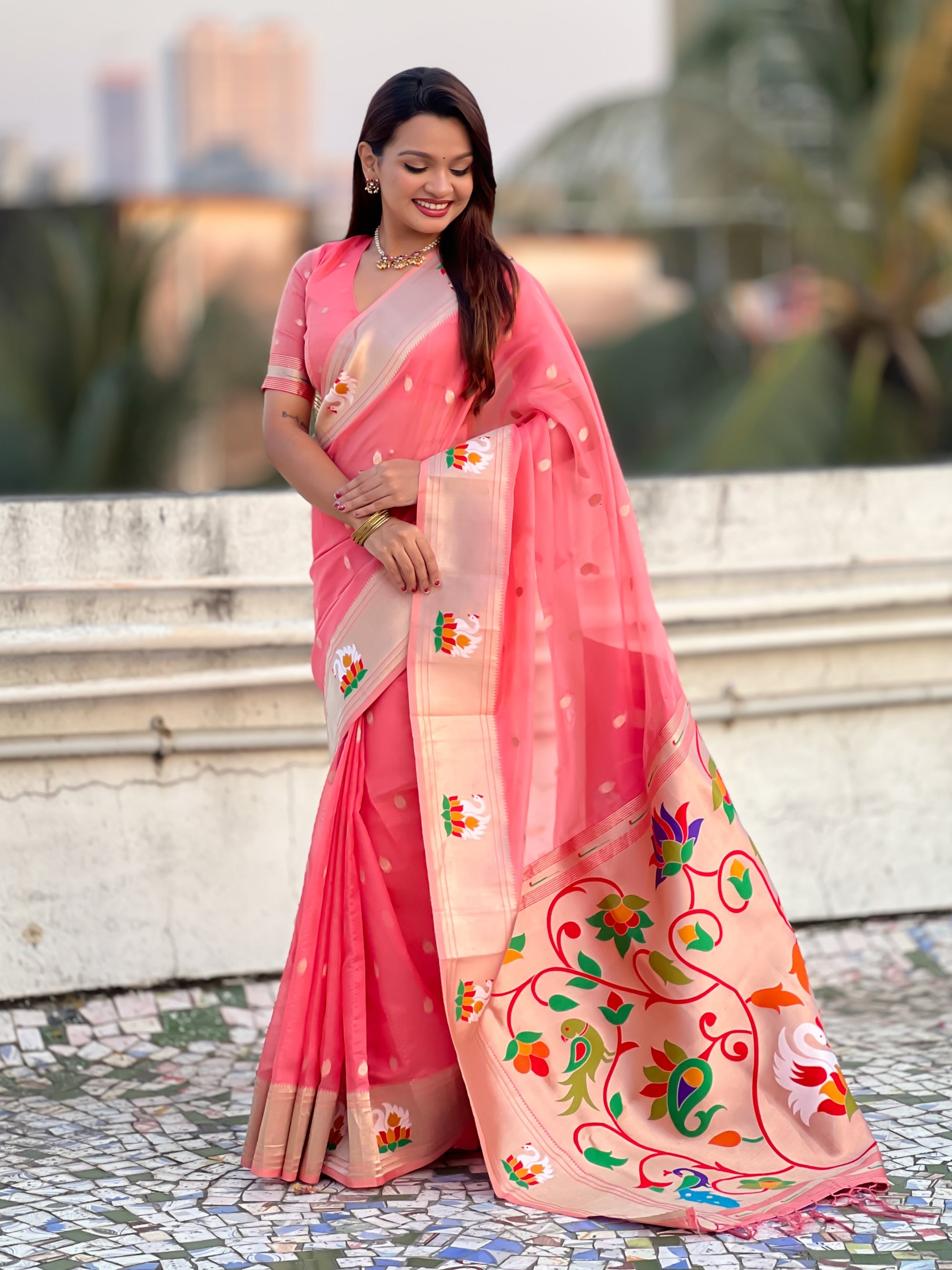 Organza silk sarees are known for their lightweight, airy texture and sheer elegance. Crafted from fine silk, these sarees feature a delicate and crisp fabric that drapes beautifully. Often adorned with intricate embroidery or minimalistic designs, organza silk sarees offer a sophisticated and graceful look, making them perfect for weddings, receptions, and festive occasions.