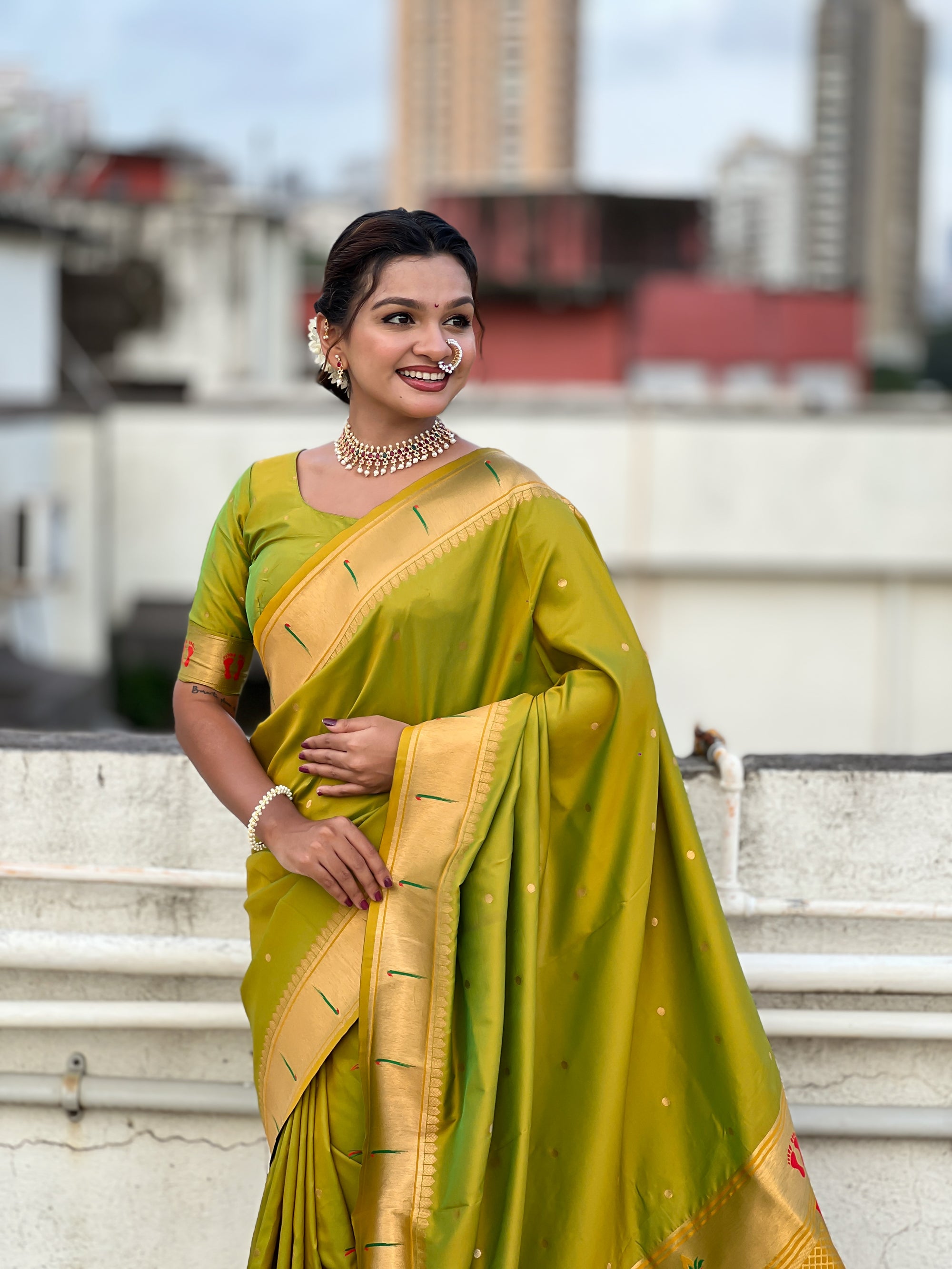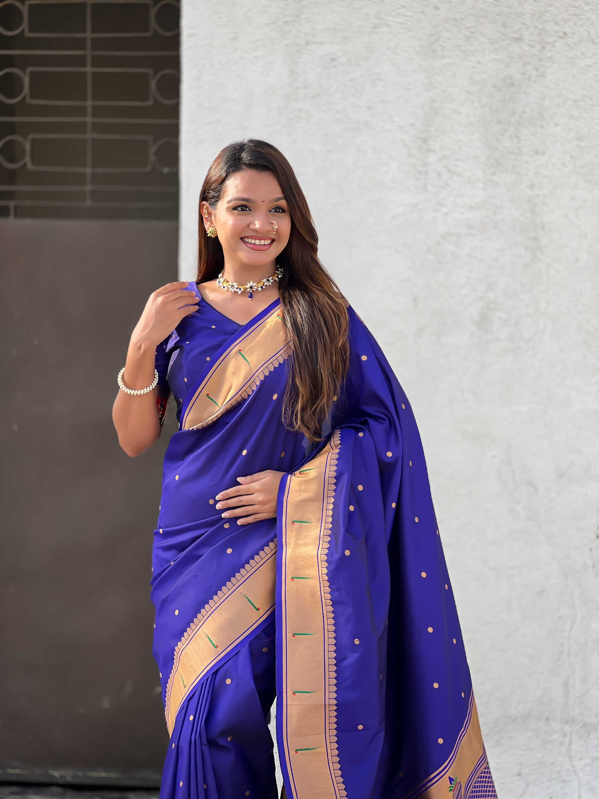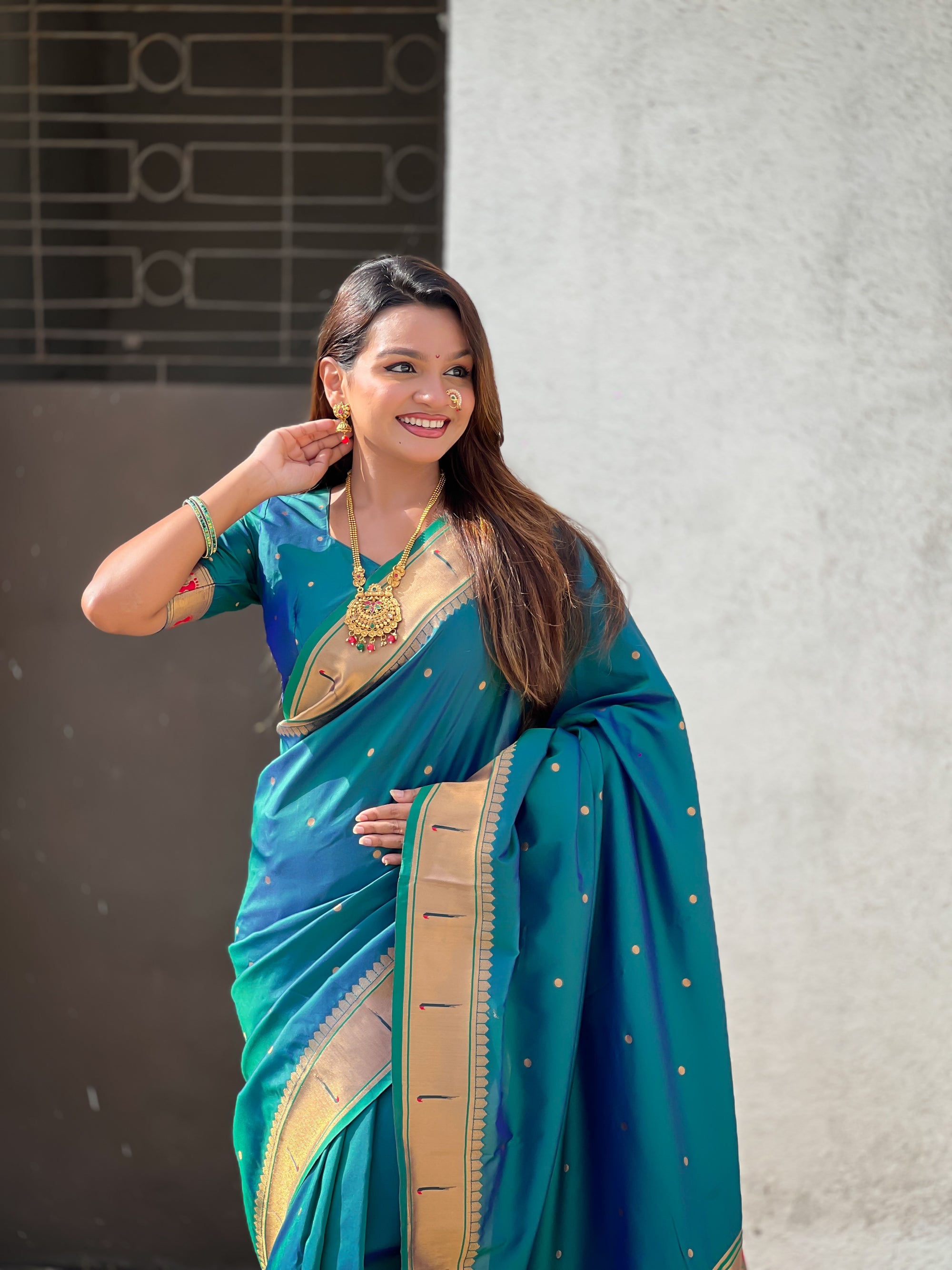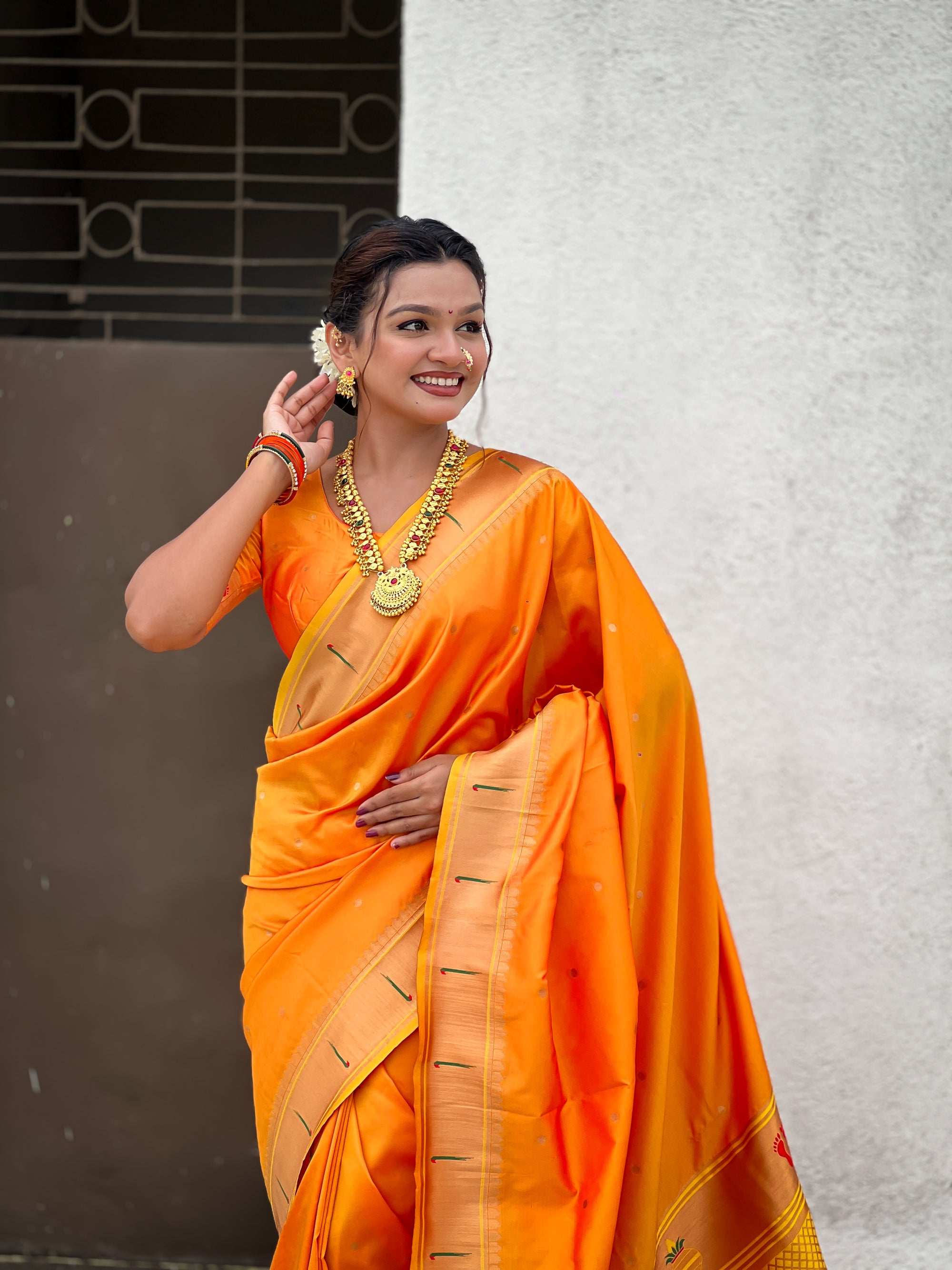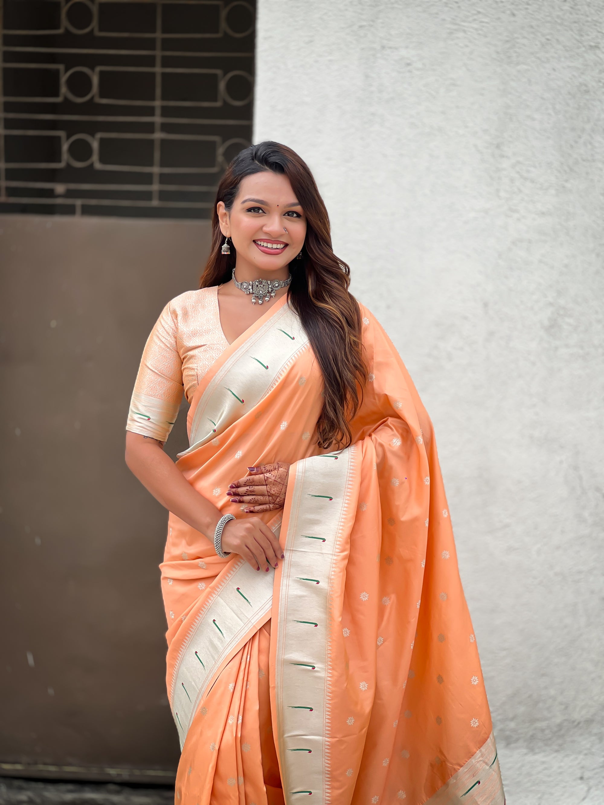 The Paithani saree is a true symbol of grace and heritage, crafted with luxurious silk and vibrant colors. Its intricate zari work, adorned with beautiful peacock and floral motifs, reflects unmatched artistry. A perfect blend of tradition and elegance, it is a treasure that enhances the beauty of every occasion, making every woman feel royal and radiant.