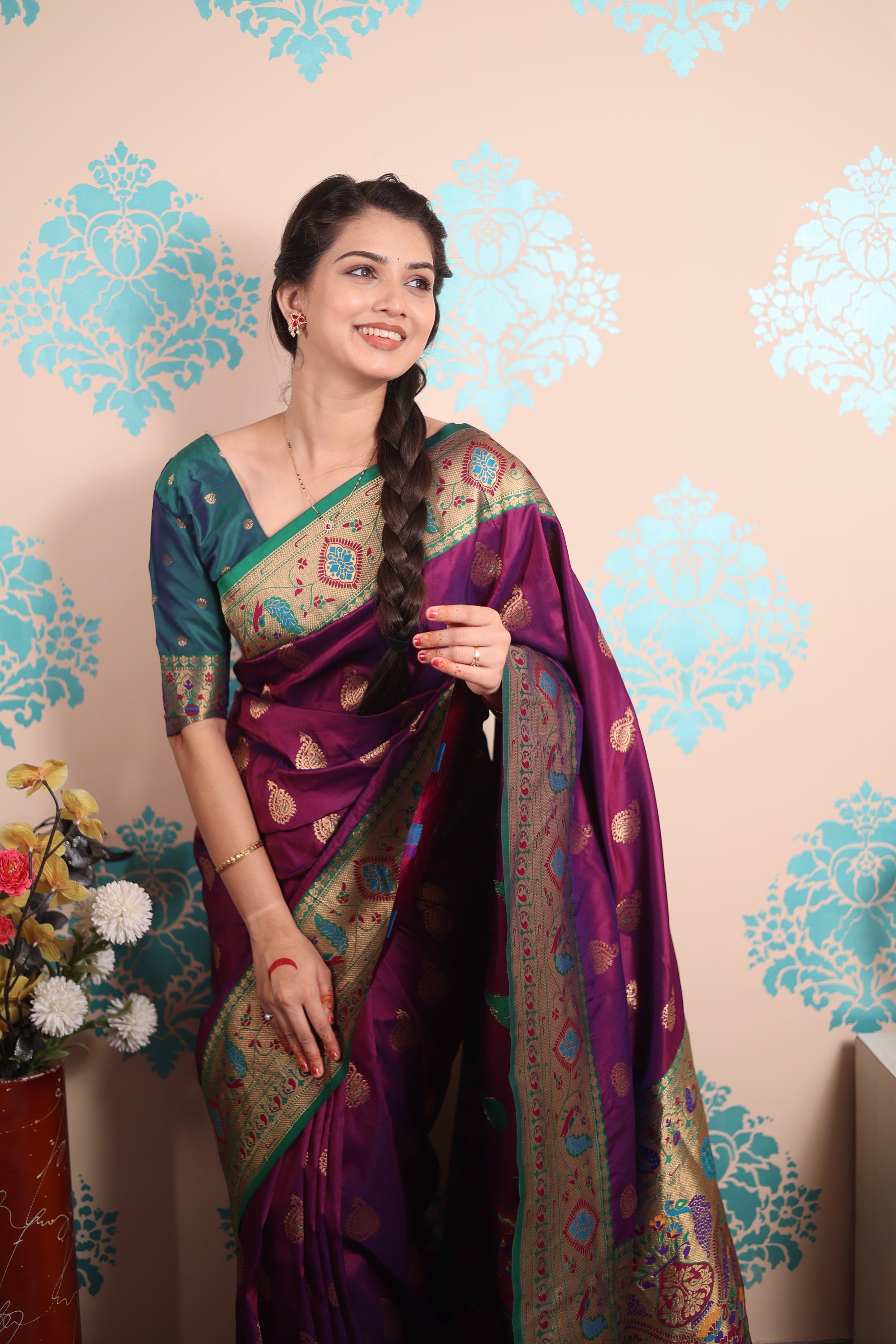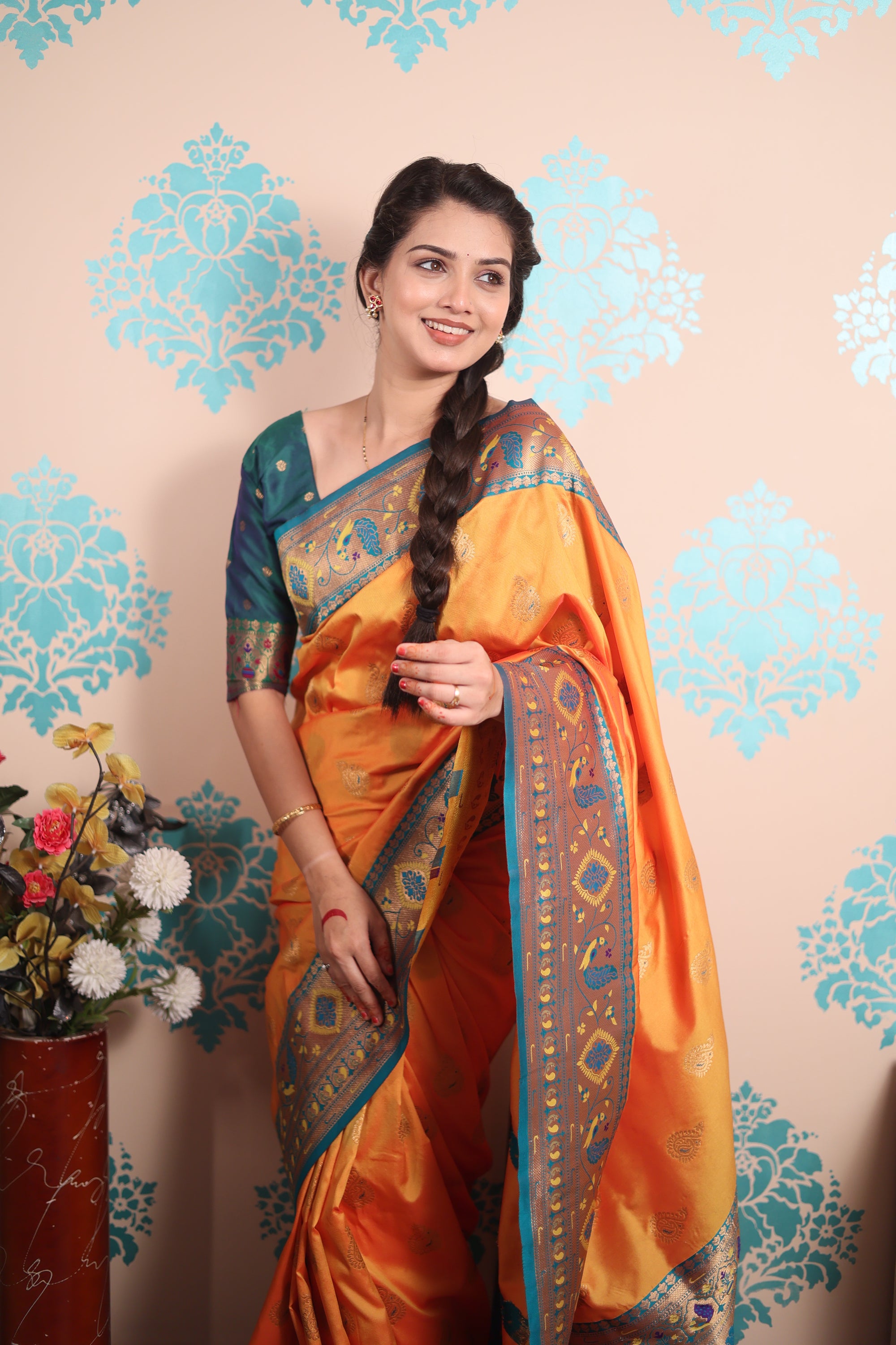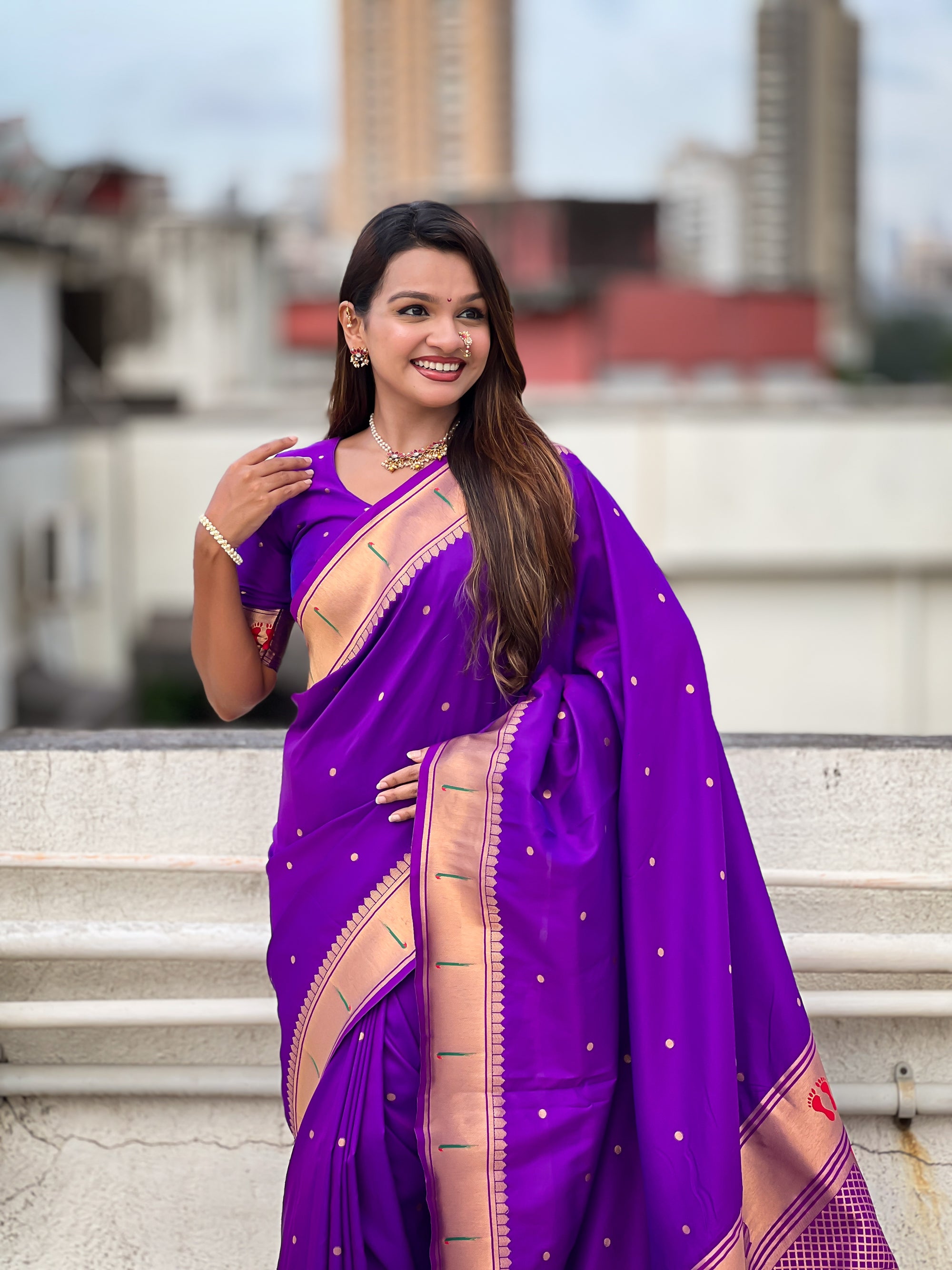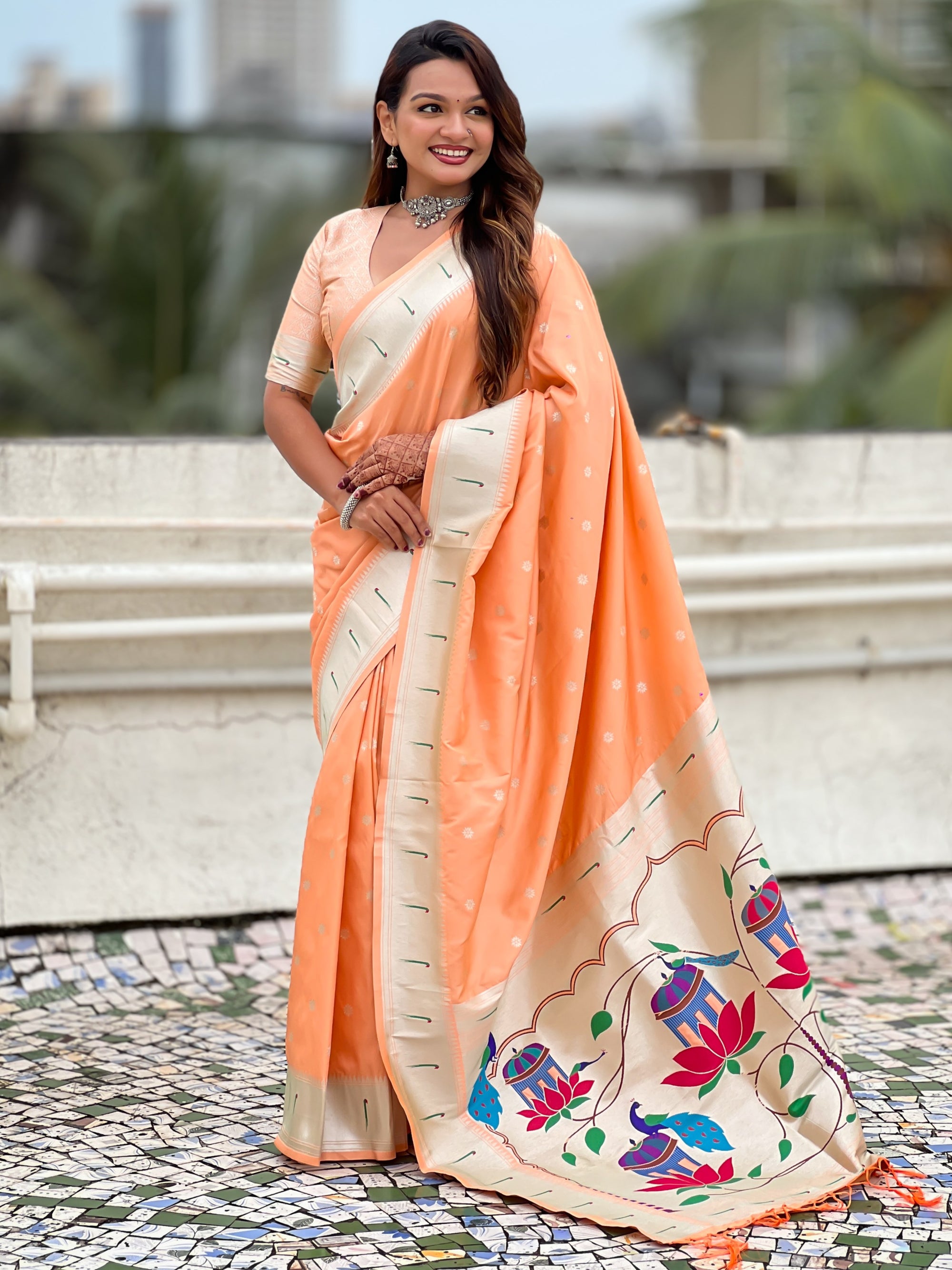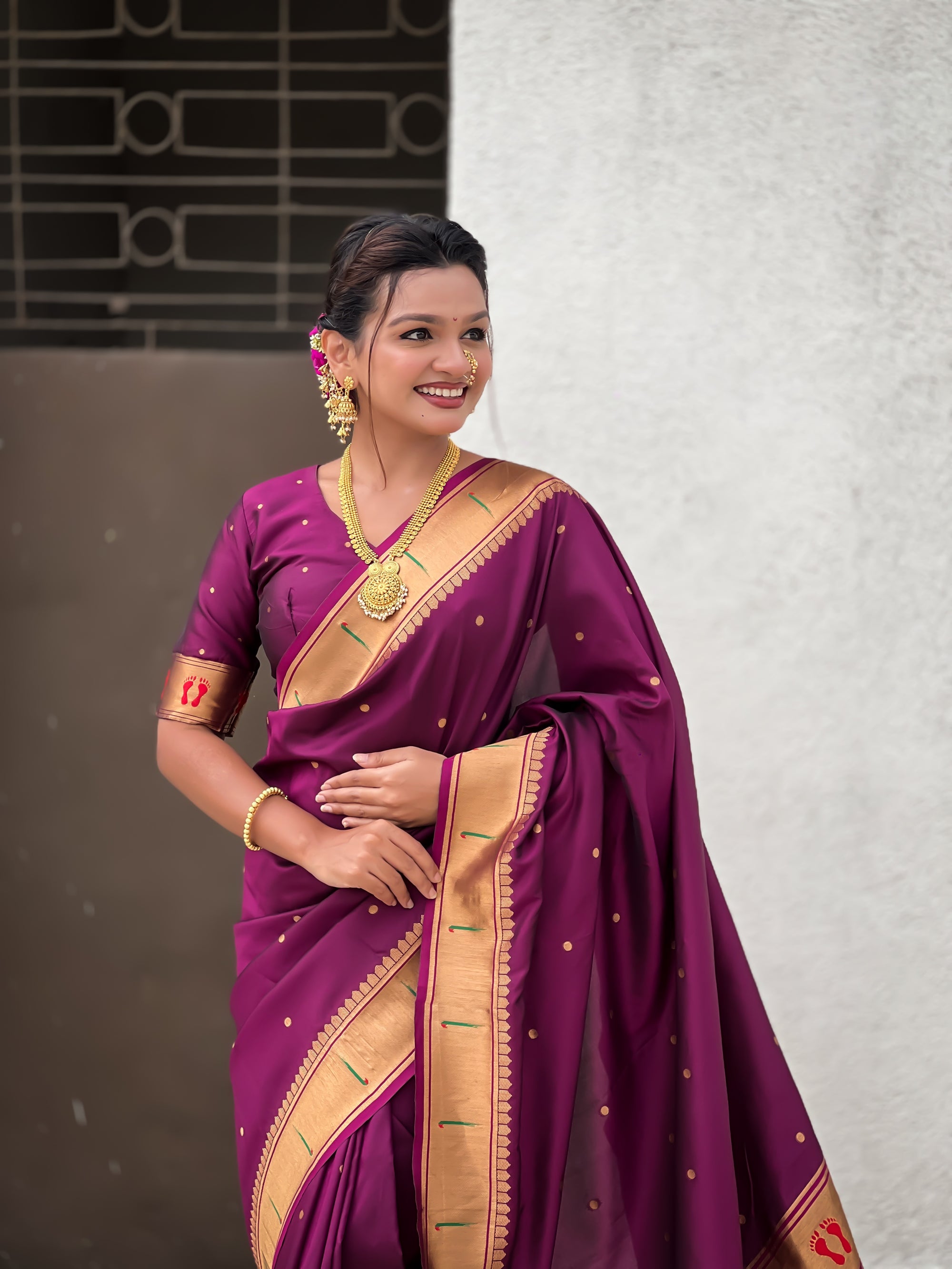The Paithani saree is a true symbol of grace and heritage, crafted with luxurious silk and vibrant colors. Its intricate zari work, adorned with beautiful peacock and floral motifs, reflects unmatched artistry. A perfect blend of tradition and elegance, it is a treasure that enhances the beauty of every occasion, making every woman feel royal and radiant.