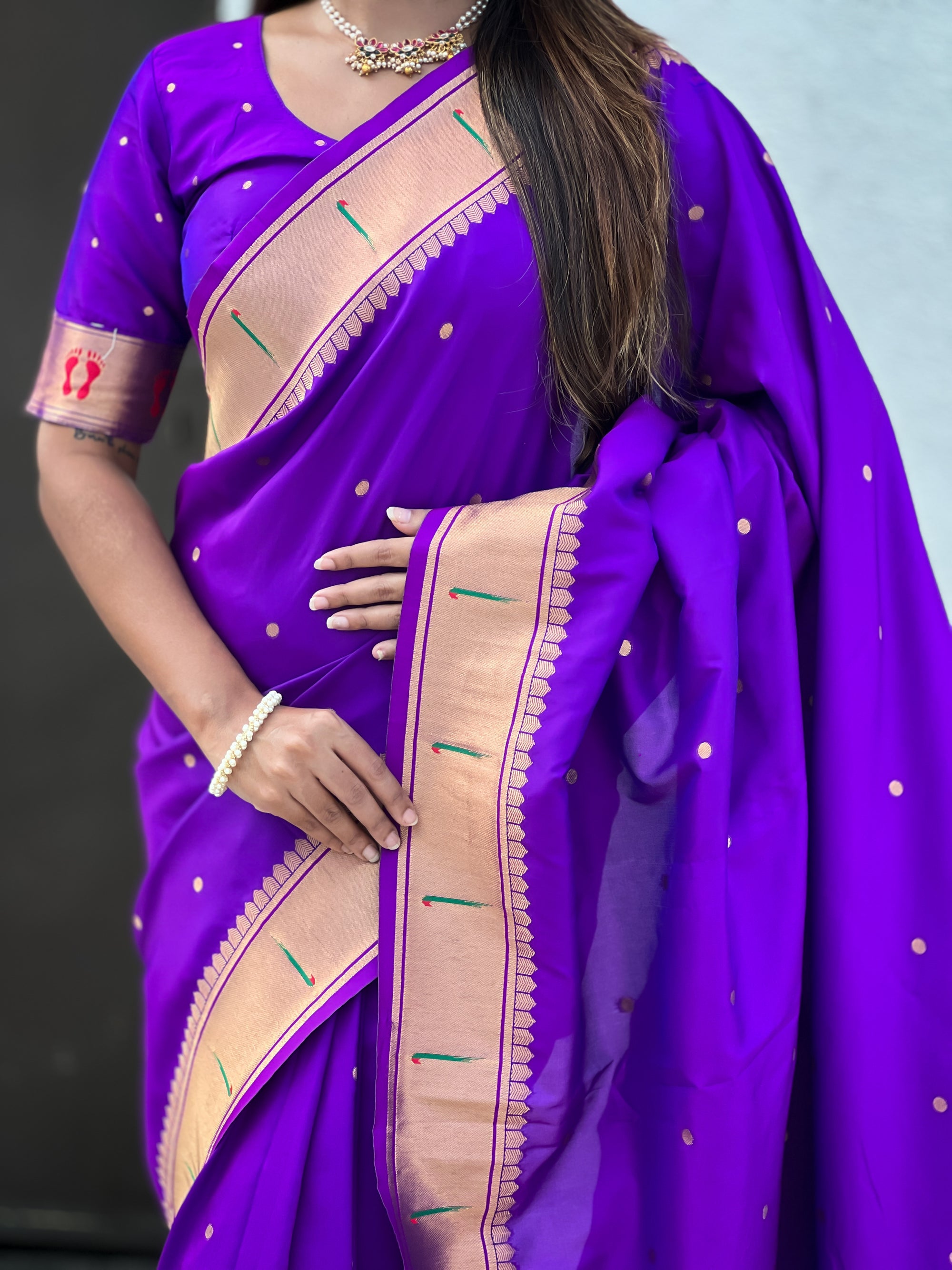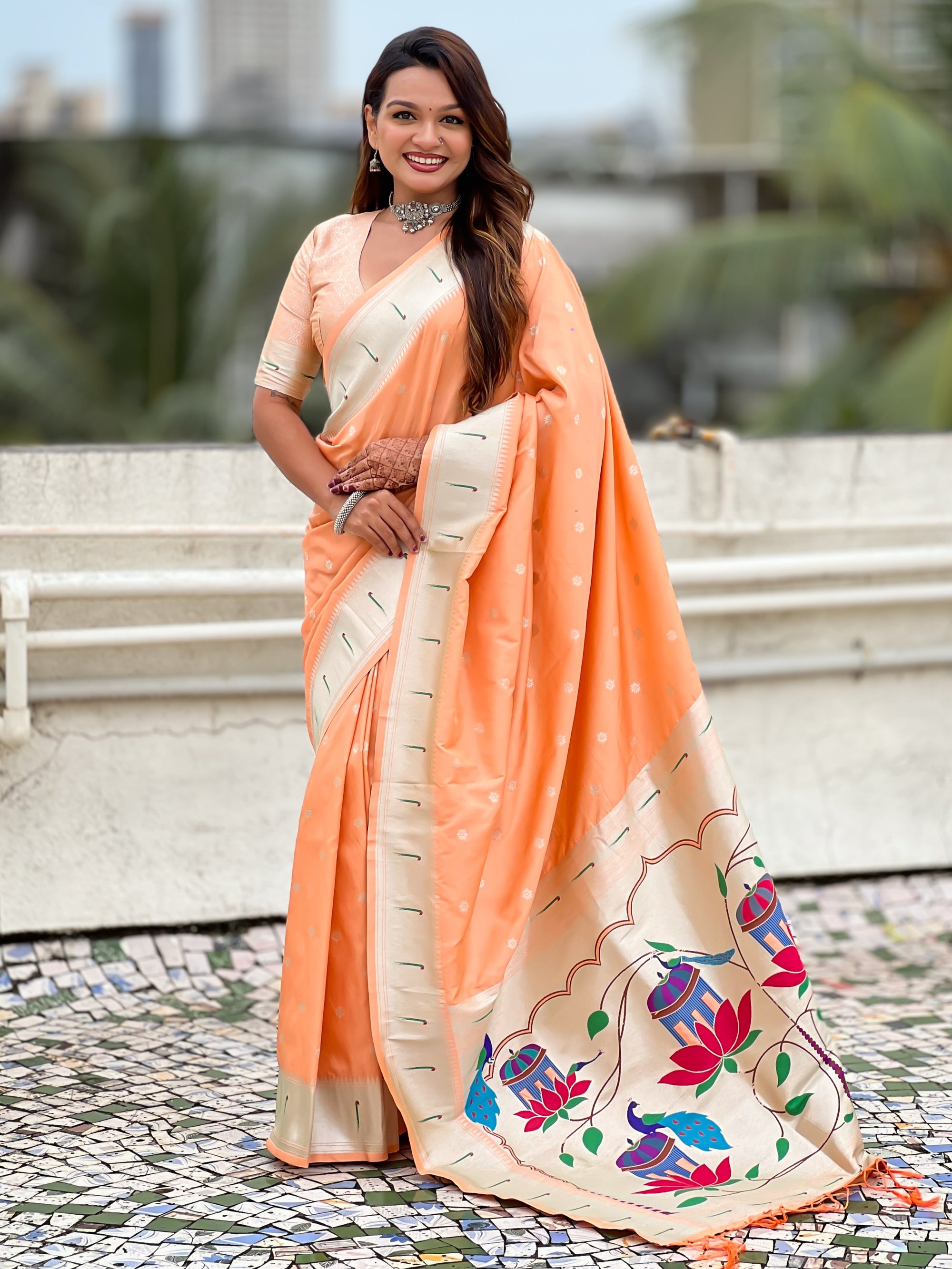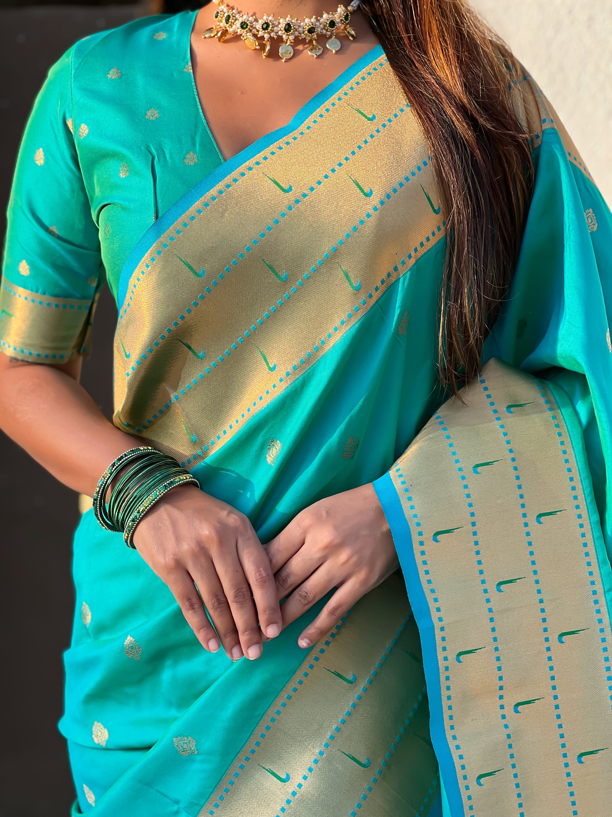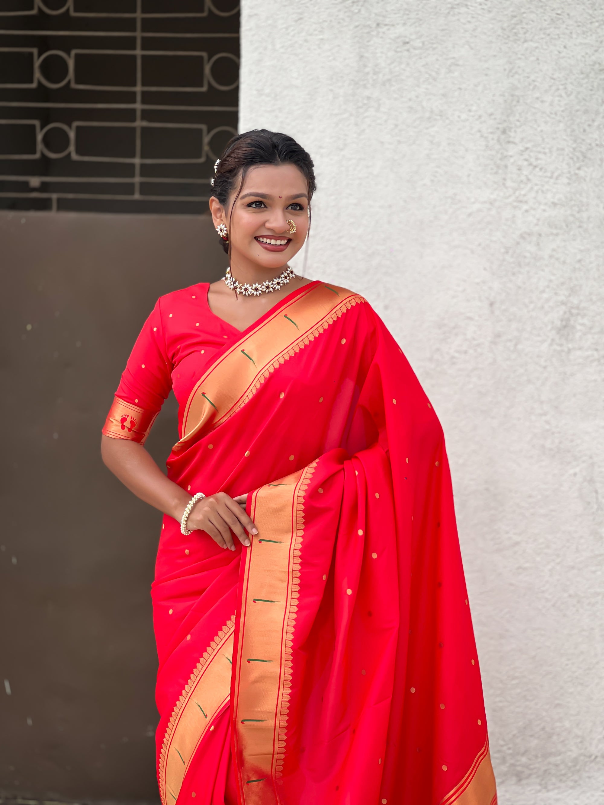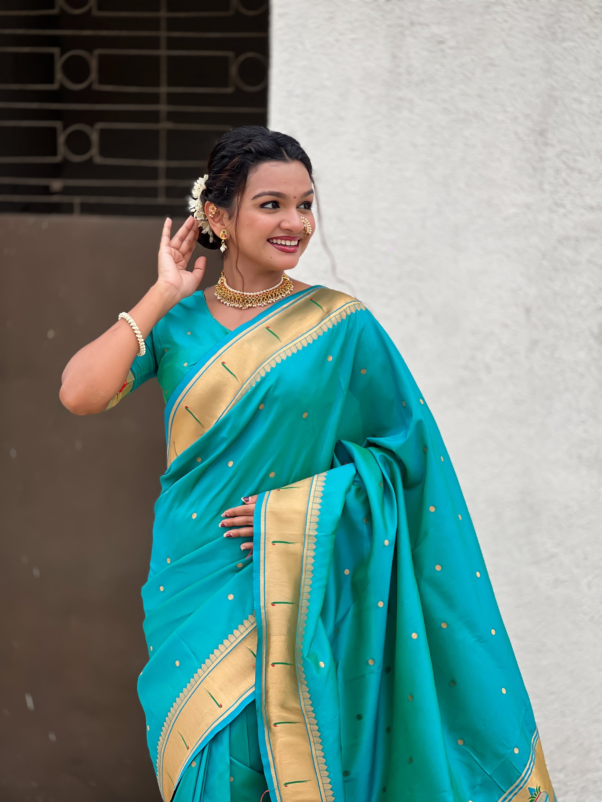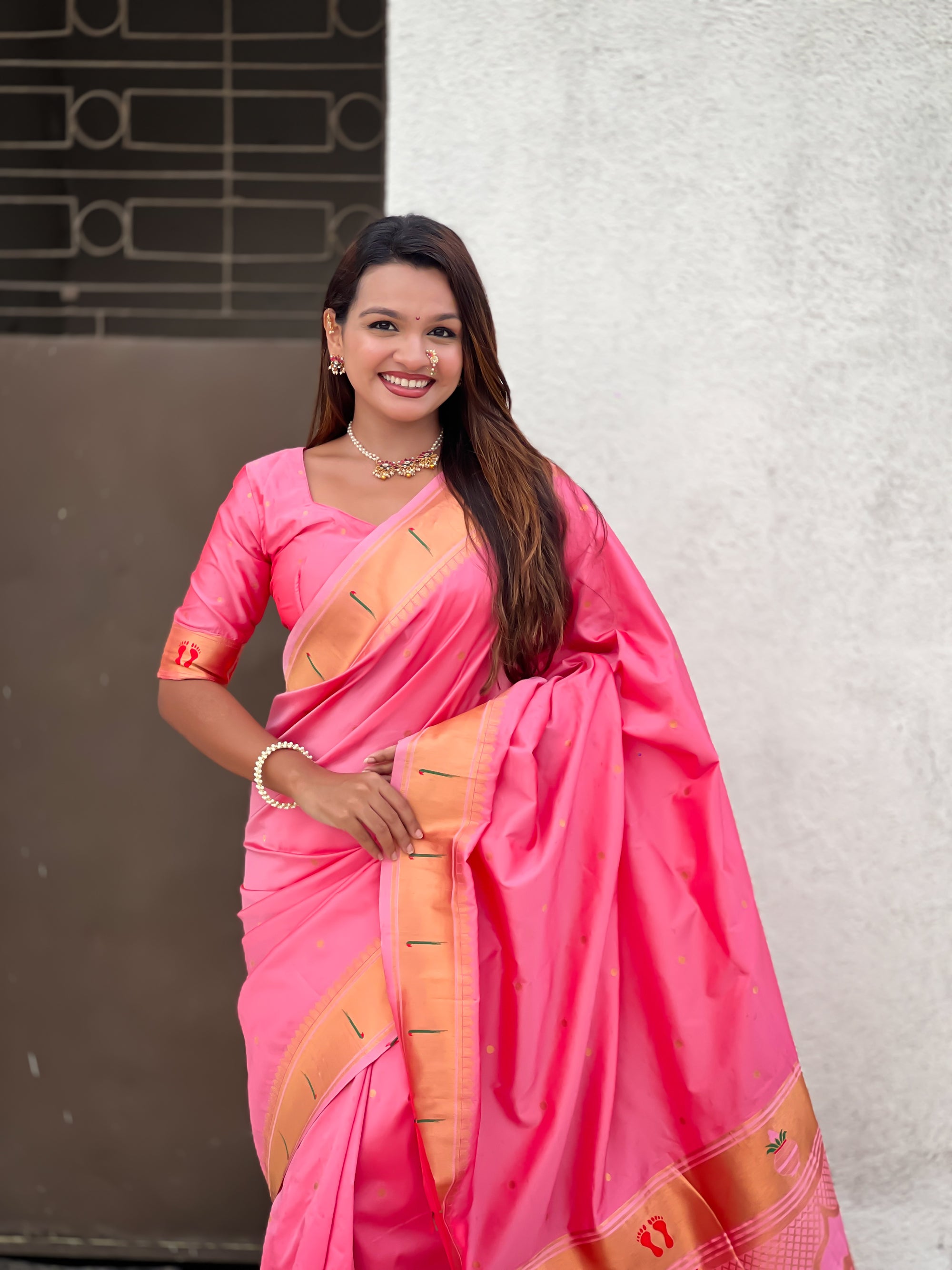 The Paithani saree is a true symbol of grace and heritage, crafted with luxurious silk and vibrant colors. Its intricate zari work, adorned with beautiful peacock and floral motifs, reflects unmatched artistry. A perfect blend of tradition and elegance, it is a treasure that enhances the beauty of every occasion, making every woman feel royal and radiant.
