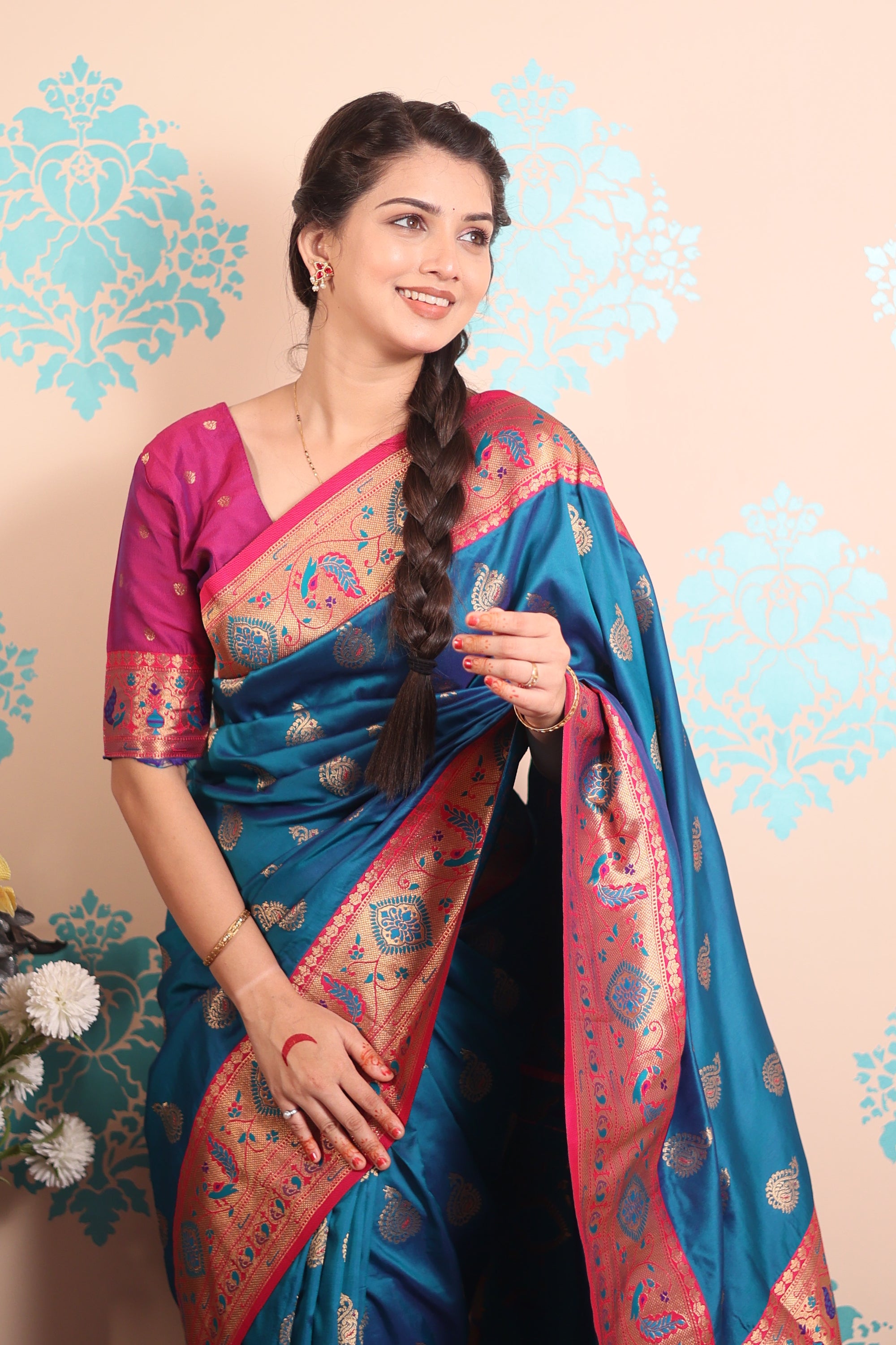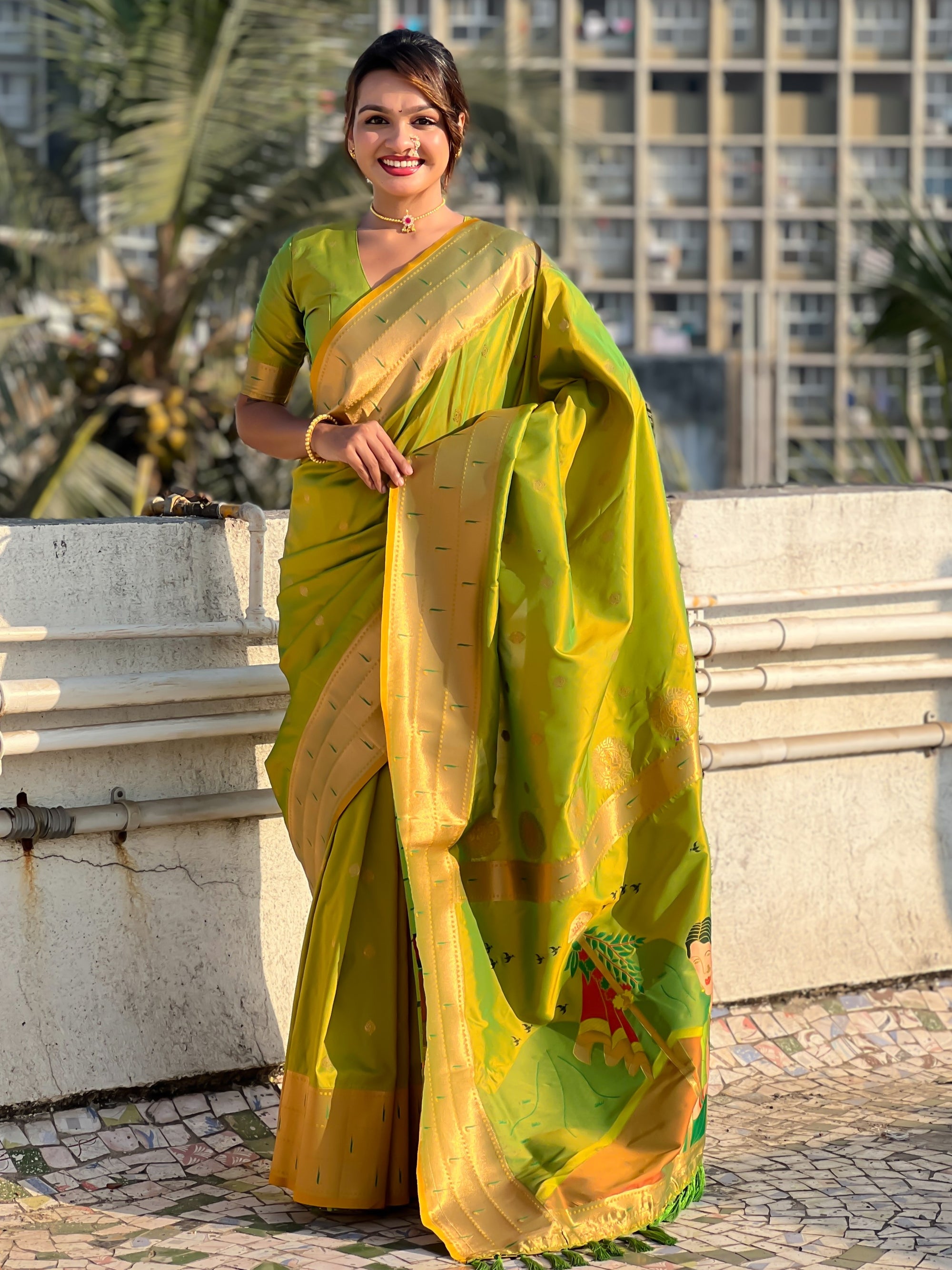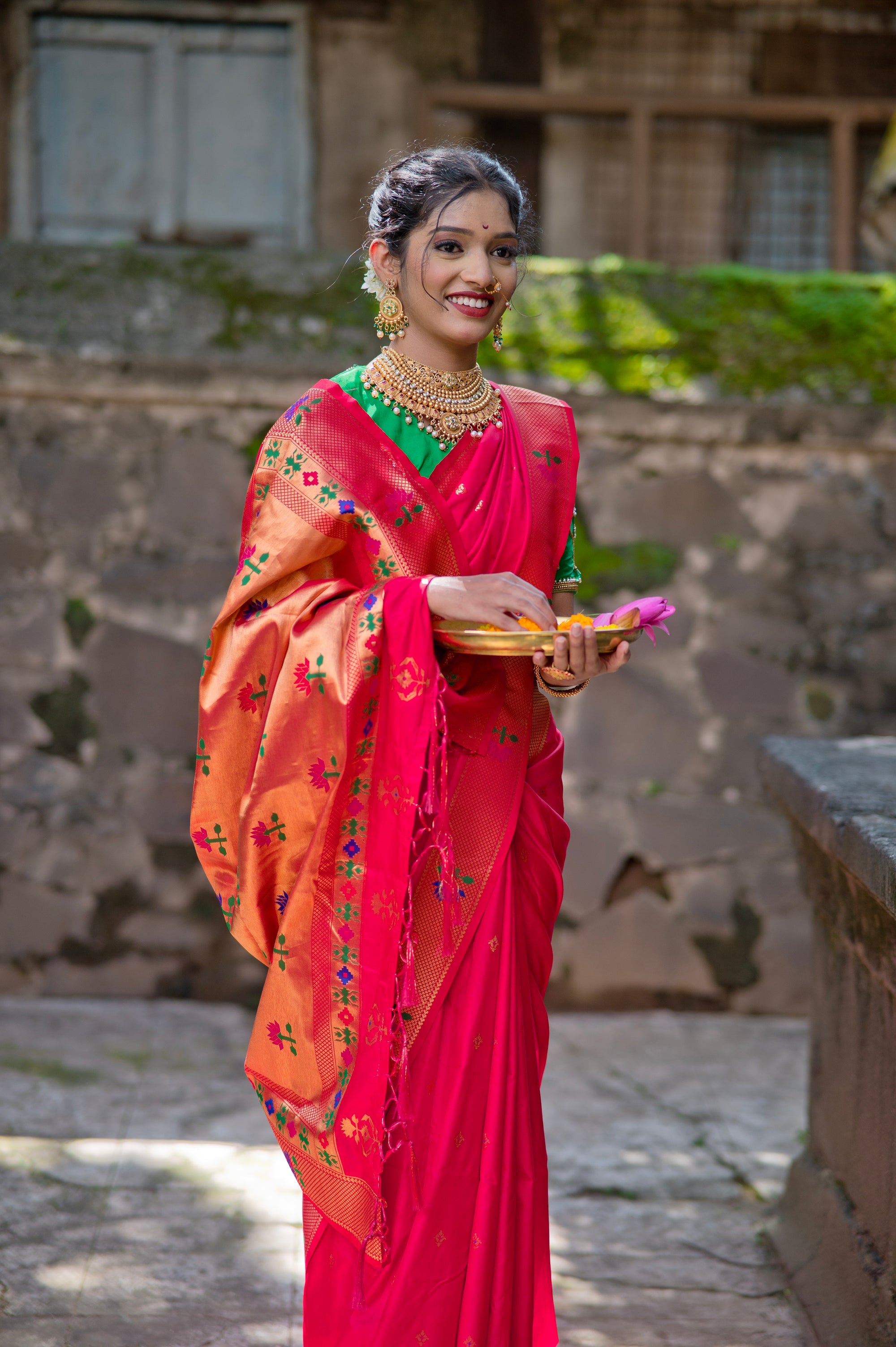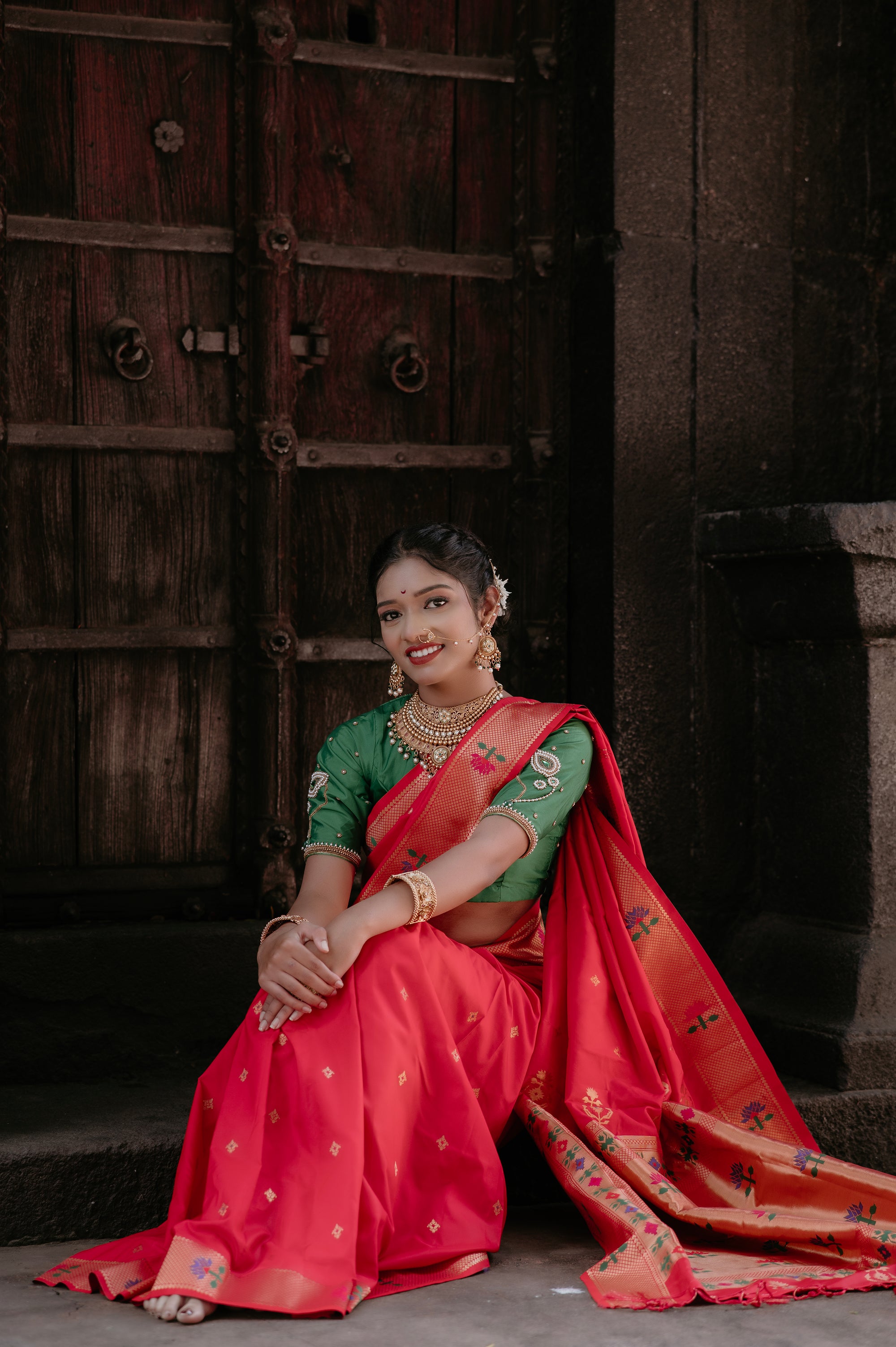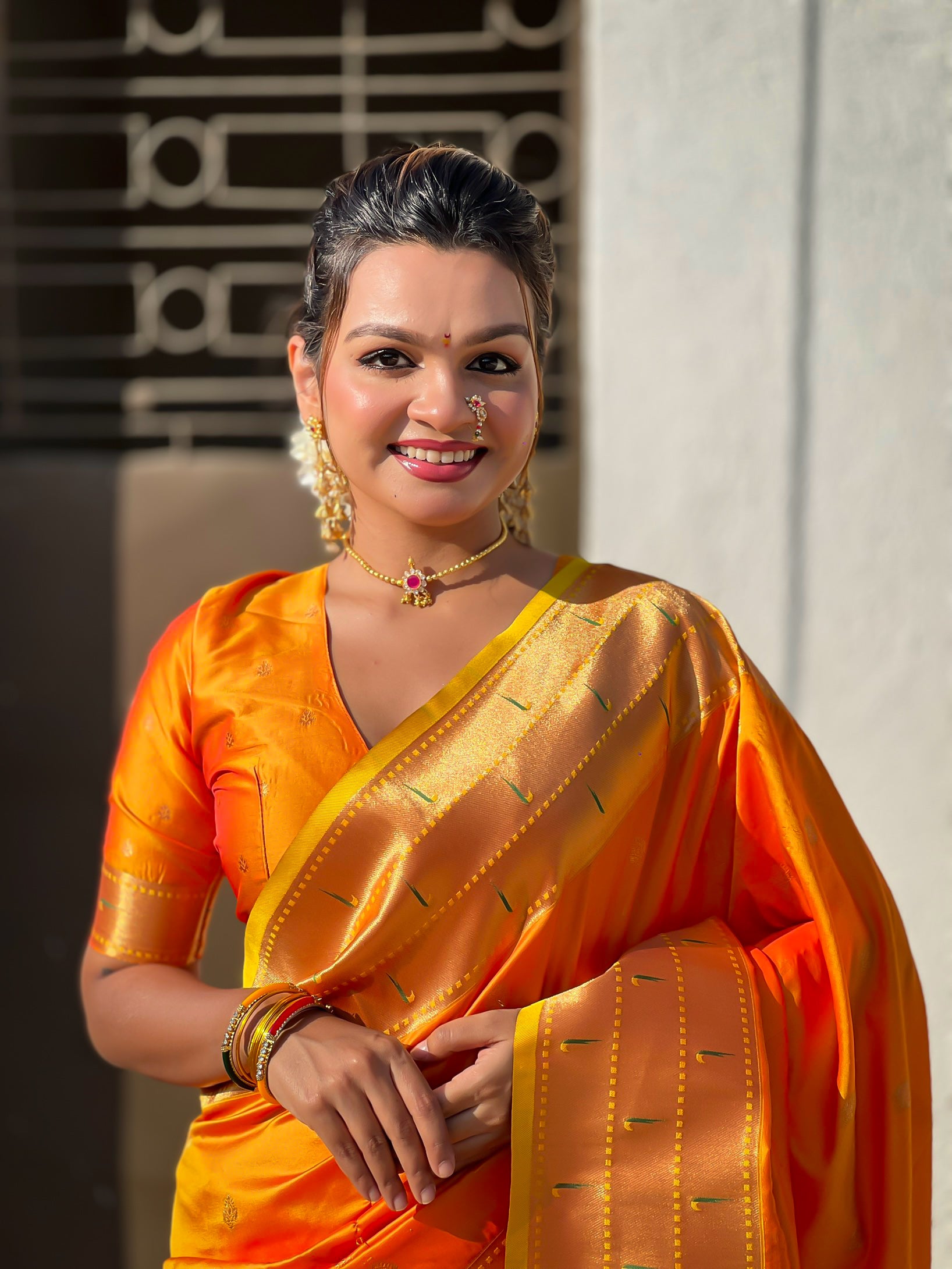 The Paithani saree is a true symbol of grace and heritage, crafted with luxurious silk and vibrant colors. Its intricate zari work, adorned with beautiful peacock and floral motifs, reflects unmatched artistry. A perfect blend of tradition and elegance, it is a treasure that enhances the beauty of every occasion, making every woman feel royal and radiant.