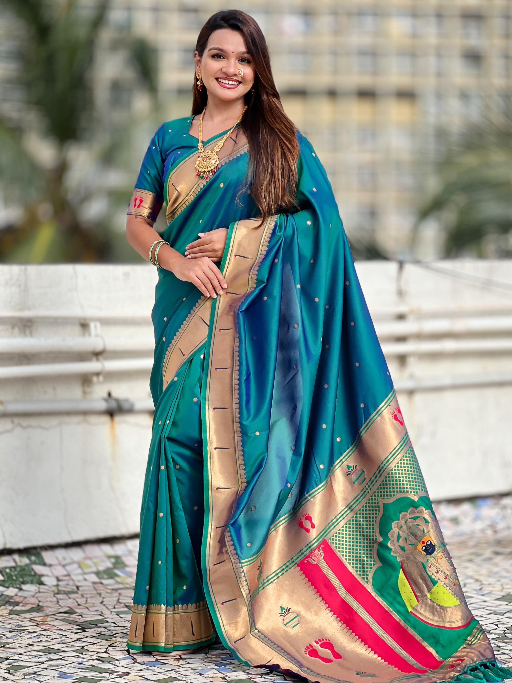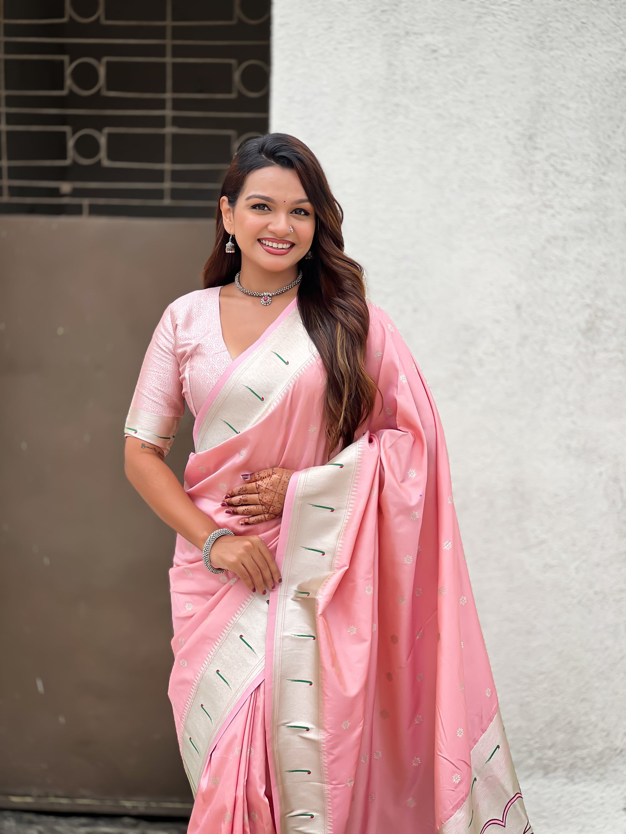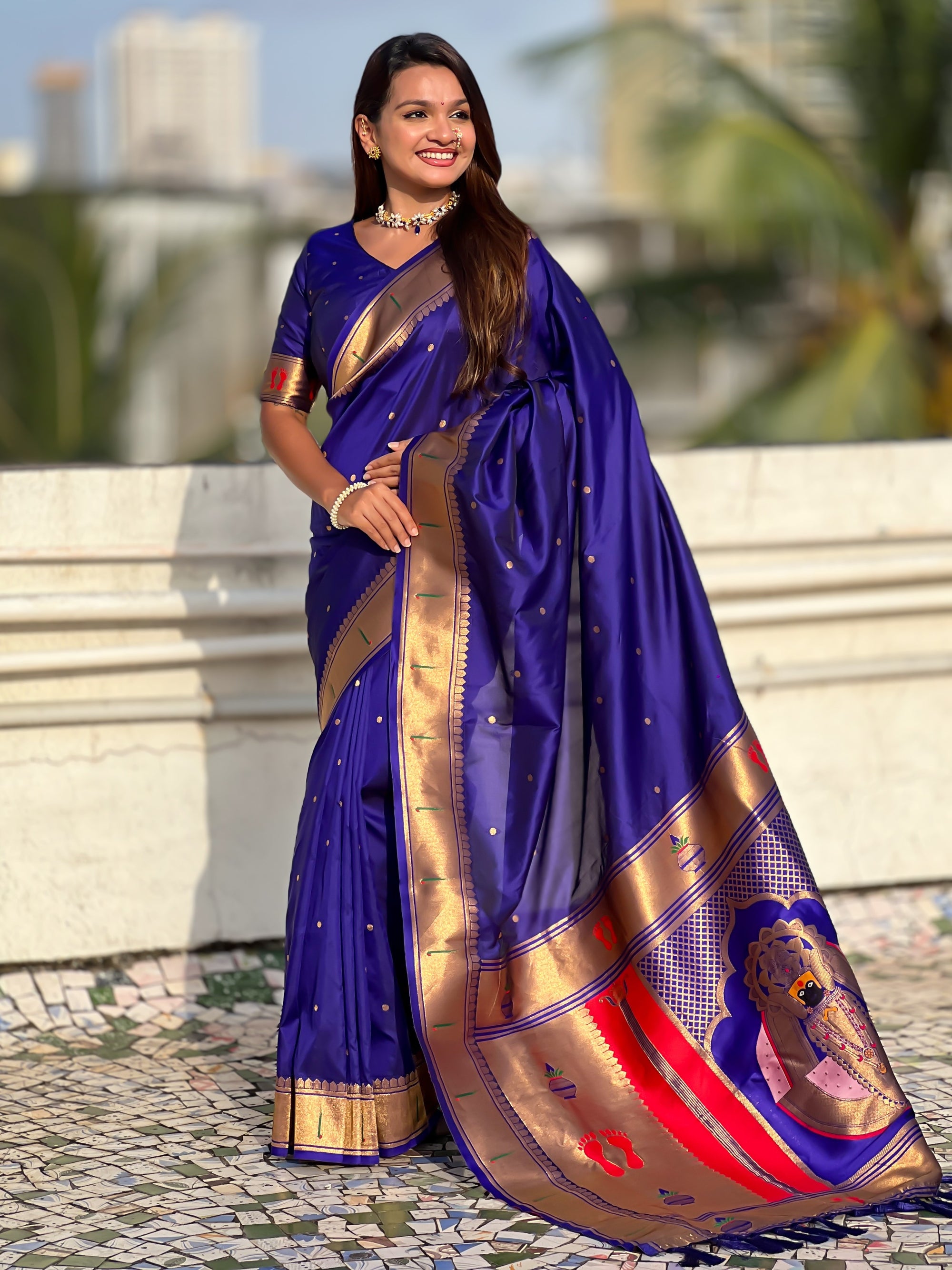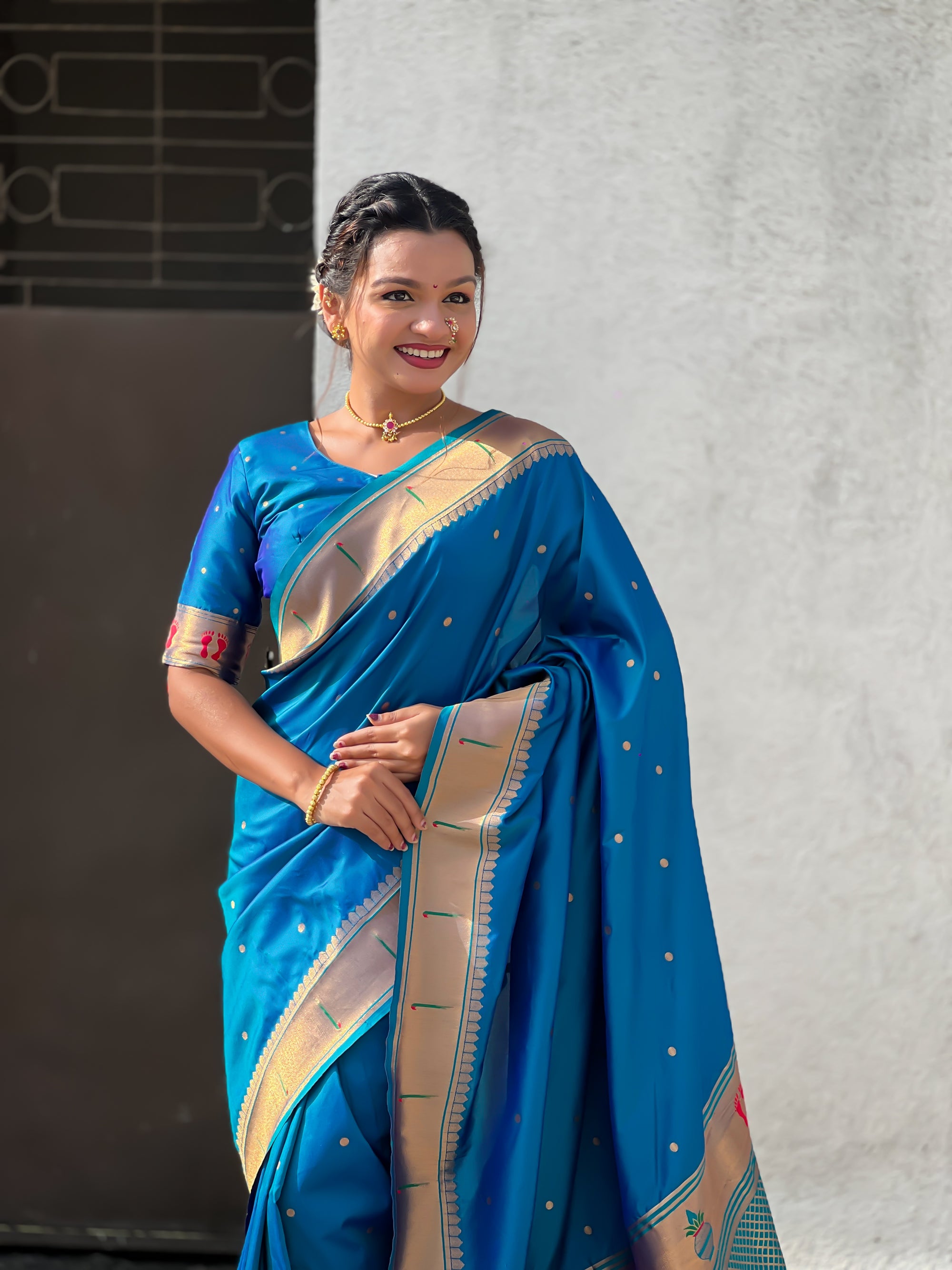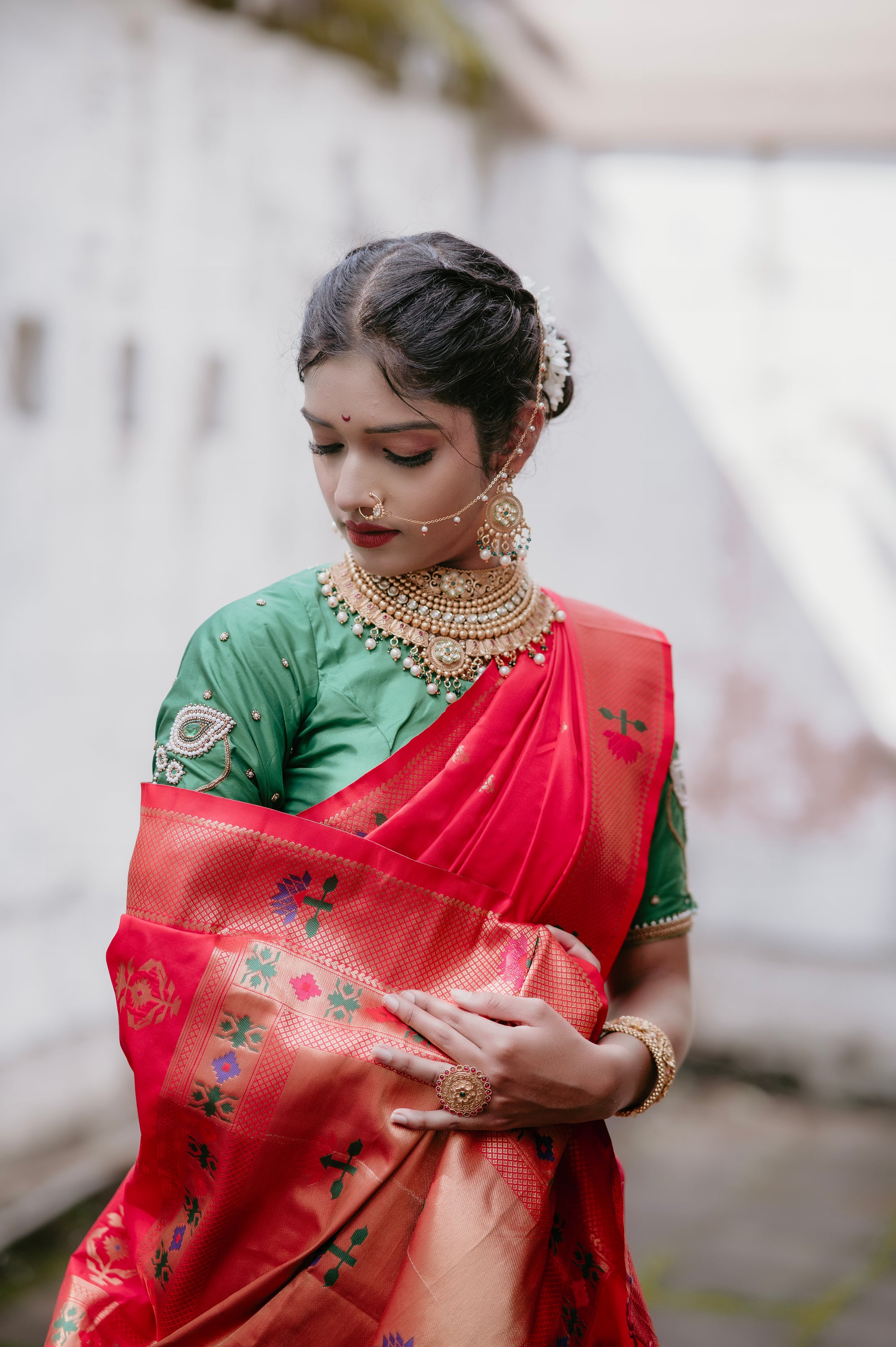 The Paithani saree is a true symbol of grace and heritage, crafted with luxurious silk and vibrant colors. Its intricate zari work, adorned with beautiful peacock and floral motifs, reflects unmatched artistry. A perfect blend of tradition and elegance, it is a treasure that enhances the beauty of every occasion, making every woman feel royal and radiant.
