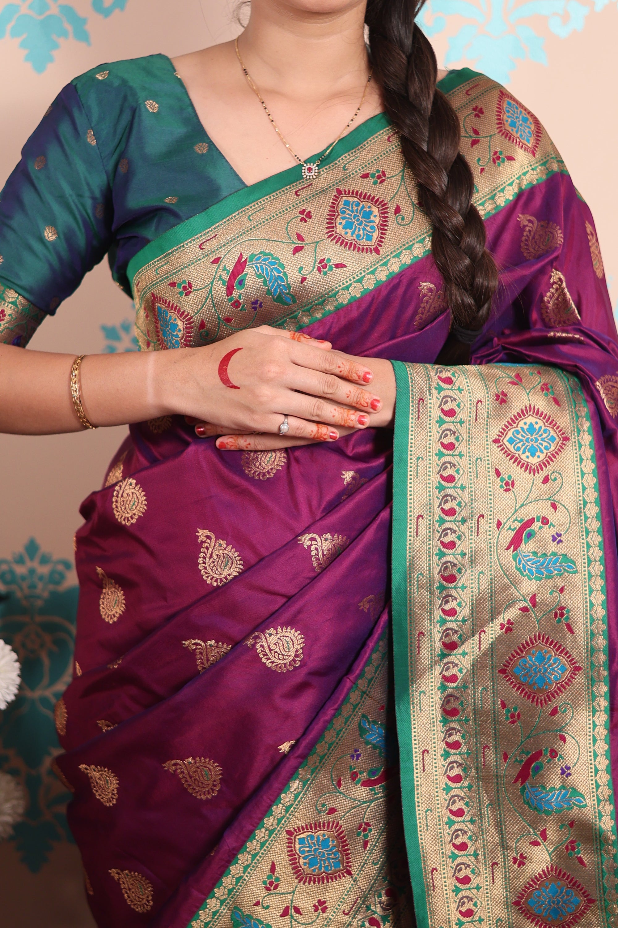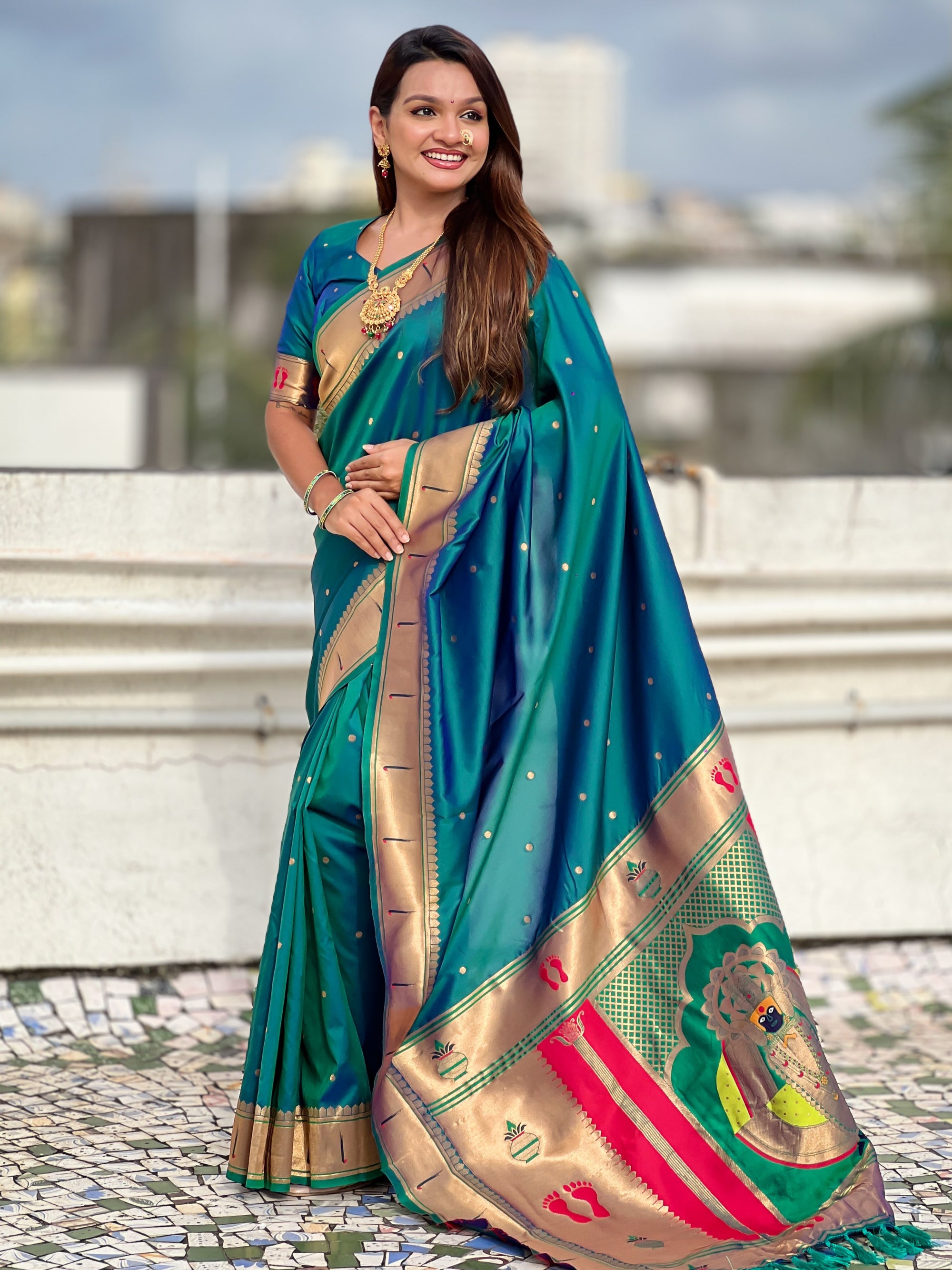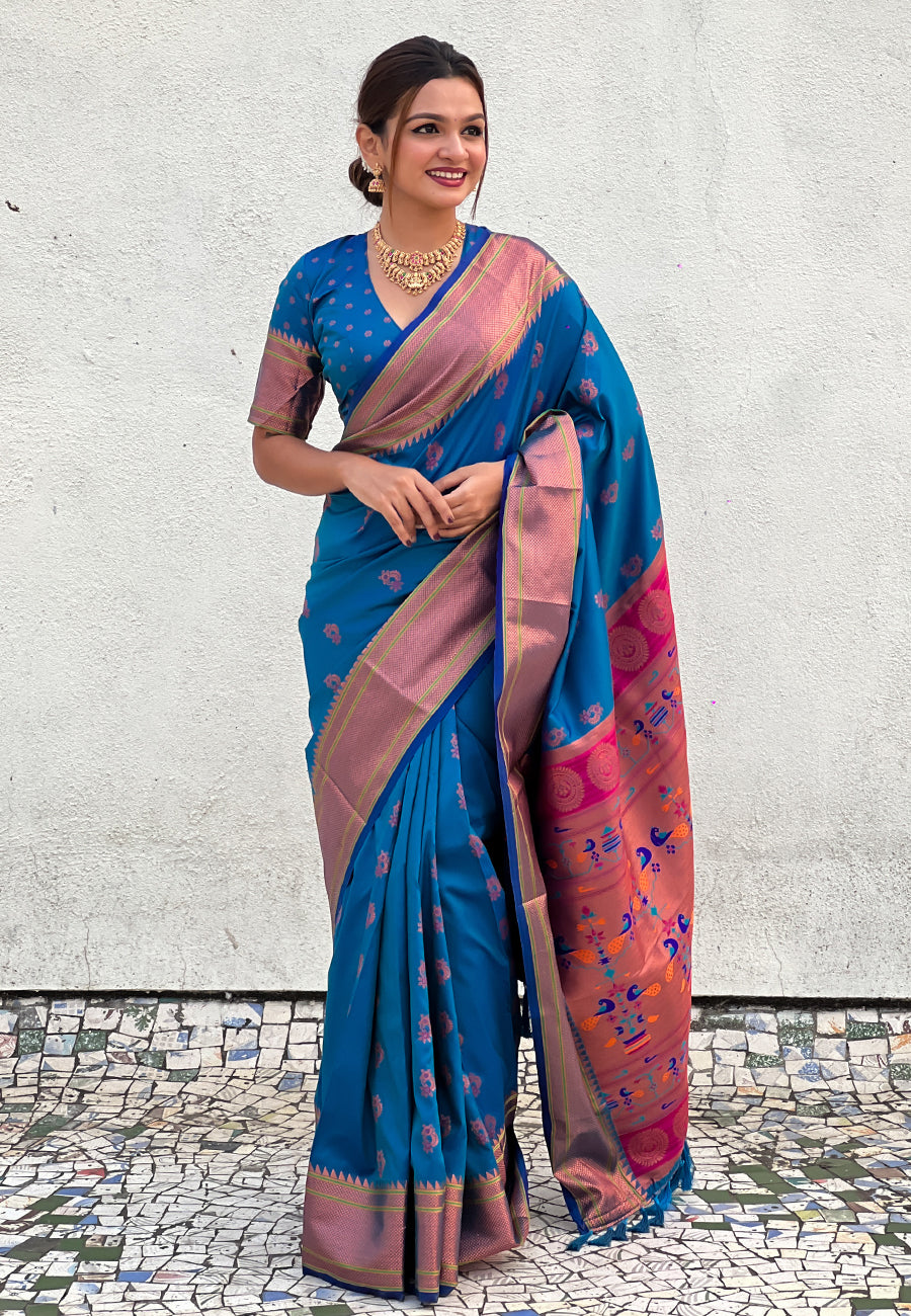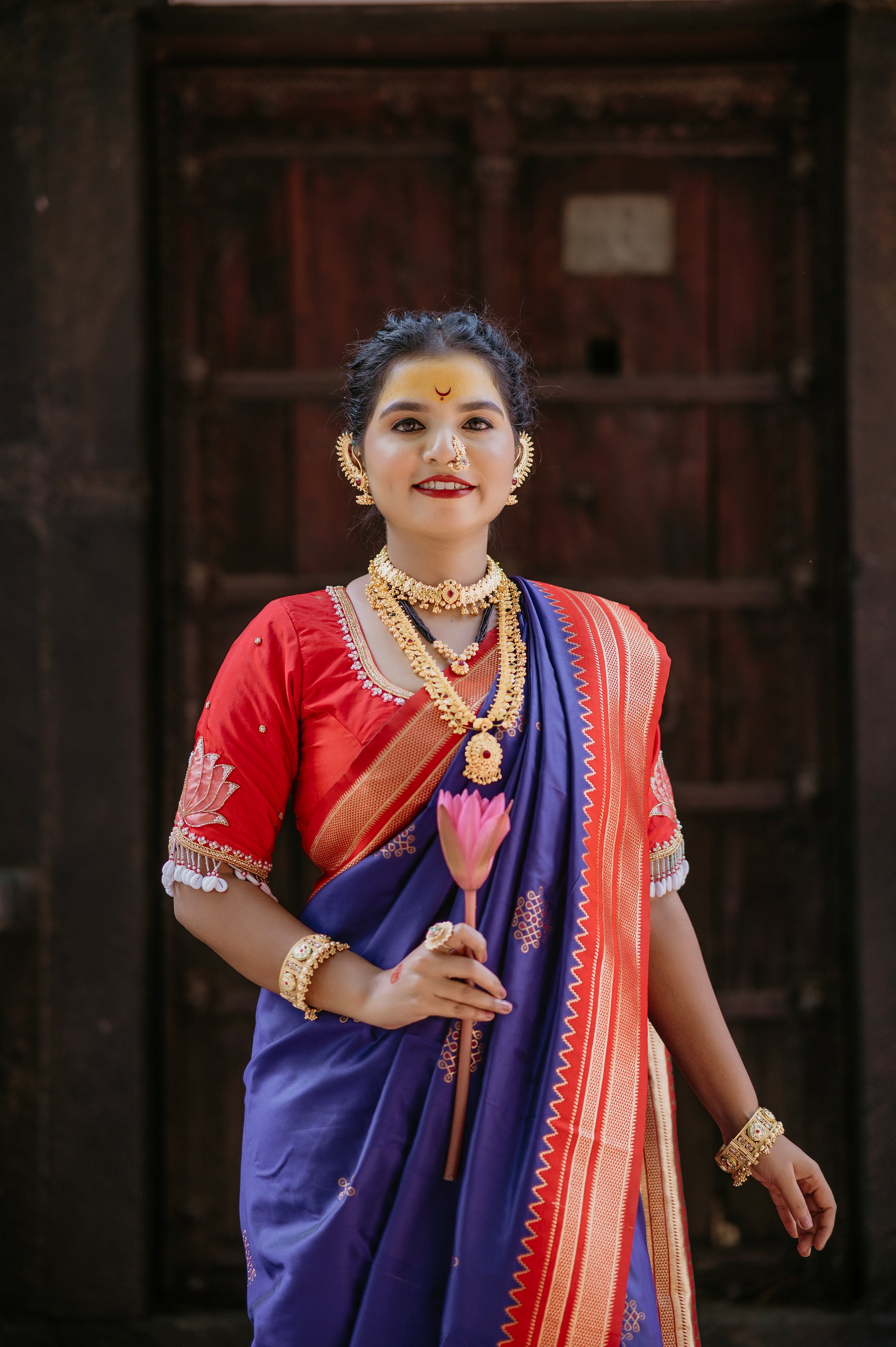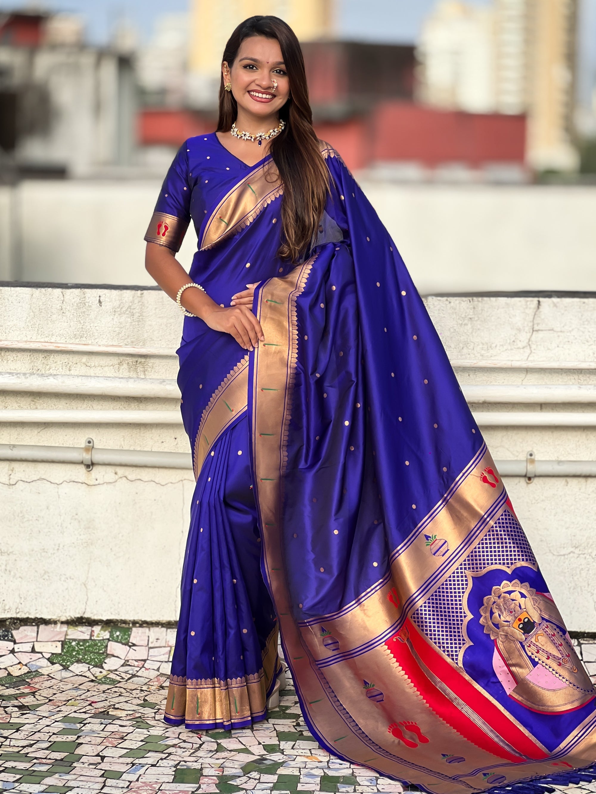The Paithani saree is a true symbol of grace and heritage, crafted with luxurious silk and vibrant colors. Its intricate zari work, adorned with beautiful peacock and floral motifs, reflects unmatched artistry. A perfect blend of tradition and elegance, it is a treasure that enhances the beauty of every occasion, making every woman feel royal and radiant.