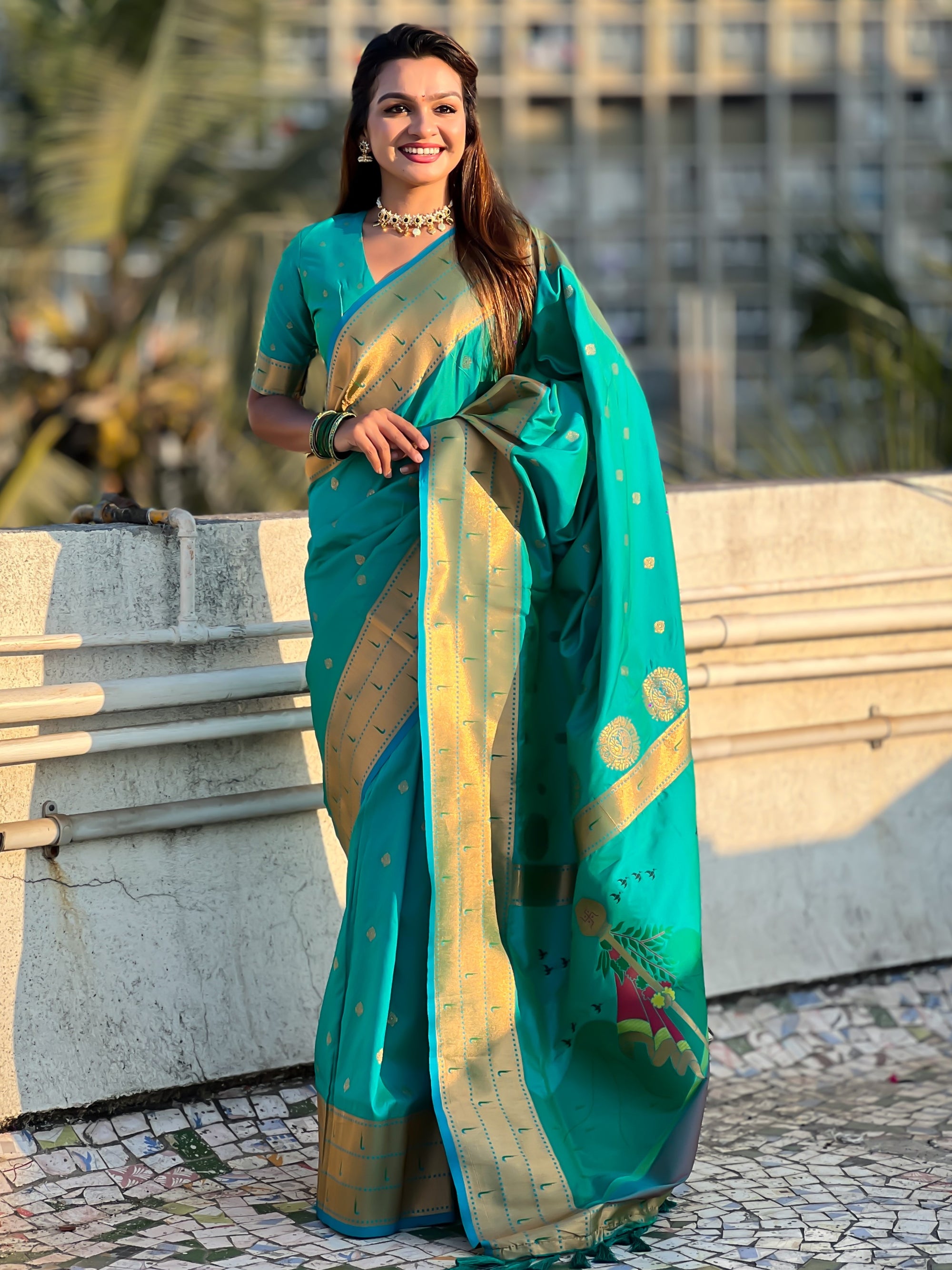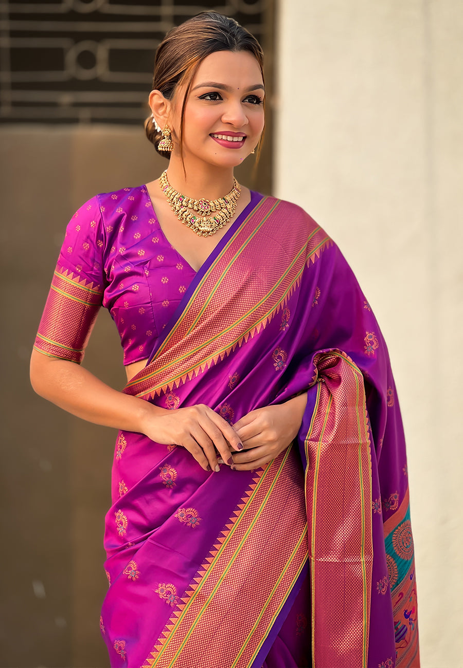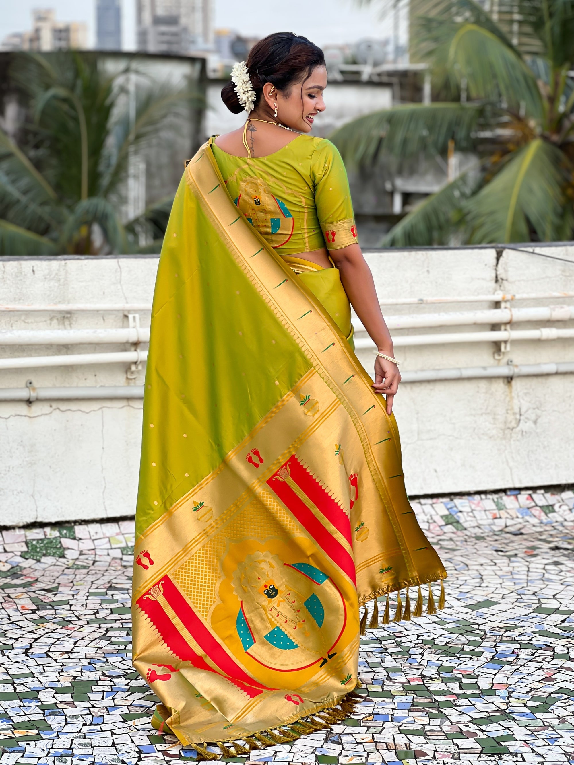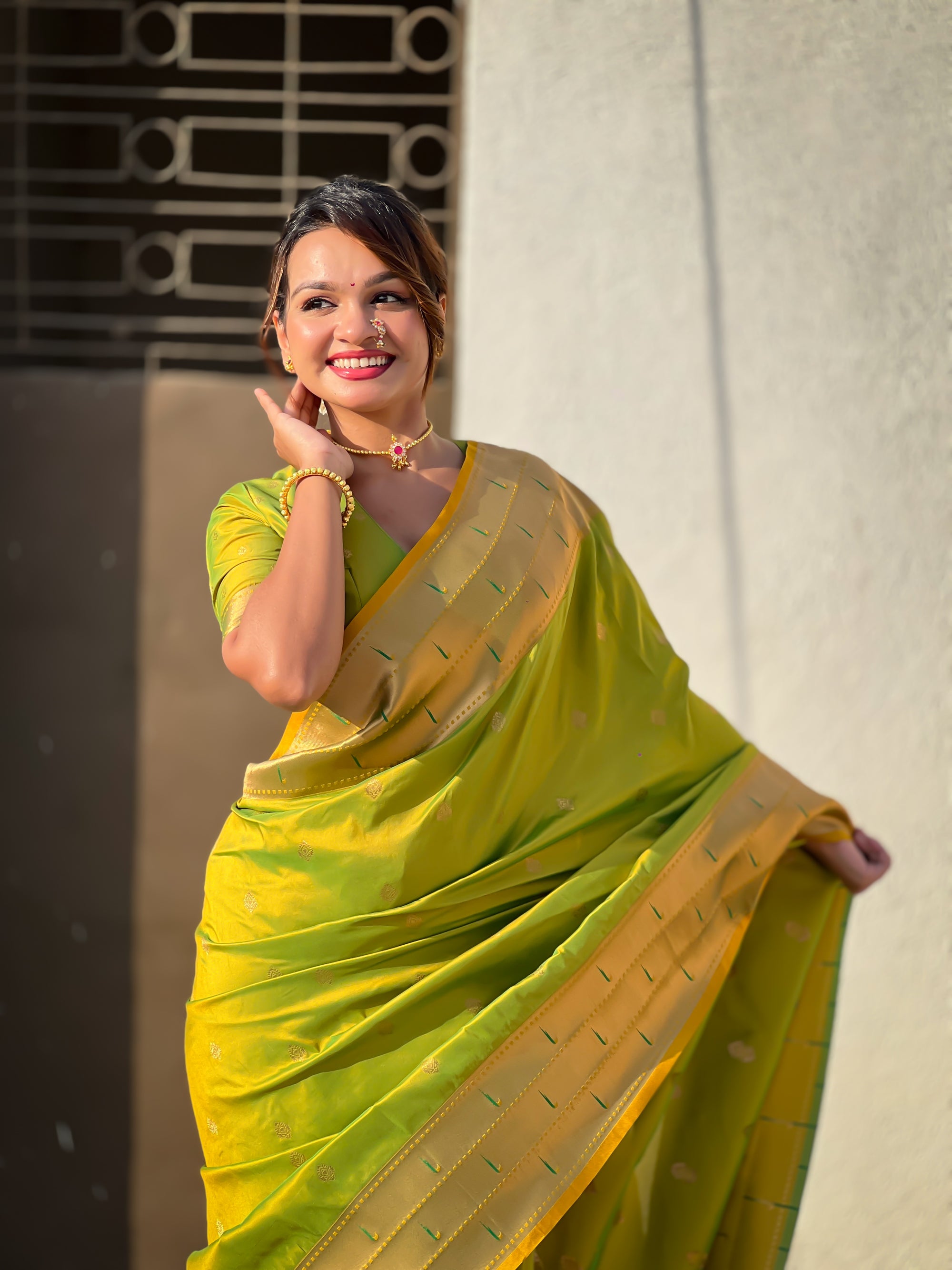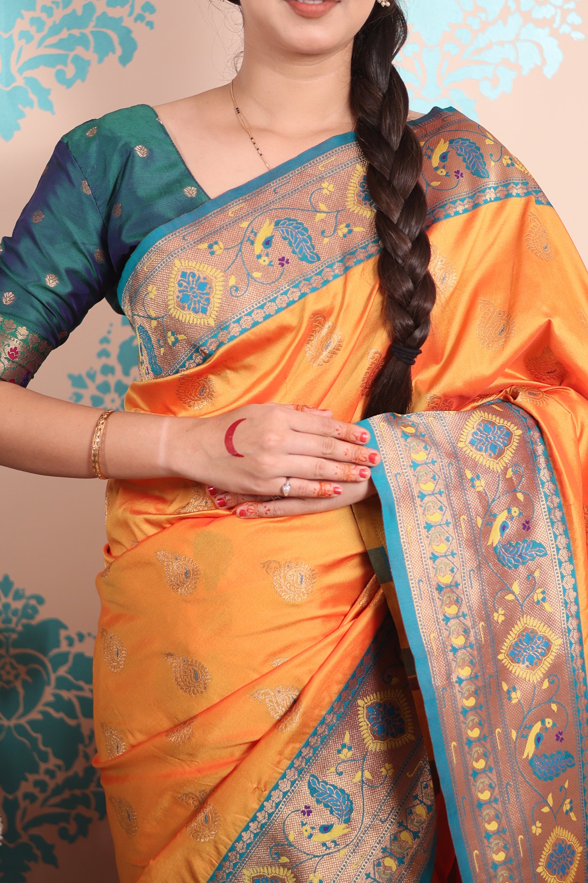 The Paithani saree is a true symbol of grace and heritage, crafted with luxurious silk and vibrant colors. Its intricate zari work, adorned with beautiful peacock and floral motifs, reflects unmatched artistry. A perfect blend of tradition and elegance, it is a treasure that enhances the beauty of every occasion, making every woman feel royal and radiant.
