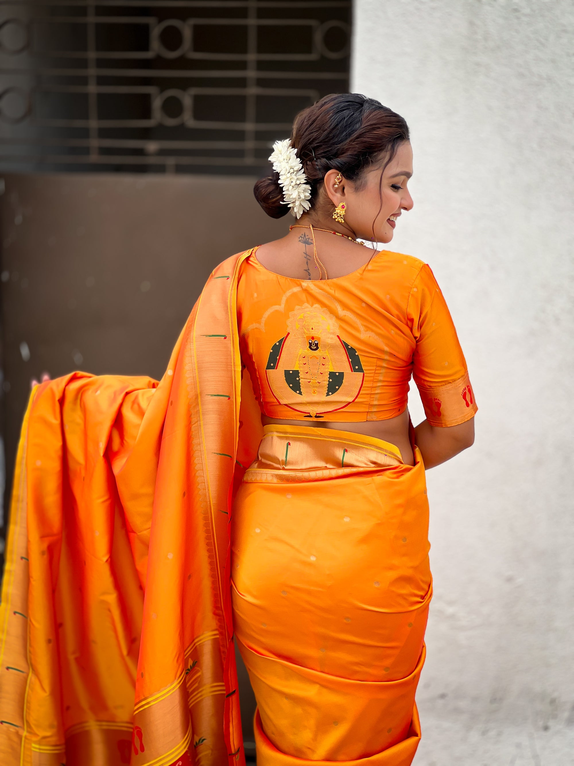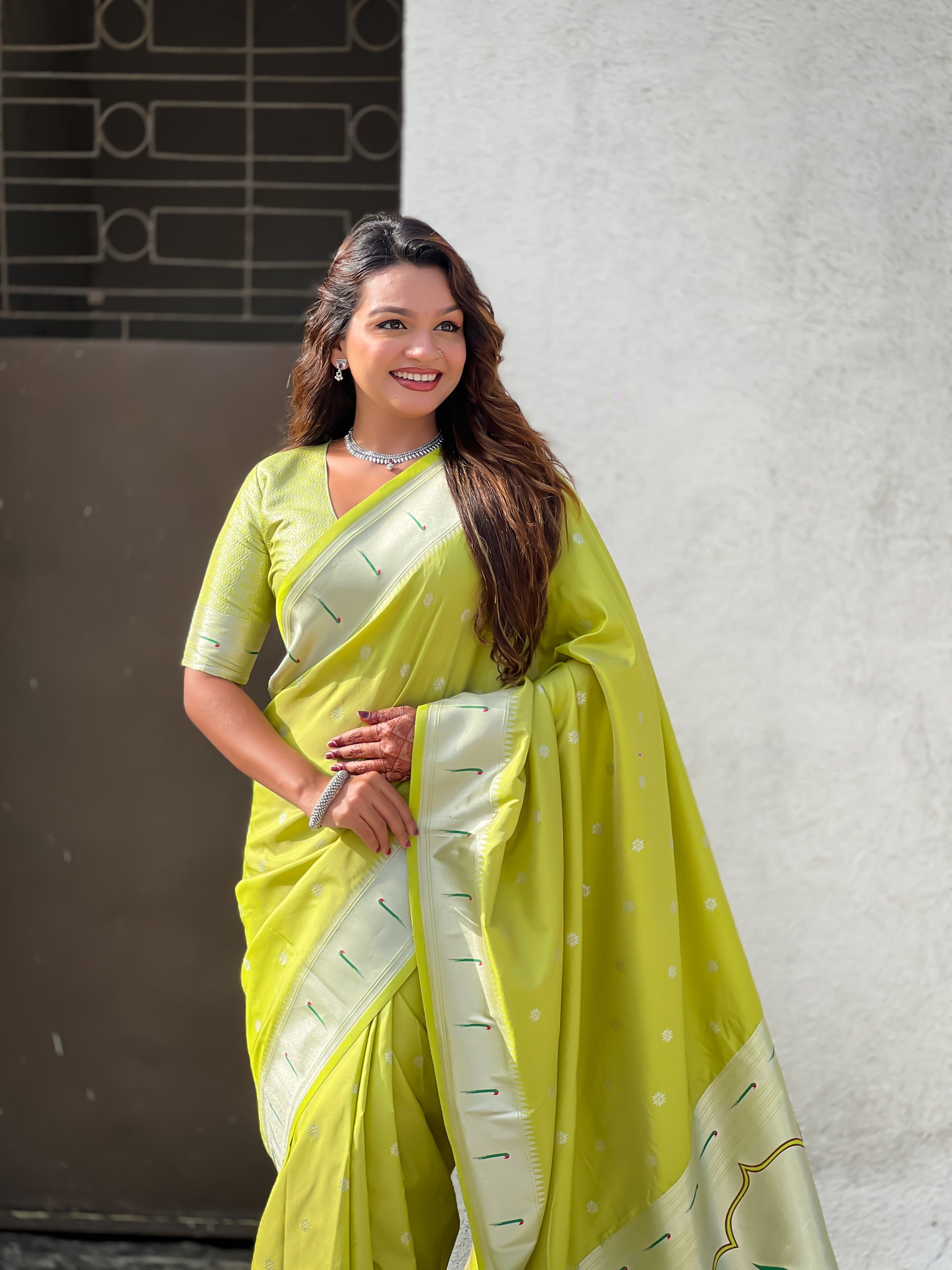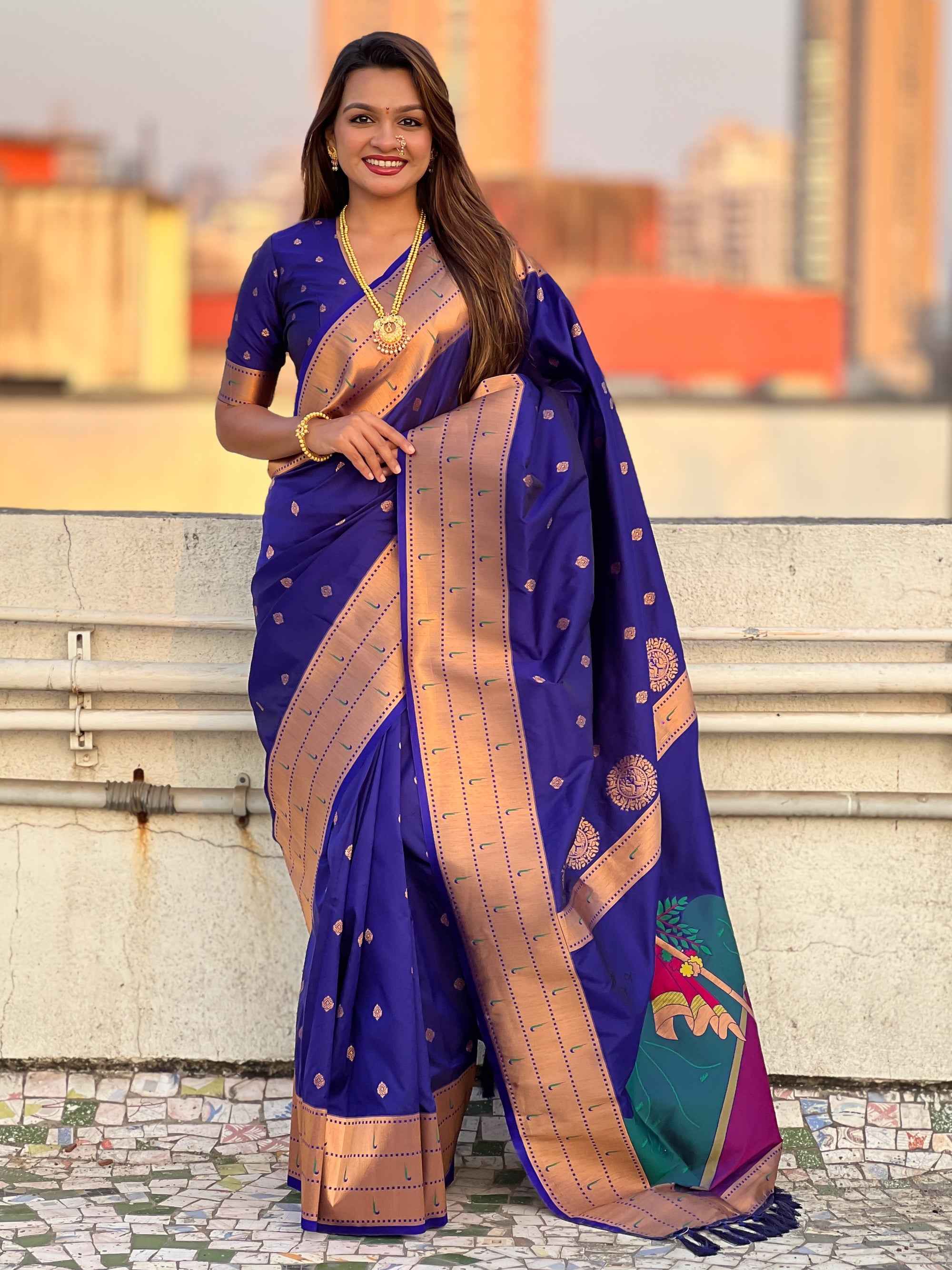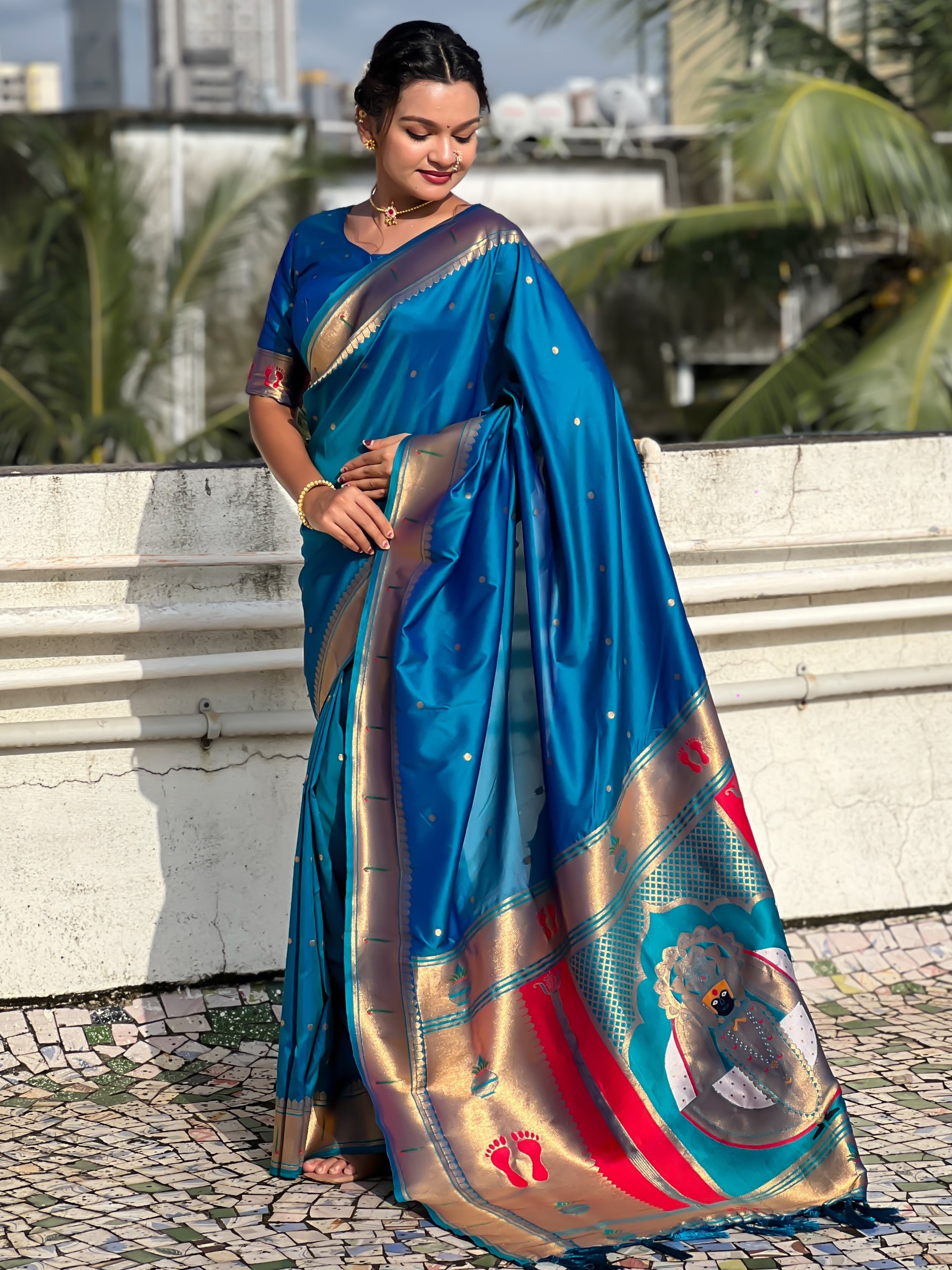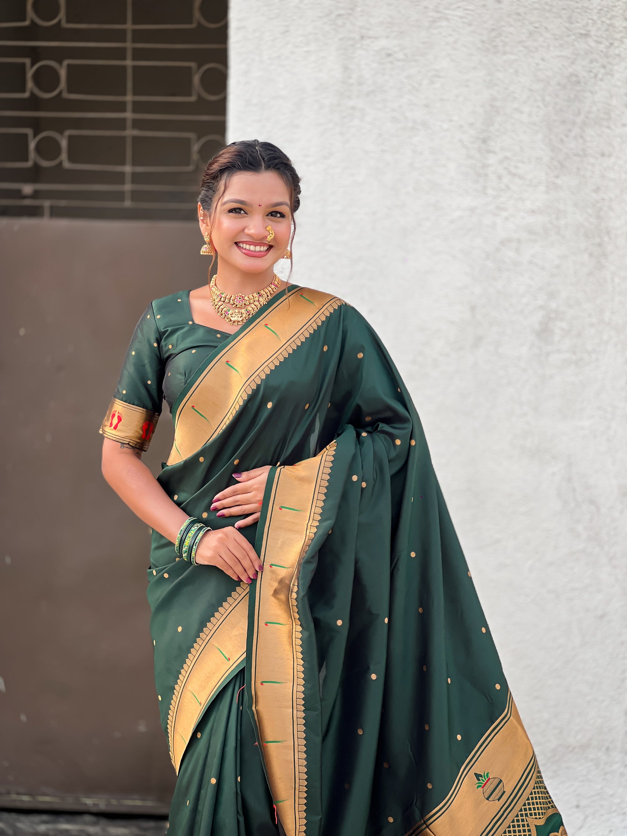 The Paithani saree is a true symbol of grace and heritage, crafted with luxurious silk and vibrant colors. Its intricate zari work, adorned with beautiful peacock and floral motifs, reflects unmatched artistry. A perfect blend of tradition and elegance, it is a treasure that enhances the beauty of every occasion, making every woman feel royal and radiant.