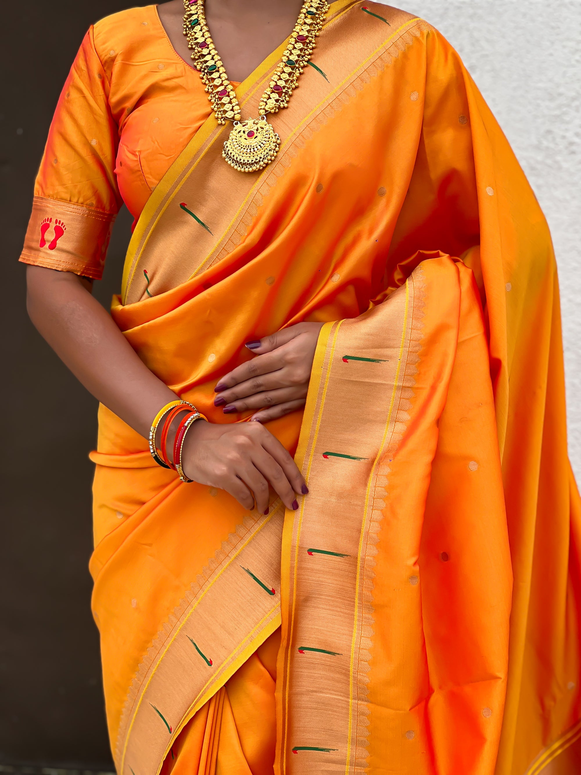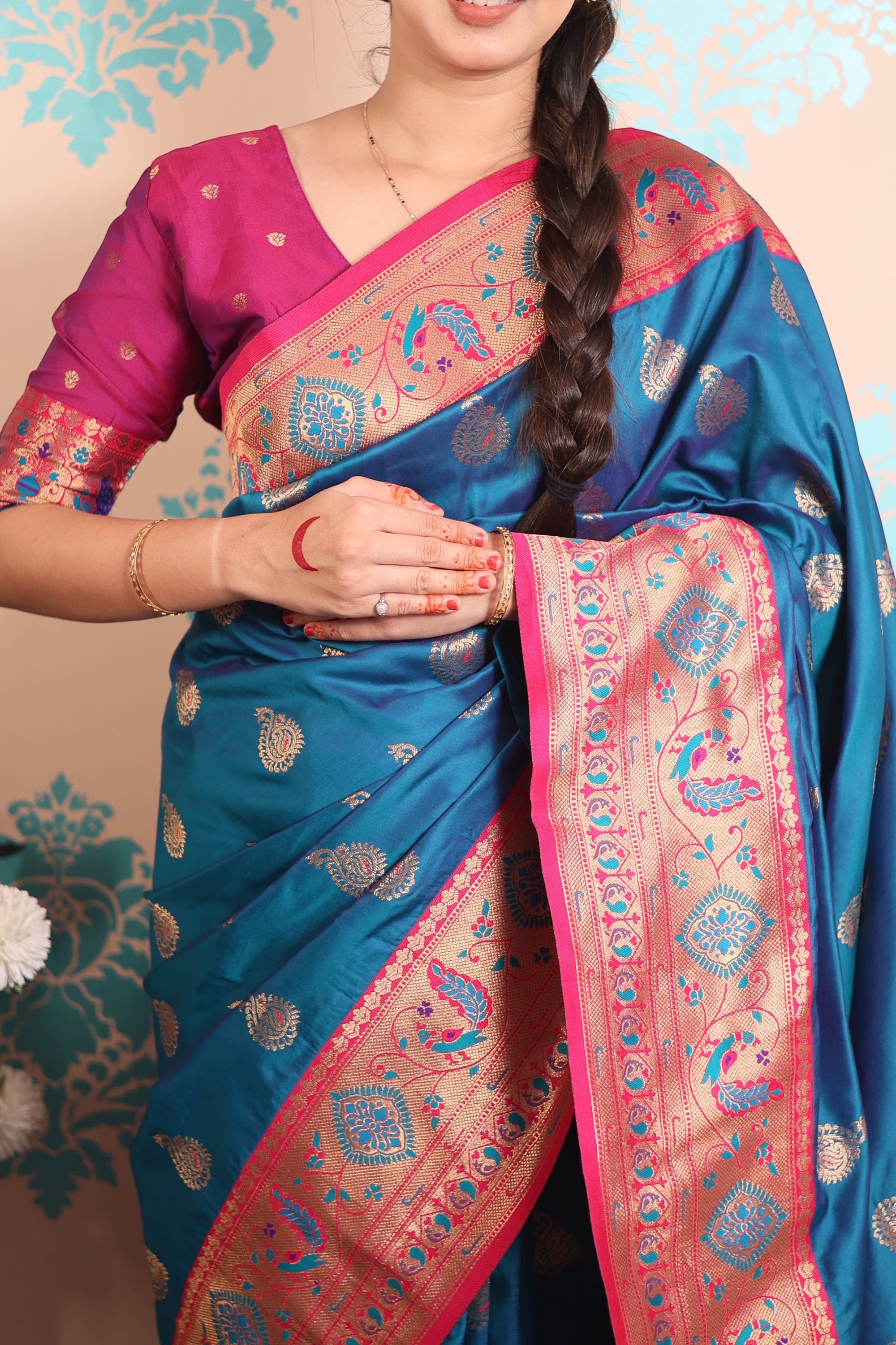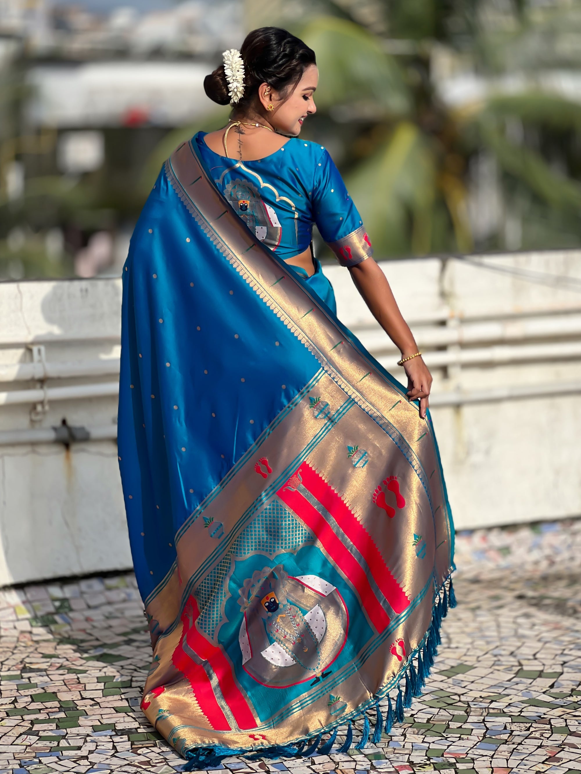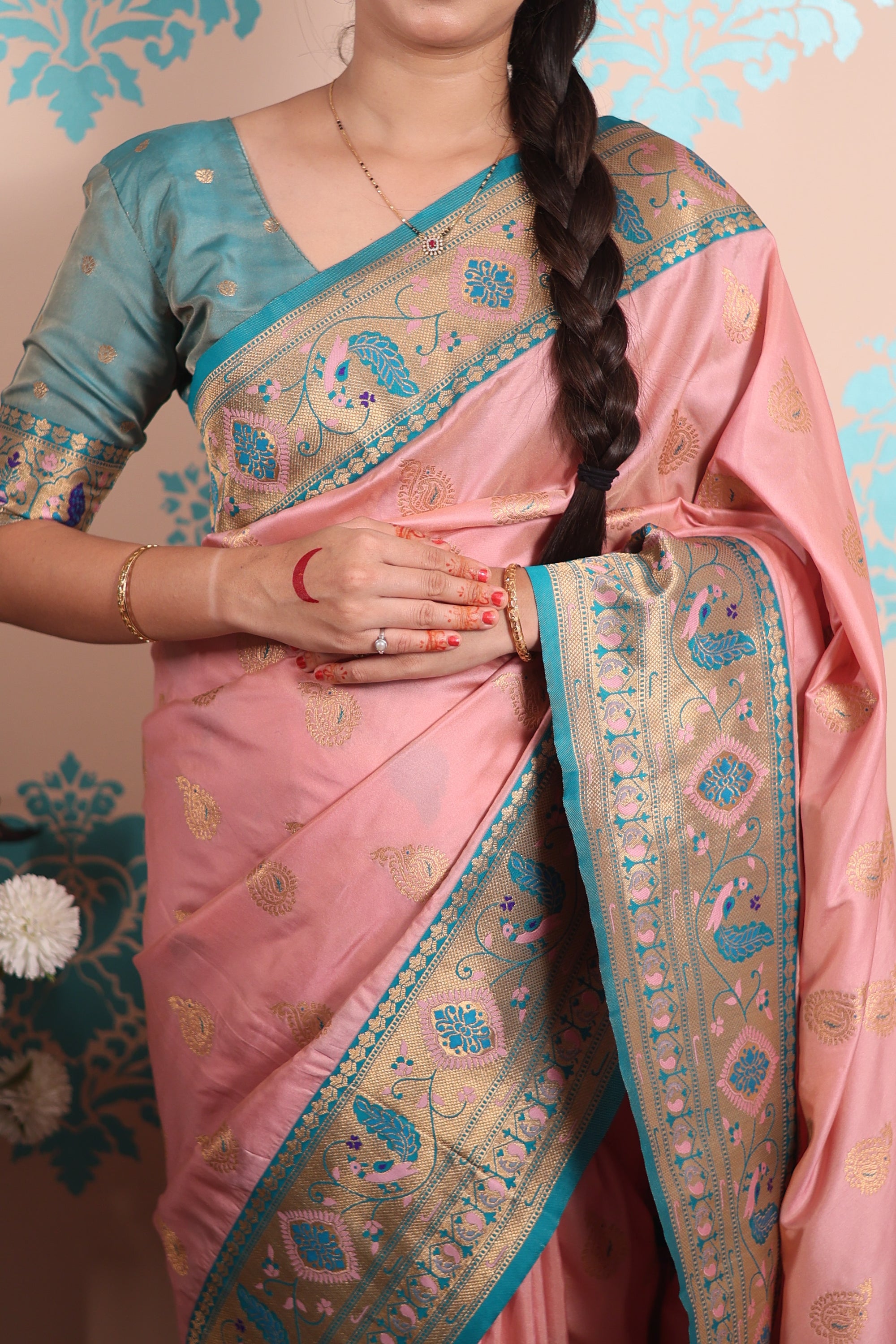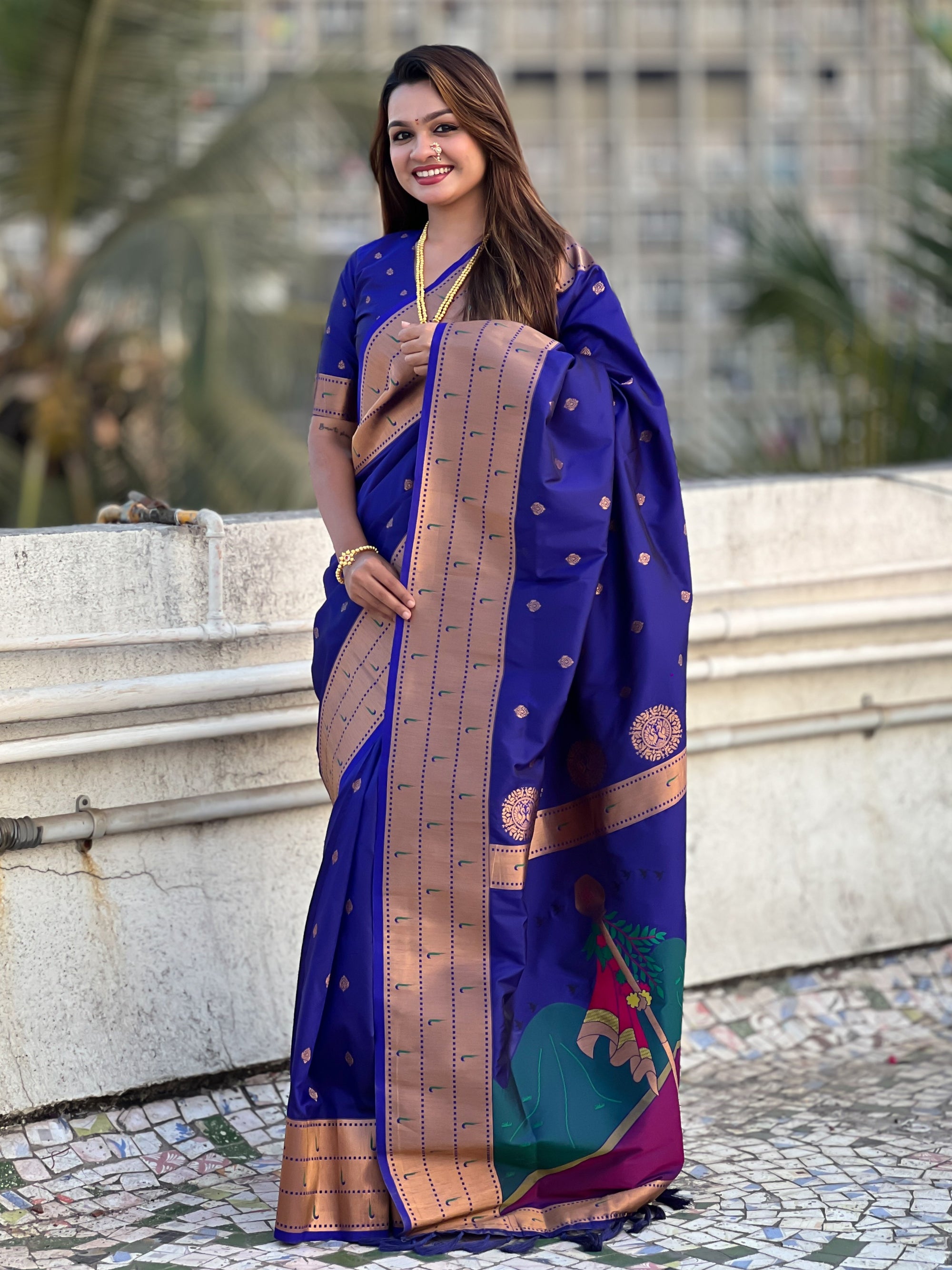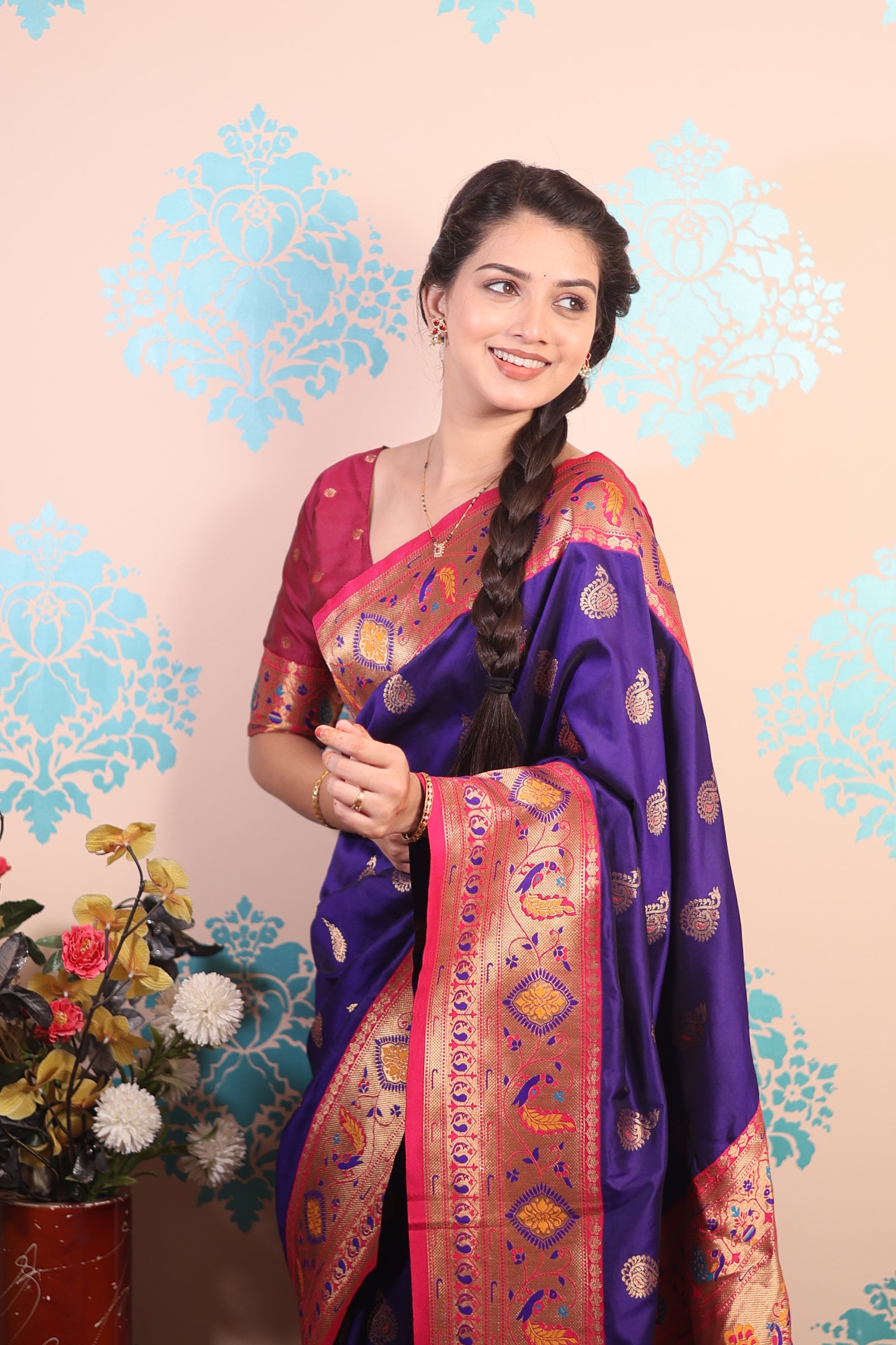 The Paithani saree is a true symbol of grace and heritage, crafted with luxurious silk and vibrant colors. Its intricate zari work, adorned with beautiful peacock and floral motifs, reflects unmatched artistry. A perfect blend of tradition and elegance, it is a treasure that enhances the beauty of every occasion, making every woman feel royal and radiant.