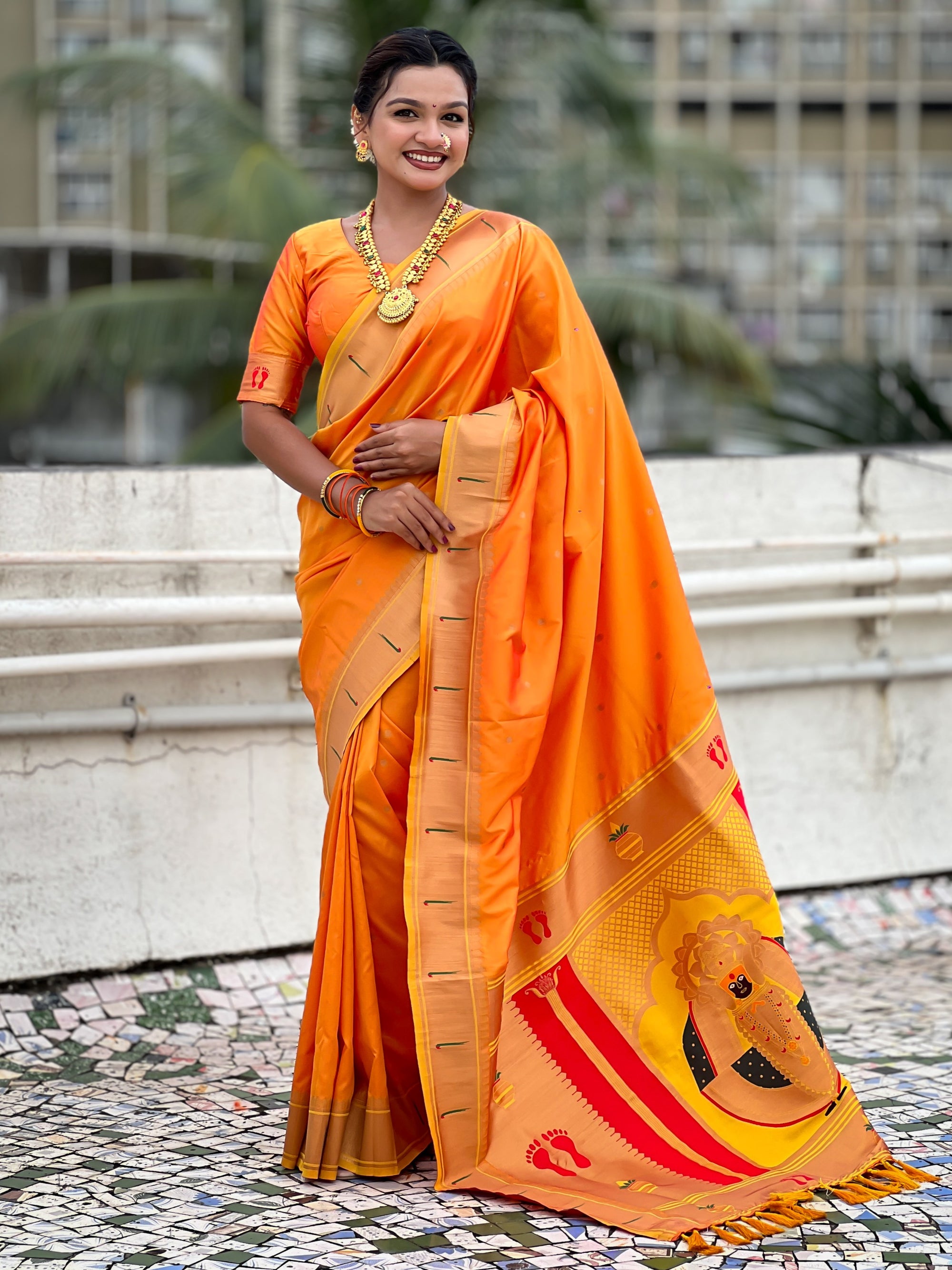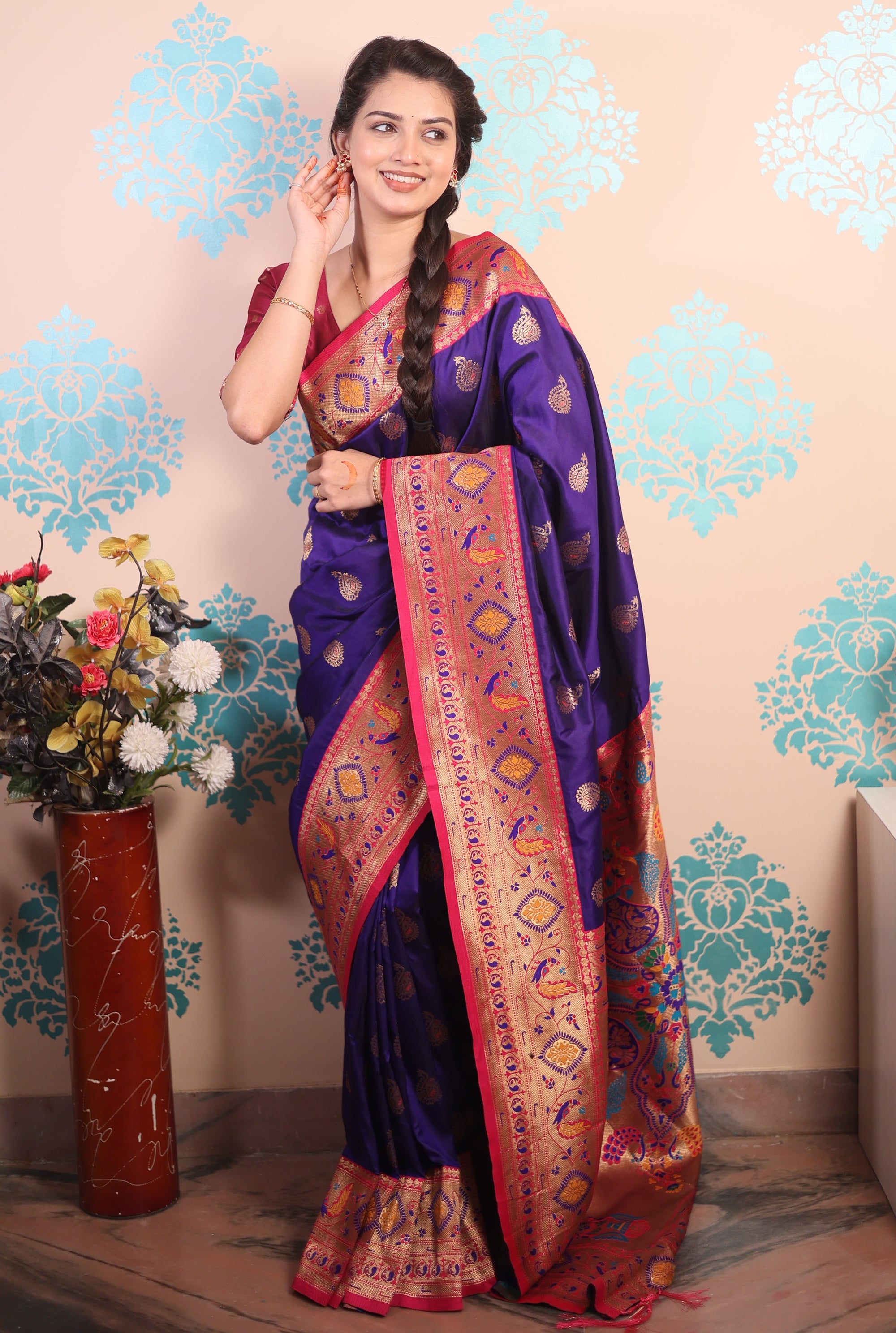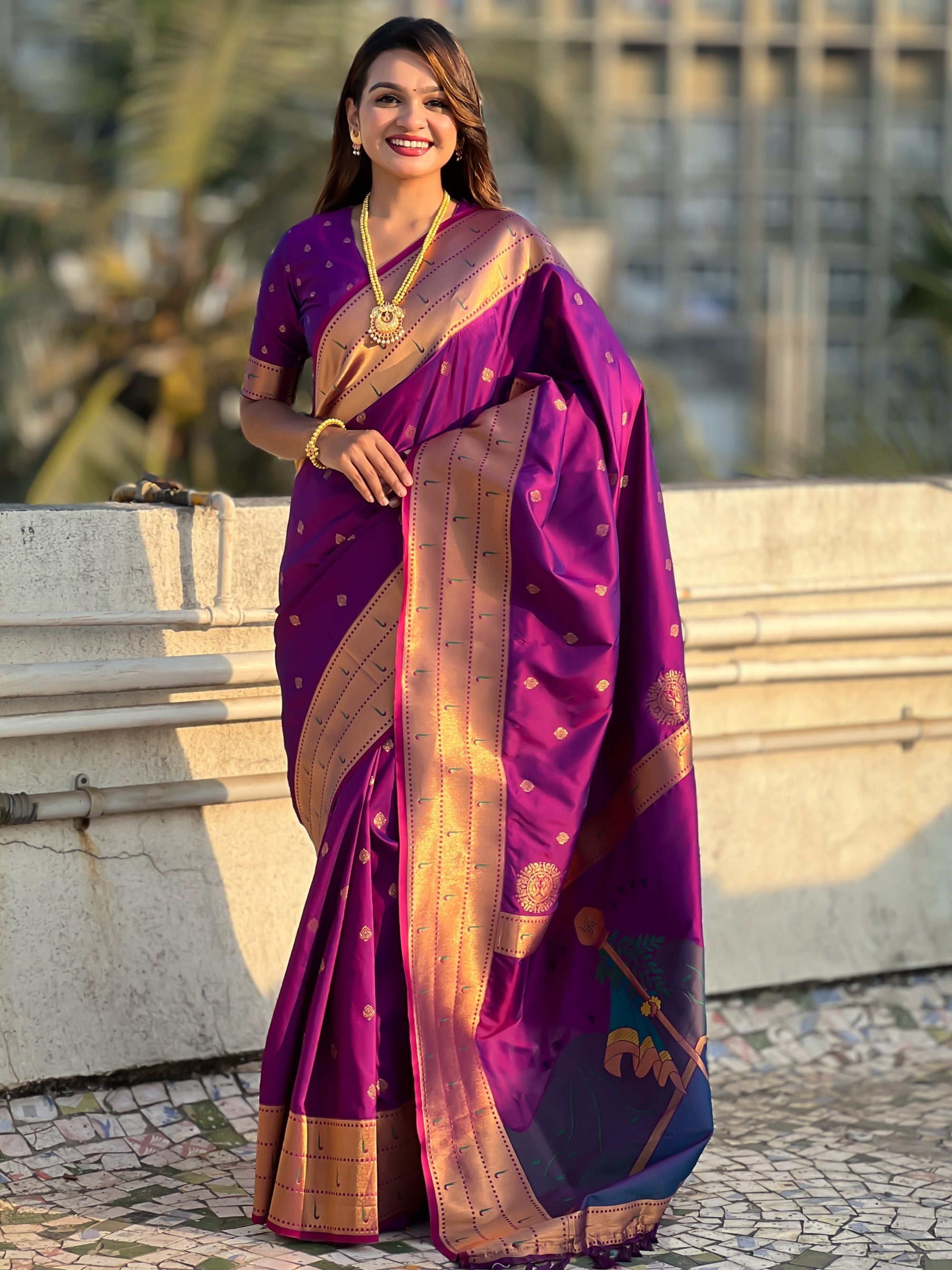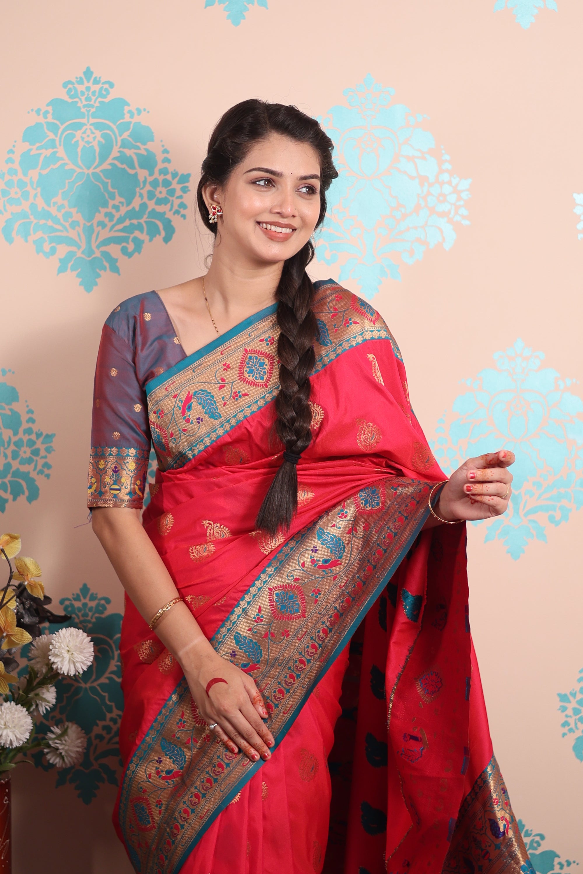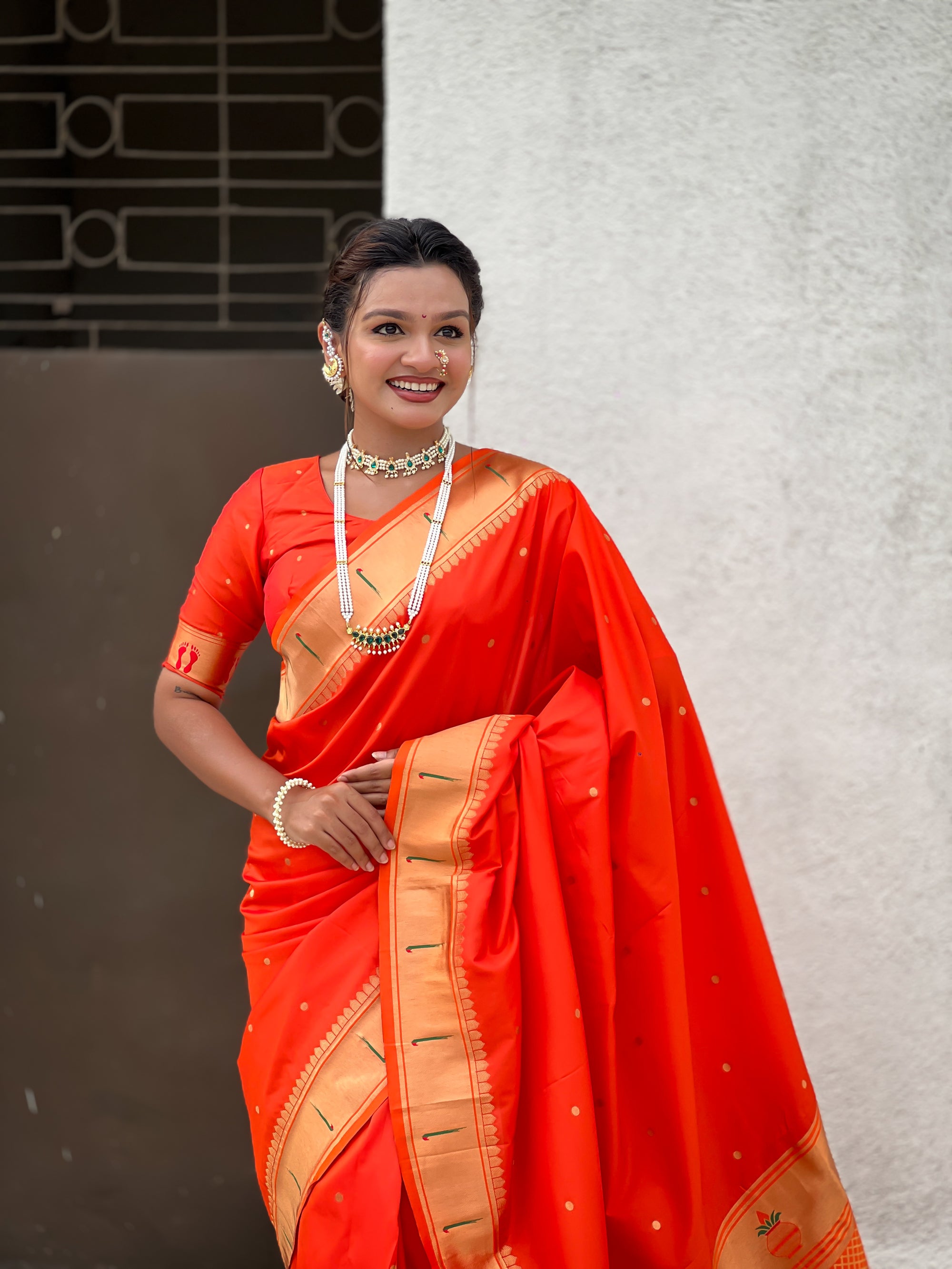 The Paithani saree is a true symbol of grace and heritage, crafted with luxurious silk and vibrant colors. Its intricate zari work, adorned with beautiful peacock and floral motifs, reflects unmatched artistry. A perfect blend of tradition and elegance, it is a treasure that enhances the beauty of every occasion, making every woman feel royal and radiant.