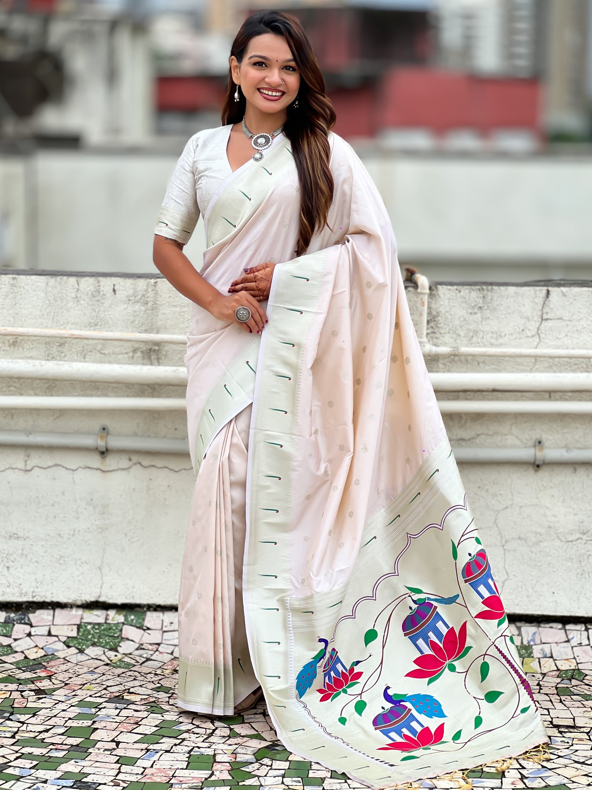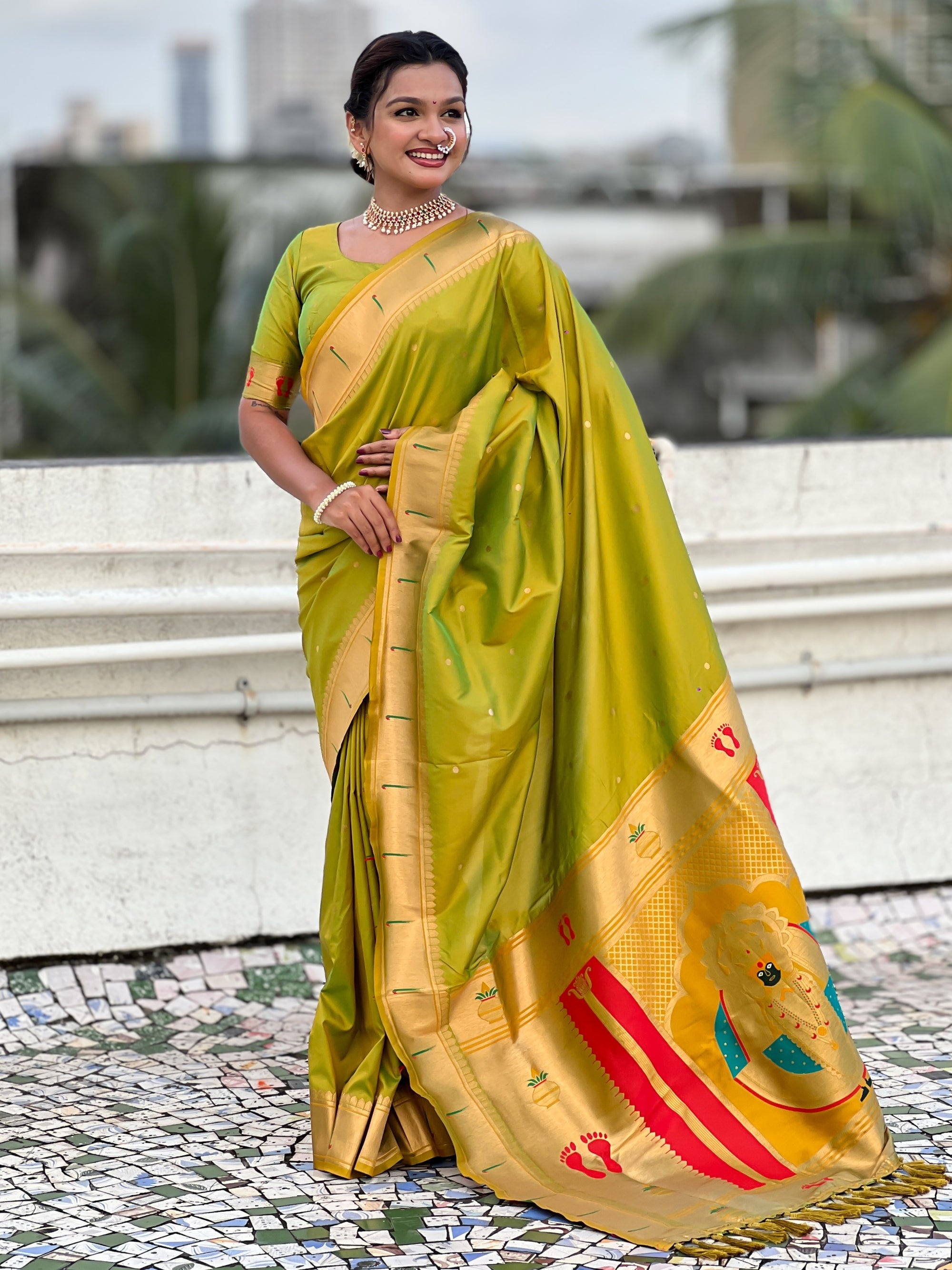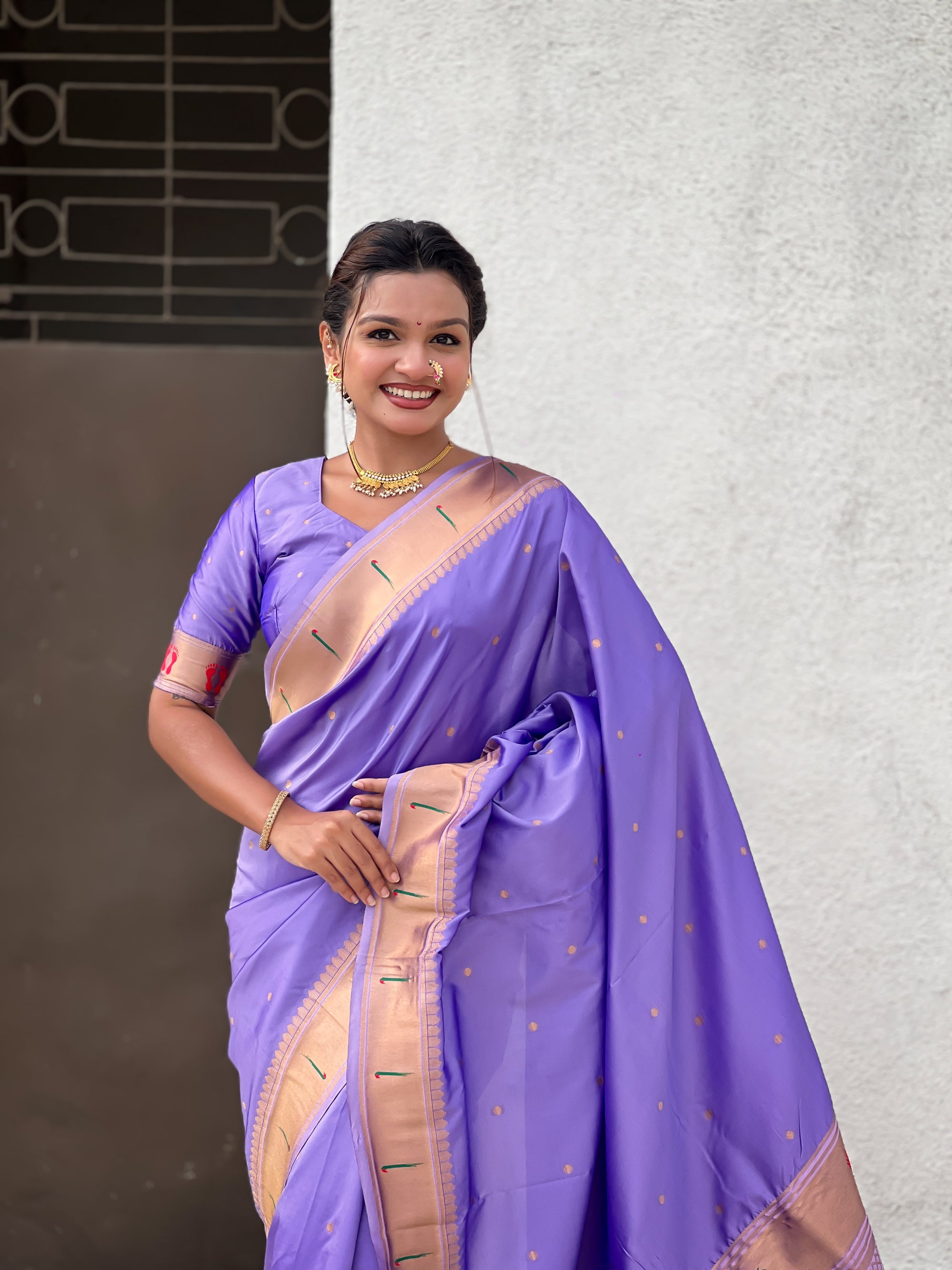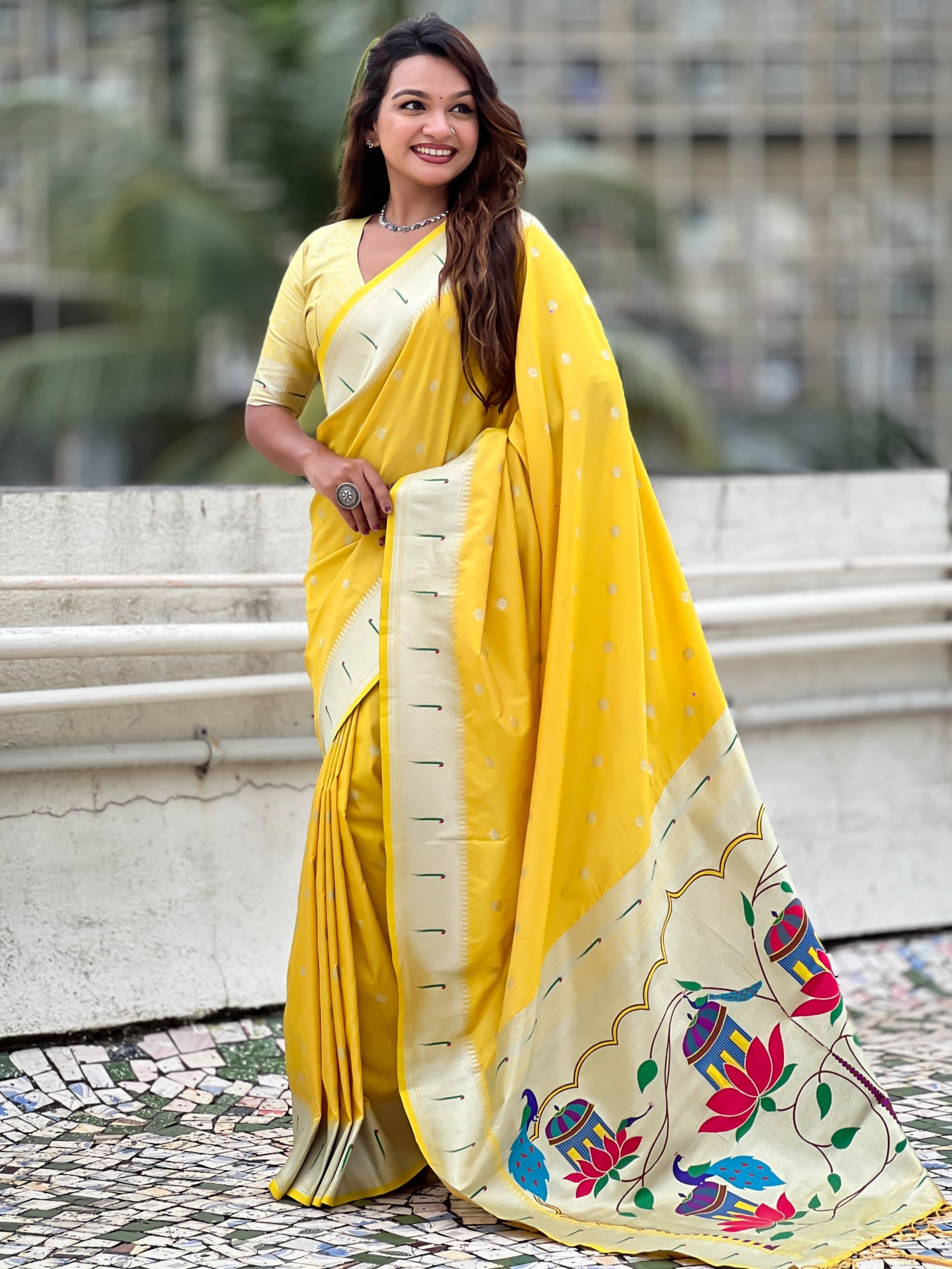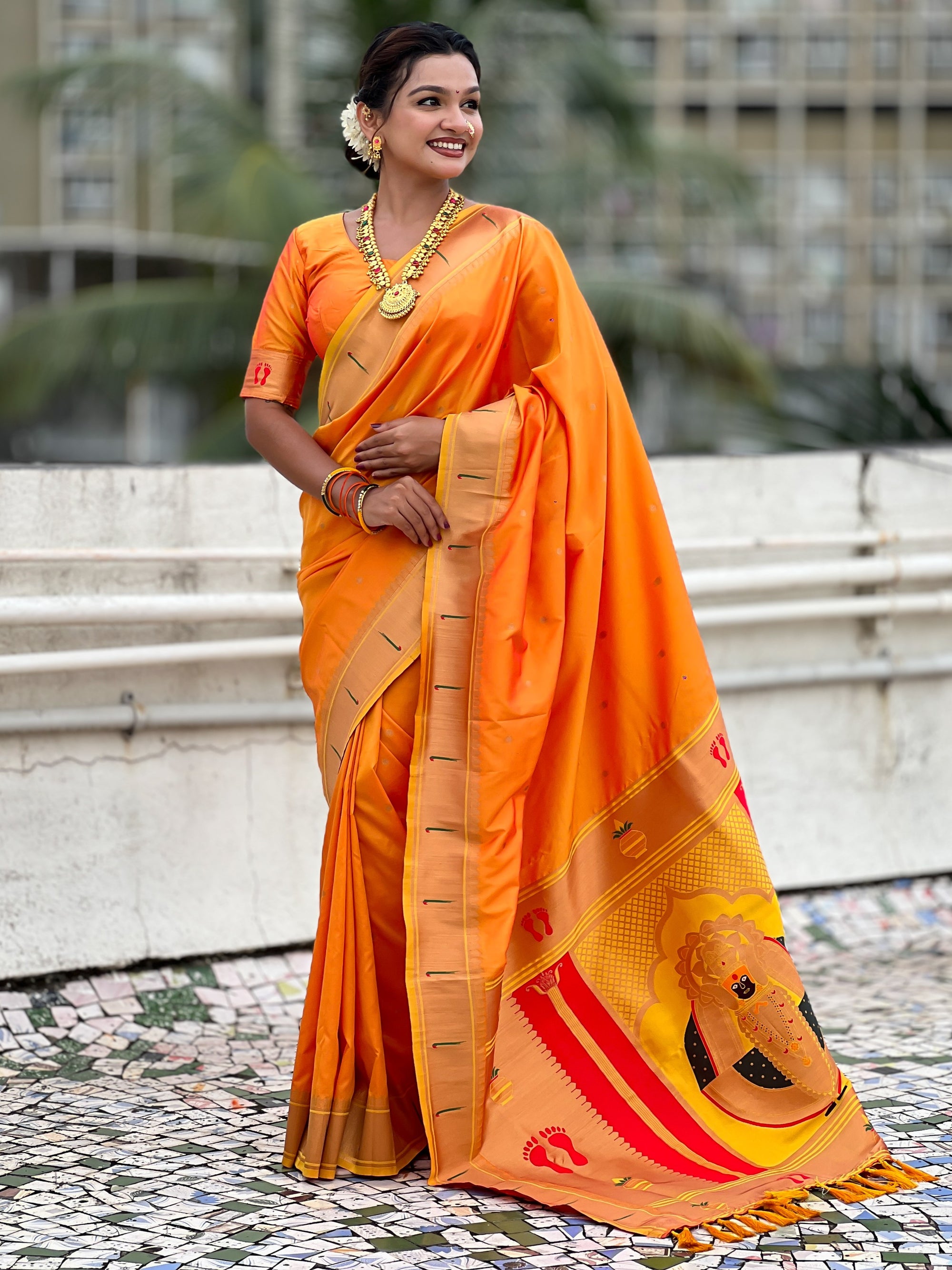 The Paithani saree is a true symbol of grace and heritage, crafted with luxurious silk and vibrant colors. Its intricate zari work, adorned with beautiful peacock and floral motifs, reflects unmatched artistry. A perfect blend of tradition and elegance, it is a treasure that enhances the beauty of every occasion, making every woman feel royal and radiant.