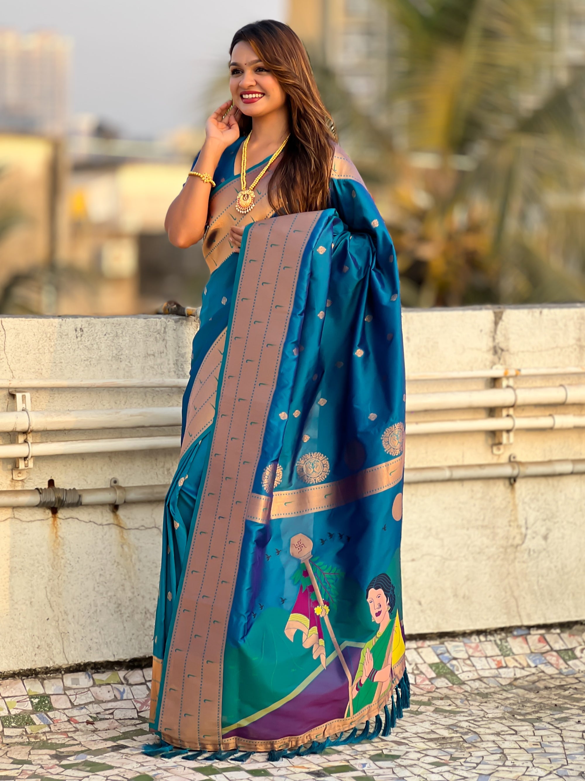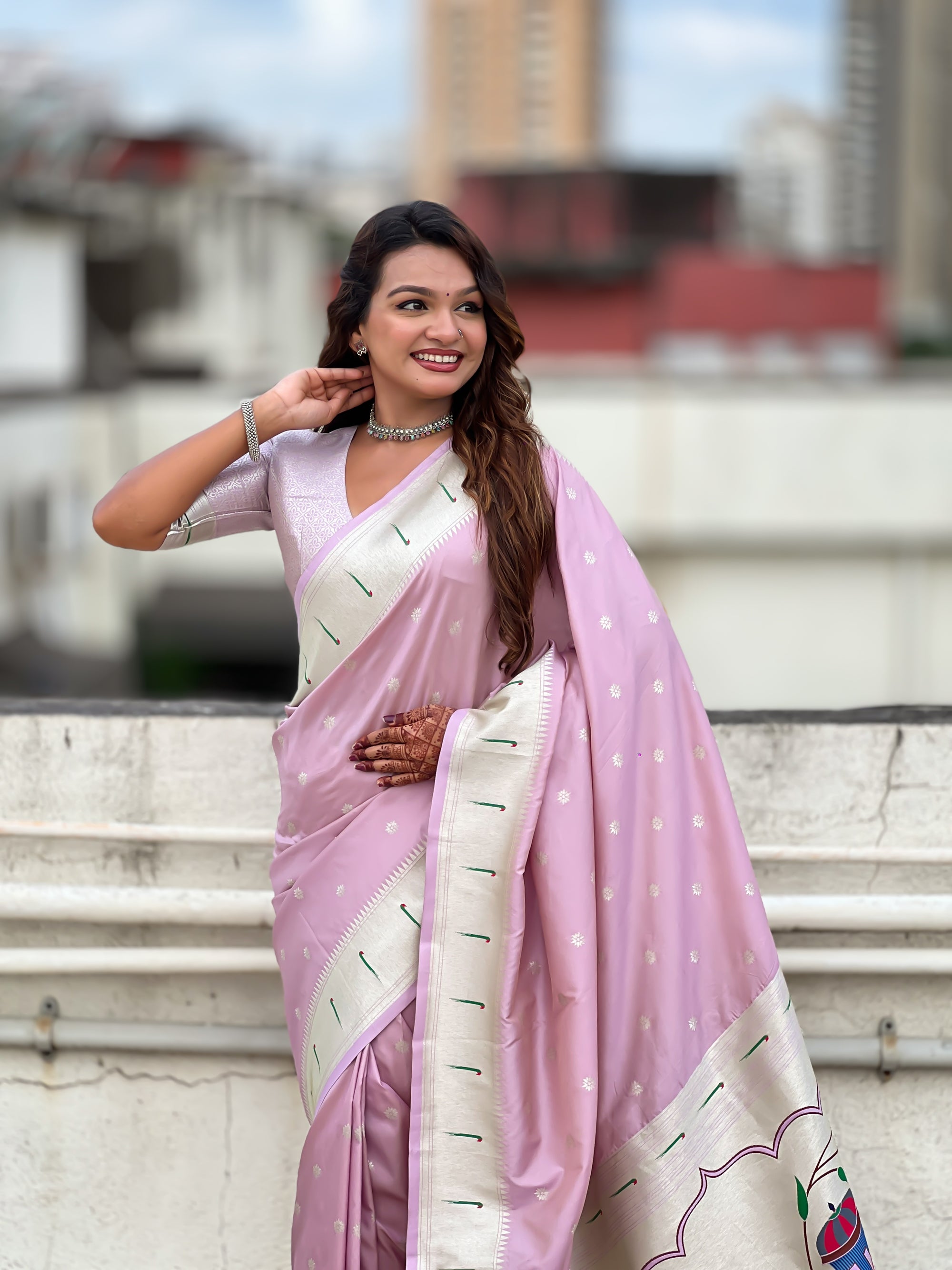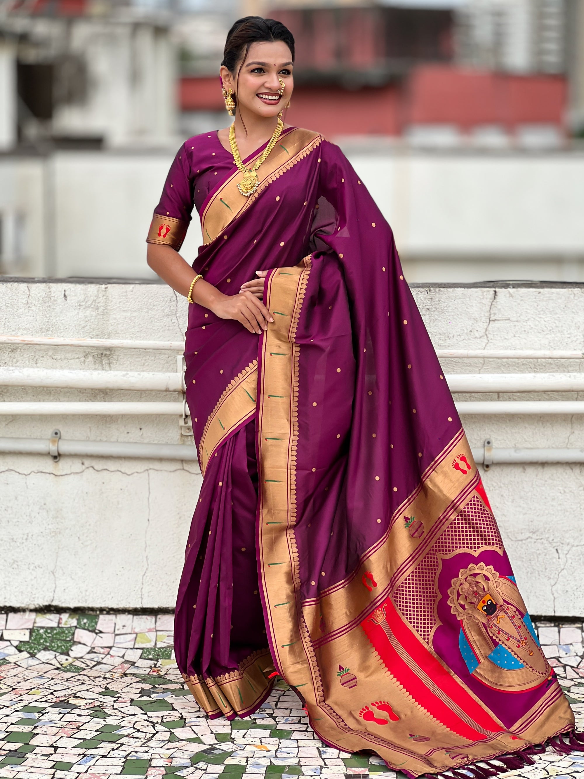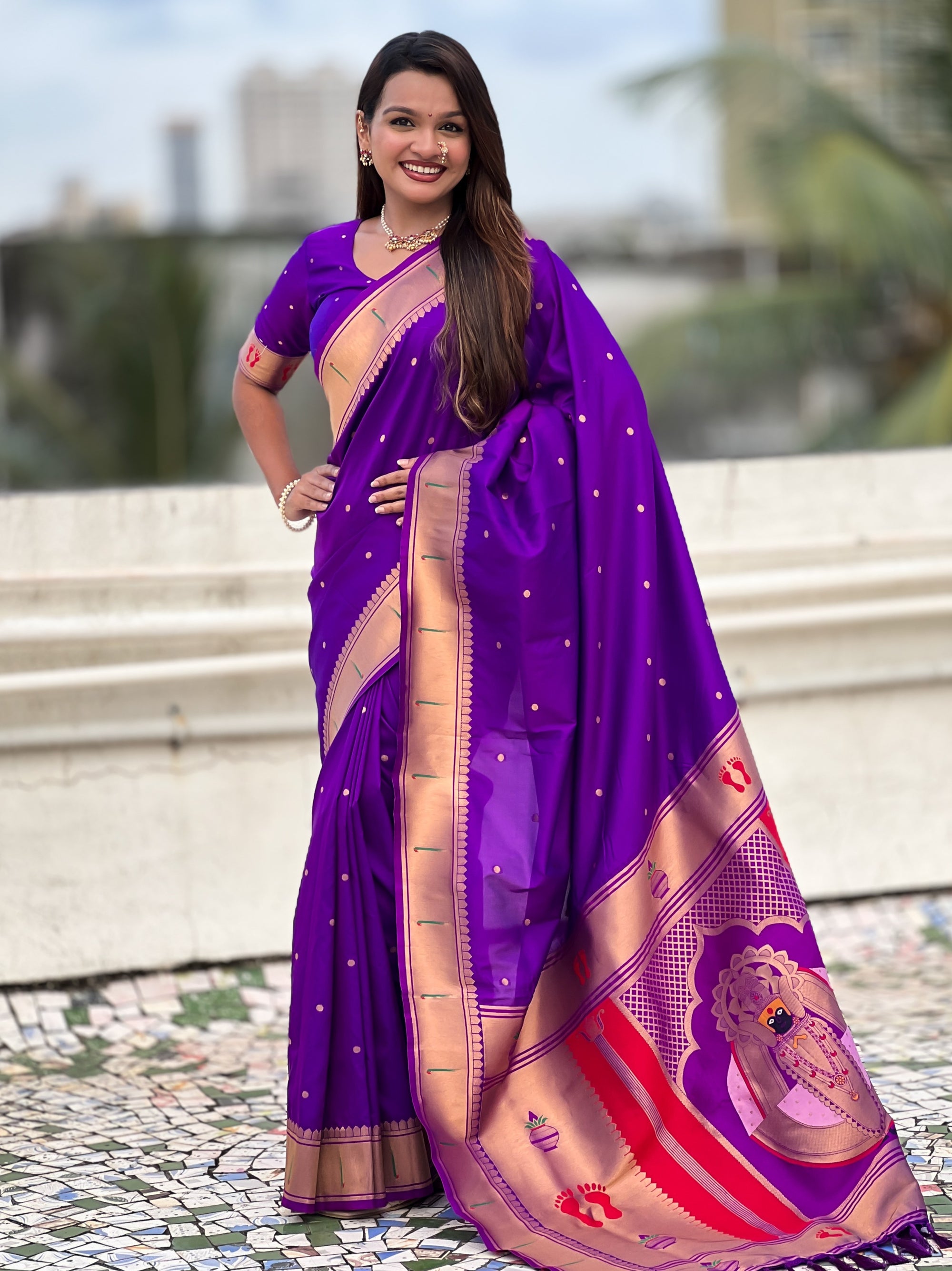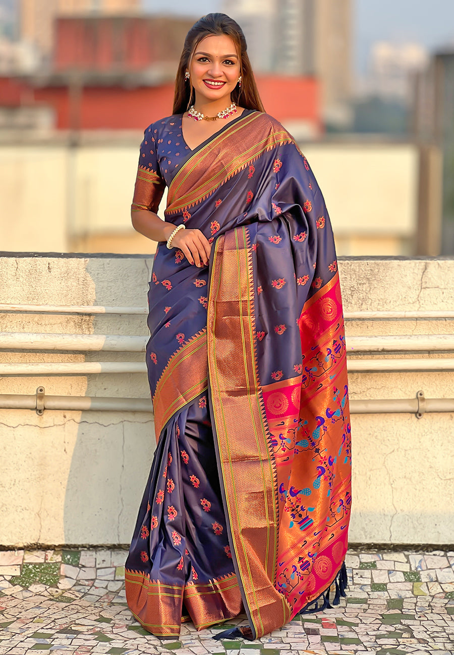 The Paithani saree is a true symbol of grace and heritage, crafted with luxurious silk and vibrant colors. Its intricate zari work, adorned with beautiful peacock and floral motifs, reflects unmatched artistry. A perfect blend of tradition and elegance, it is a treasure that enhances the beauty of every occasion, making every woman feel royal and radiant.