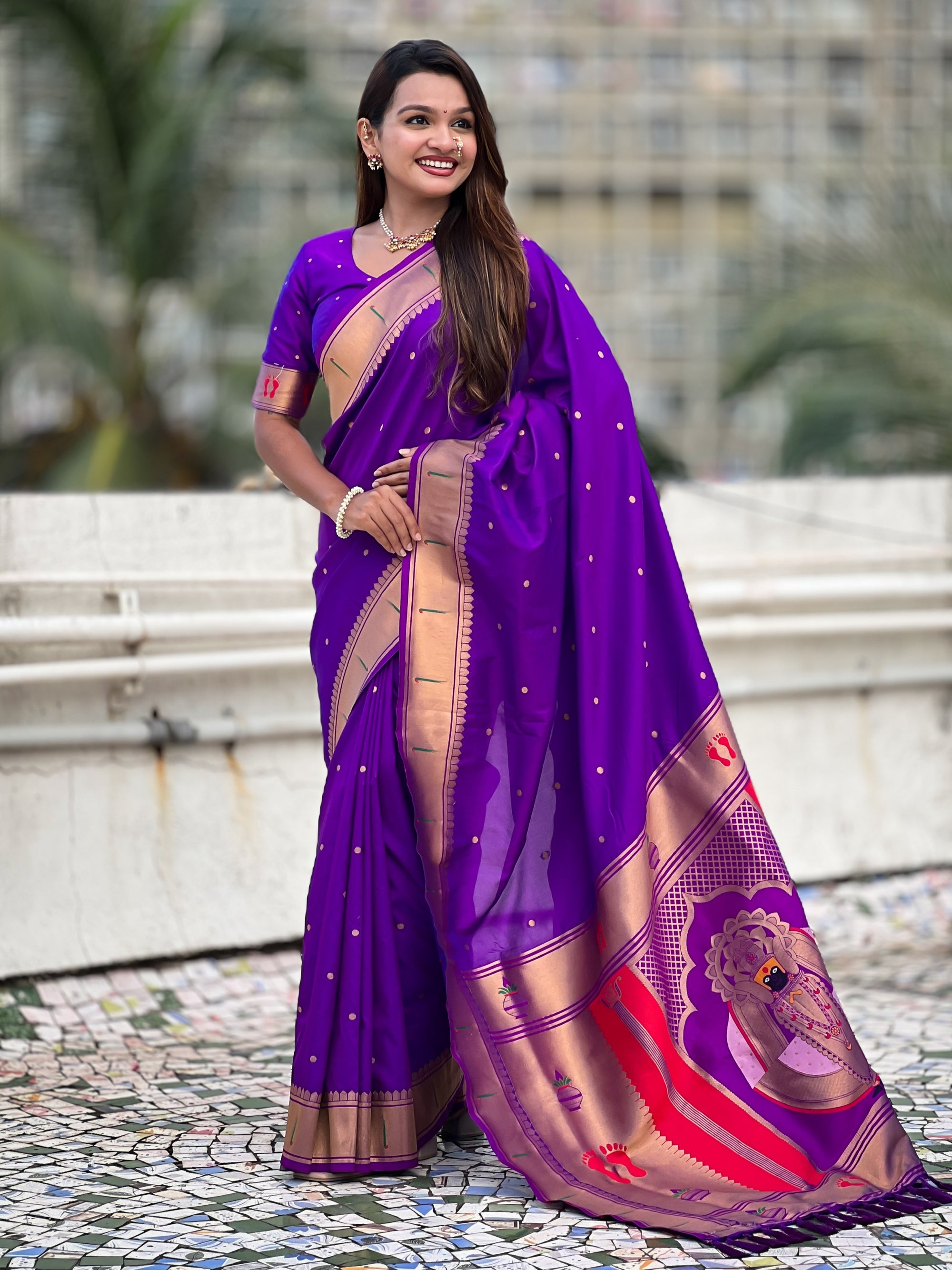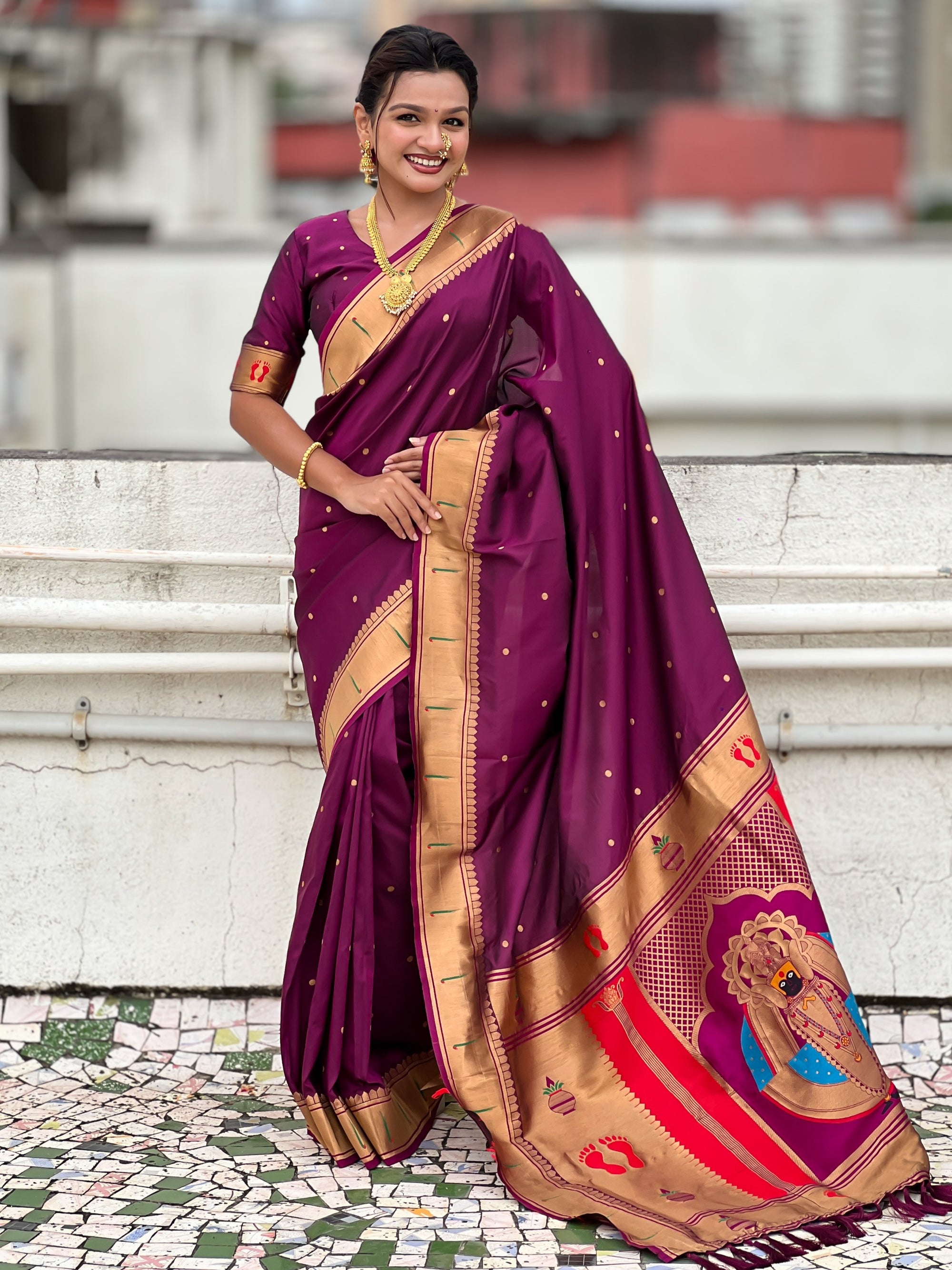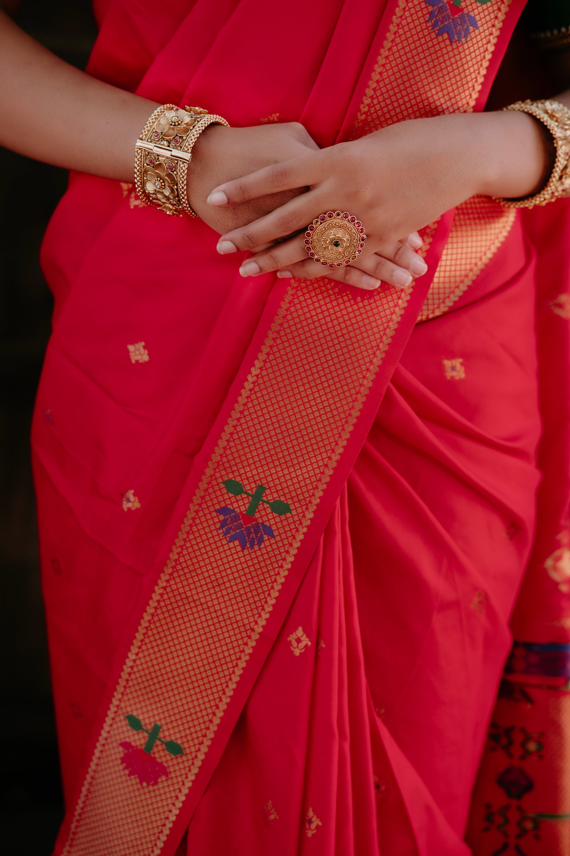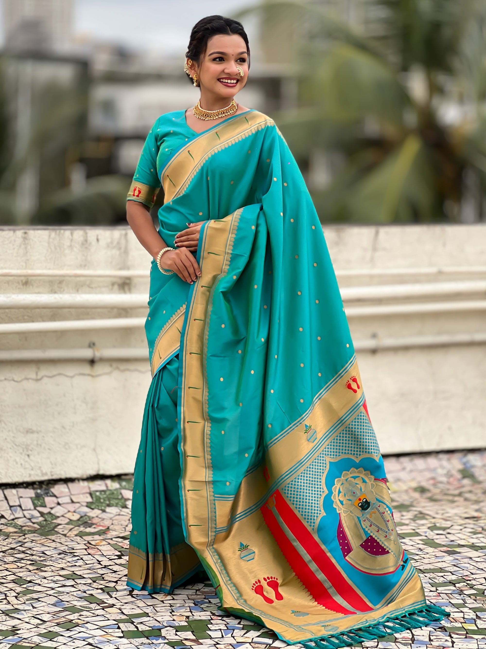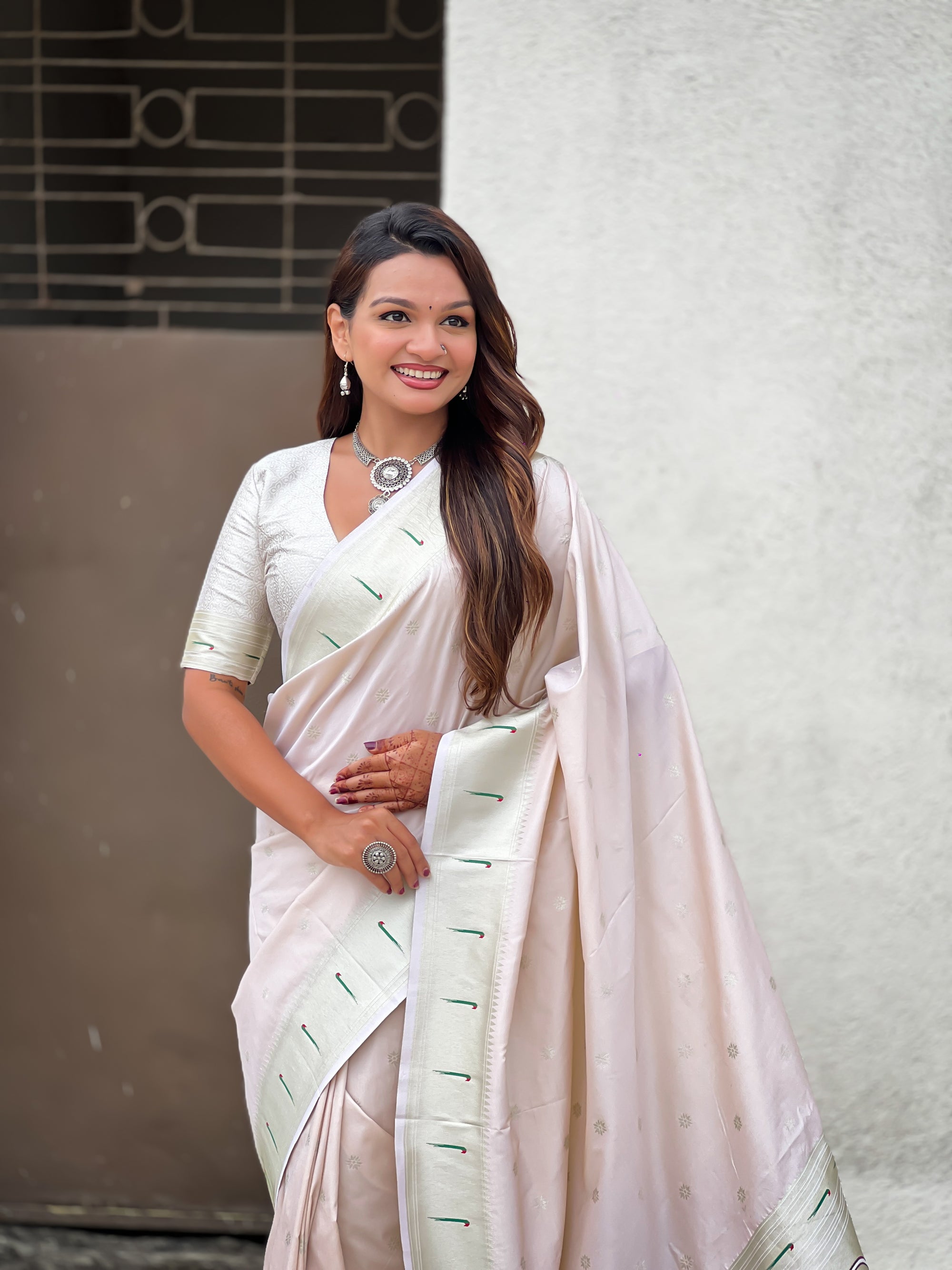 The Paithani saree is a true symbol of grace and heritage, crafted with luxurious silk and vibrant colors. Its intricate zari work, adorned with beautiful peacock and floral motifs, reflects unmatched artistry. A perfect blend of tradition and elegance, it is a treasure that enhances the beauty of every occasion, making every woman feel royal and radiant.