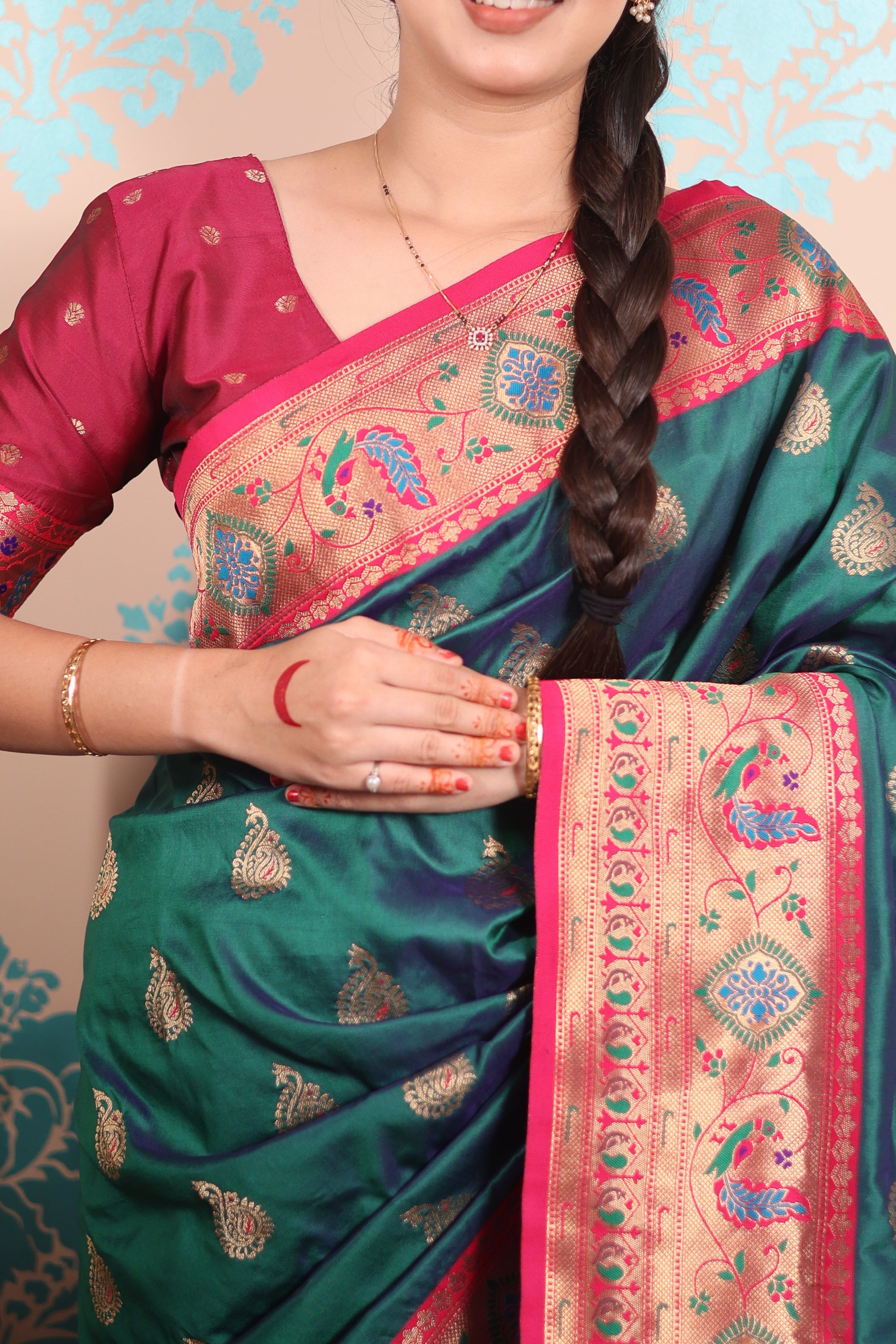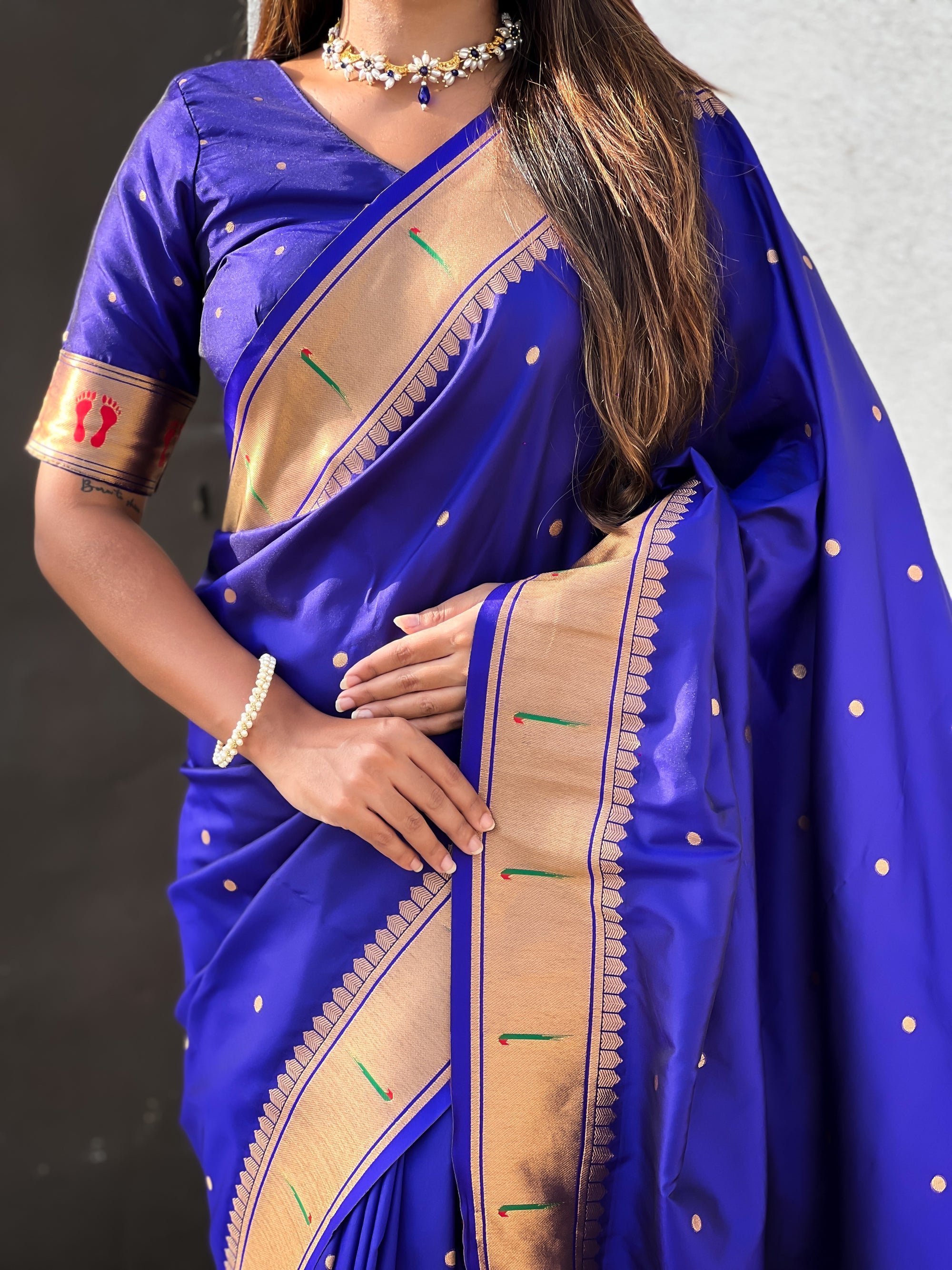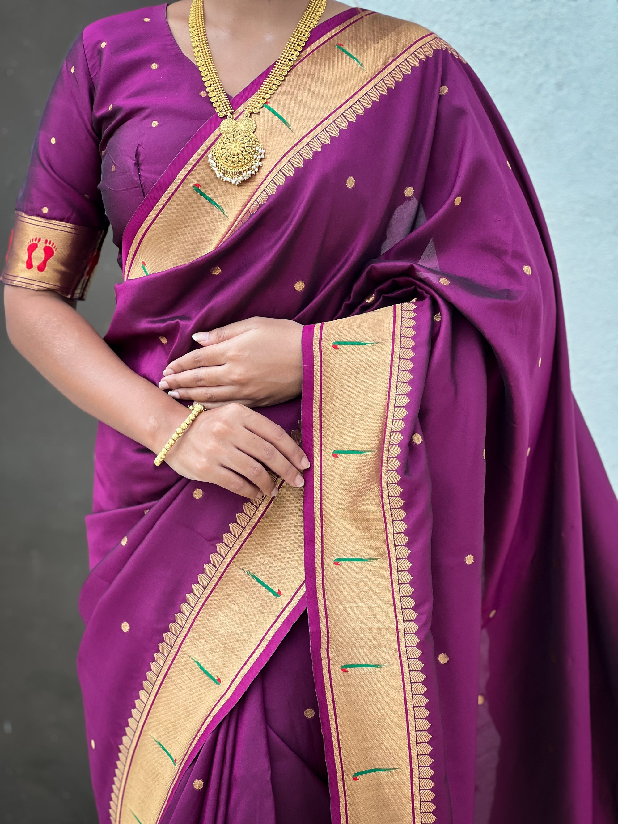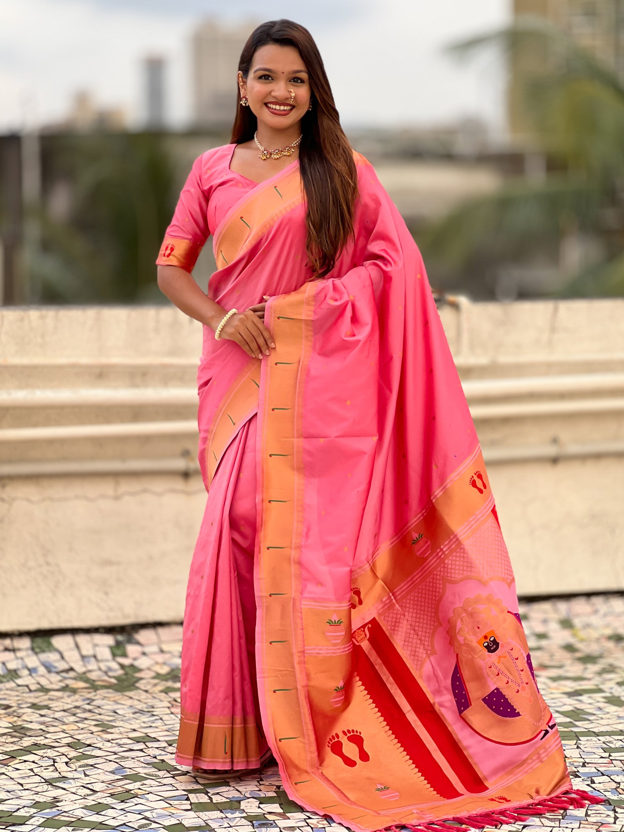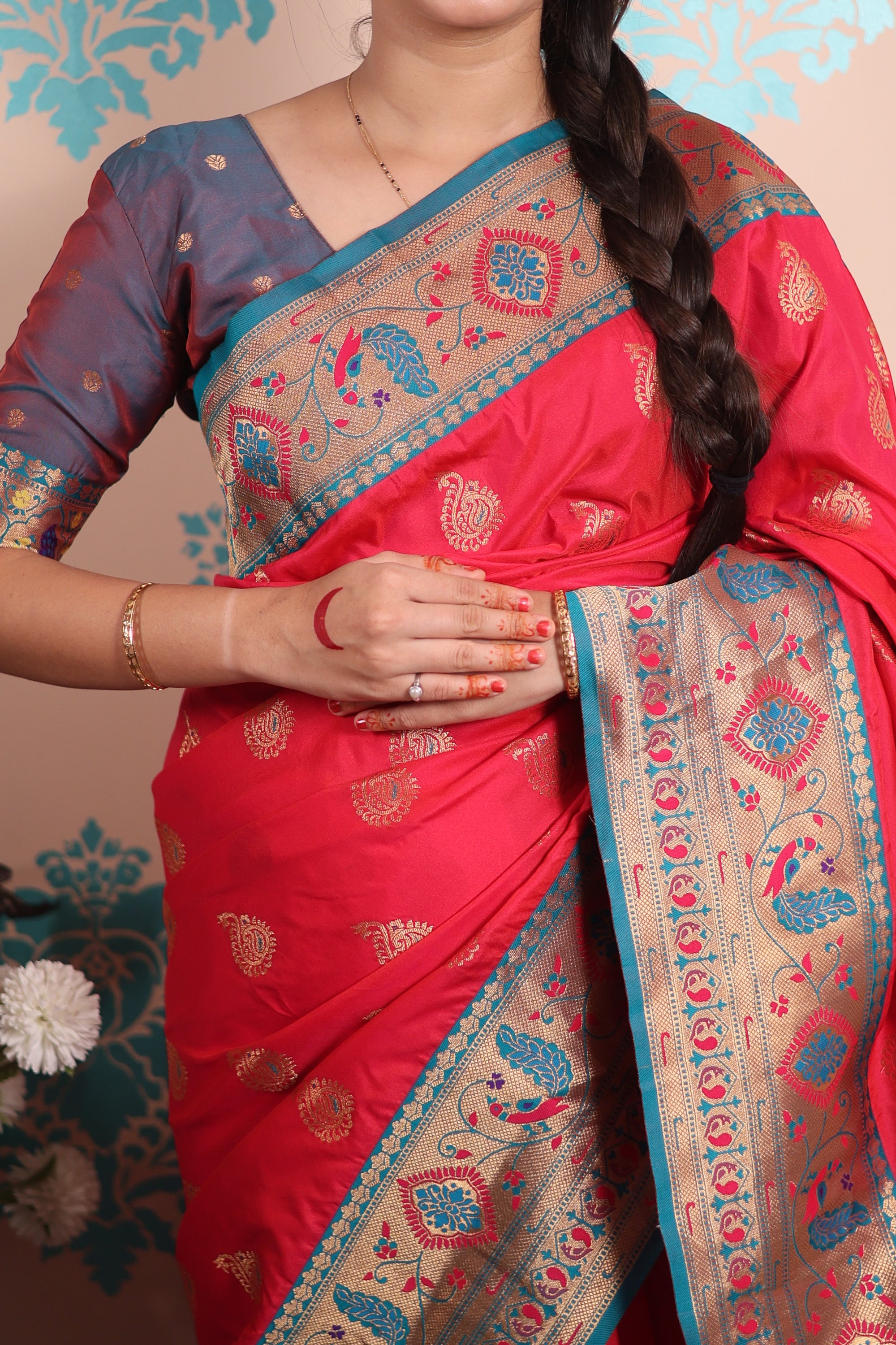 The Paithani saree is a true symbol of grace and heritage, crafted with luxurious silk and vibrant colors. Its intricate zari work, adorned with beautiful peacock and floral motifs, reflects unmatched artistry. A perfect blend of tradition and elegance, it is a treasure that enhances the beauty of every occasion, making every woman feel royal and radiant.