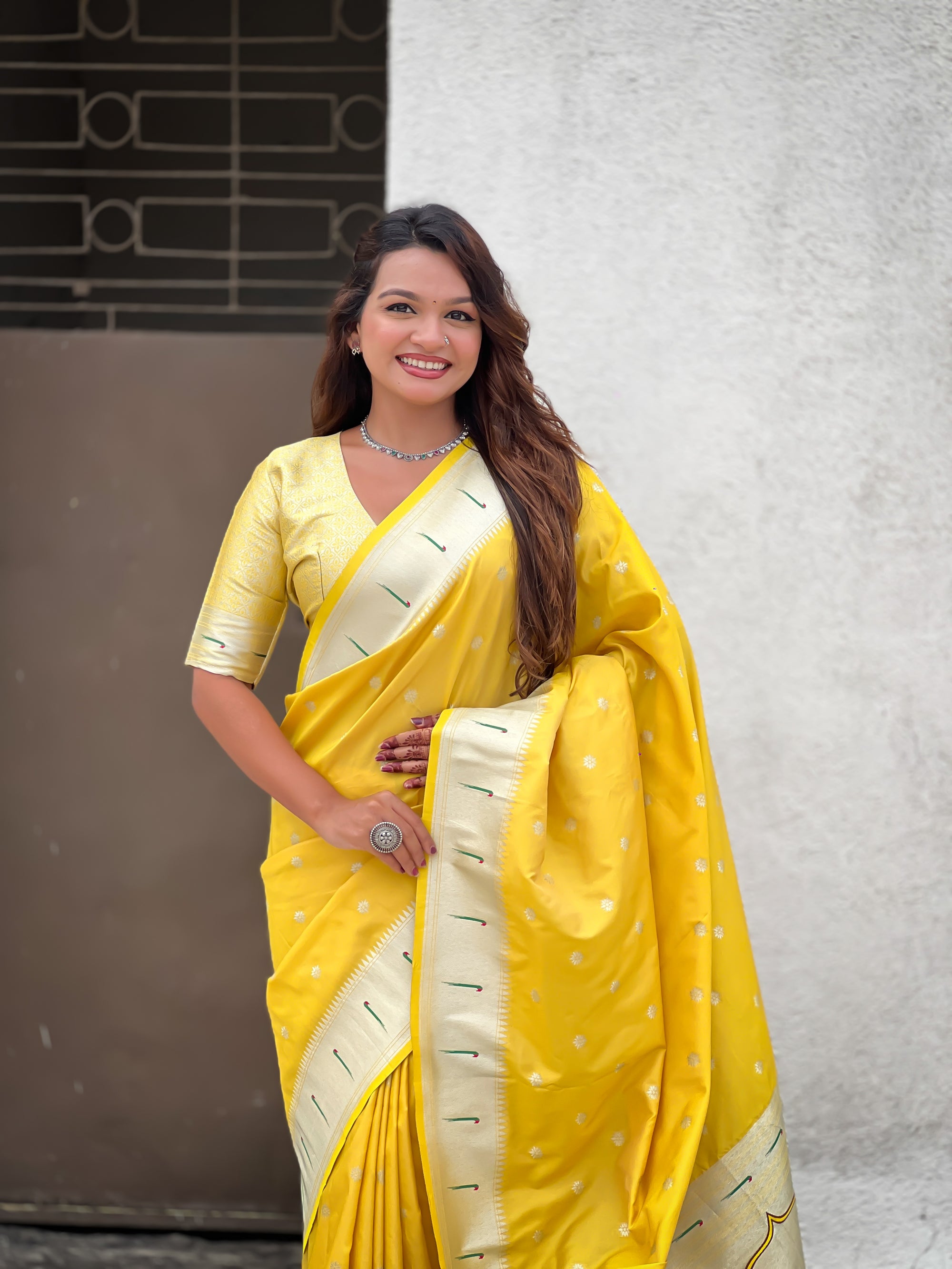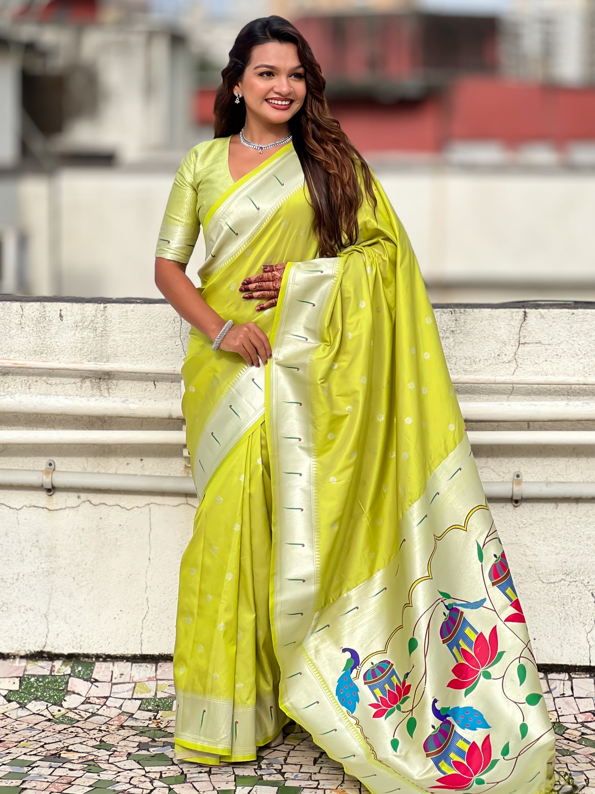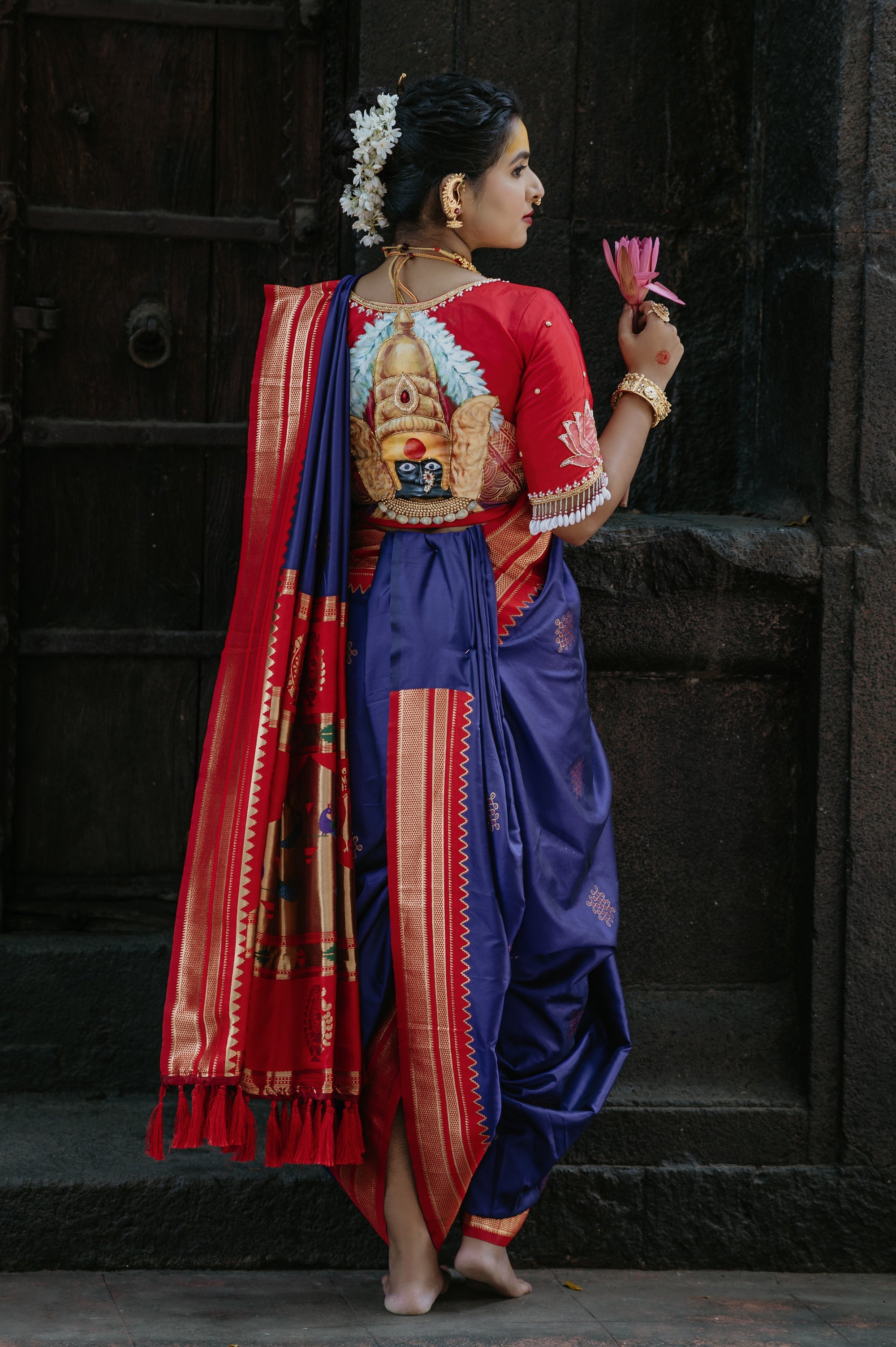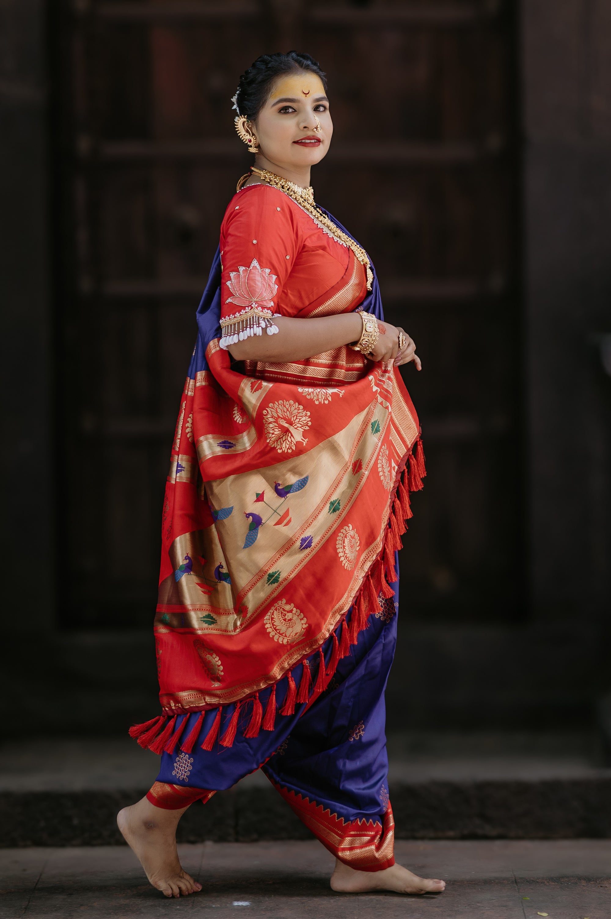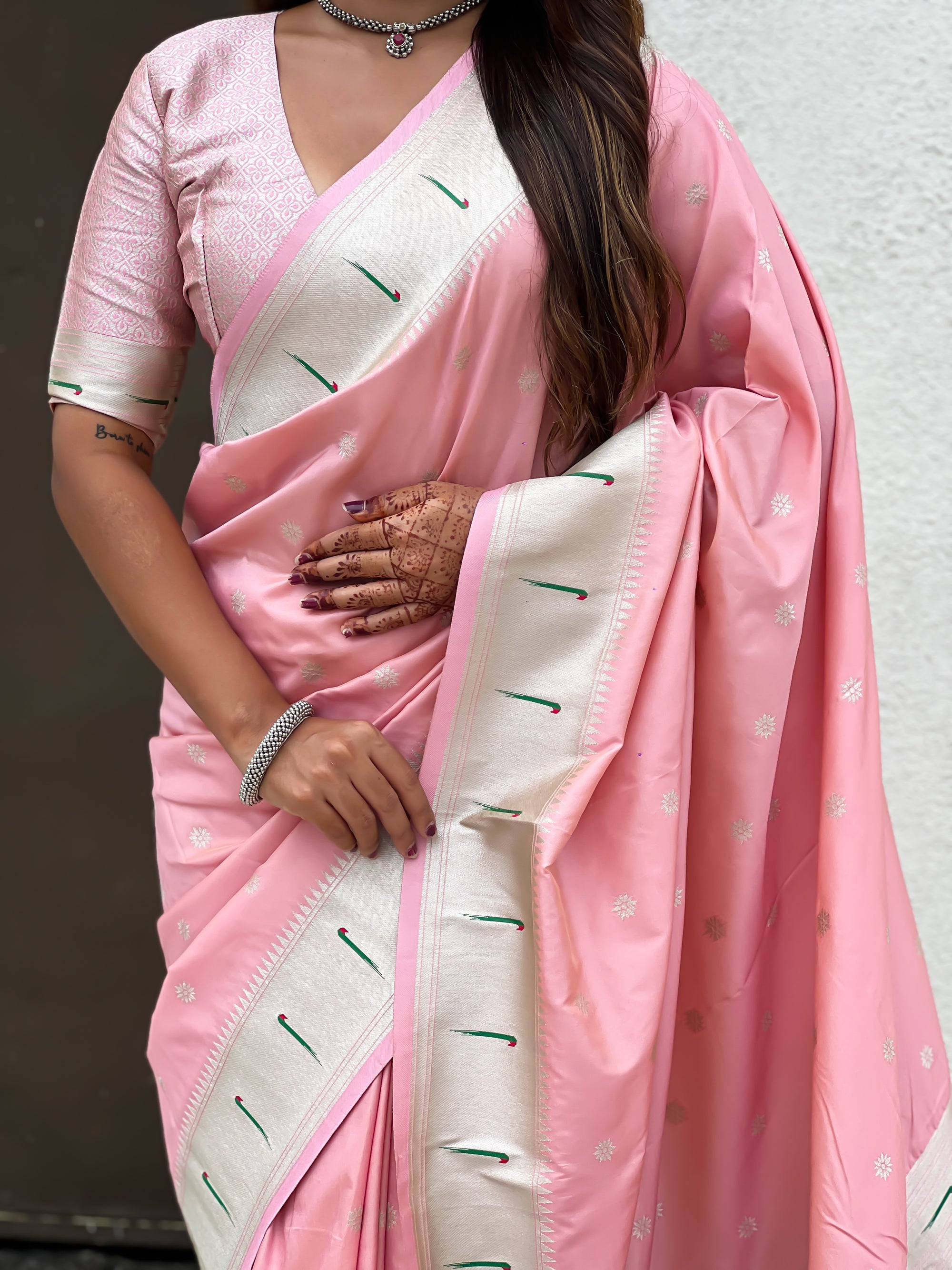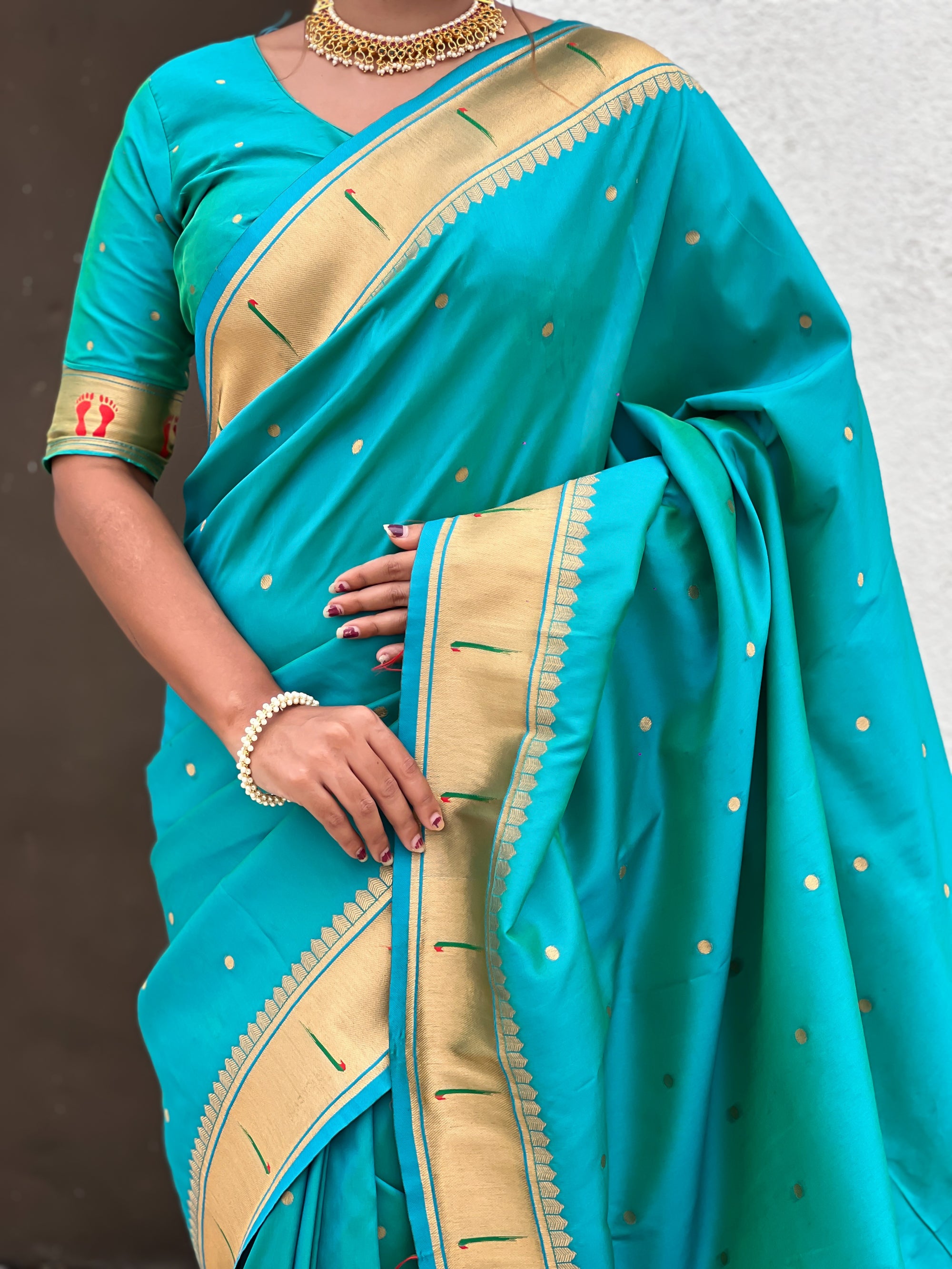 The Paithani saree is a true symbol of grace and heritage, crafted with luxurious silk and vibrant colors. Its intricate zari work, adorned with beautiful peacock and floral motifs, reflects unmatched artistry. A perfect blend of tradition and elegance, it is a treasure that enhances the beauty of every occasion, making every woman feel royal and radiant.
