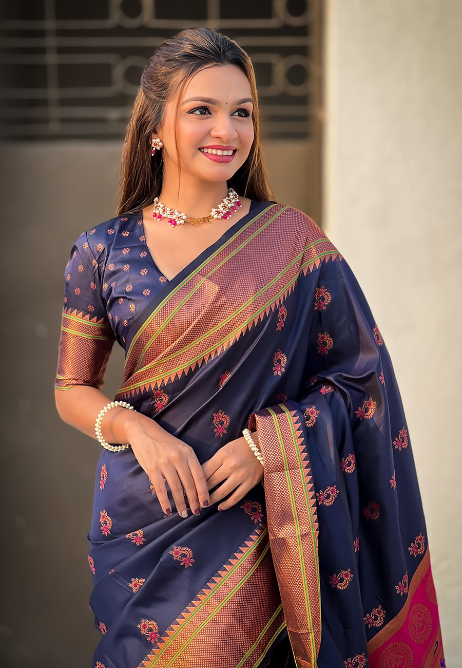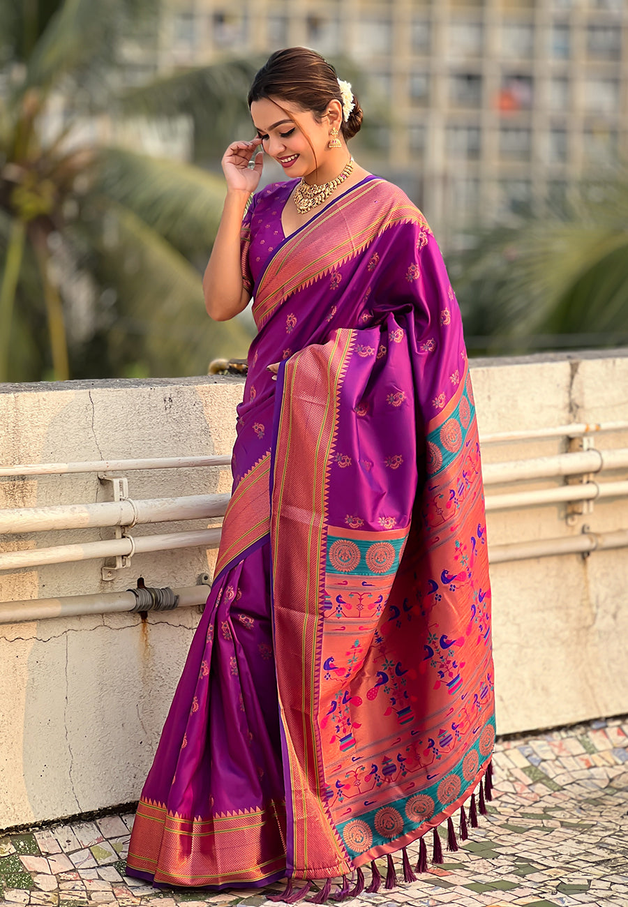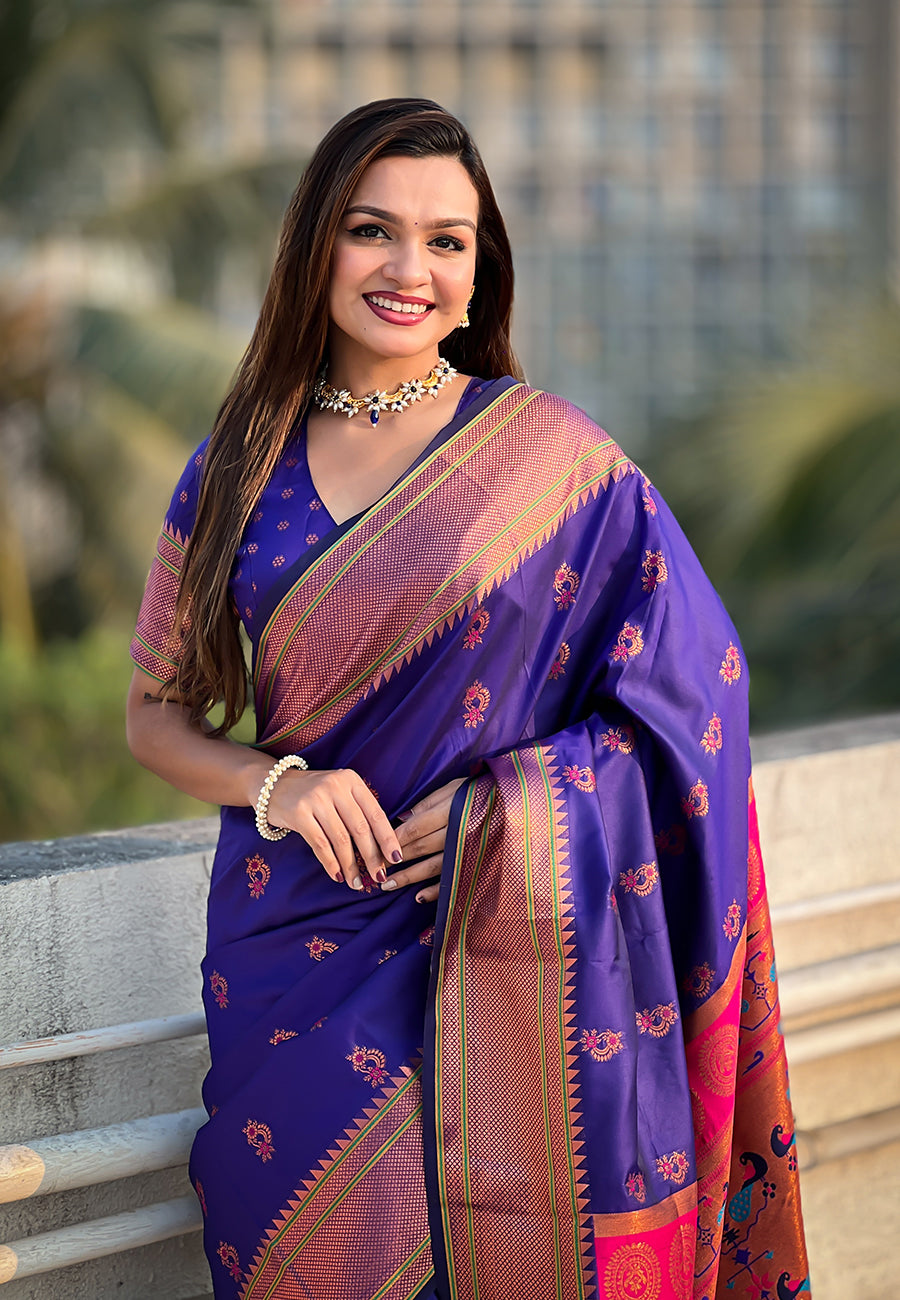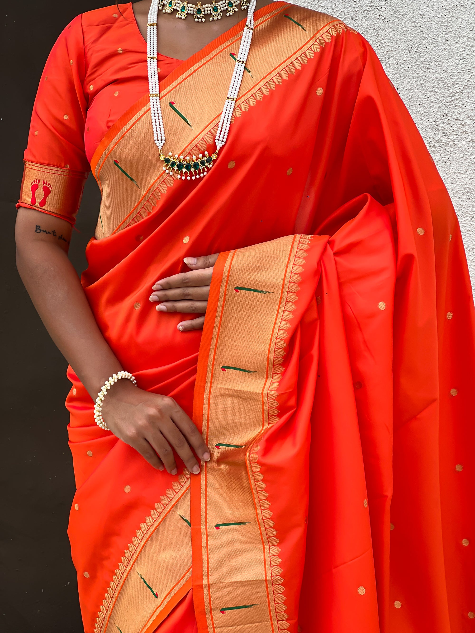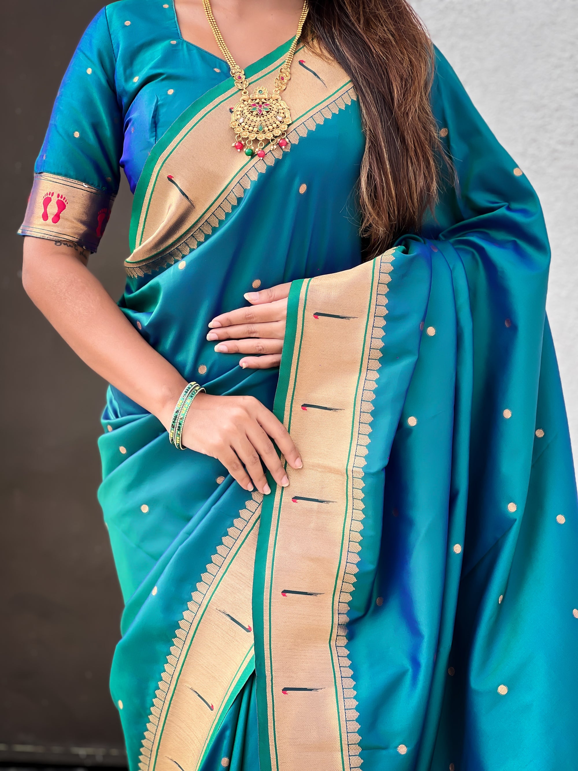 The Paithani saree is a true symbol of grace and heritage, crafted with luxurious silk and vibrant colors. Its intricate zari work, adorned with beautiful peacock and floral motifs, reflects unmatched artistry. A perfect blend of tradition and elegance, it is a treasure that enhances the beauty of every occasion, making every woman feel royal and radiant.