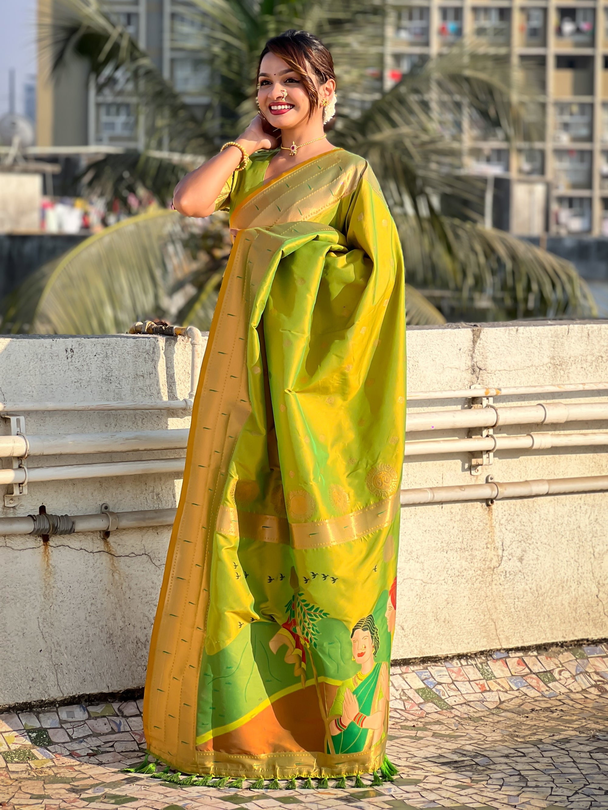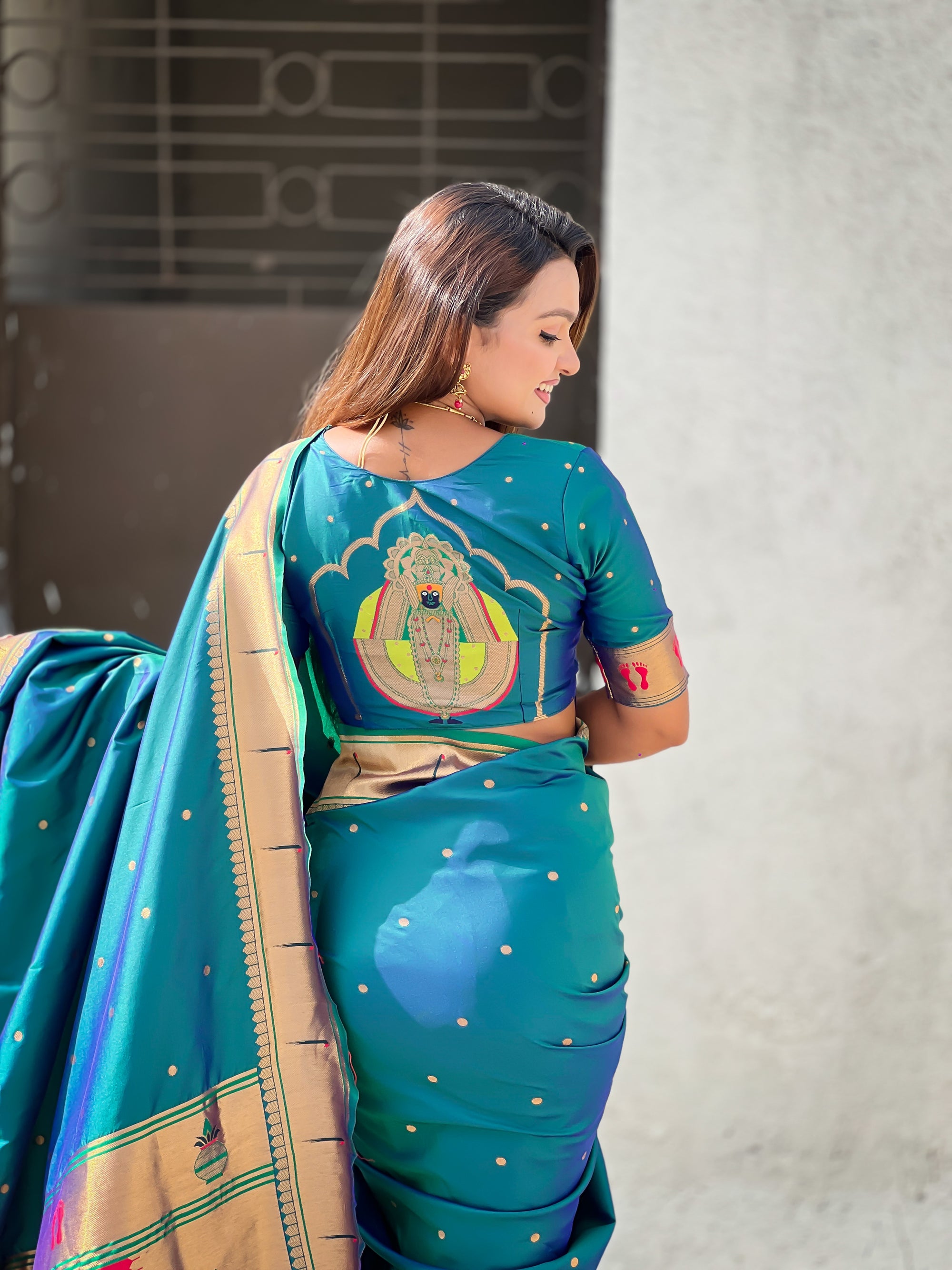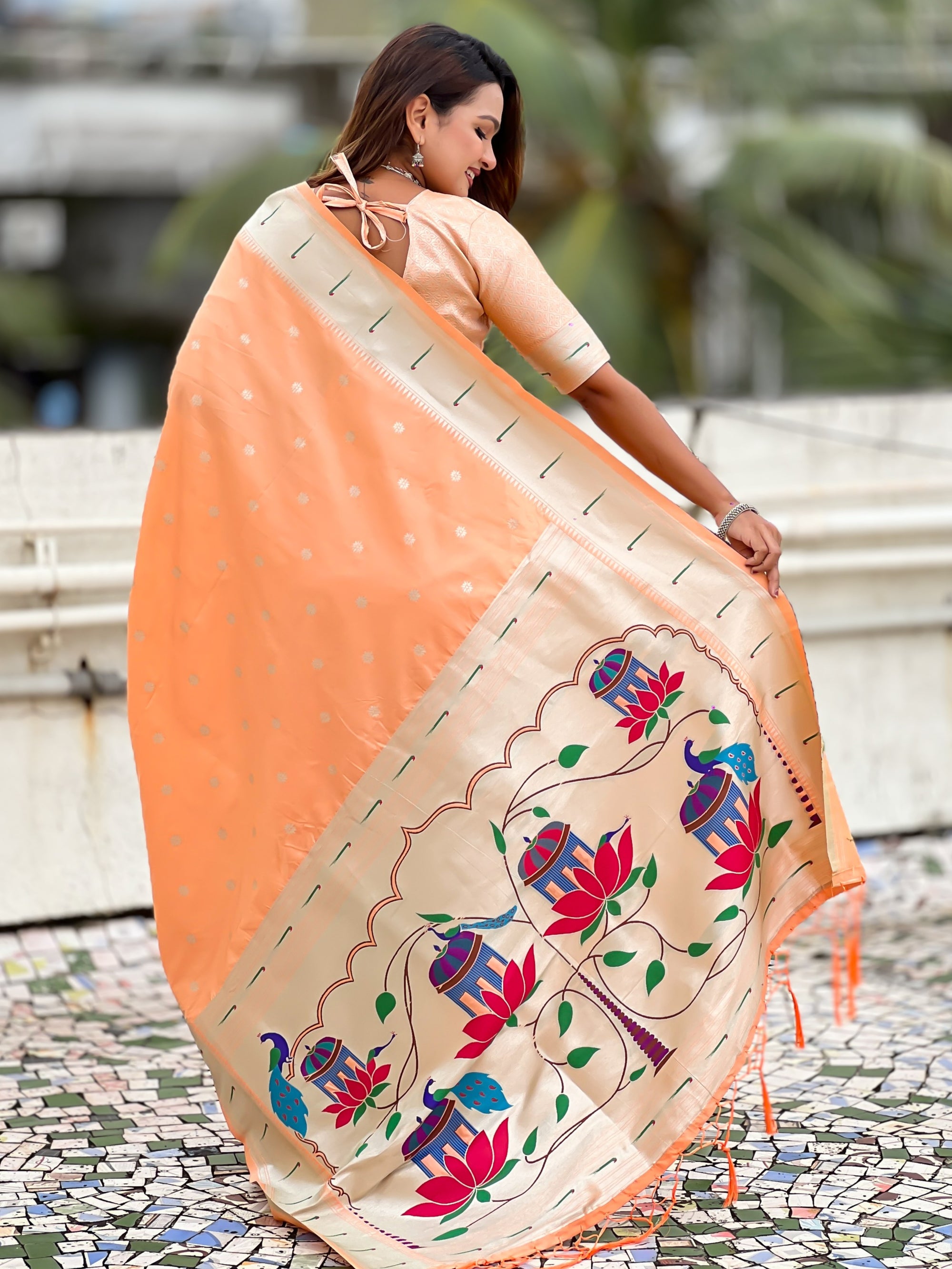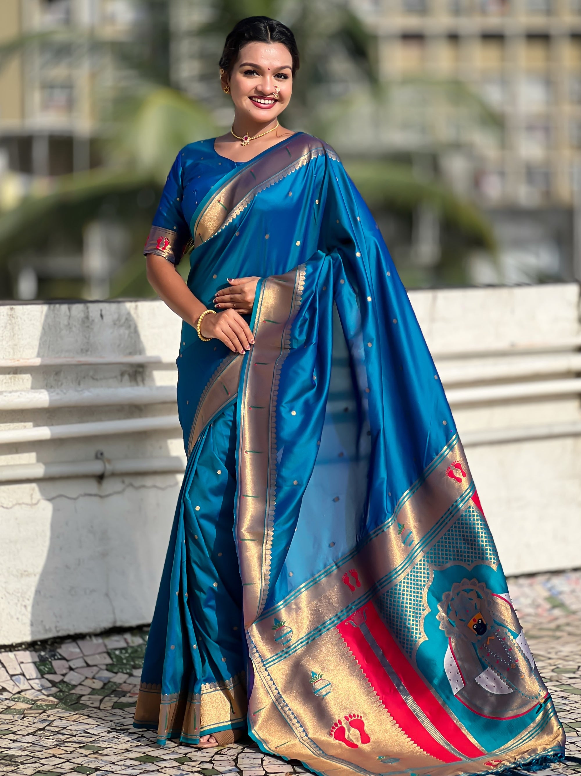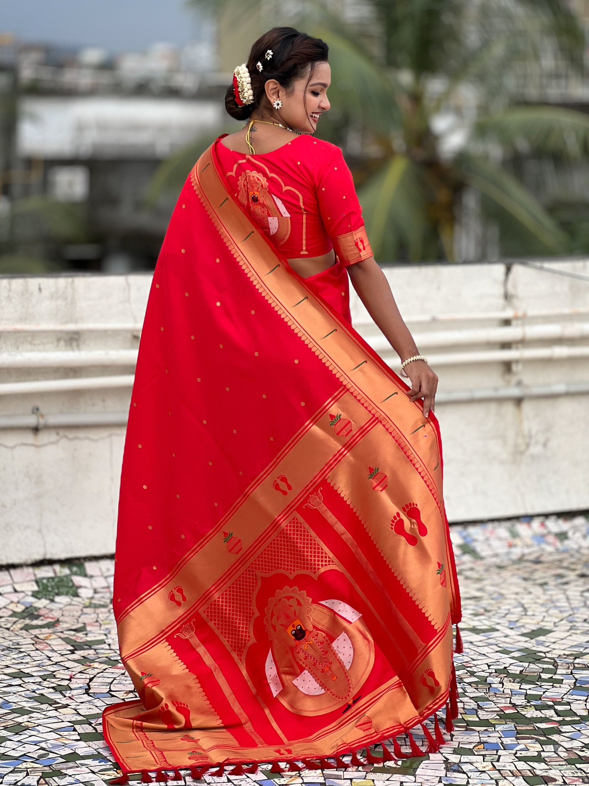 The Paithani saree is a true symbol of grace and heritage, crafted with luxurious silk and vibrant colors. Its intricate zari work, adorned with beautiful peacock and floral motifs, reflects unmatched artistry. A perfect blend of tradition and elegance, it is a treasure that enhances the beauty of every occasion, making every woman feel royal and radiant.