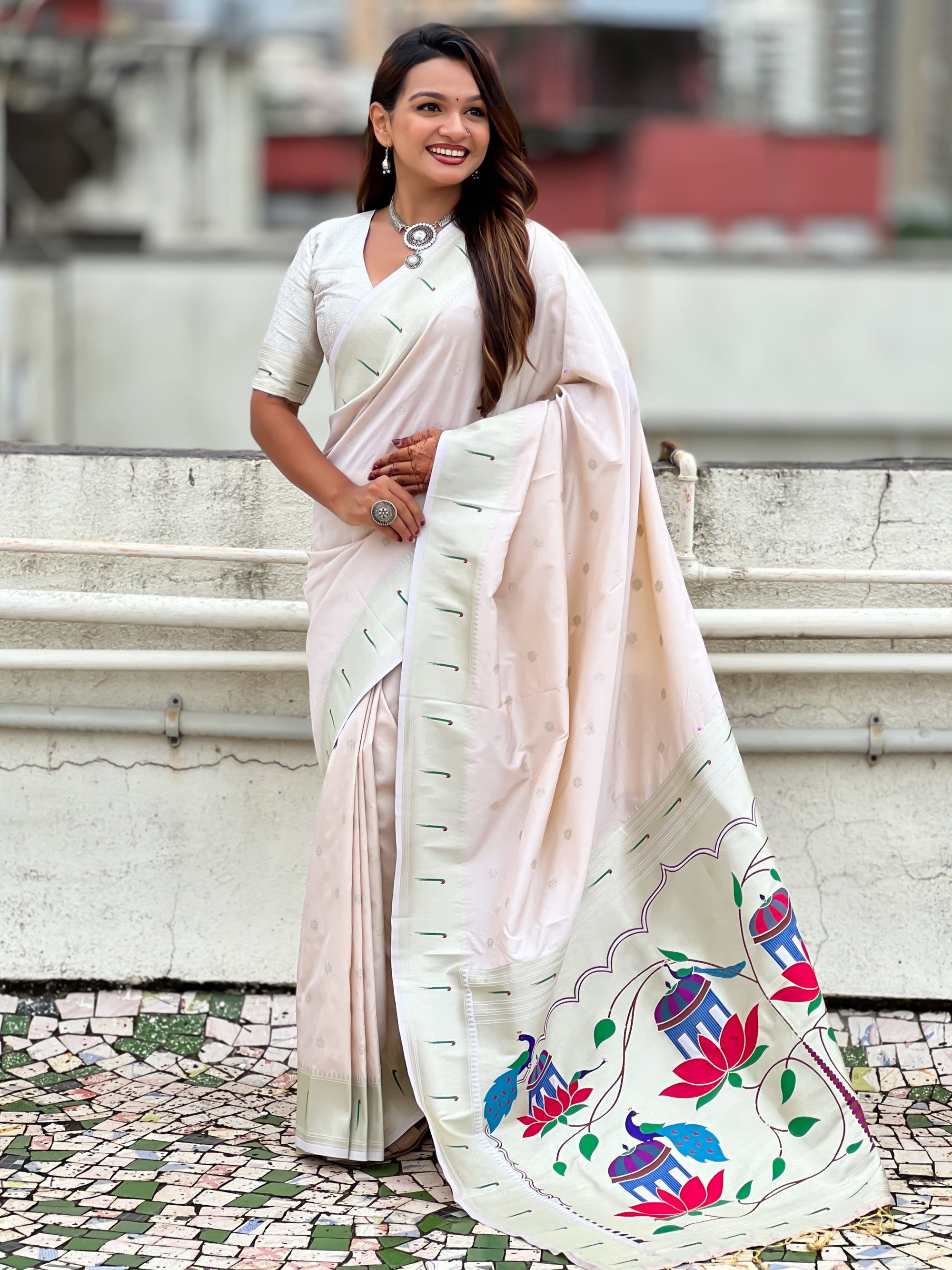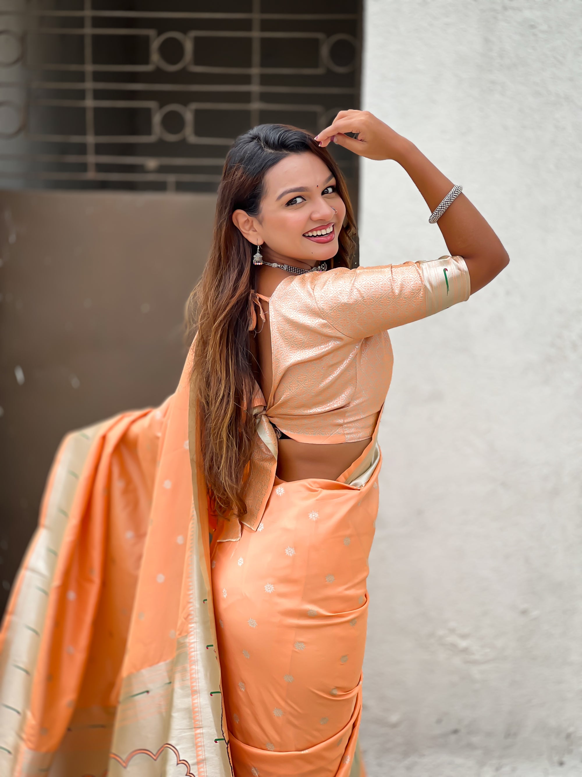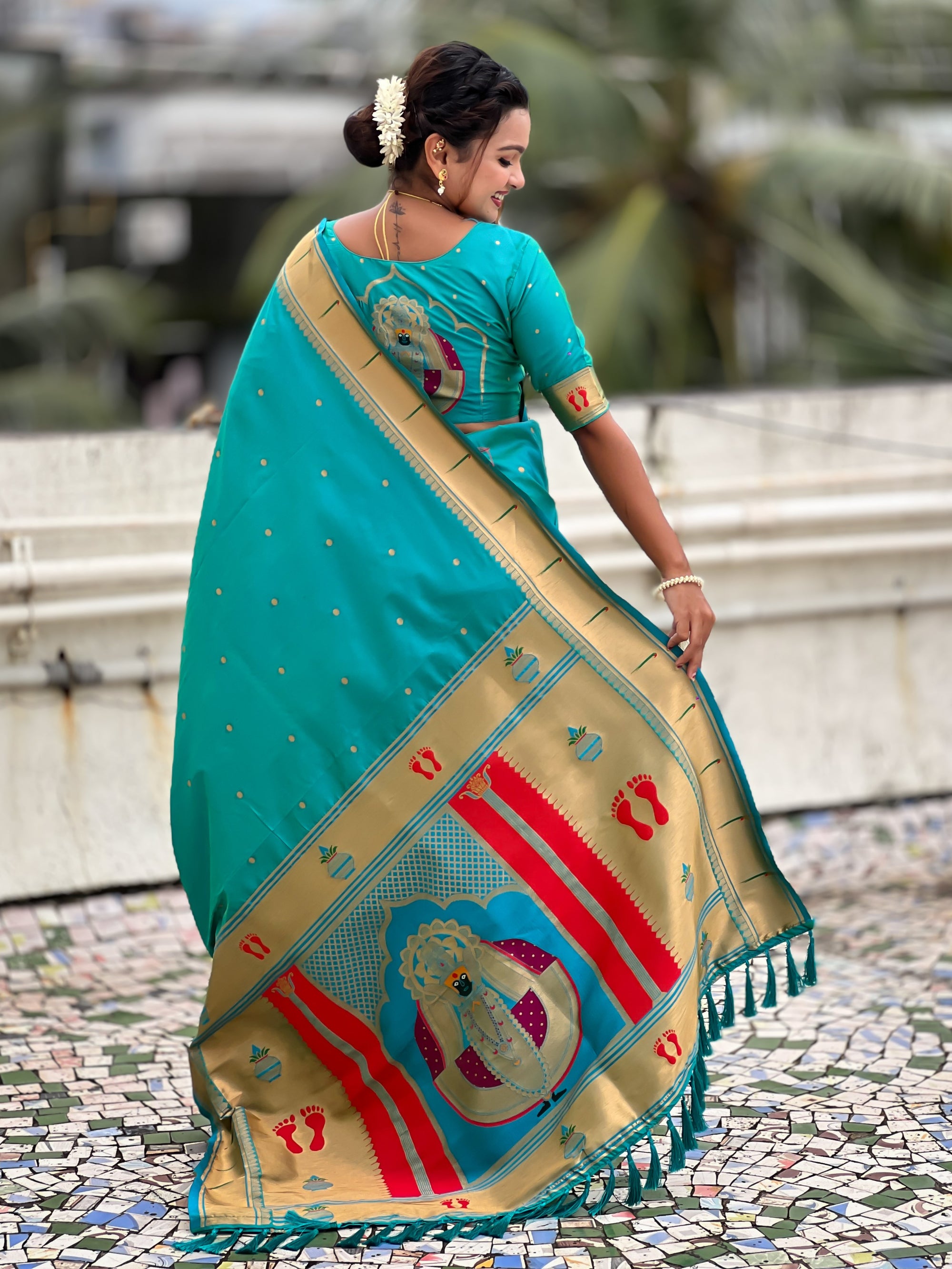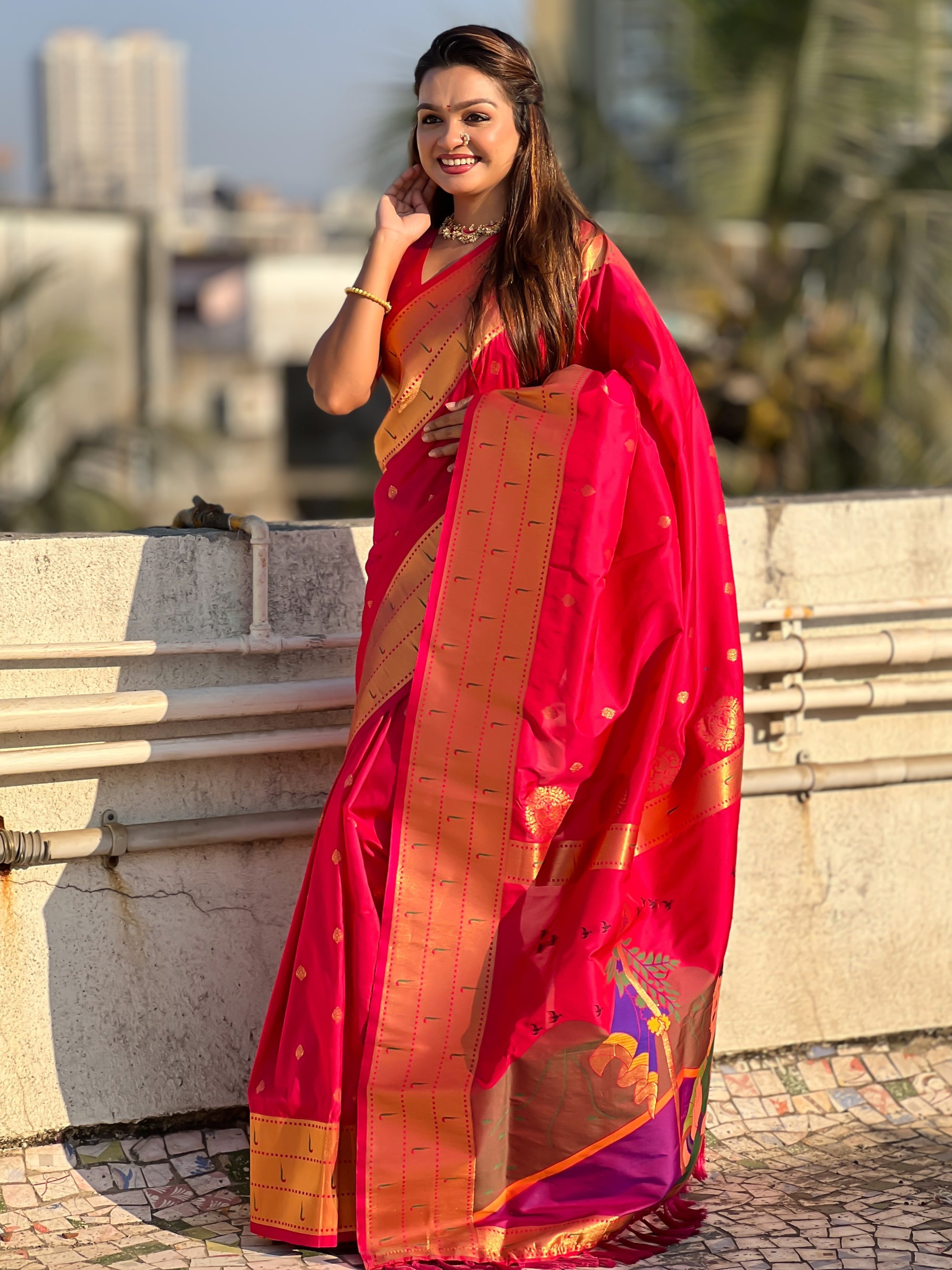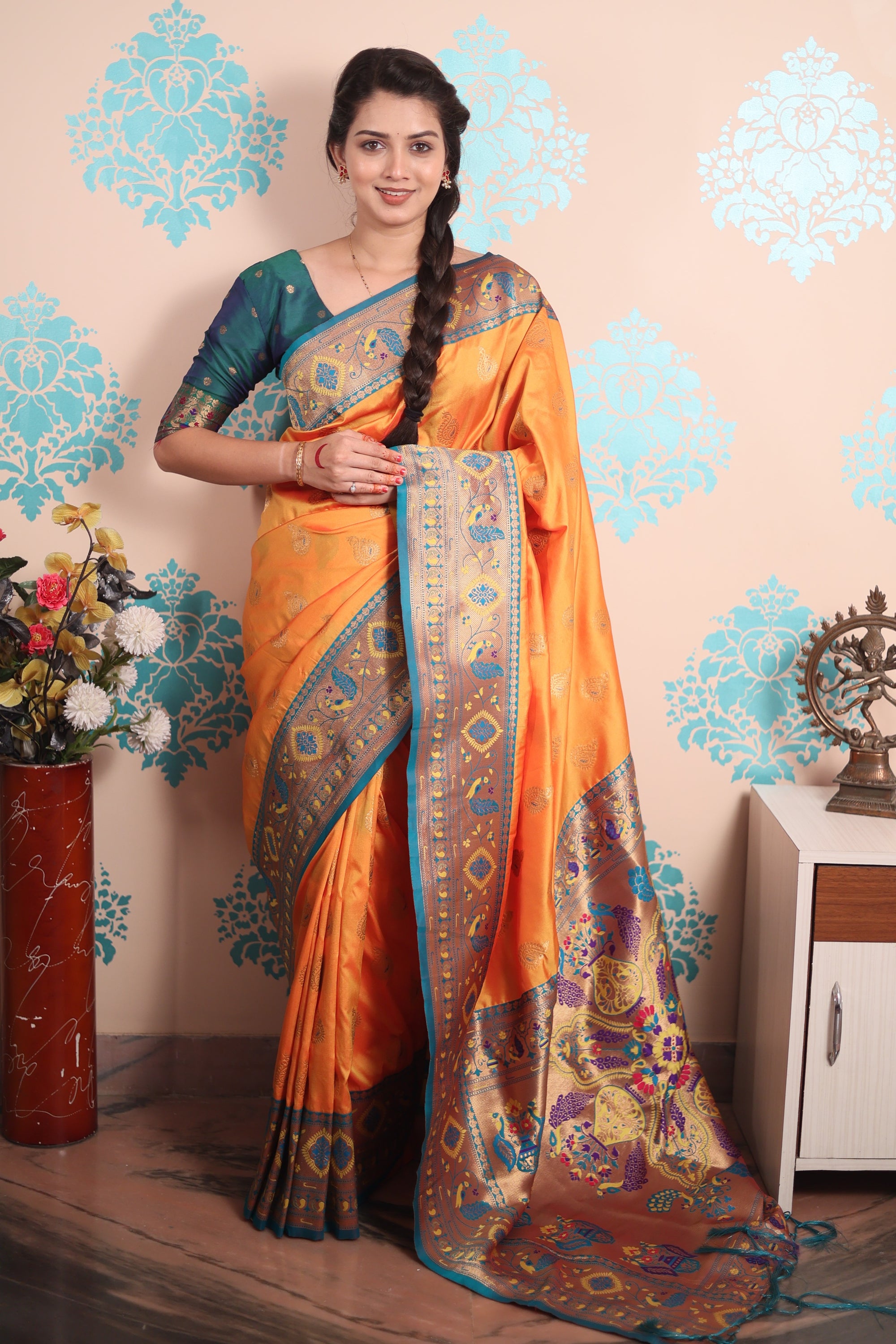 The Paithani saree is a true symbol of grace and heritage, crafted with luxurious silk and vibrant colors. Its intricate zari work, adorned with beautiful peacock and floral motifs, reflects unmatched artistry. A perfect blend of tradition and elegance, it is a treasure that enhances the beauty of every occasion, making every woman feel royal and radiant.