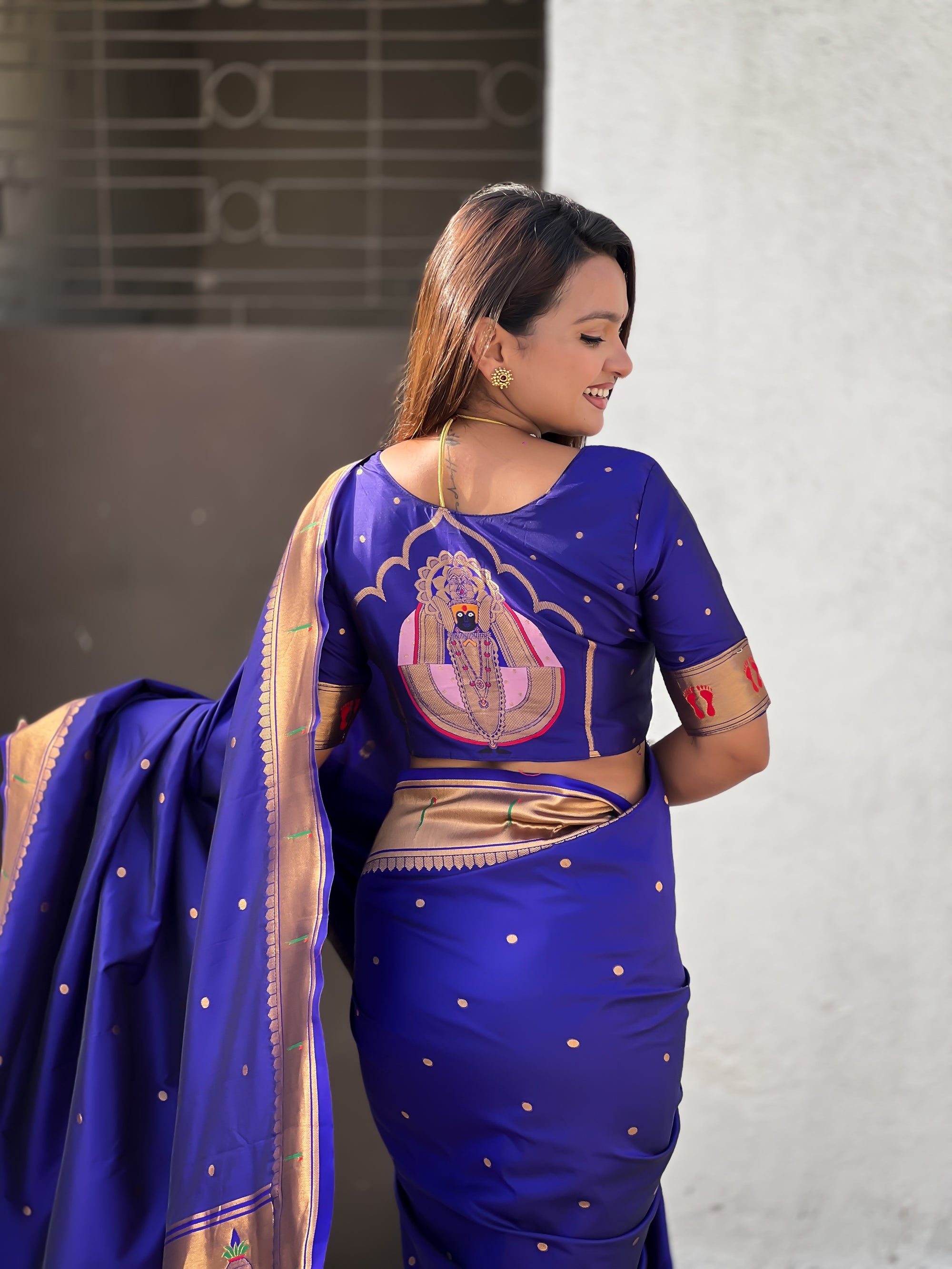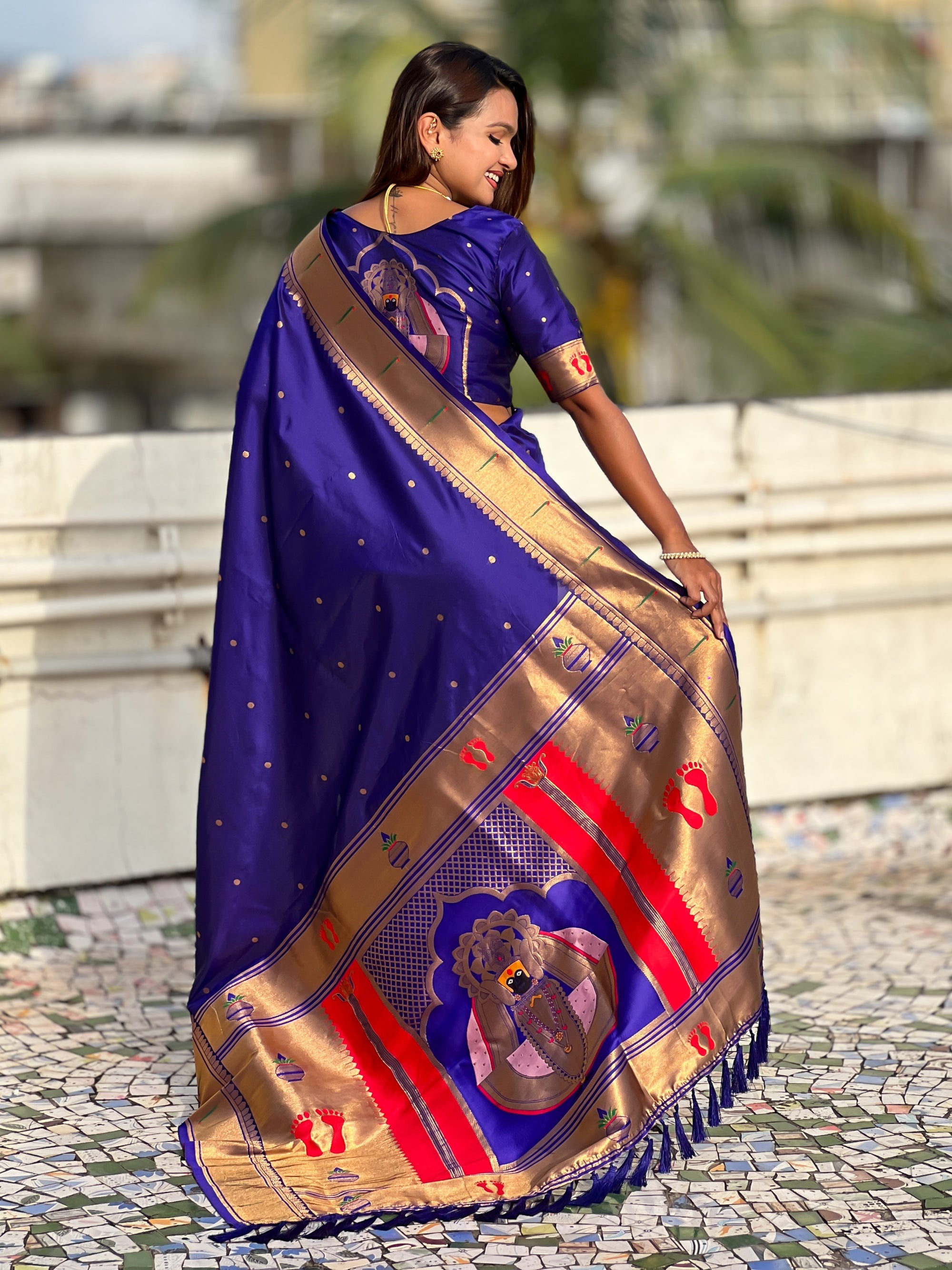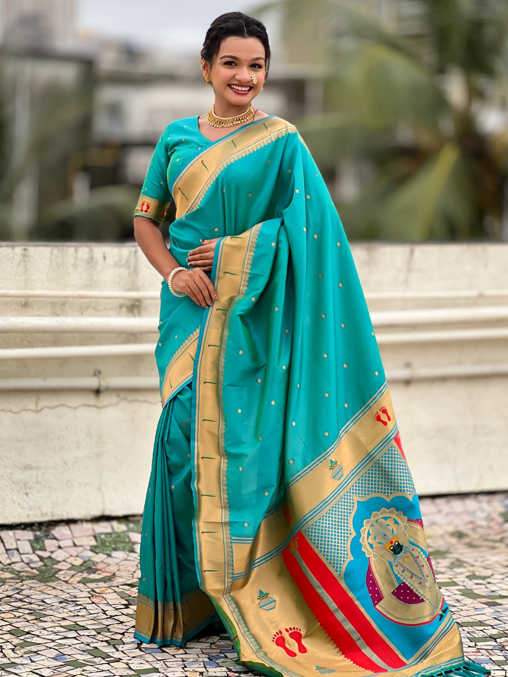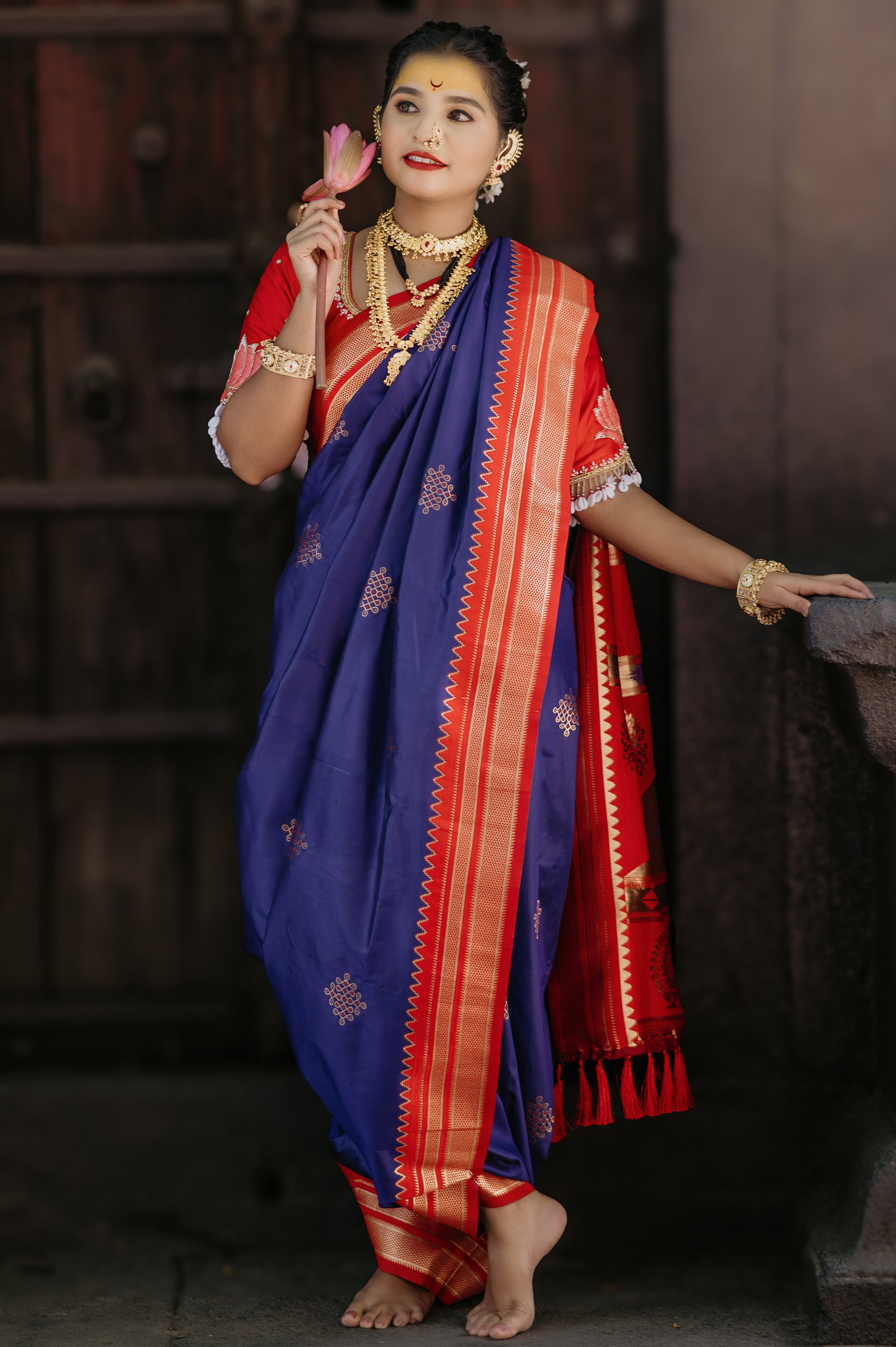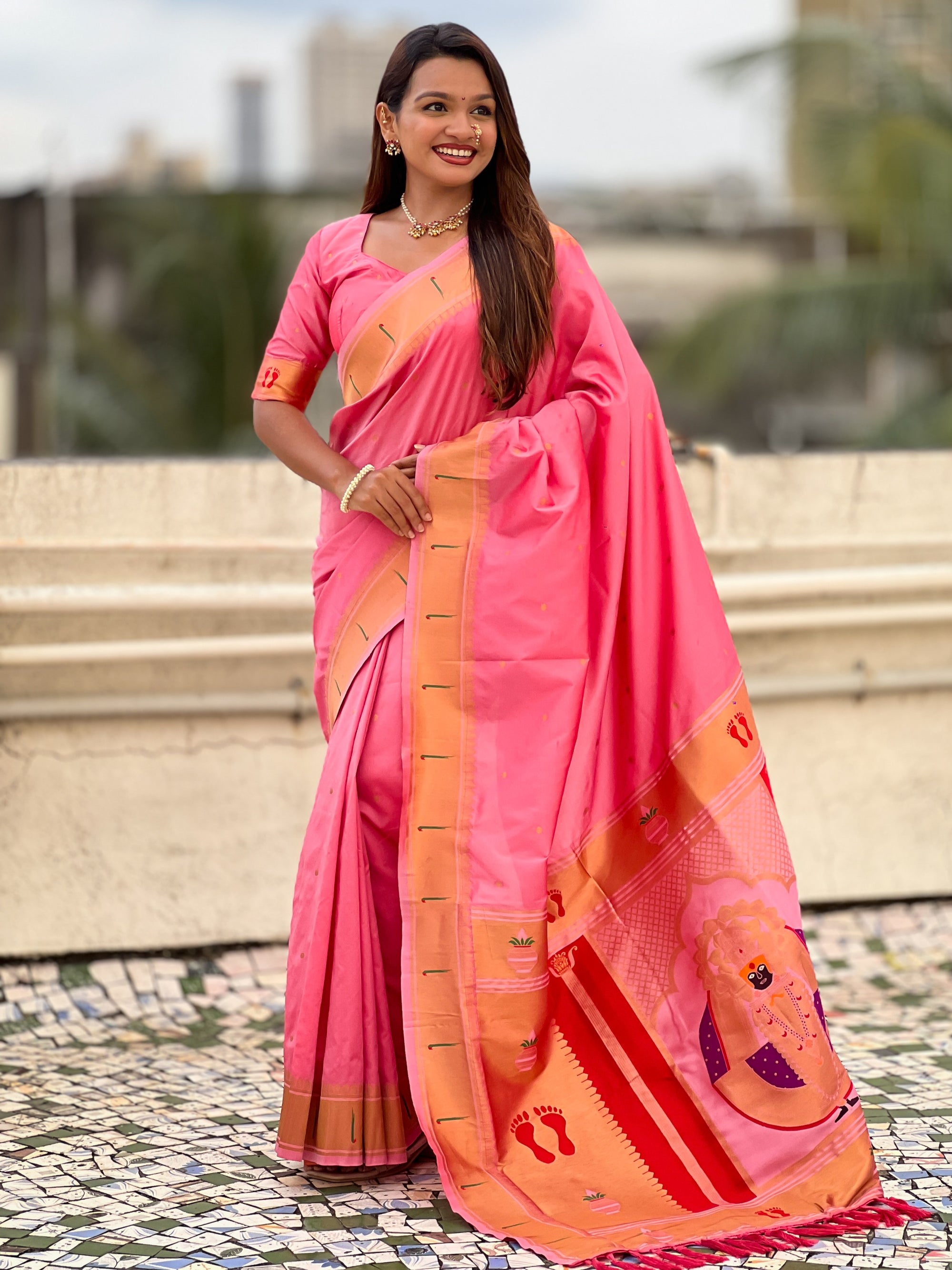 The Paithani saree is a true symbol of grace and heritage, crafted with luxurious silk and vibrant colors. Its intricate zari work, adorned with beautiful peacock and floral motifs, reflects unmatched artistry. A perfect blend of tradition and elegance, it is a treasure that enhances the beauty of every occasion, making every woman feel royal and radiant.