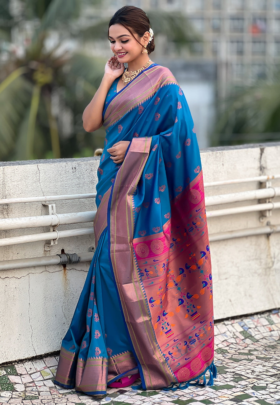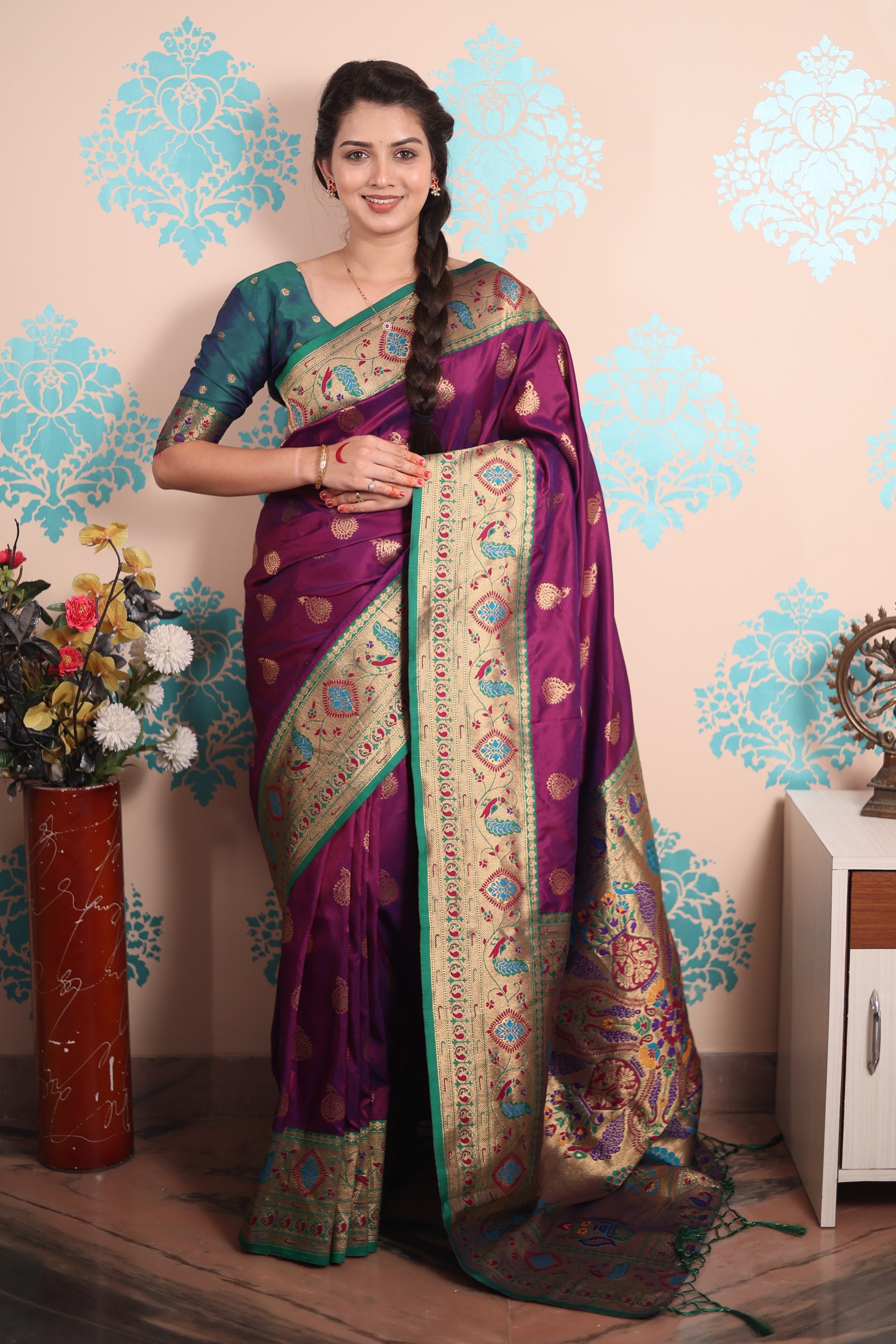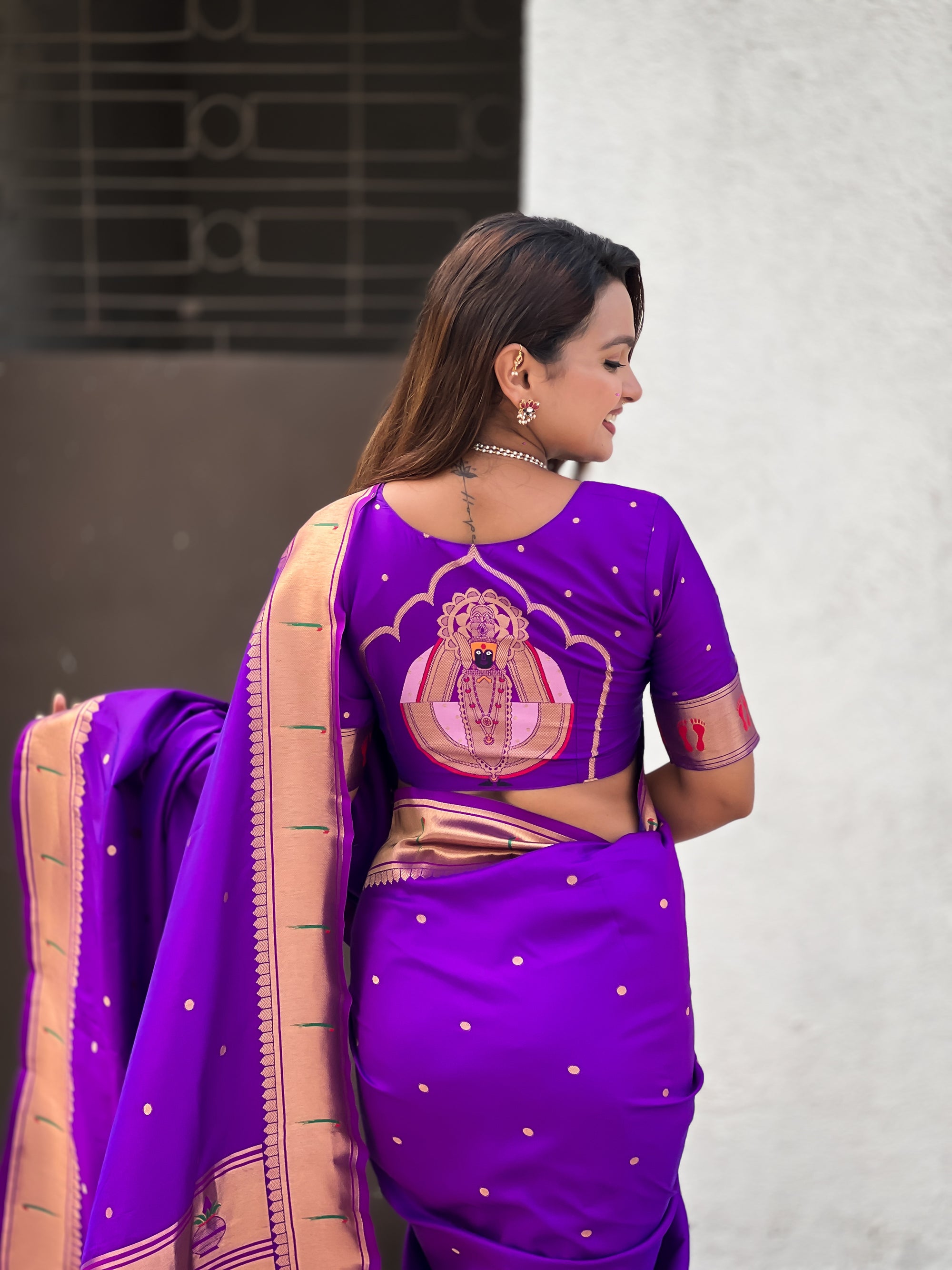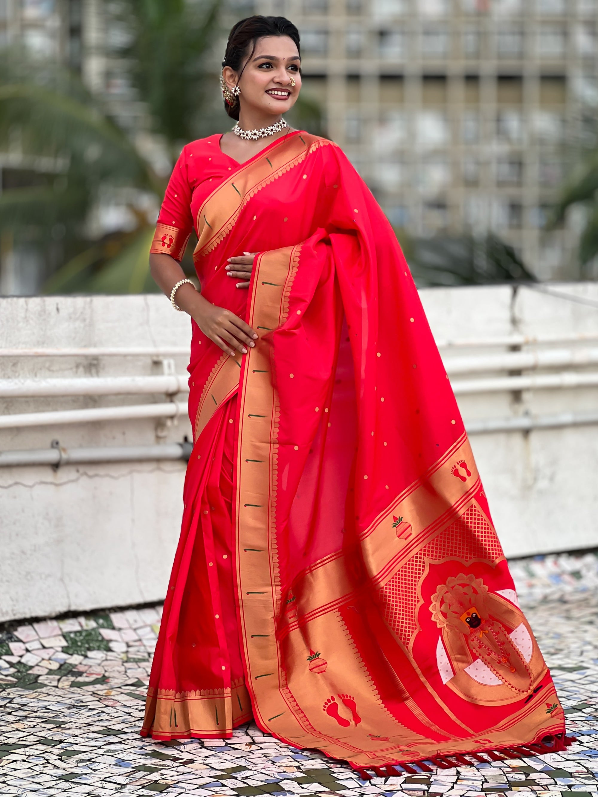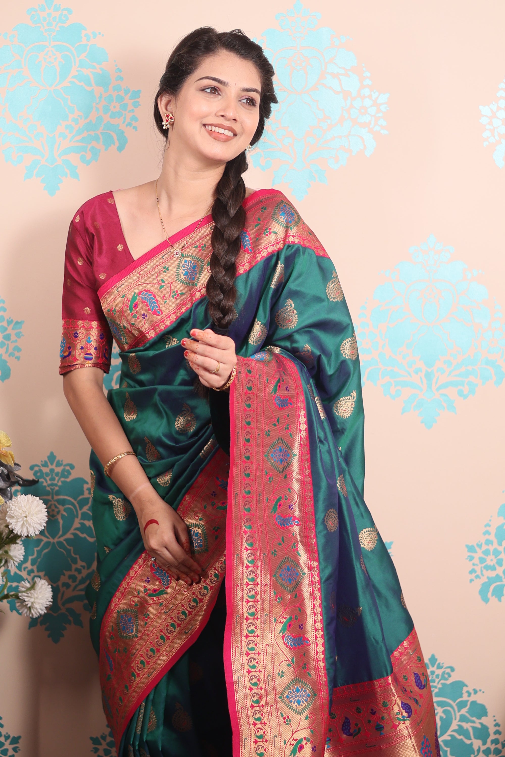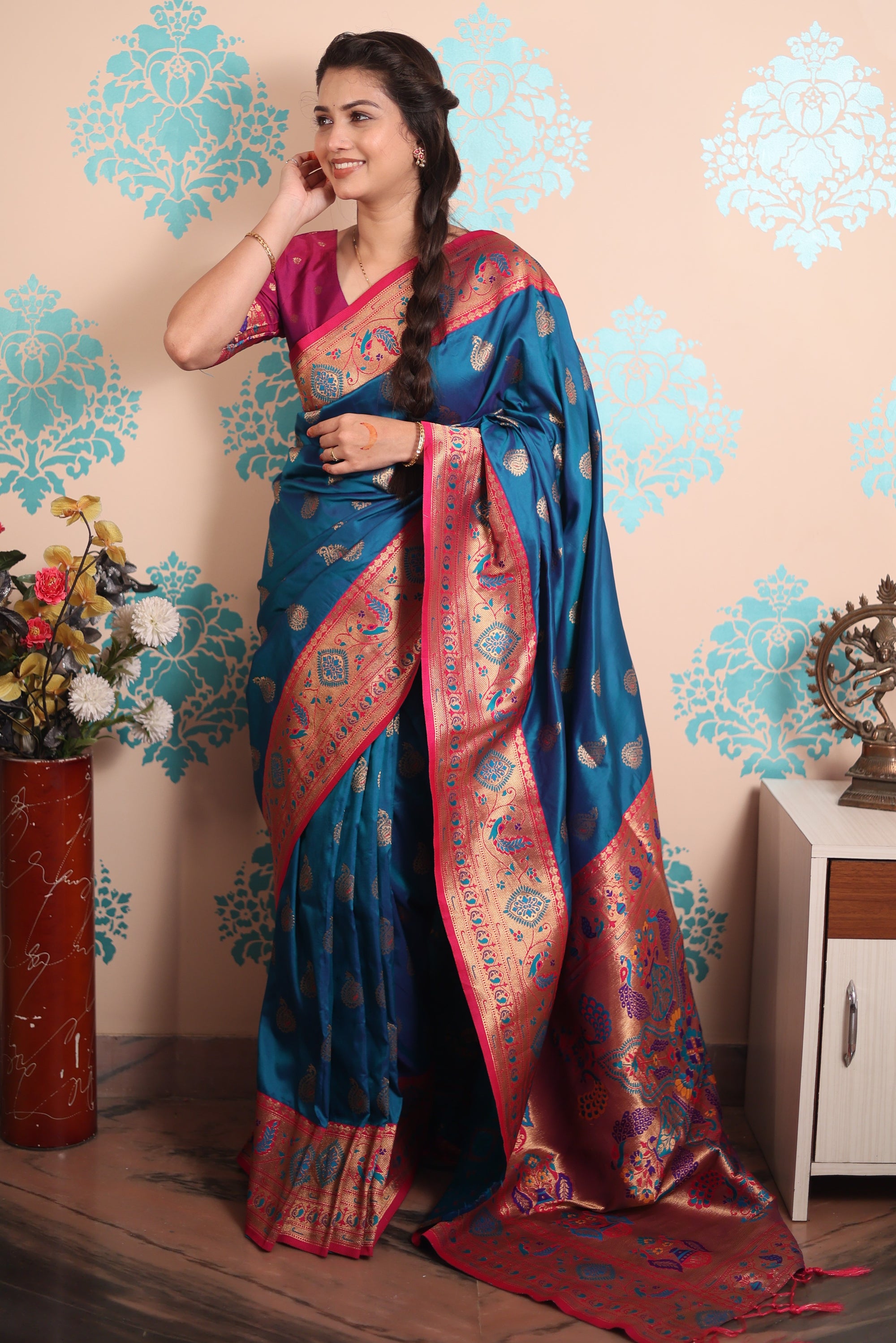 The Paithani saree is a true symbol of grace and heritage, crafted with luxurious silk and vibrant colors. Its intricate zari work, adorned with beautiful peacock and floral motifs, reflects unmatched artistry. A perfect blend of tradition and elegance, it is a treasure that enhances the beauty of every occasion, making every woman feel royal and radiant.