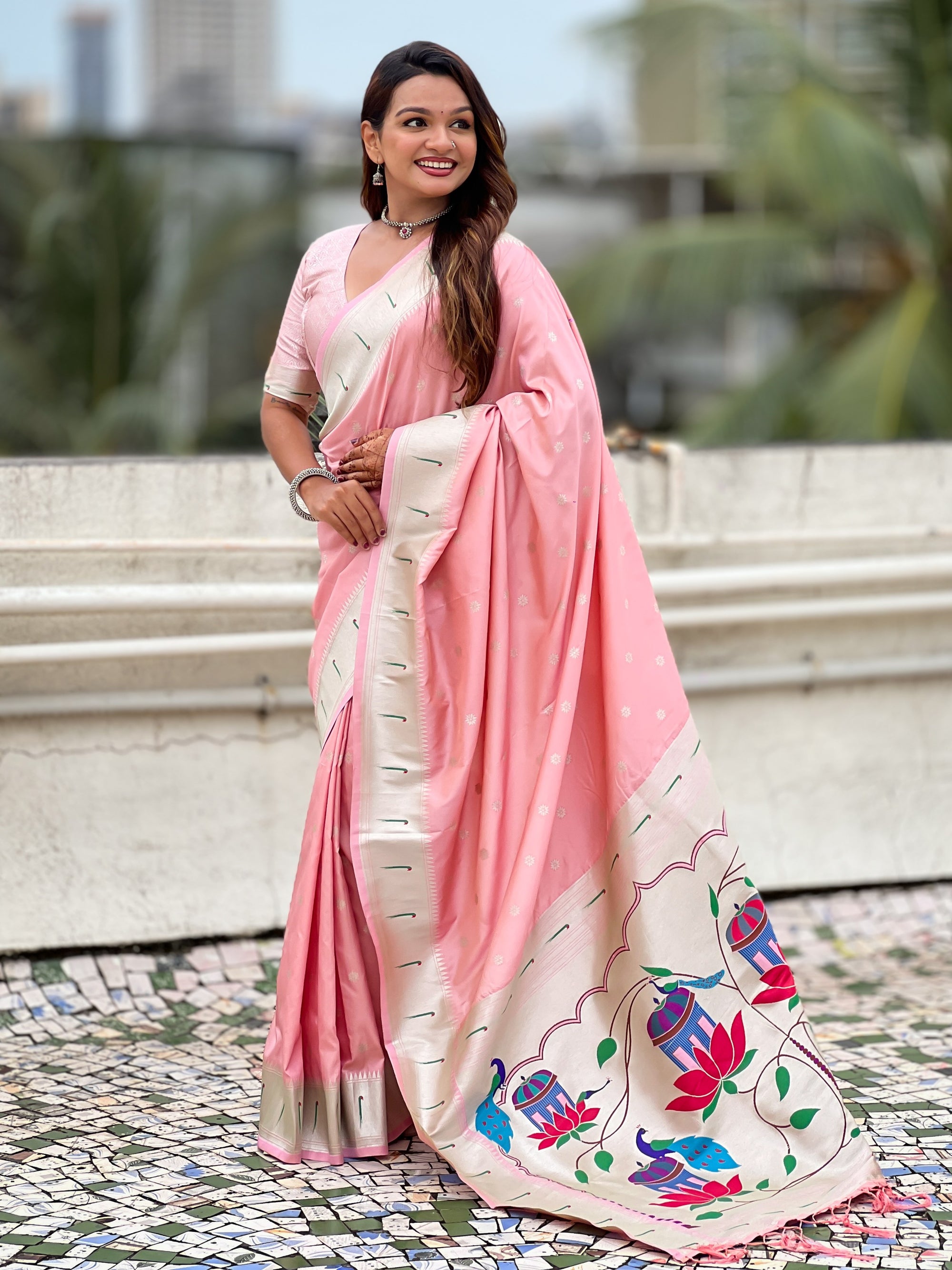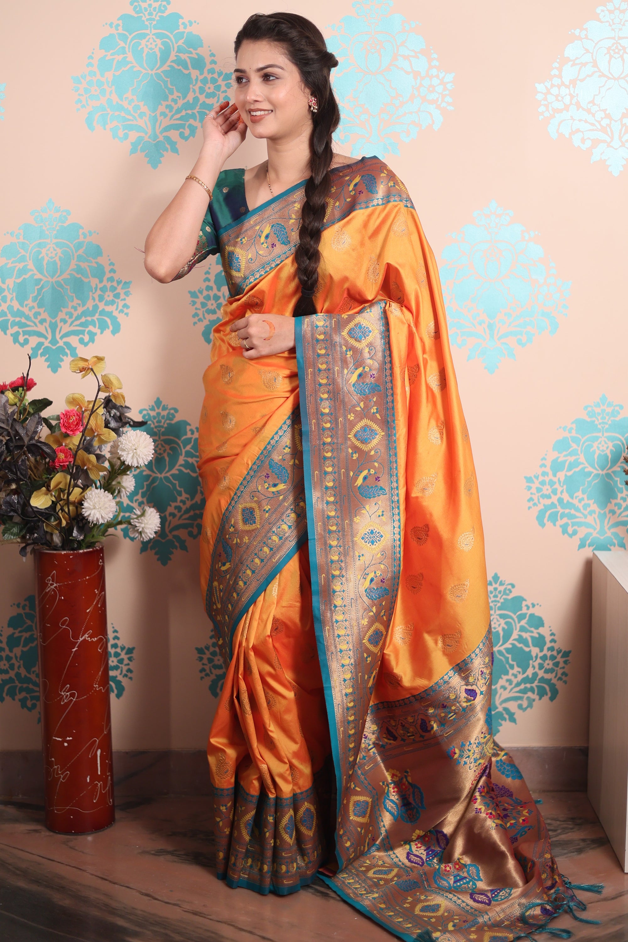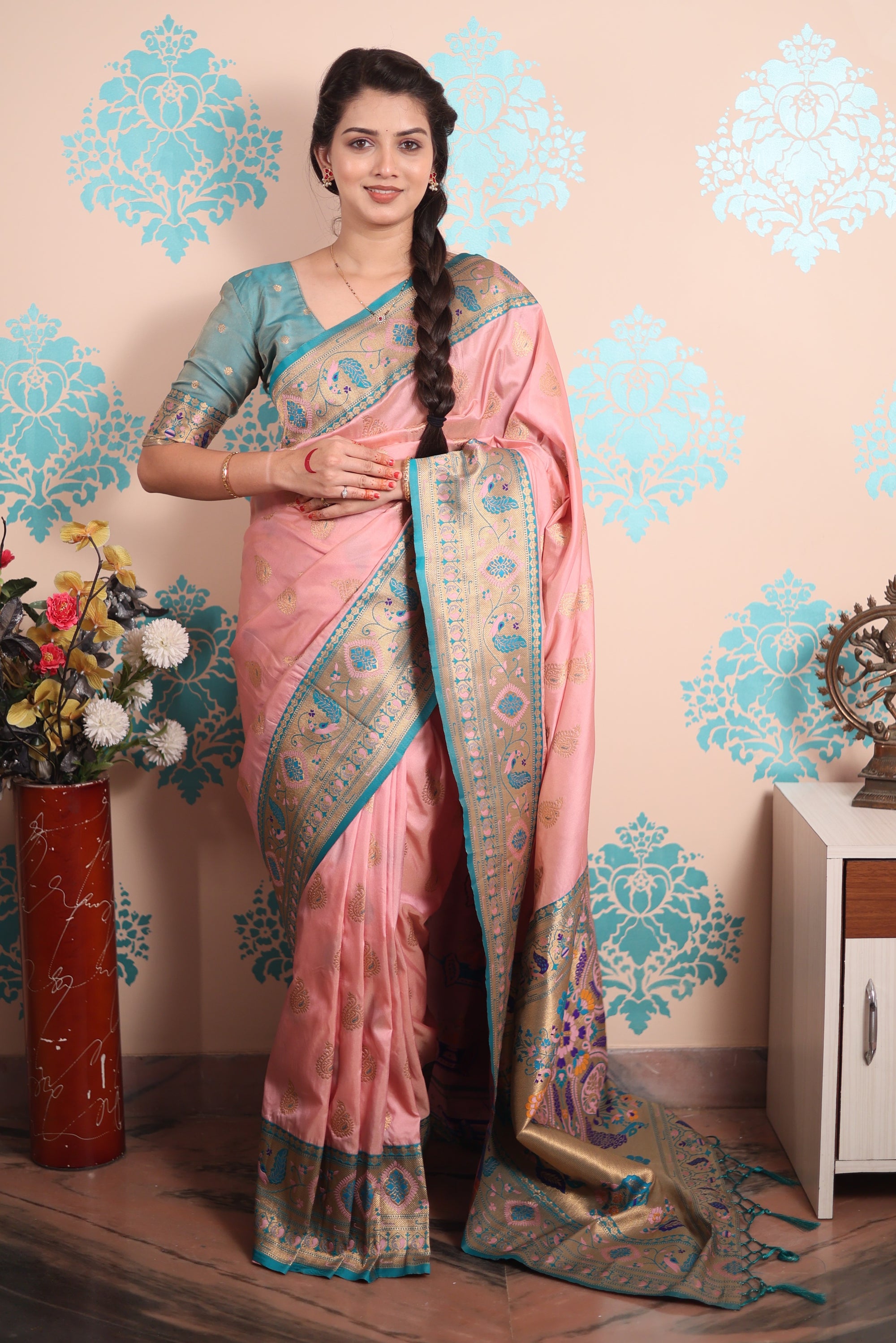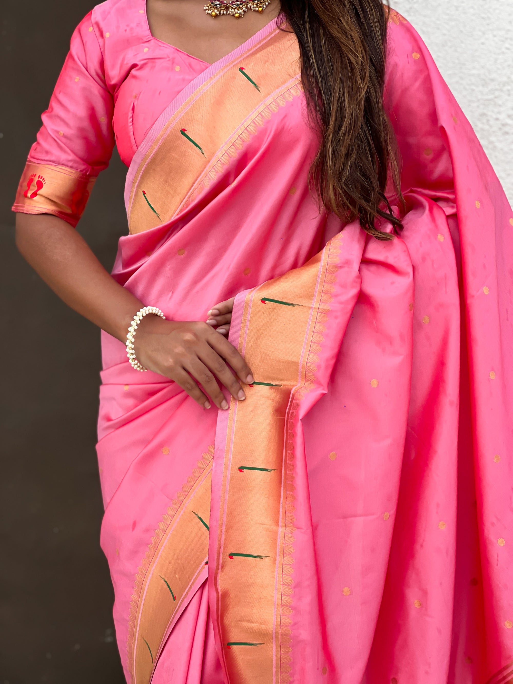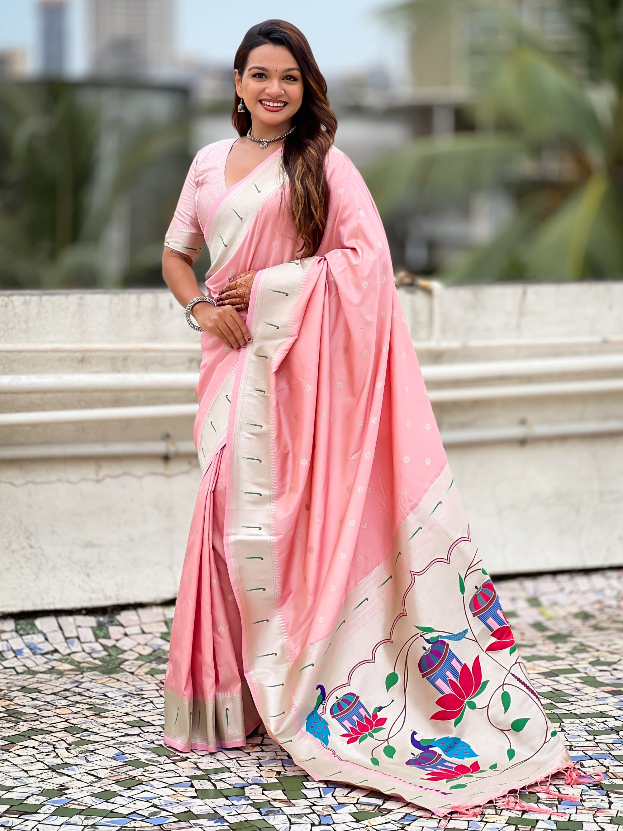 The Paithani saree is a true symbol of grace and heritage, crafted with luxurious silk and vibrant colors. Its intricate zari work, adorned with beautiful peacock and floral motifs, reflects unmatched artistry. A perfect blend of tradition and elegance, it is a treasure that enhances the beauty of every occasion, making every woman feel royal and radiant.