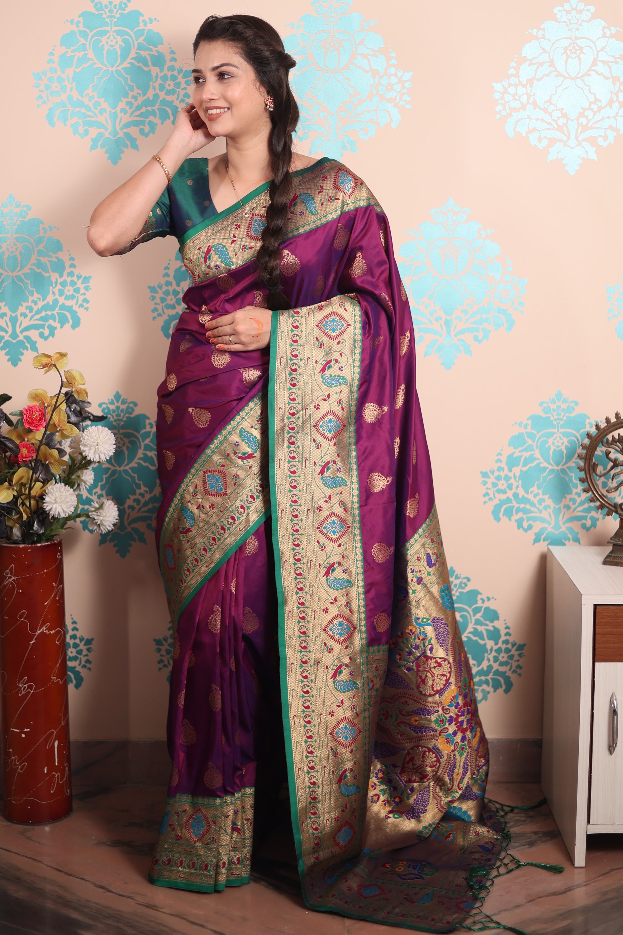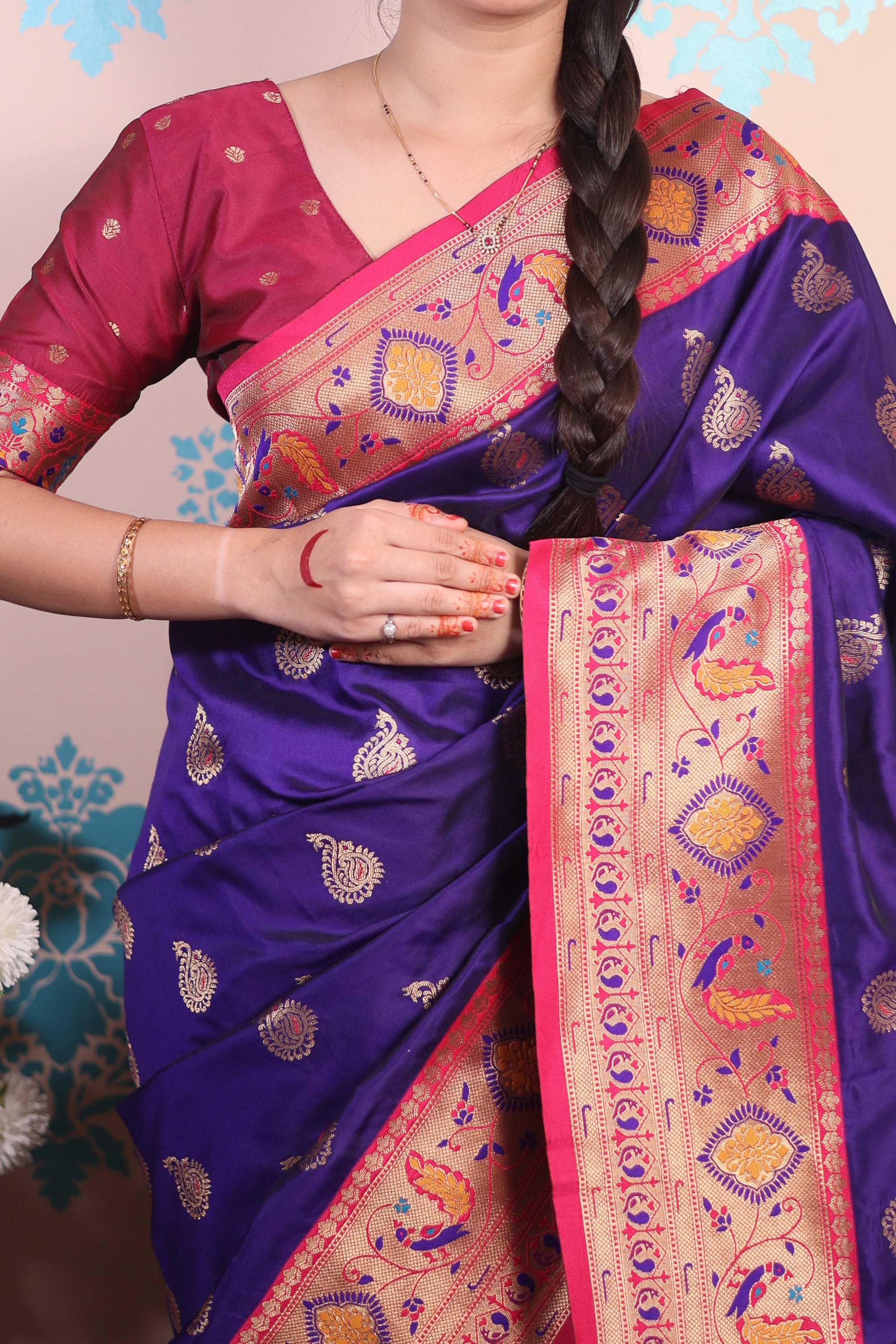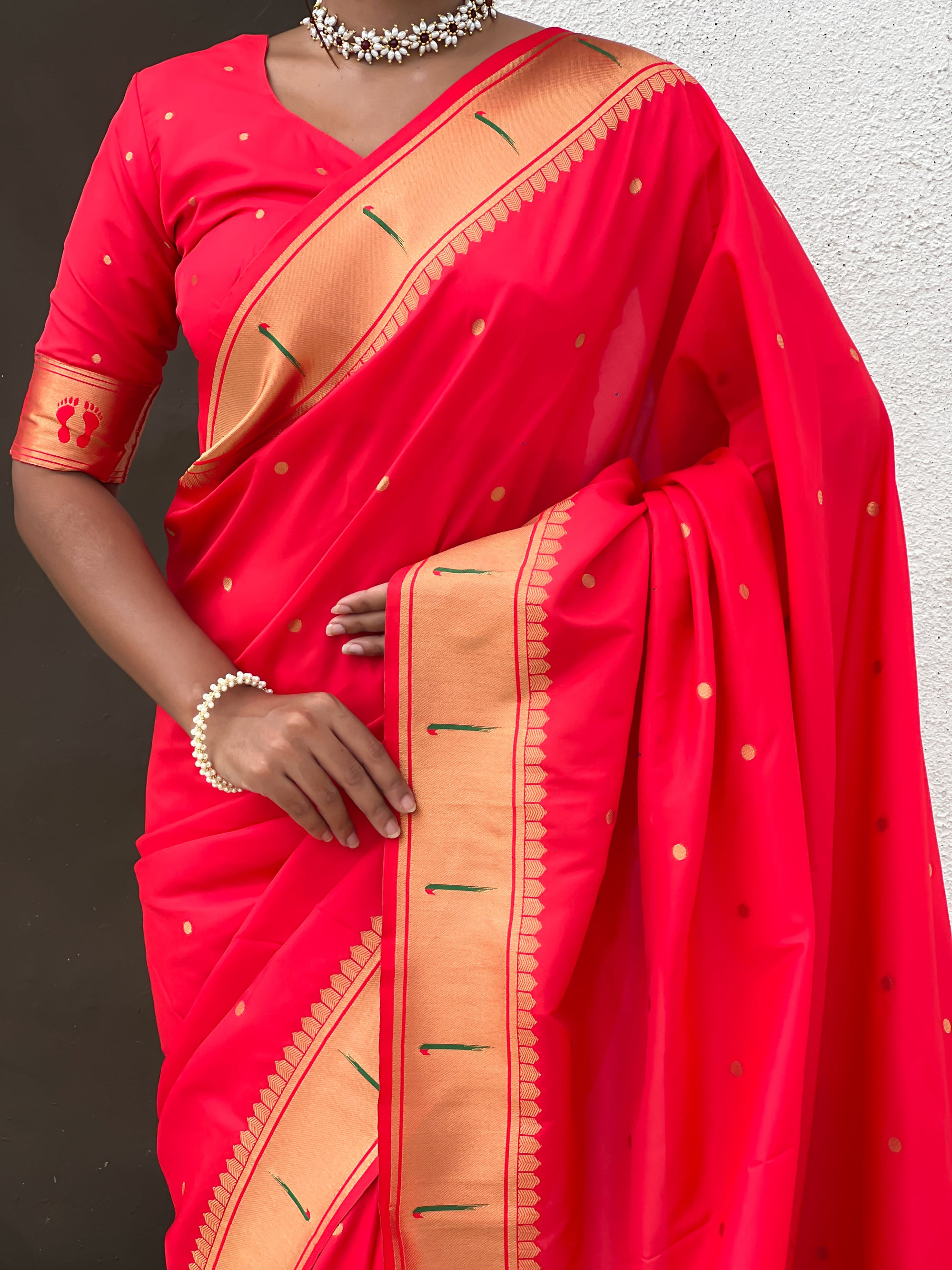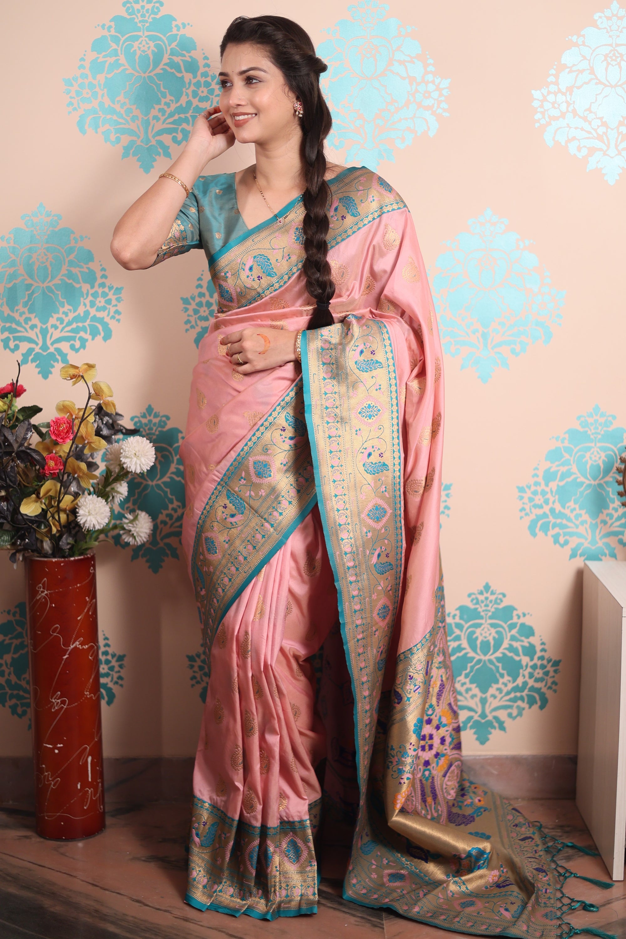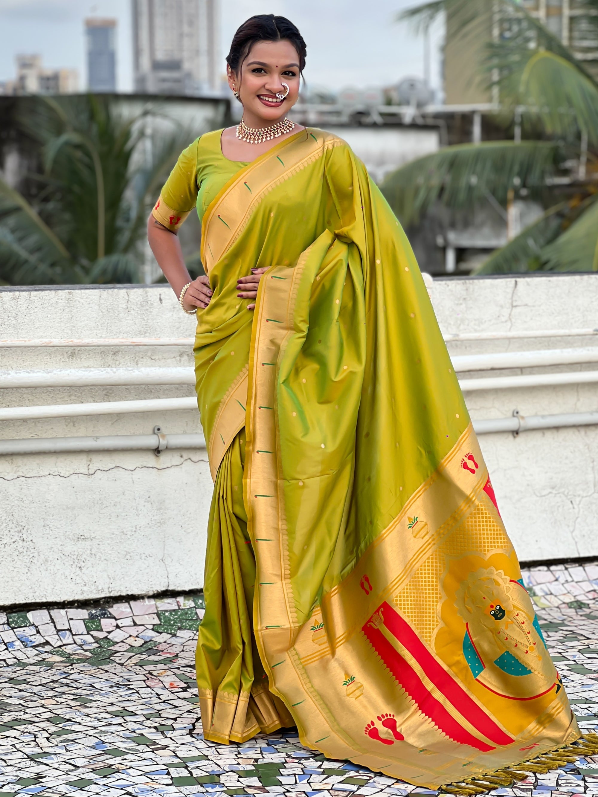 The Paithani saree is a true symbol of grace and heritage, crafted with luxurious silk and vibrant colors. Its intricate zari work, adorned with beautiful peacock and floral motifs, reflects unmatched artistry. A perfect blend of tradition and elegance, it is a treasure that enhances the beauty of every occasion, making every woman feel royal and radiant.