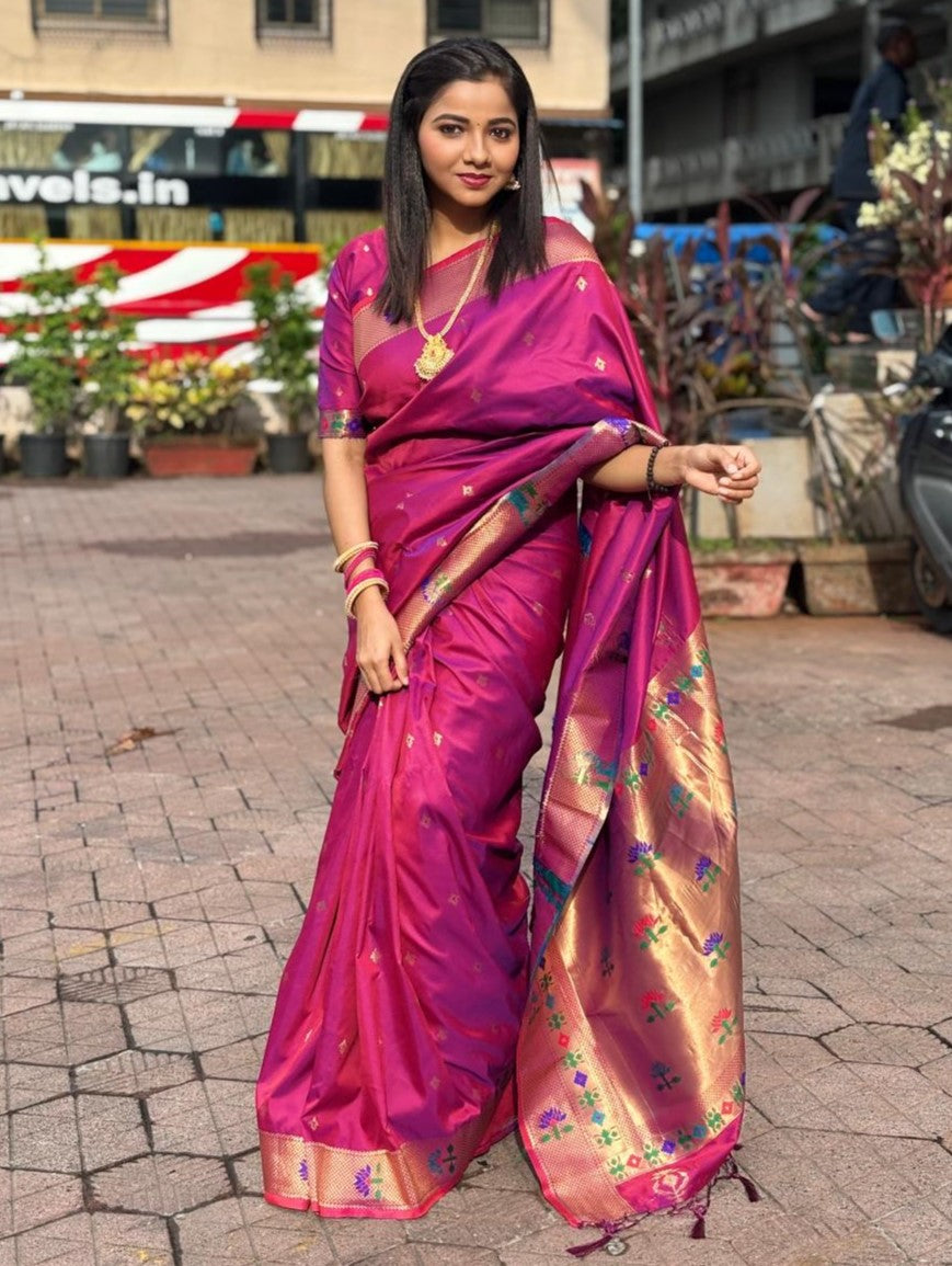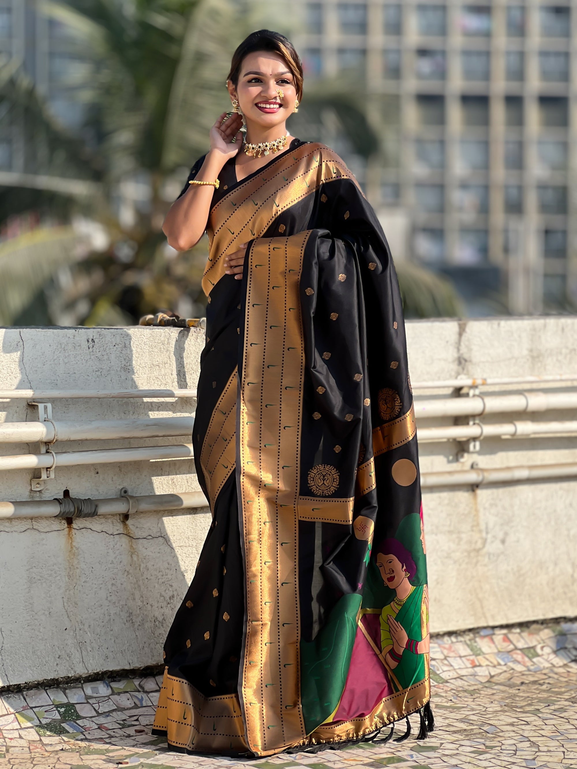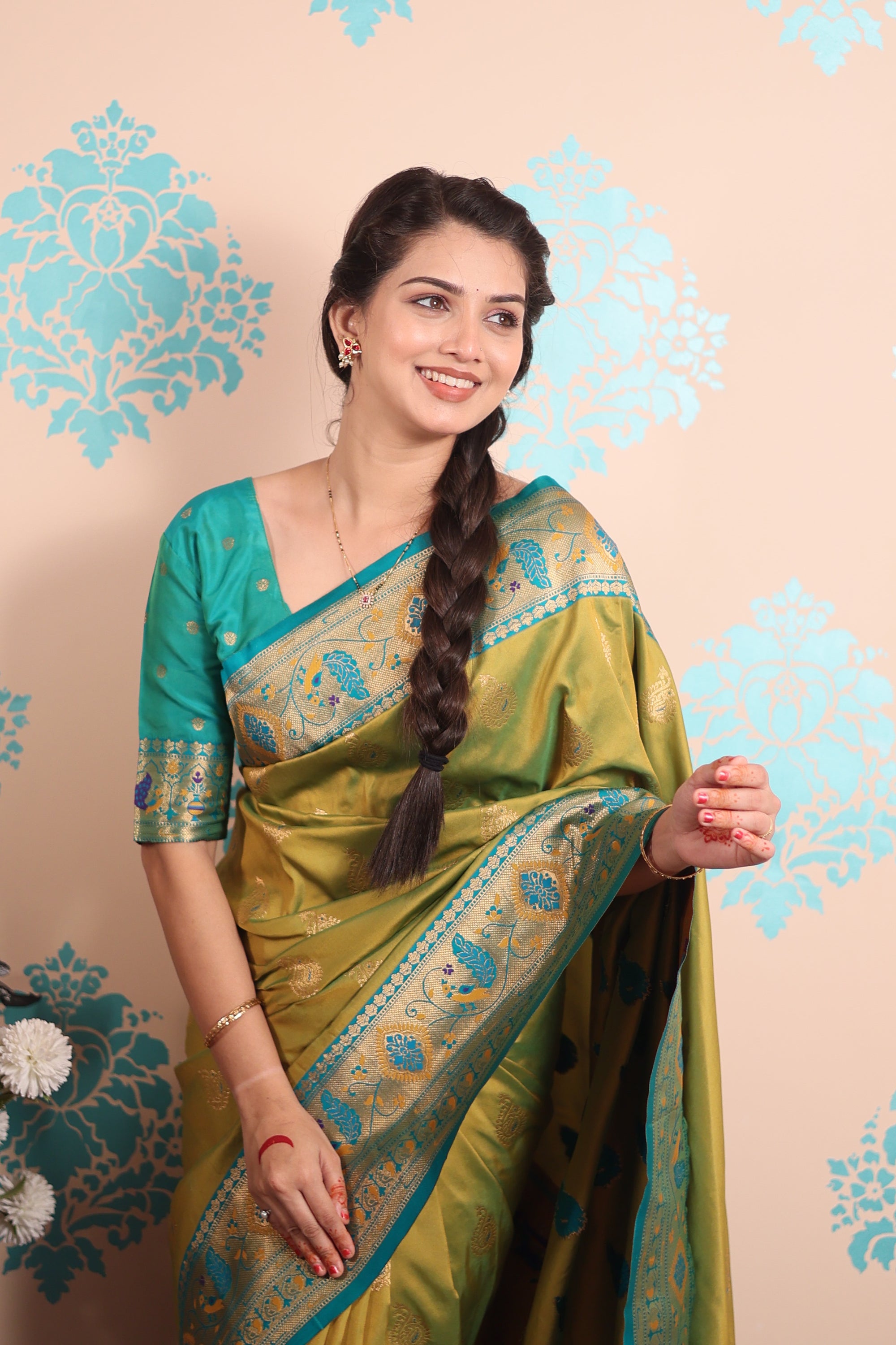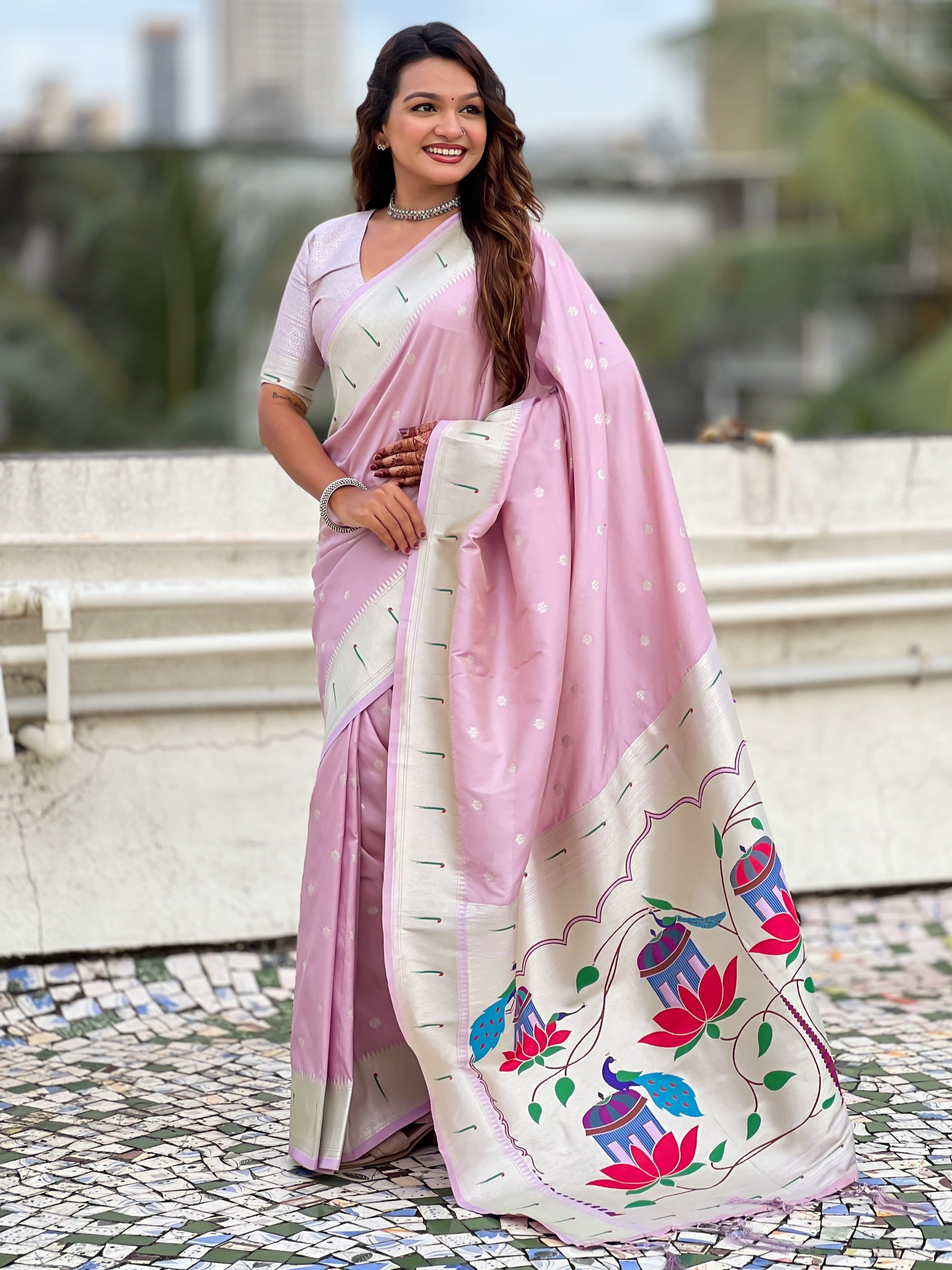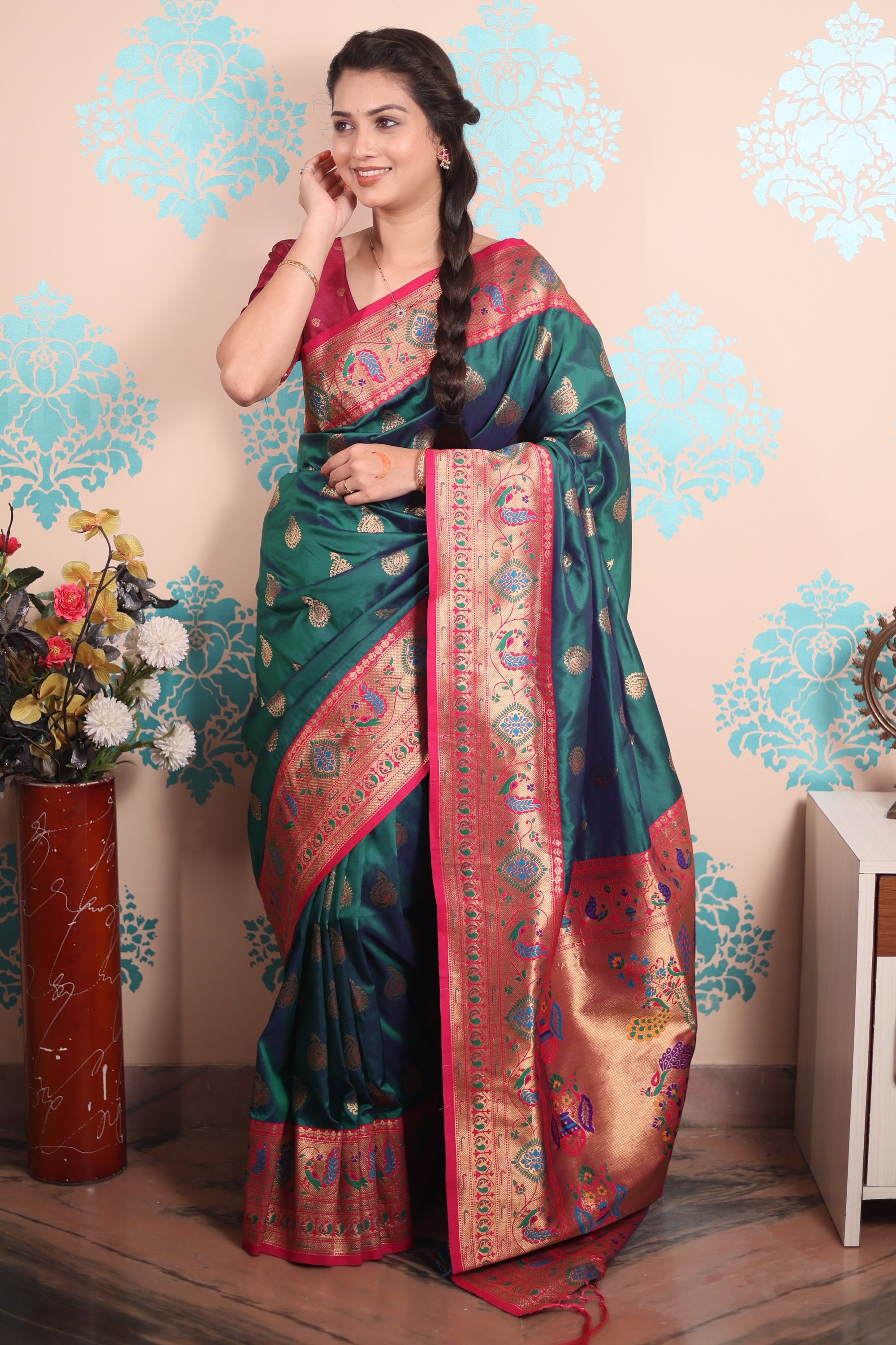 The Paithani saree is a true symbol of grace and heritage, crafted with luxurious silk and vibrant colors. Its intricate zari work, adorned with beautiful peacock and floral motifs, reflects unmatched artistry. A perfect blend of tradition and elegance, it is a treasure that enhances the beauty of every occasion, making every woman feel royal and radiant.