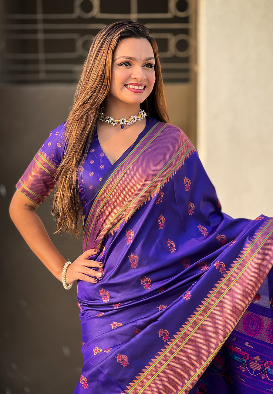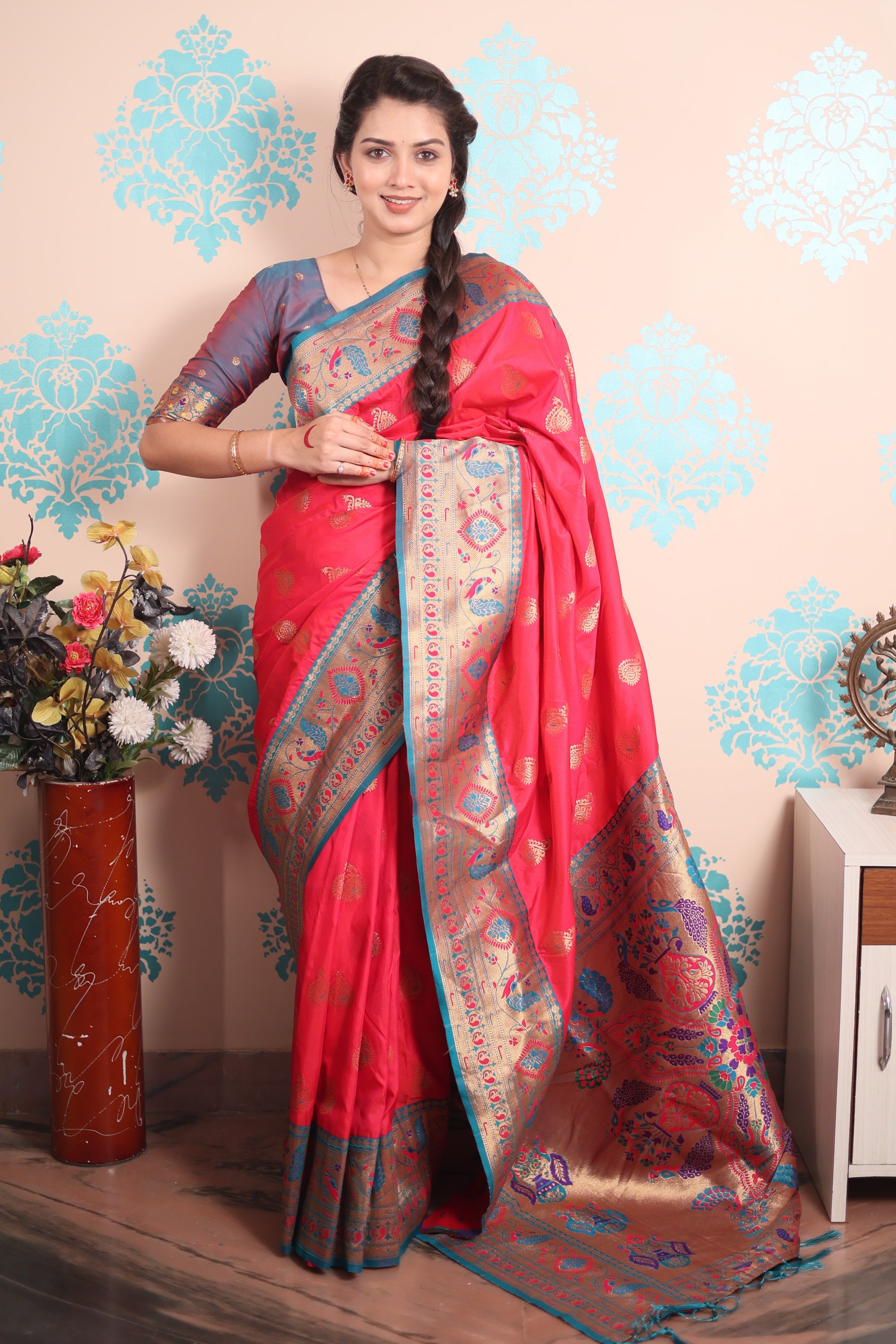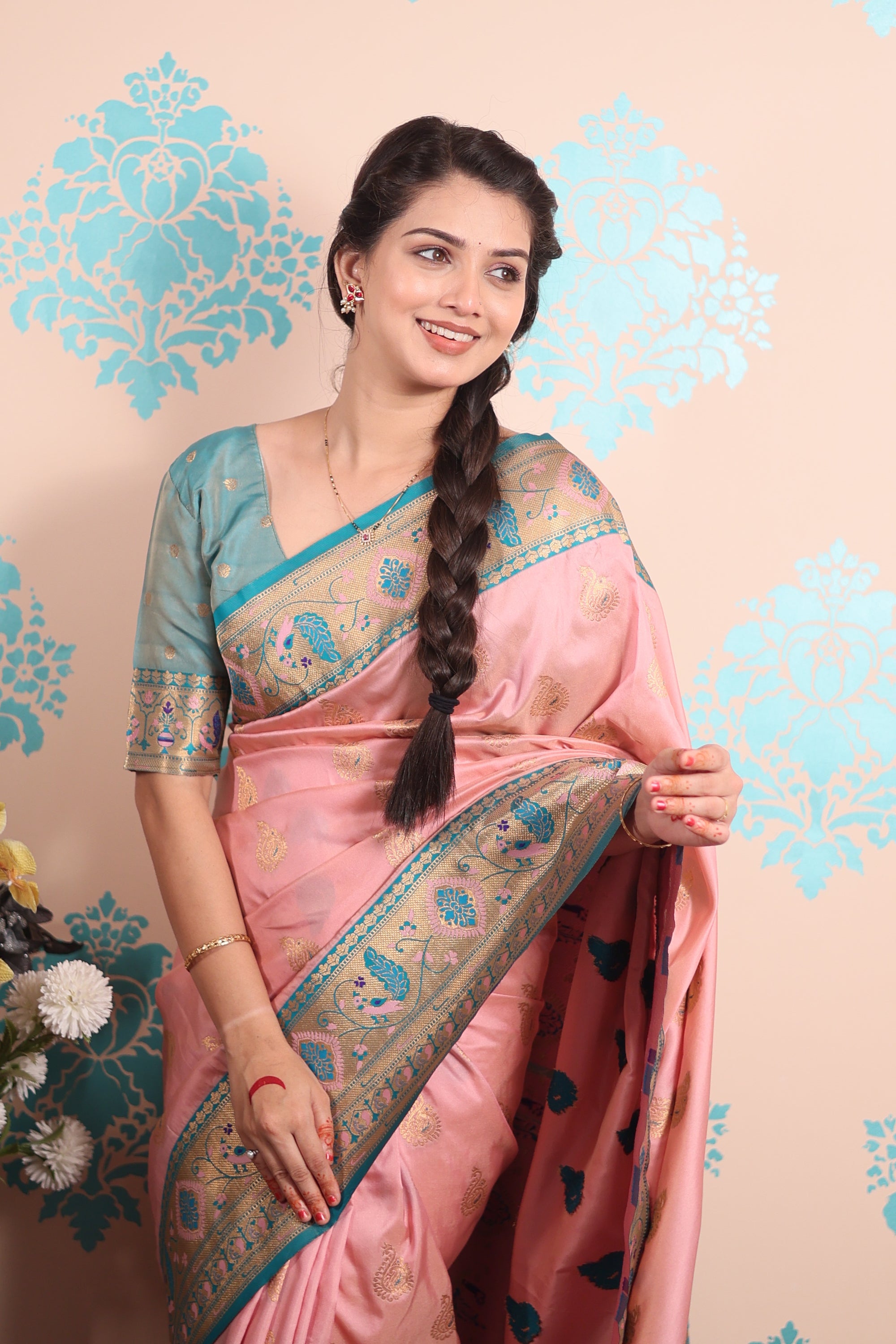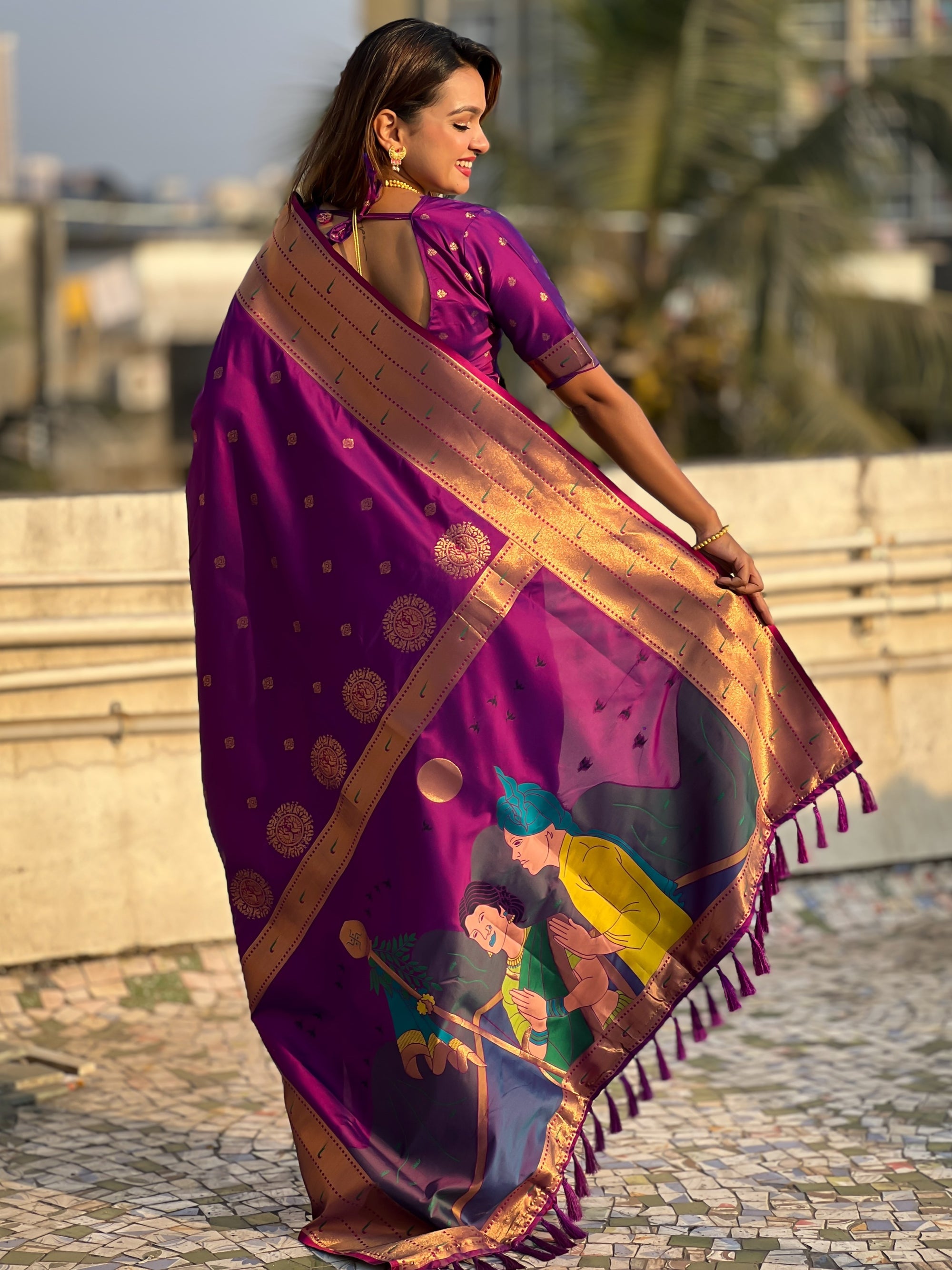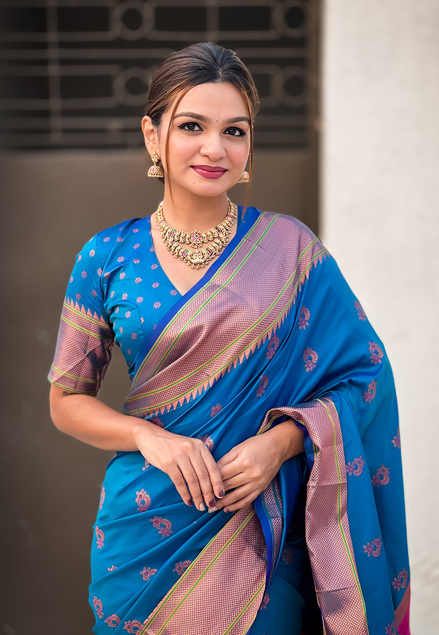 The Paithani saree is a true symbol of grace and heritage, crafted with luxurious silk and vibrant colors. Its intricate zari work, adorned with beautiful peacock and floral motifs, reflects unmatched artistry. A perfect blend of tradition and elegance, it is a treasure that enhances the beauty of every occasion, making every woman feel royal and radiant.