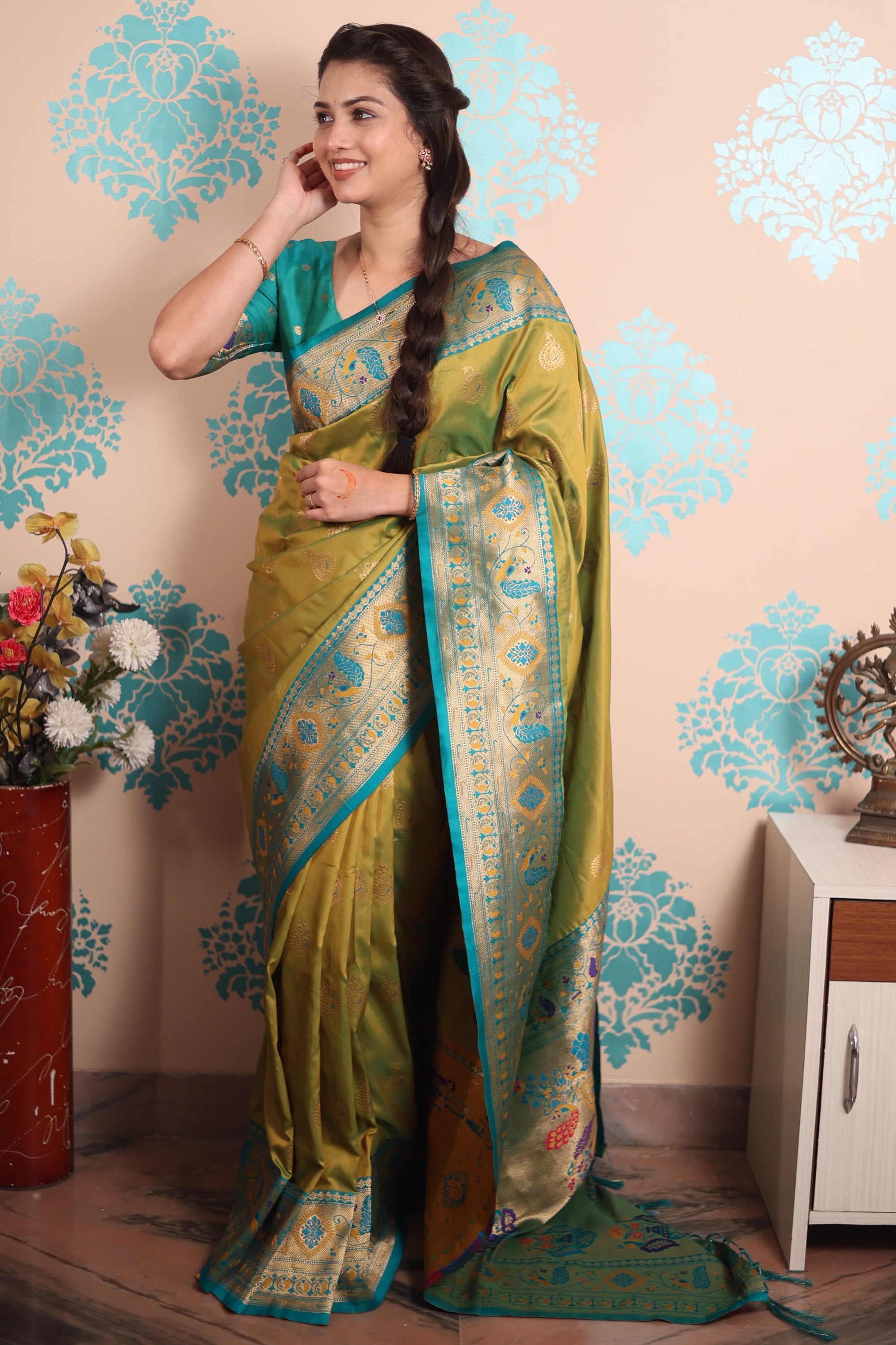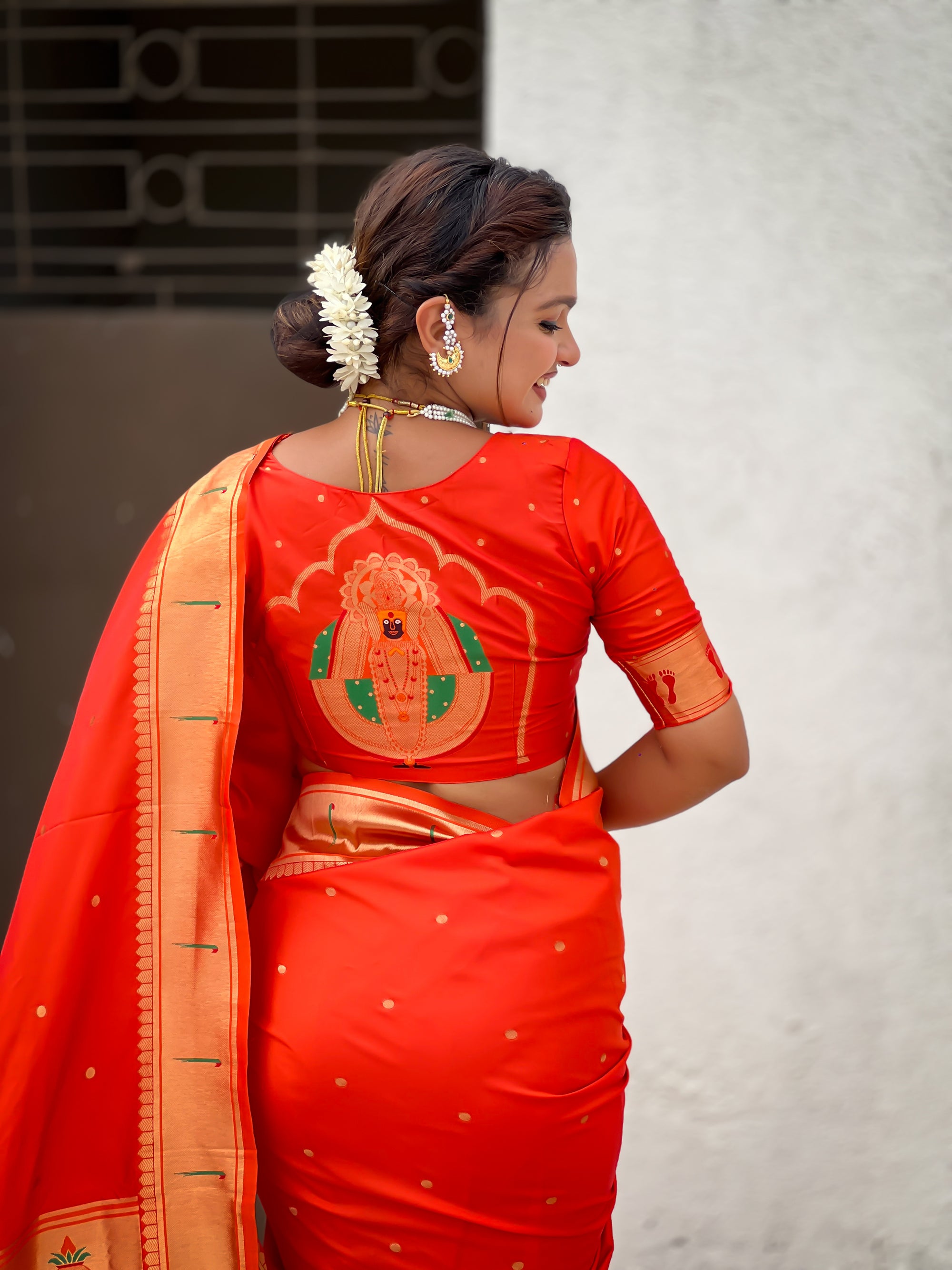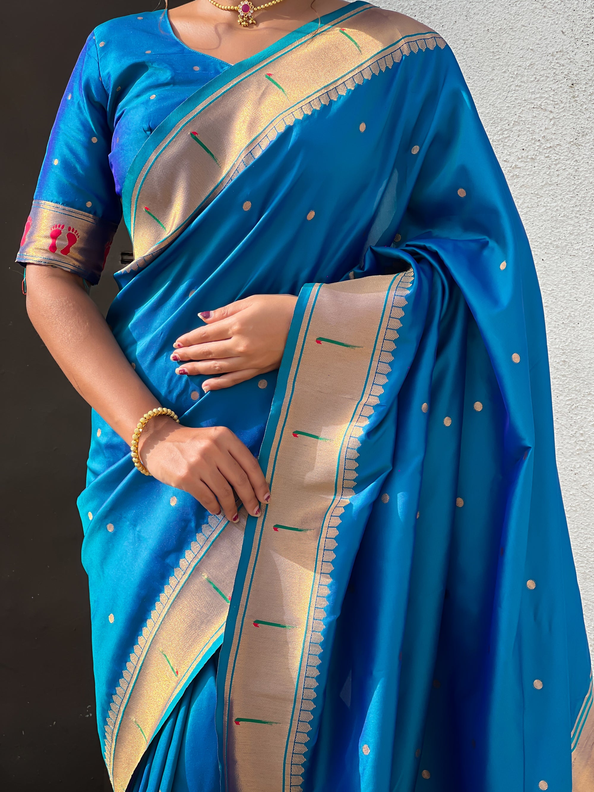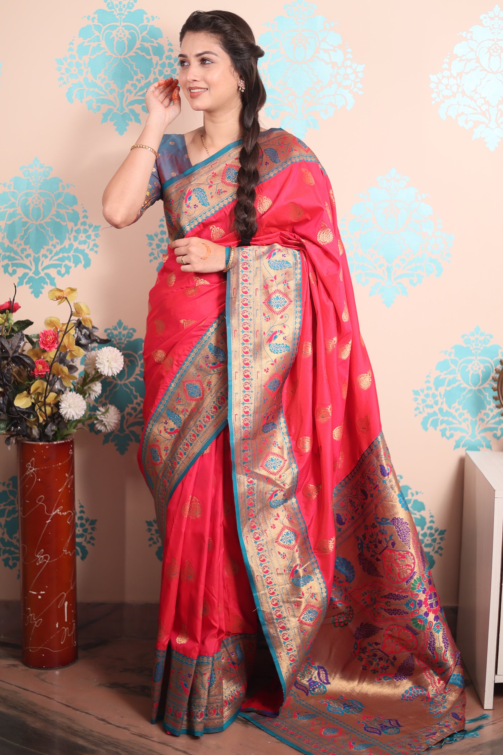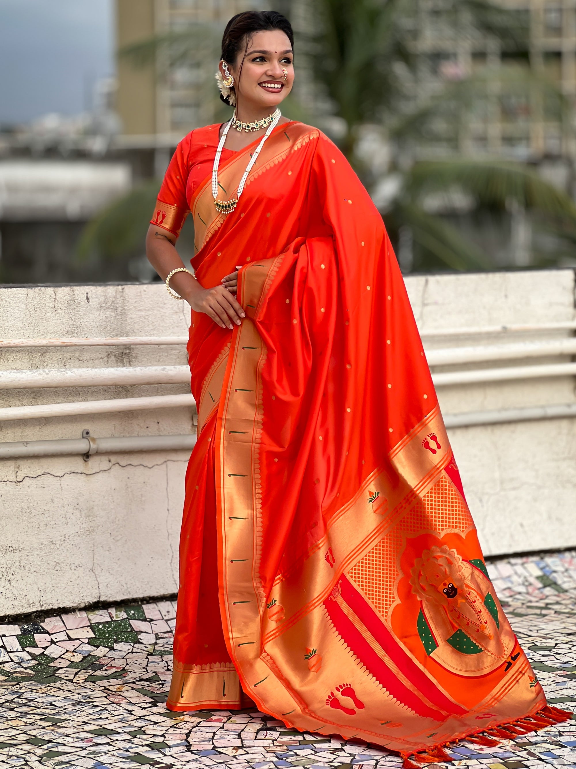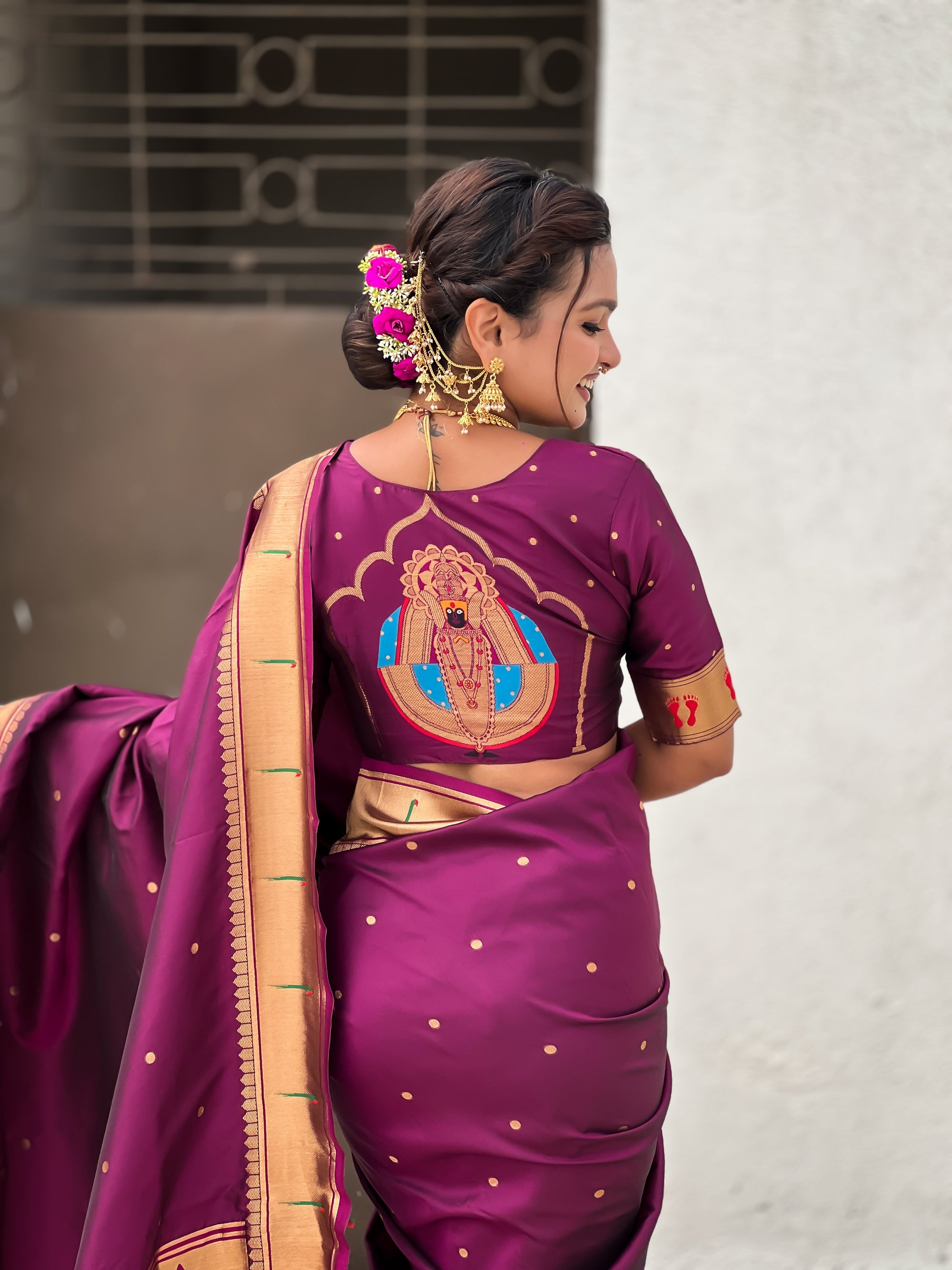 The Paithani saree is a true symbol of grace and heritage, crafted with luxurious silk and vibrant colors. Its intricate zari work, adorned with beautiful peacock and floral motifs, reflects unmatched artistry. A perfect blend of tradition and elegance, it is a treasure that enhances the beauty of every occasion, making every woman feel royal and radiant.