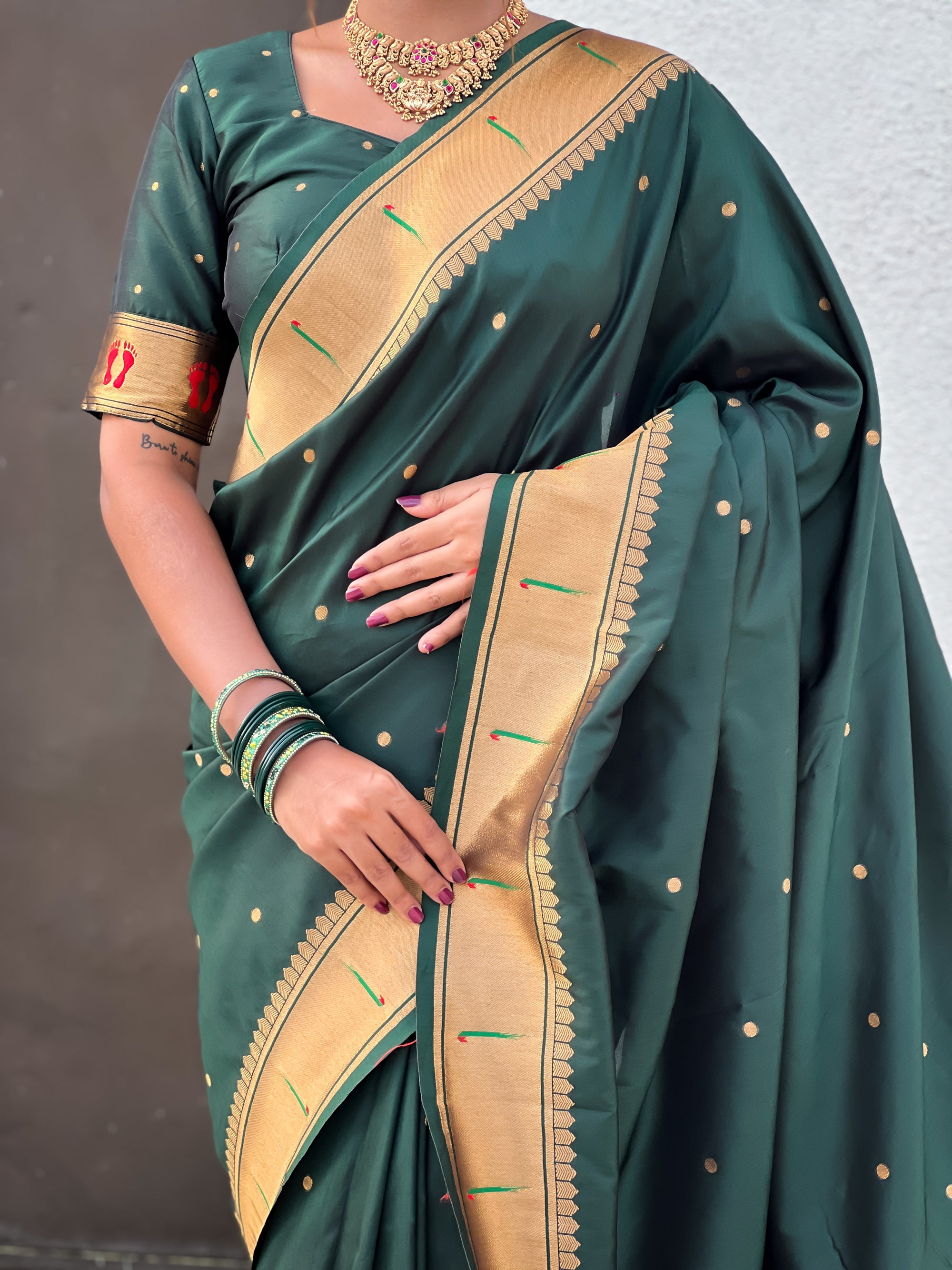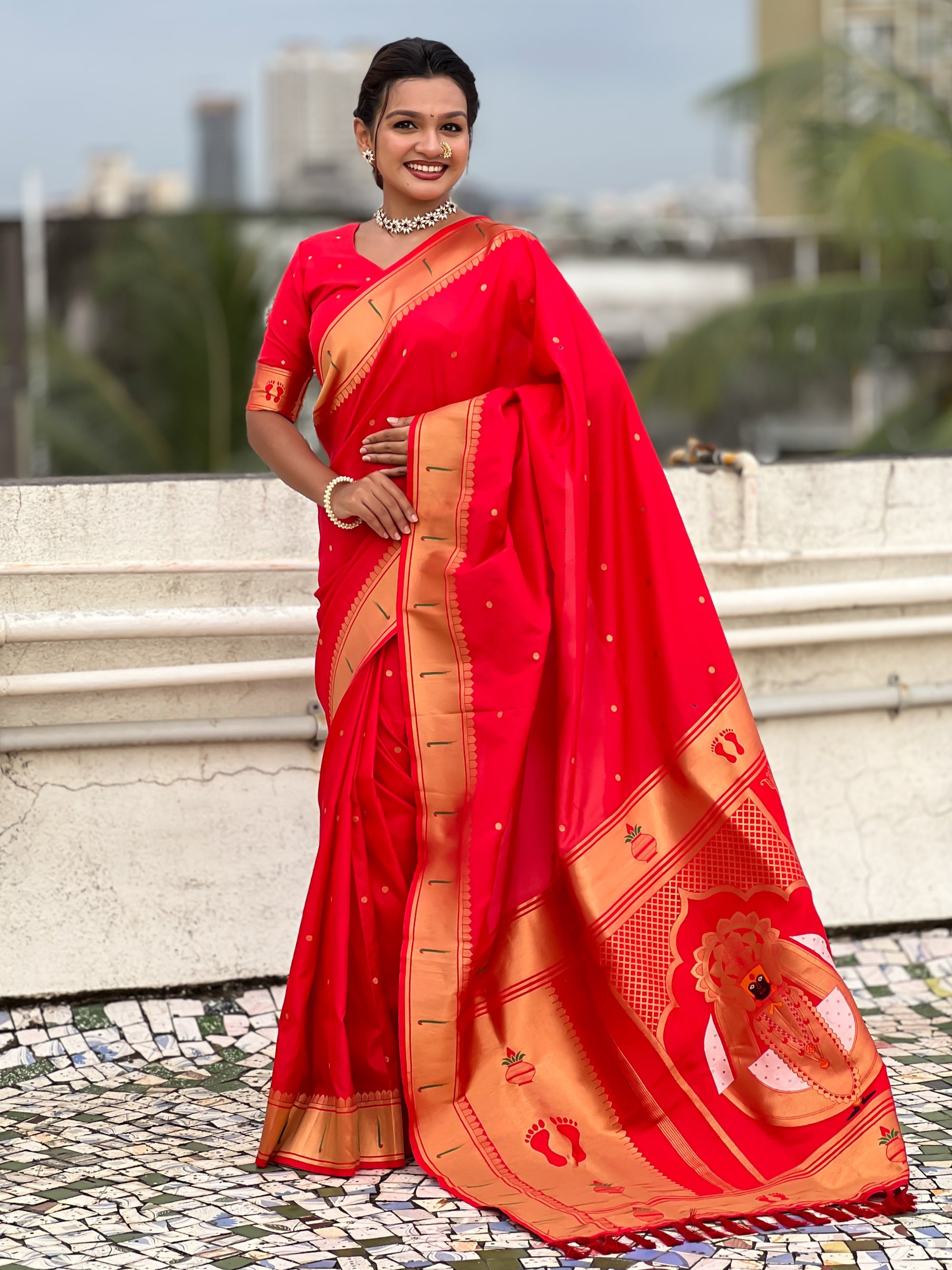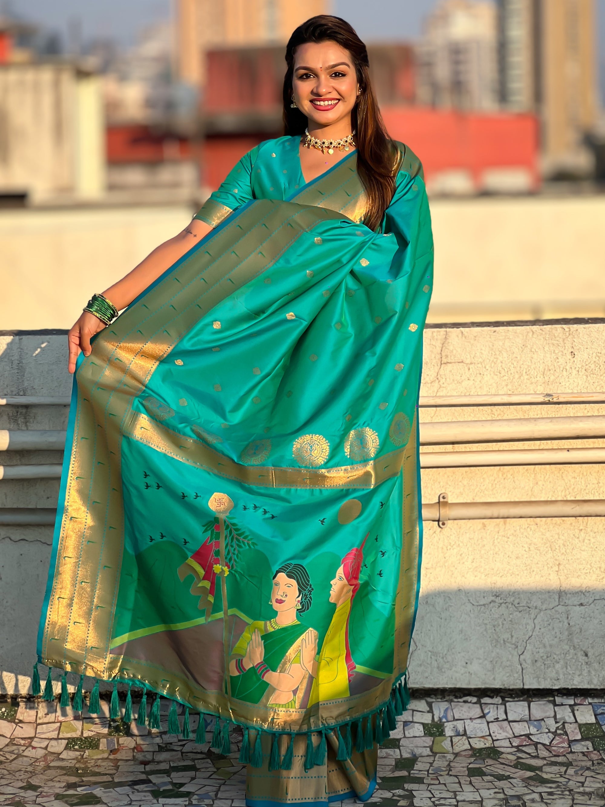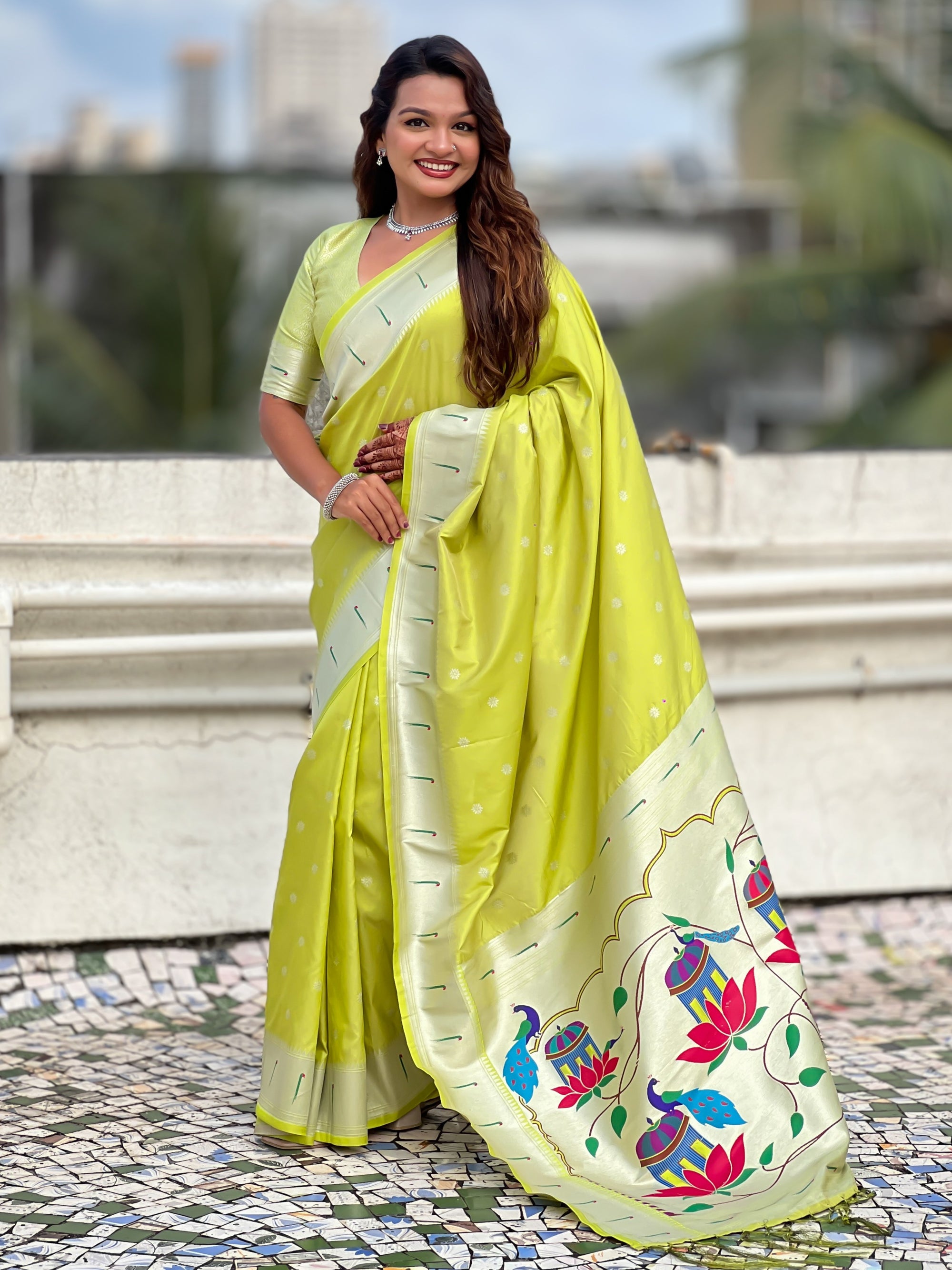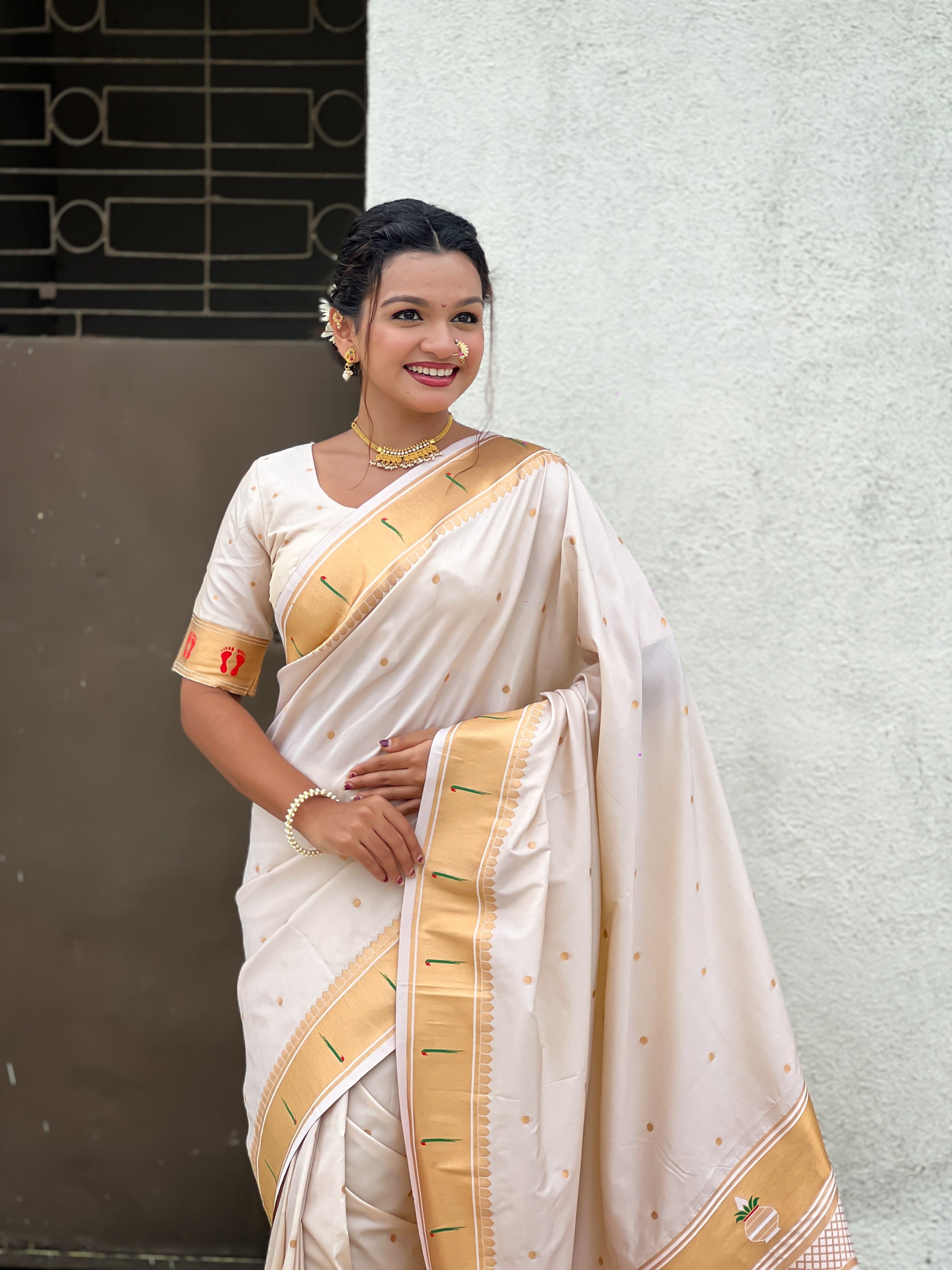 The Paithani saree is a true symbol of grace and heritage, crafted with luxurious silk and vibrant colors. Its intricate zari work, adorned with beautiful peacock and floral motifs, reflects unmatched artistry. A perfect blend of tradition and elegance, it is a treasure that enhances the beauty of every occasion, making every woman feel royal and radiant.