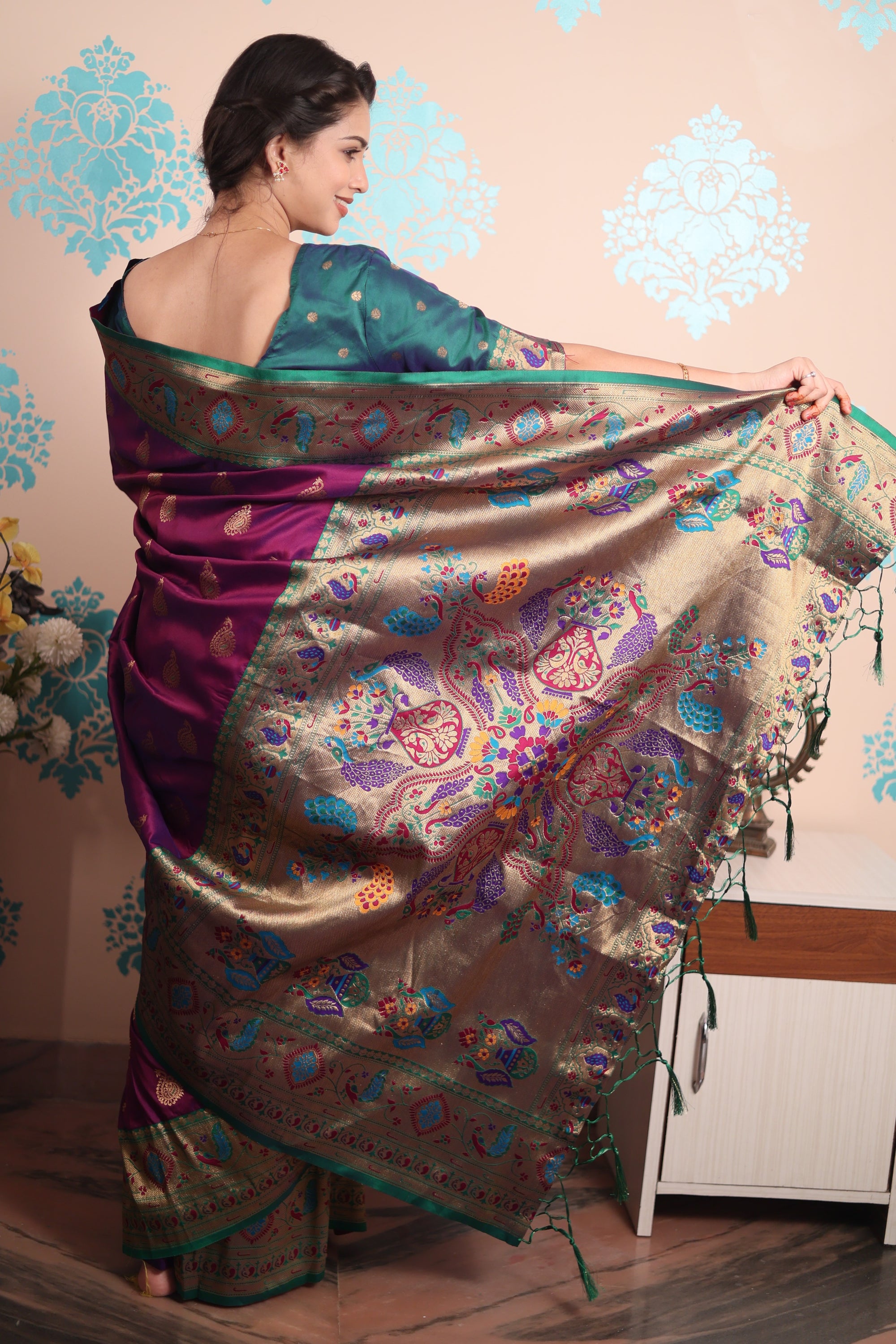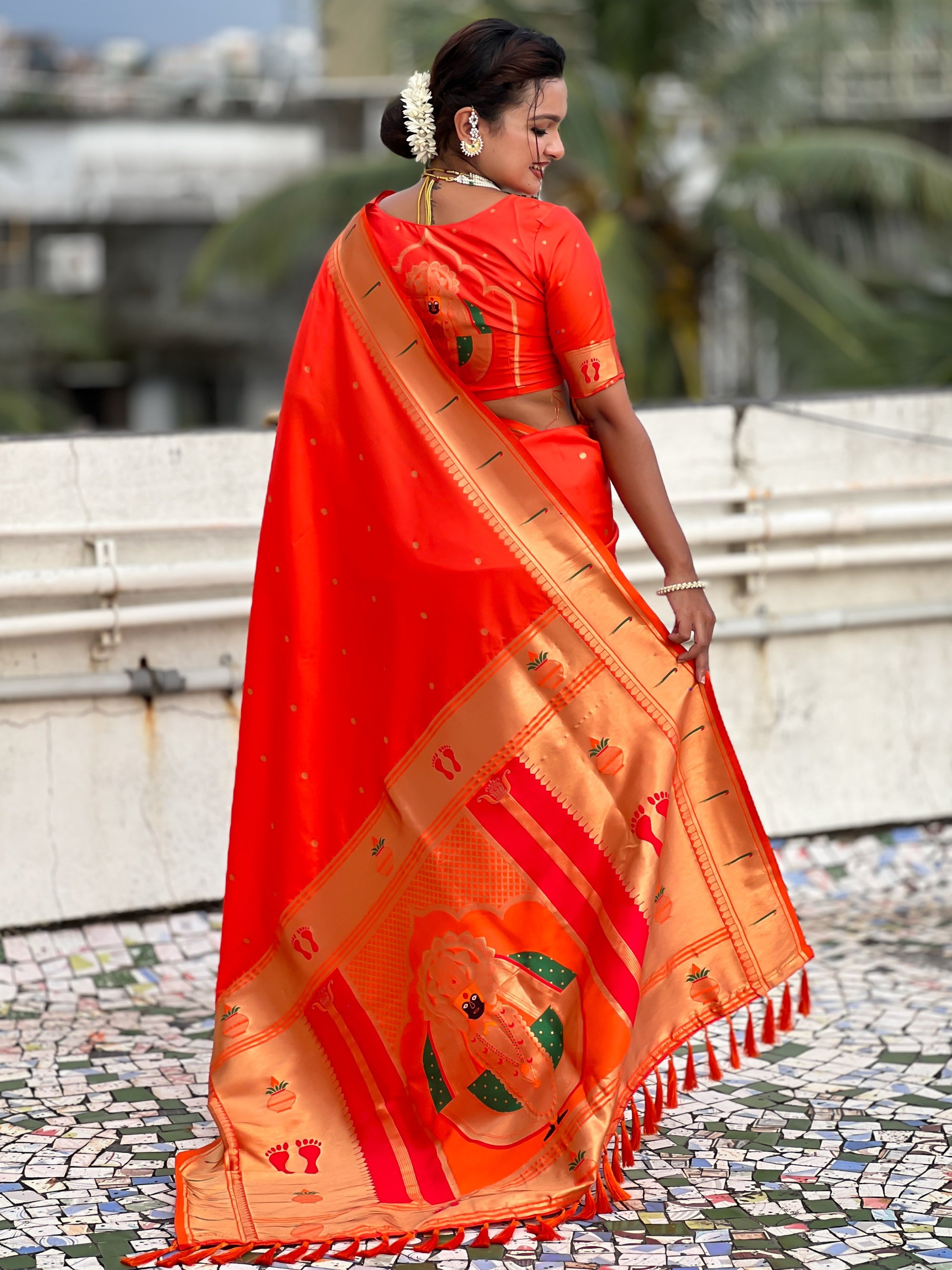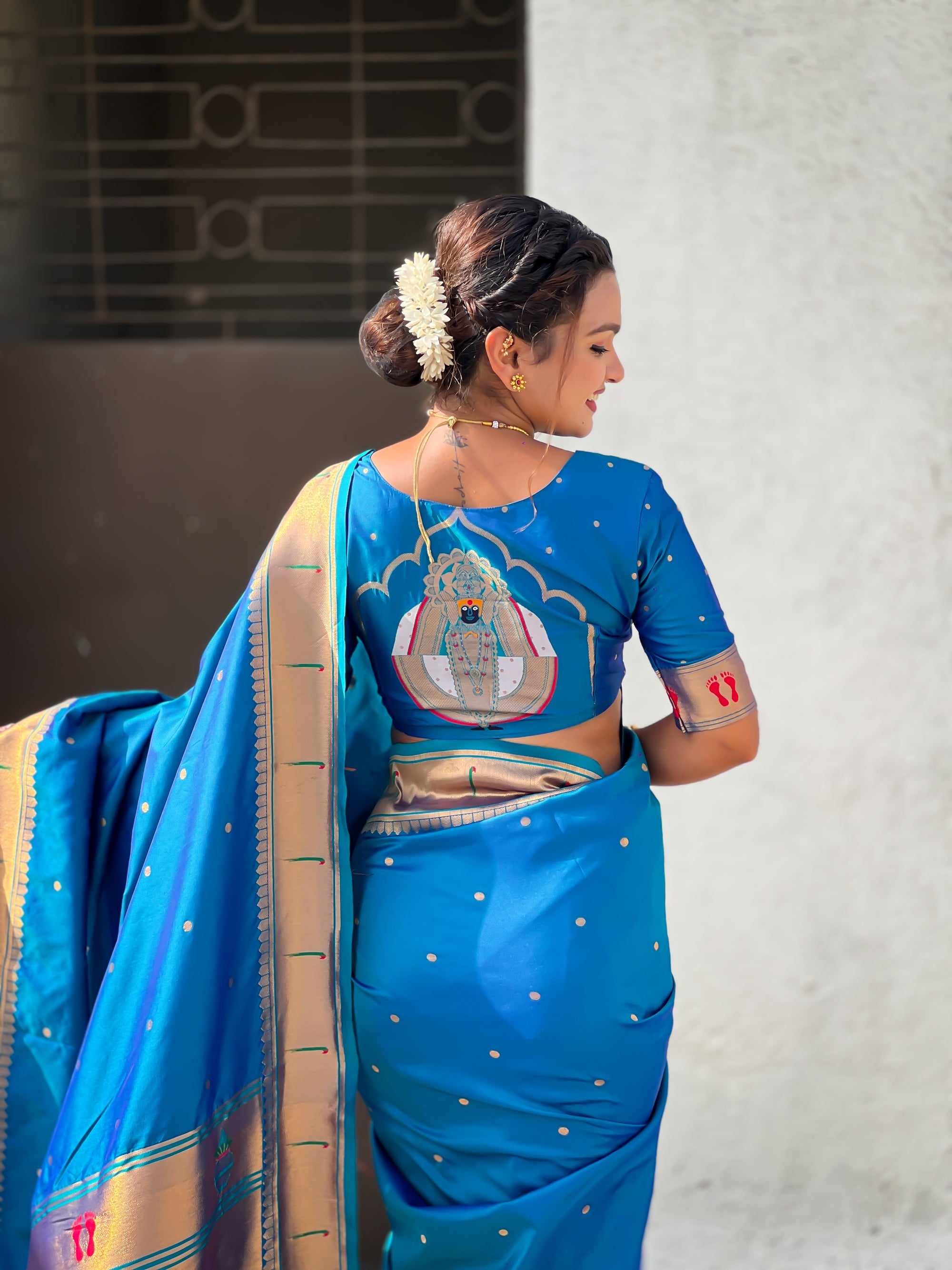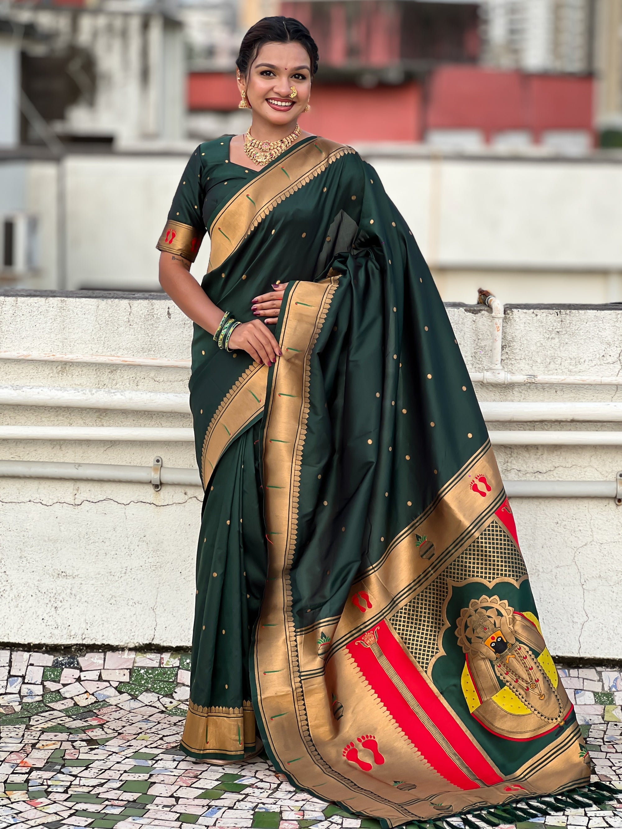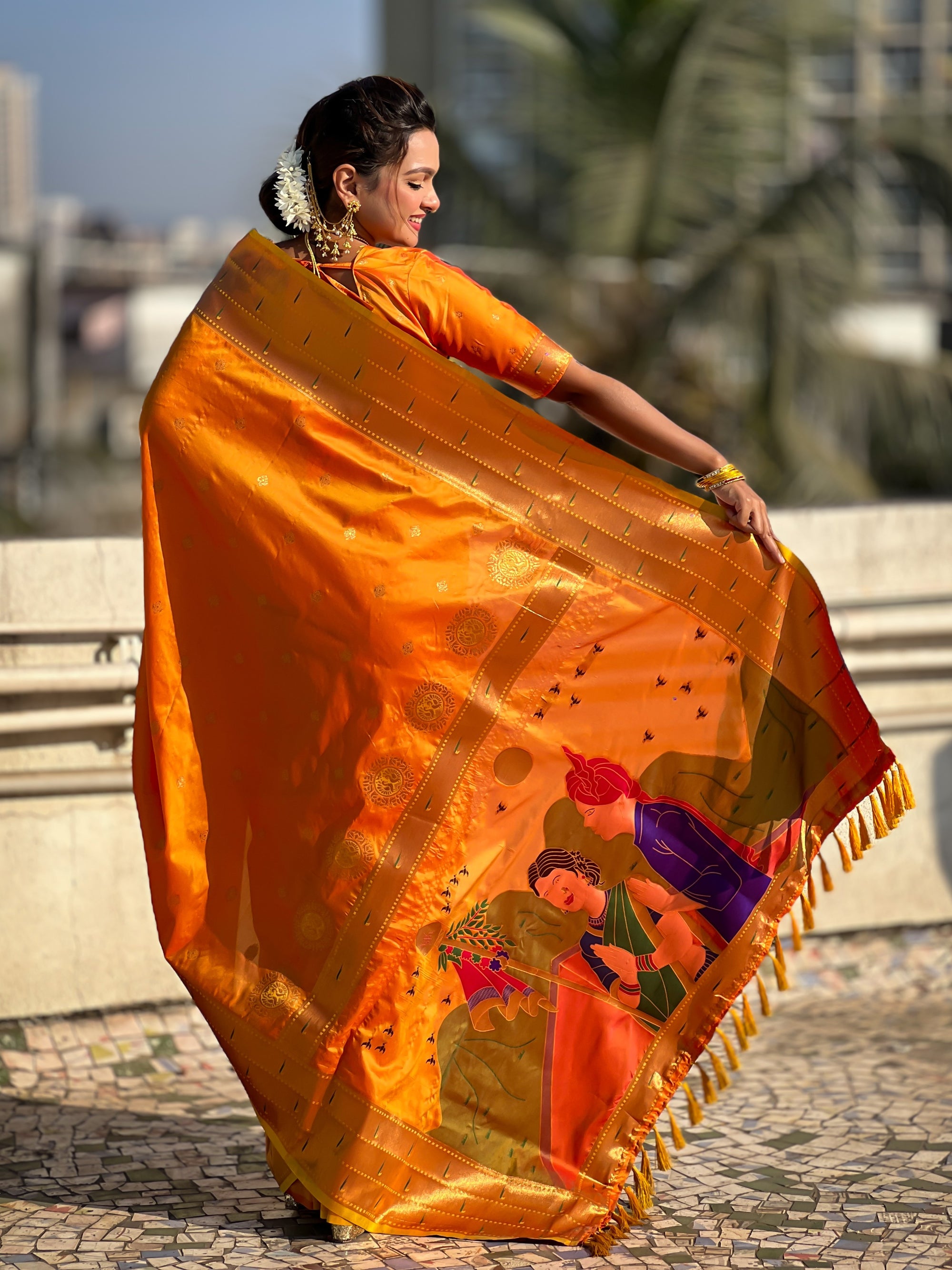 The Paithani saree is a true symbol of grace and heritage, crafted with luxurious silk and vibrant colors. Its intricate zari work, adorned with beautiful peacock and floral motifs, reflects unmatched artistry. A perfect blend of tradition and elegance, it is a treasure that enhances the beauty of every occasion, making every woman feel royal and radiant.