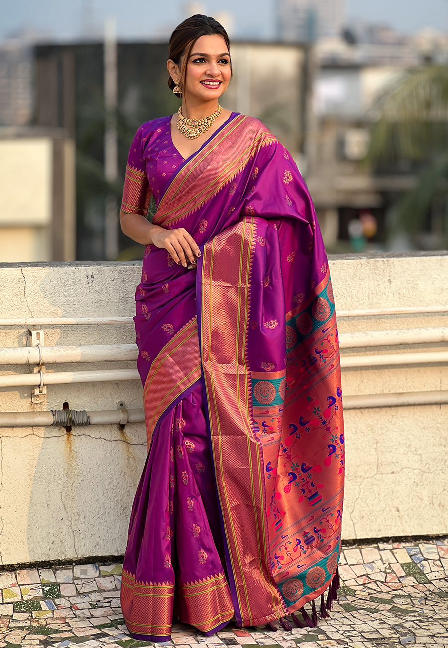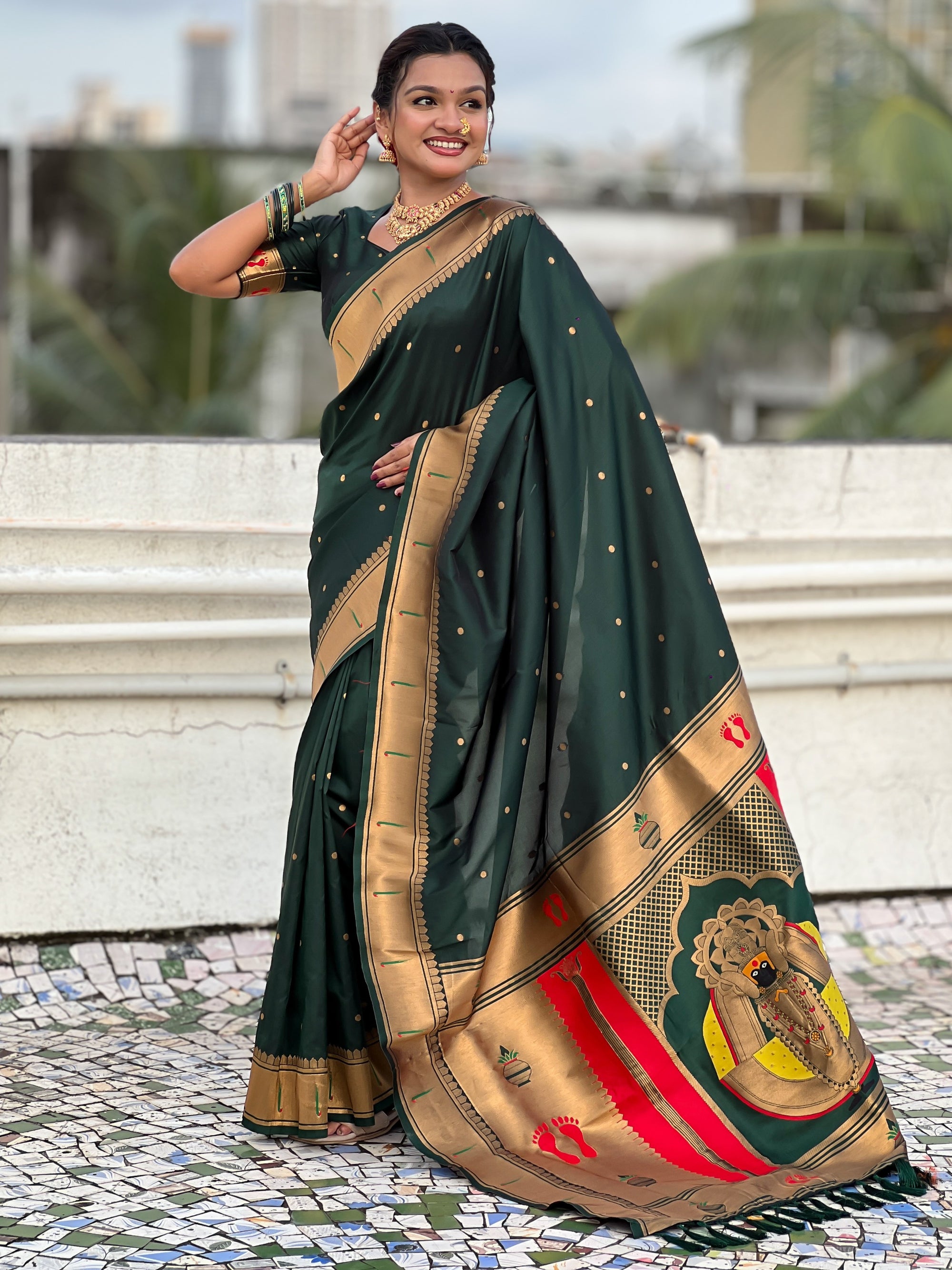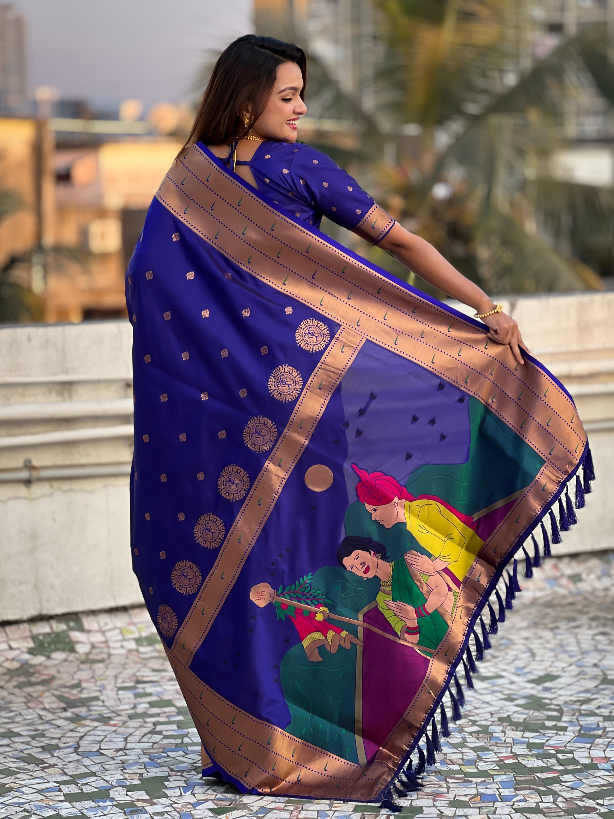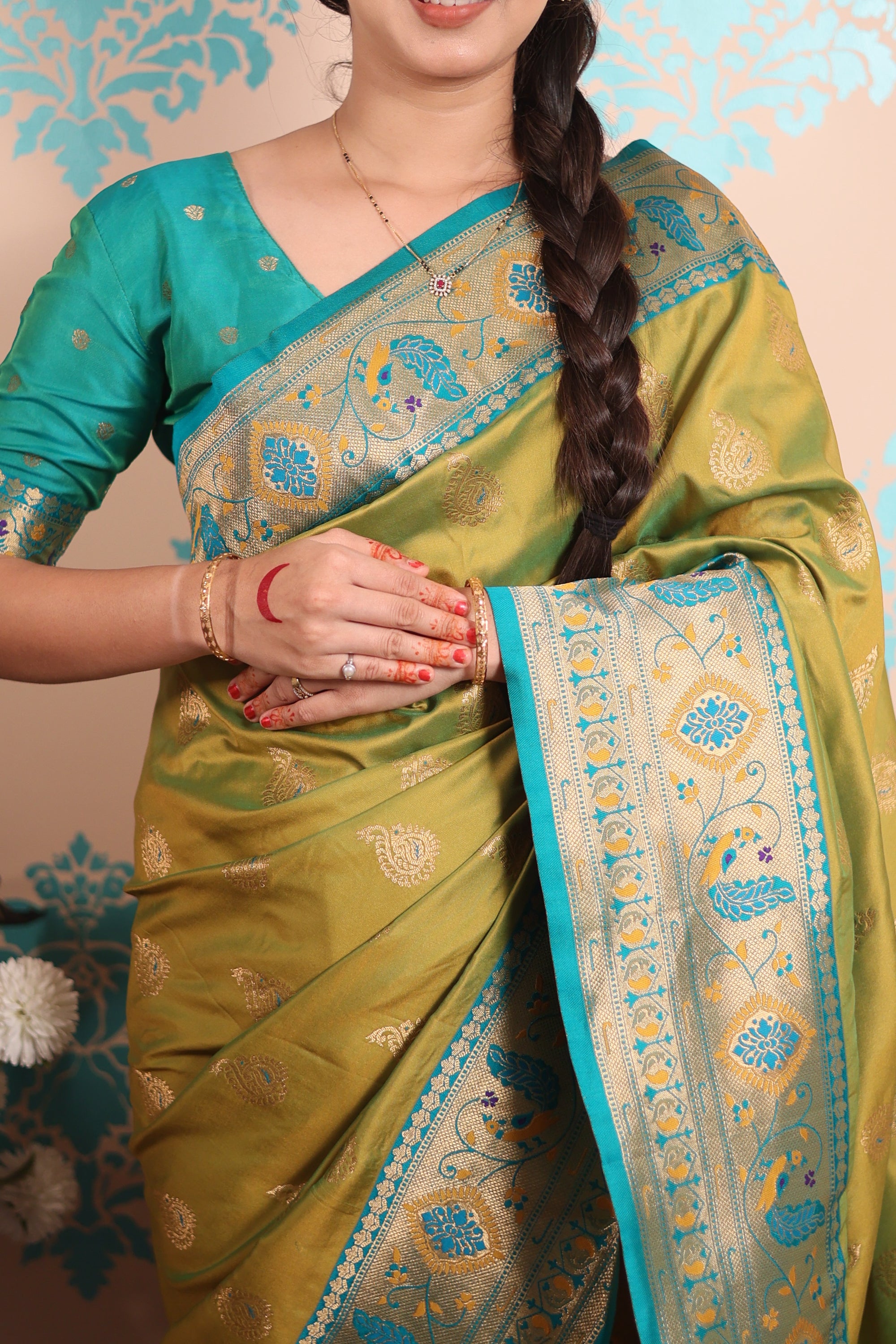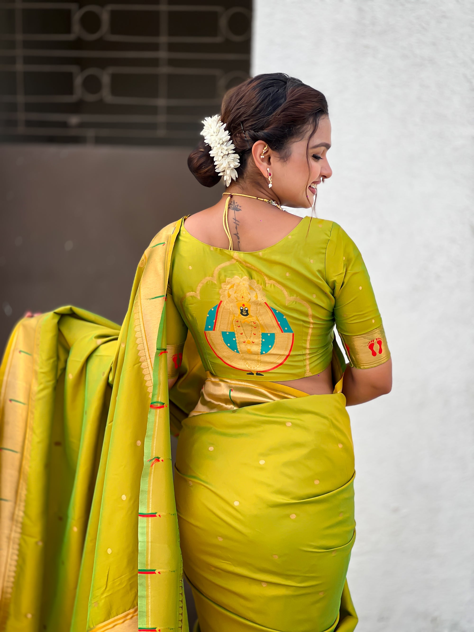 The Paithani saree is a true symbol of grace and heritage, crafted with luxurious silk and vibrant colors. Its intricate zari work, adorned with beautiful peacock and floral motifs, reflects unmatched artistry. A perfect blend of tradition and elegance, it is a treasure that enhances the beauty of every occasion, making every woman feel royal and radiant.
