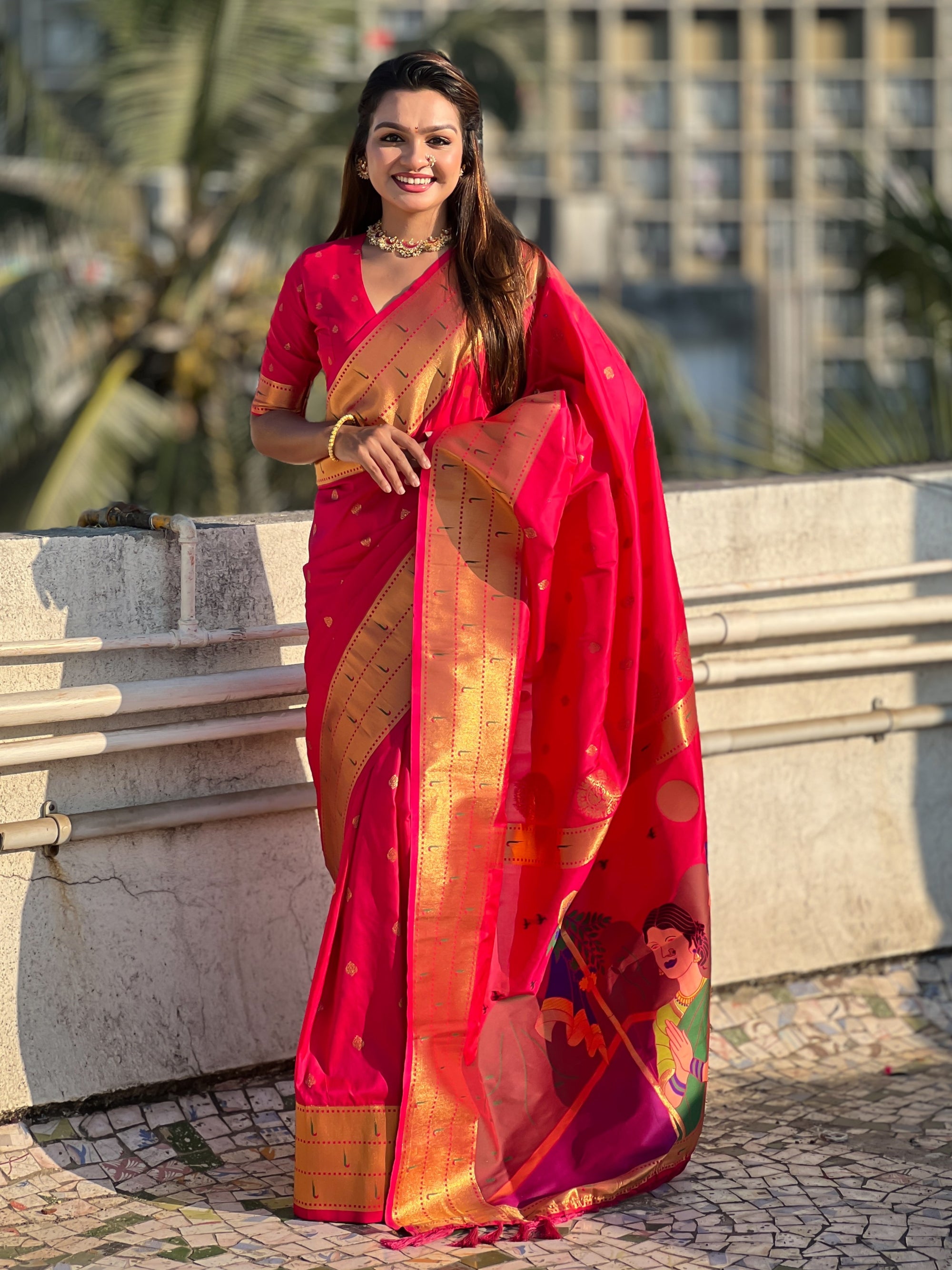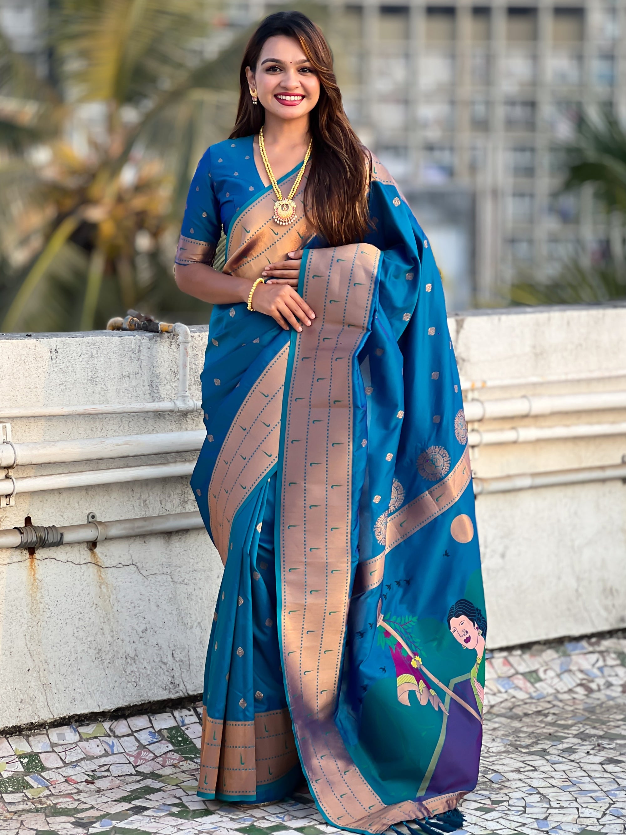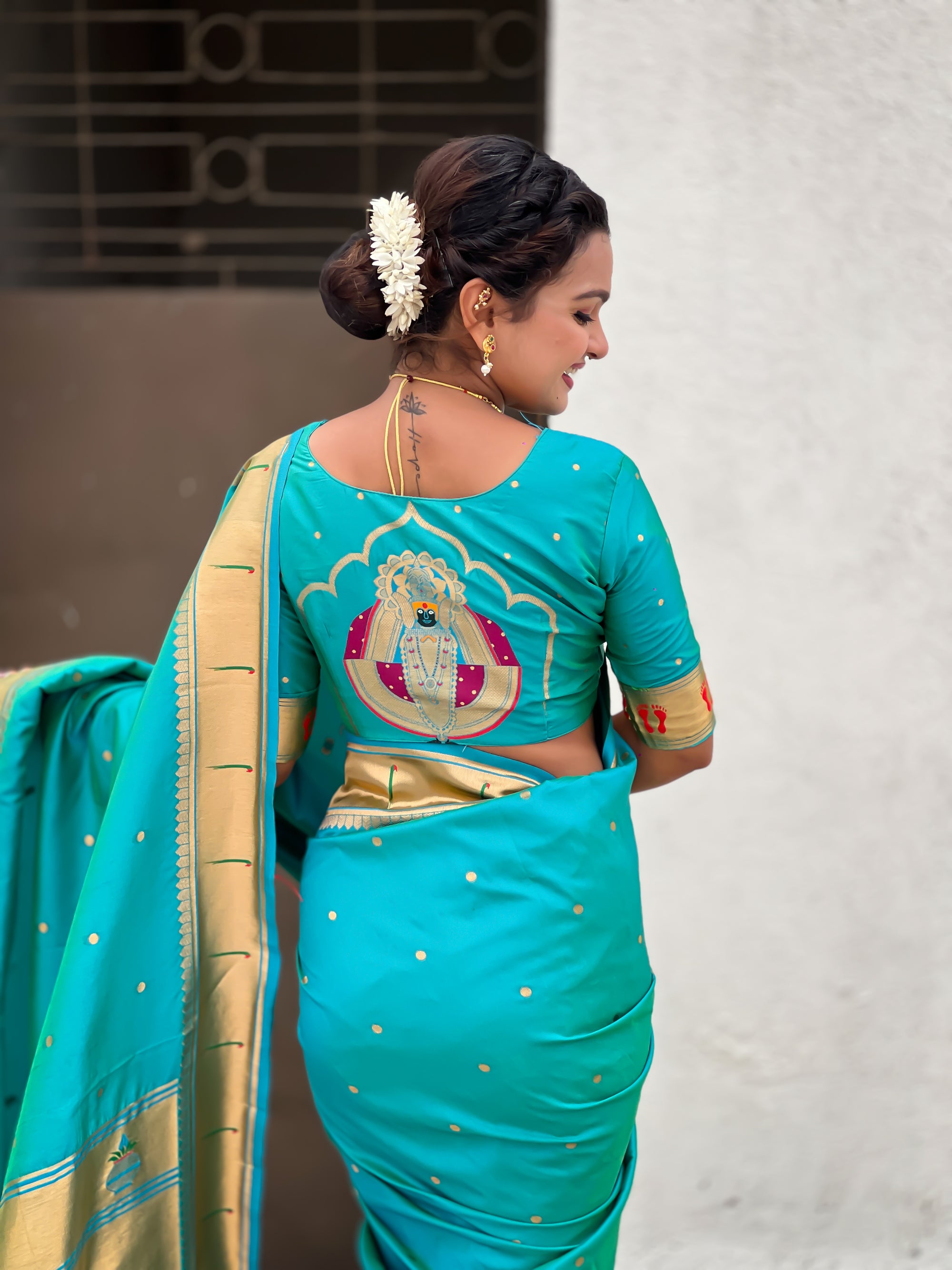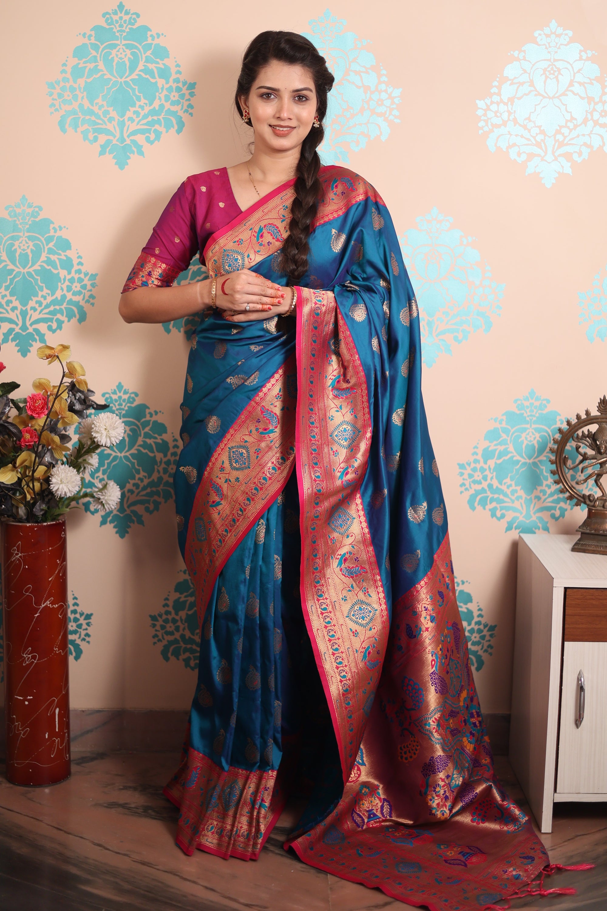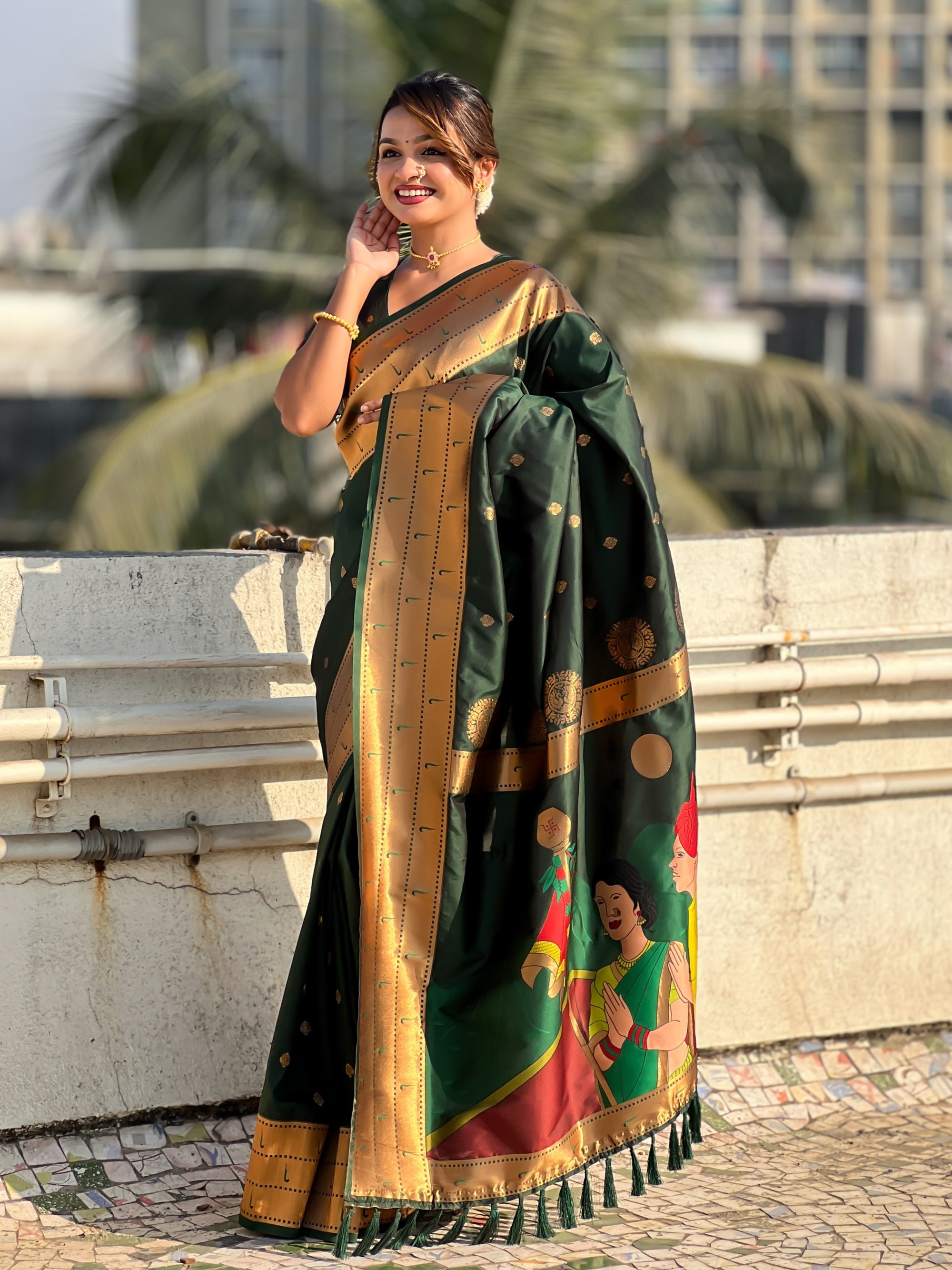 The Paithani saree is a true symbol of grace and heritage, crafted with luxurious silk and vibrant colors. Its intricate zari work, adorned with beautiful peacock and floral motifs, reflects unmatched artistry. A perfect blend of tradition and elegance, it is a treasure that enhances the beauty of every occasion, making every woman feel royal and radiant.