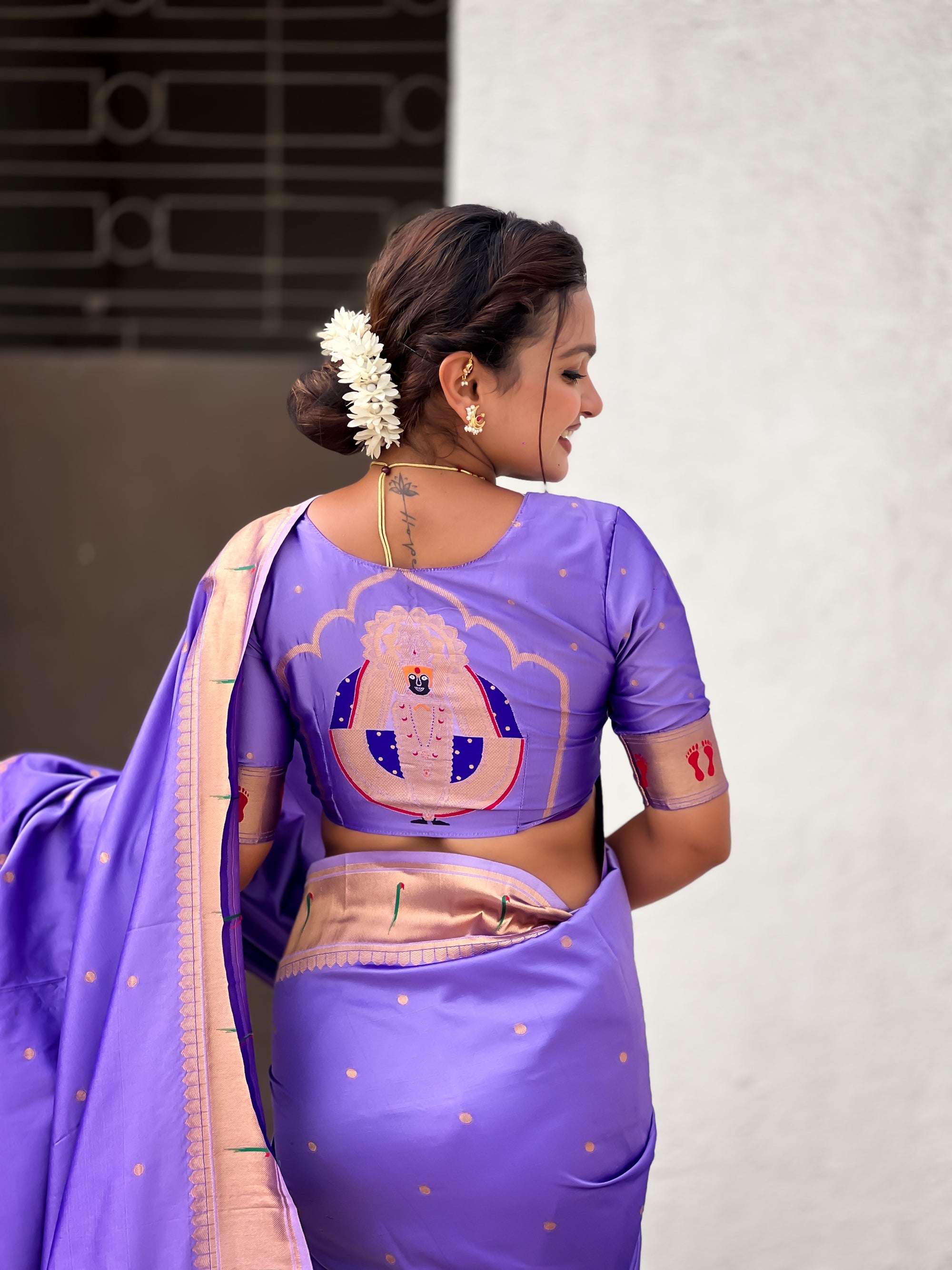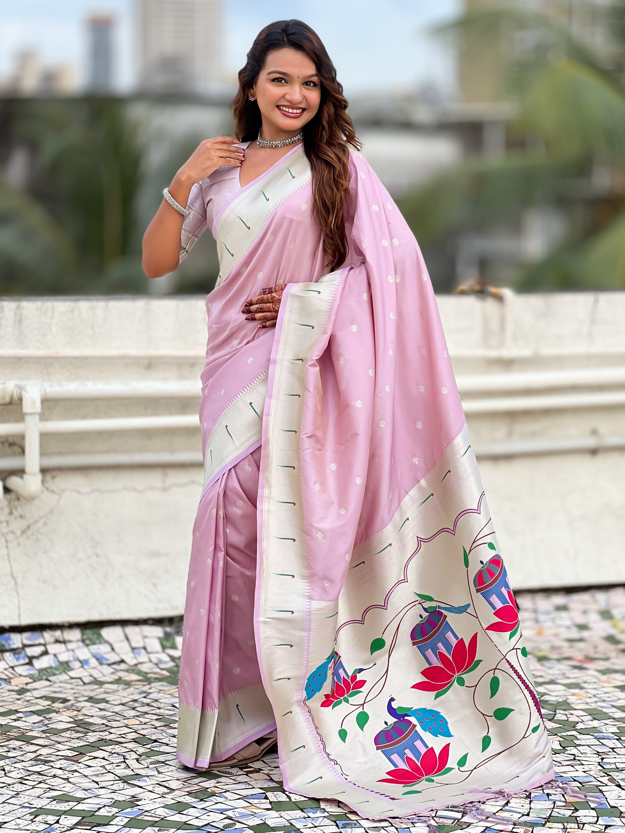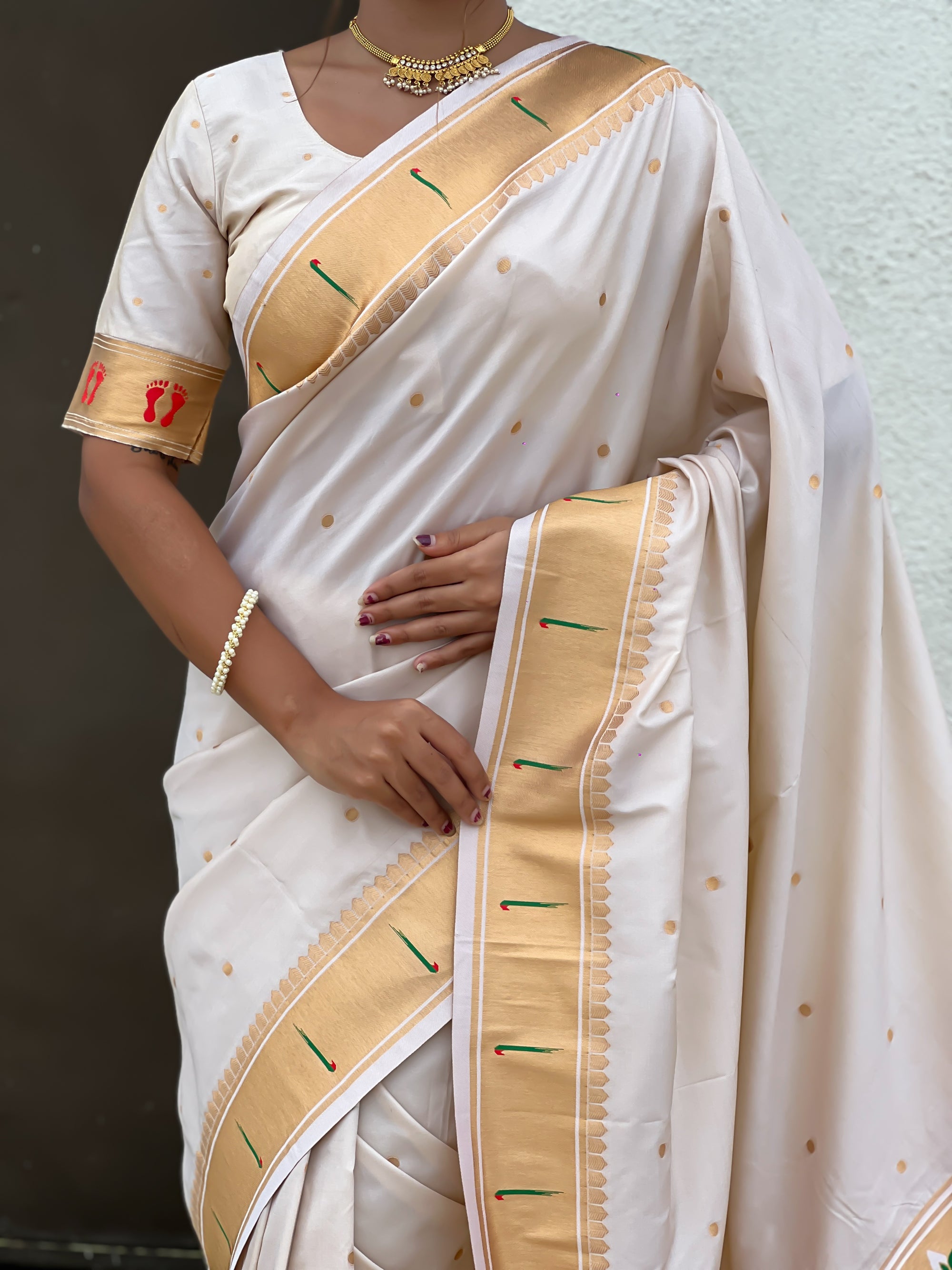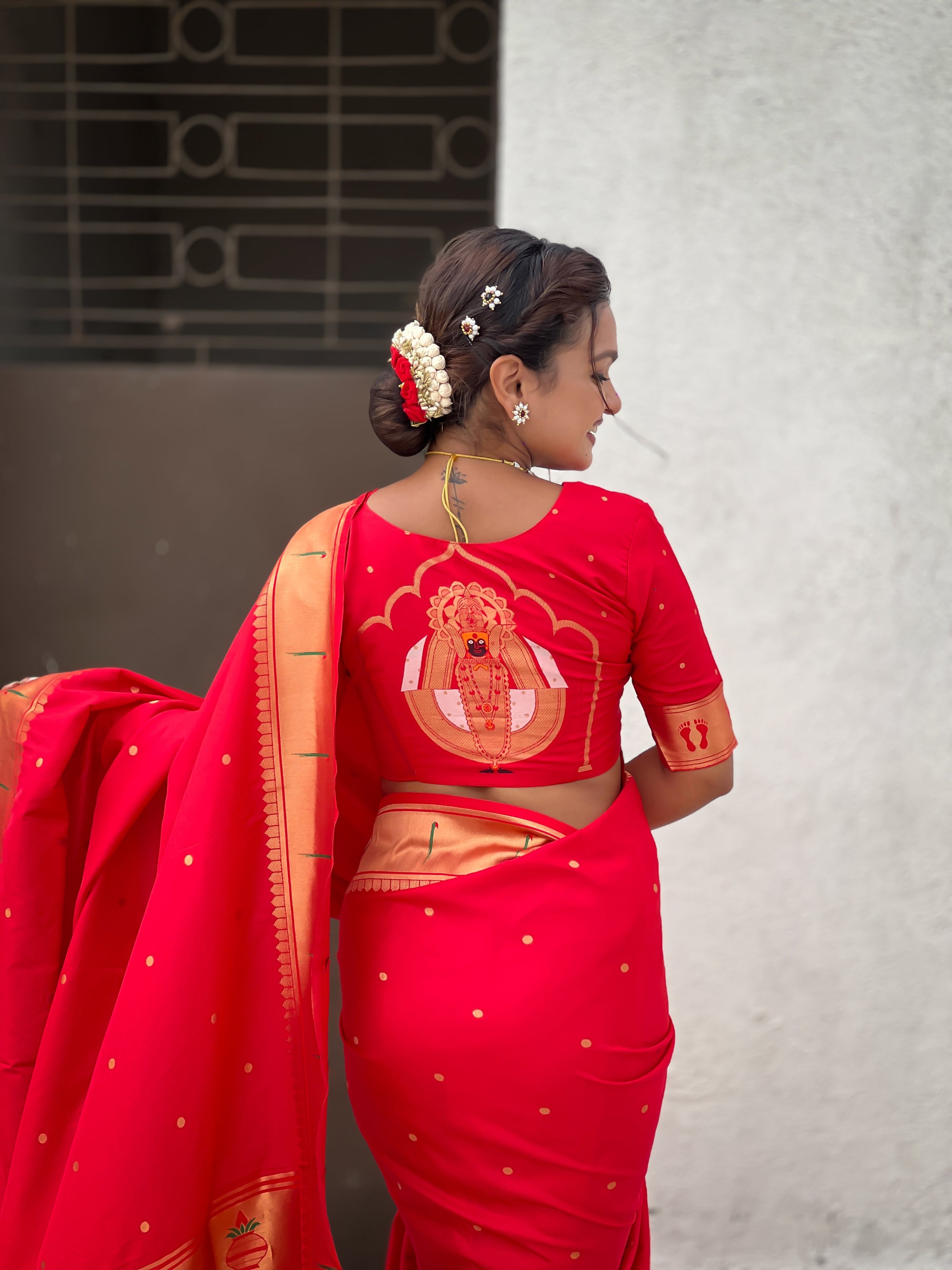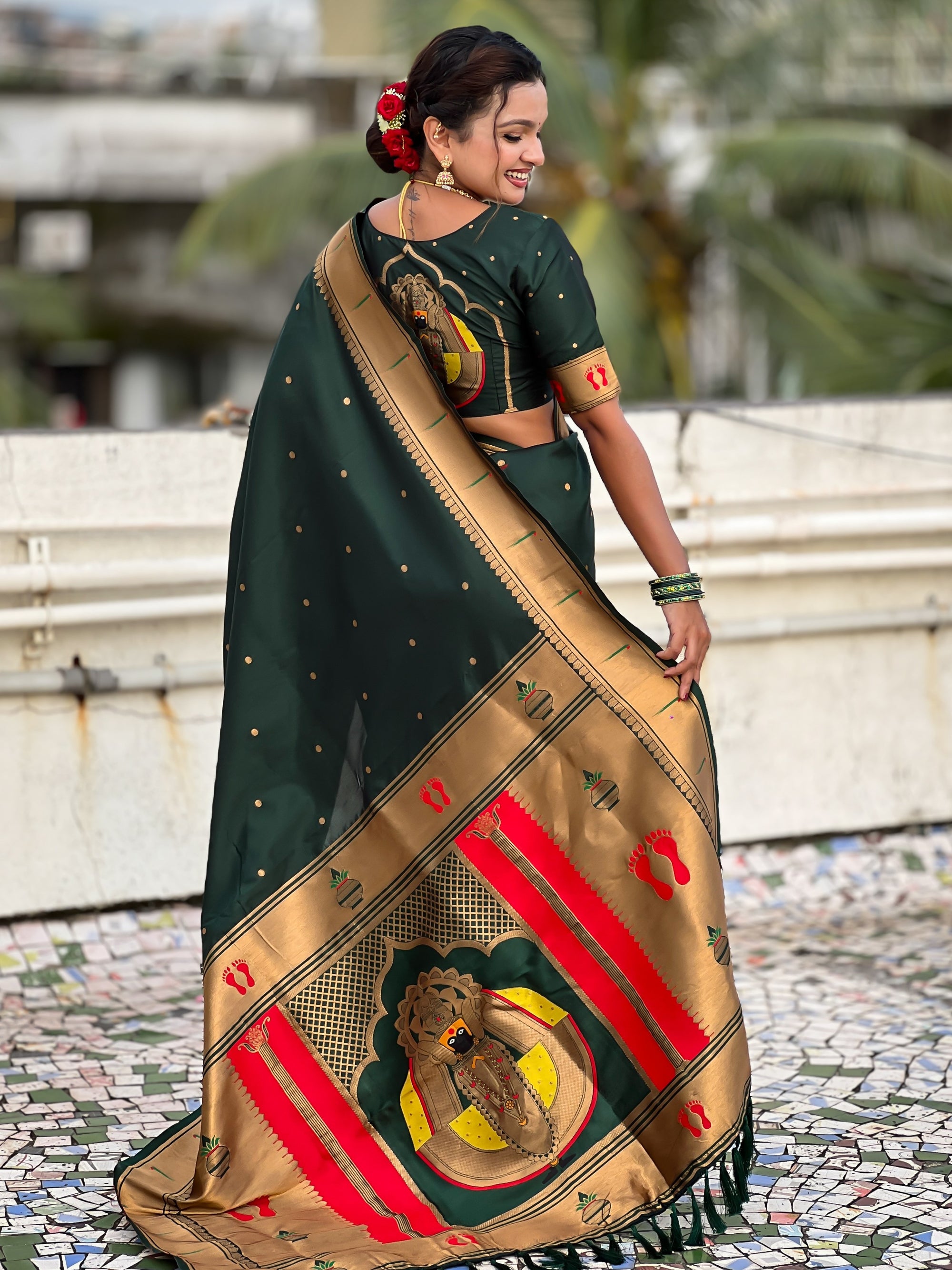 The Paithani saree is a true symbol of grace and heritage, crafted with luxurious silk and vibrant colors. Its intricate zari work, adorned with beautiful peacock and floral motifs, reflects unmatched artistry. A perfect blend of tradition and elegance, it is a treasure that enhances the beauty of every occasion, making every woman feel royal and radiant.