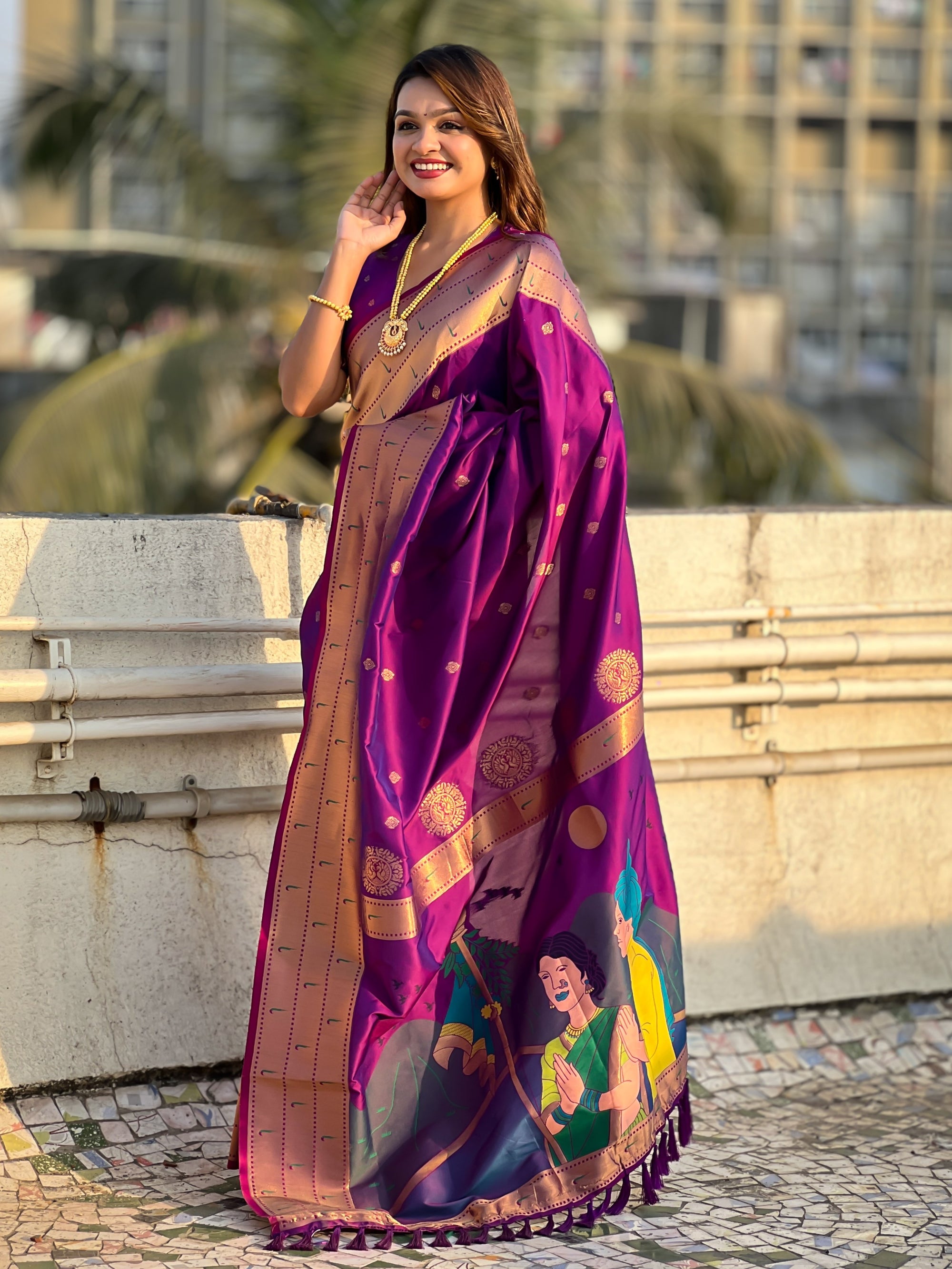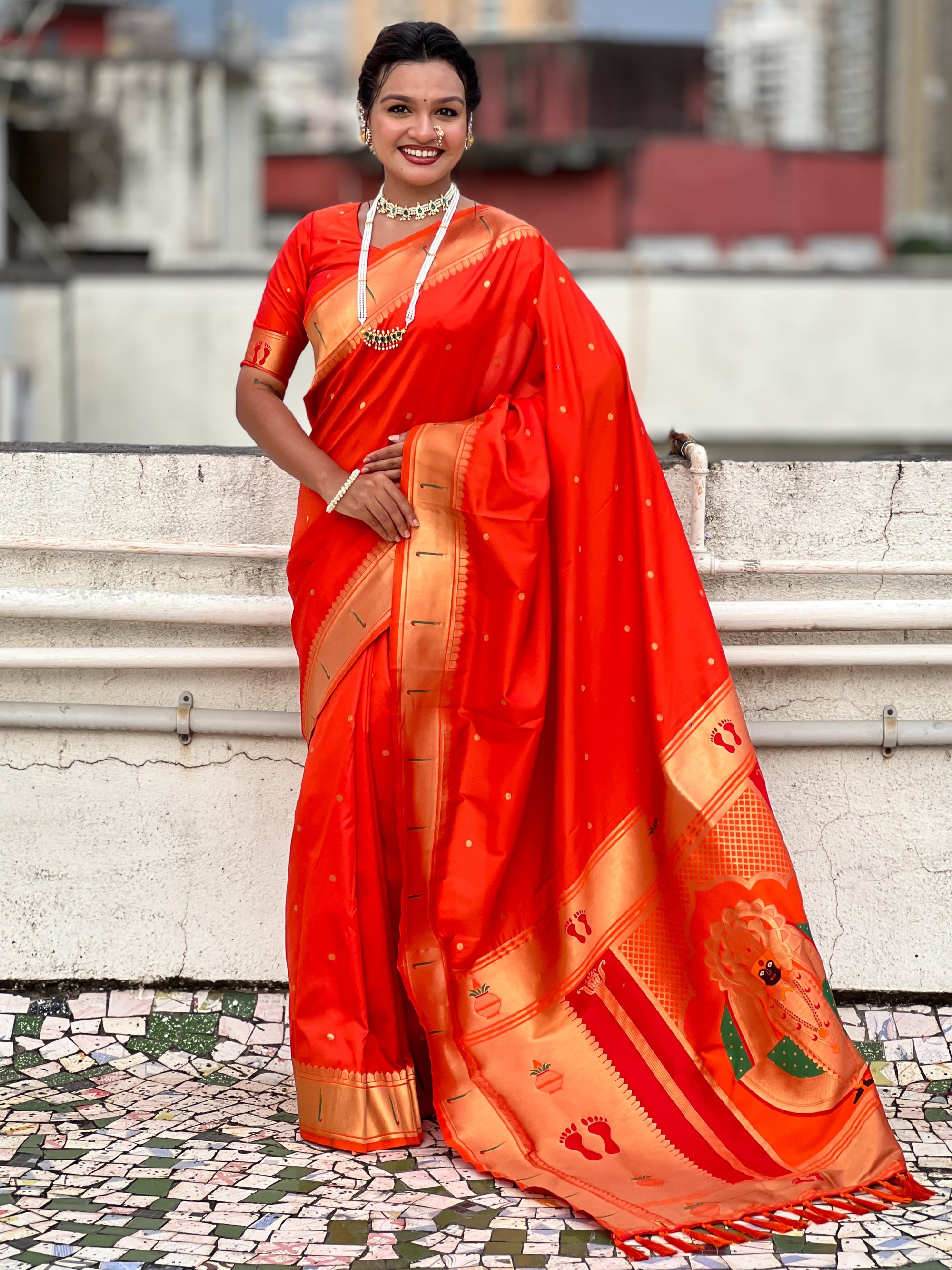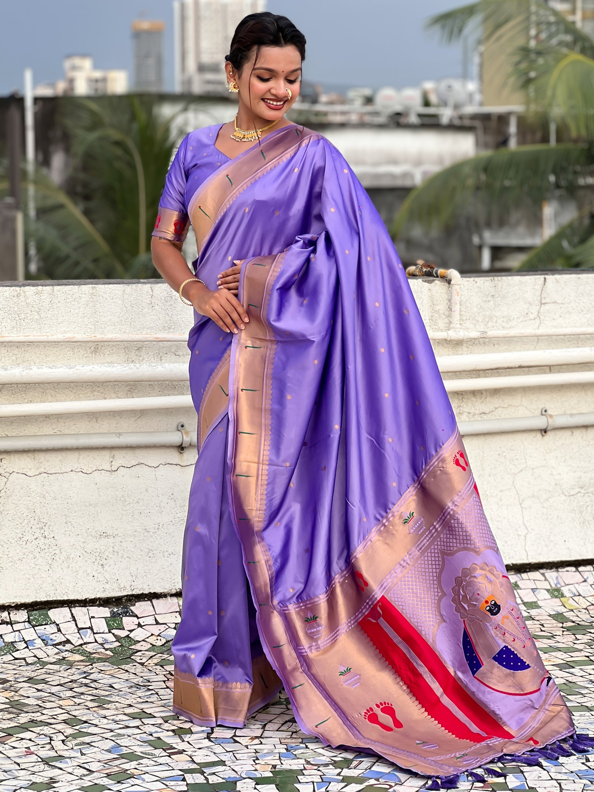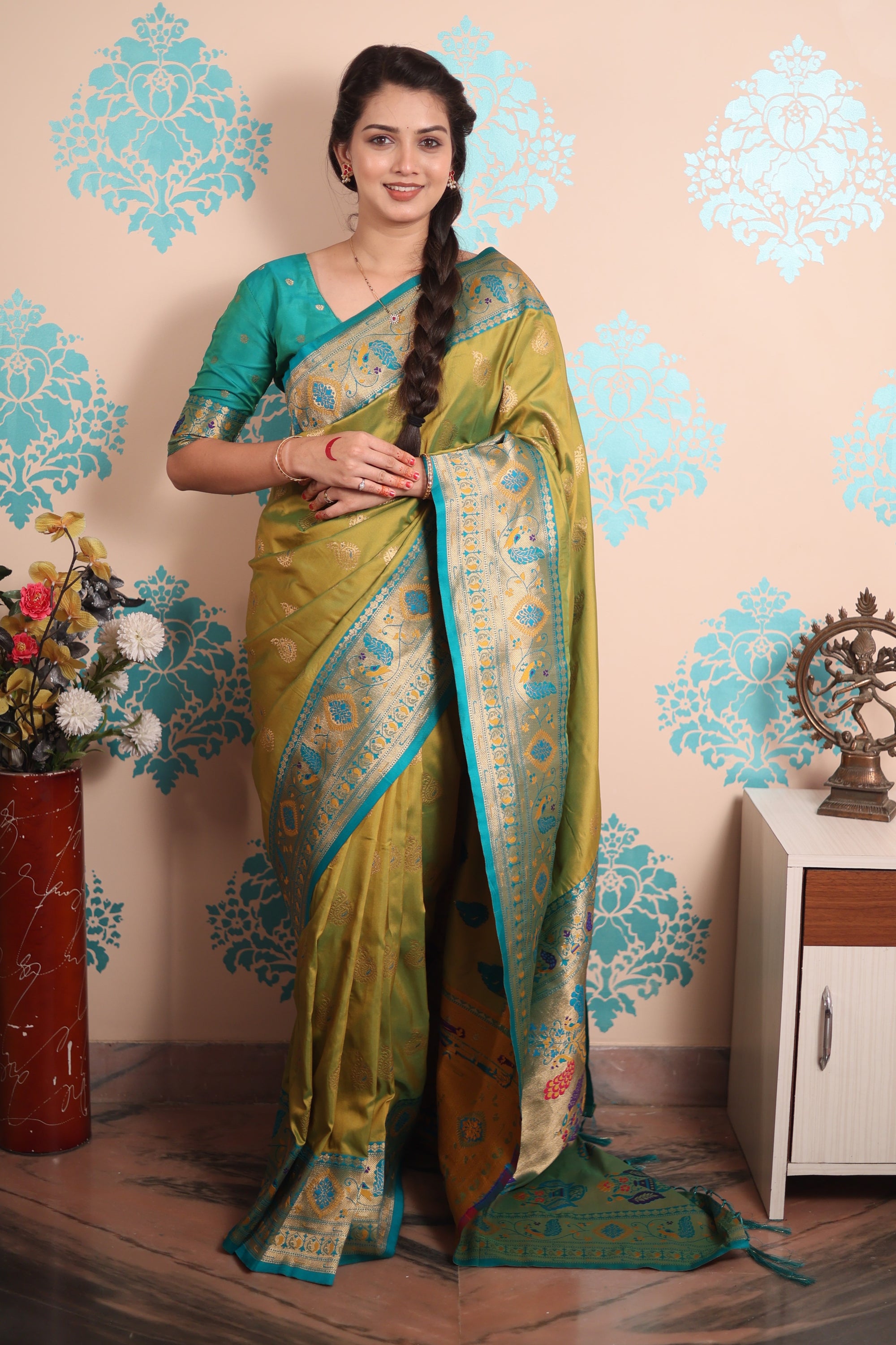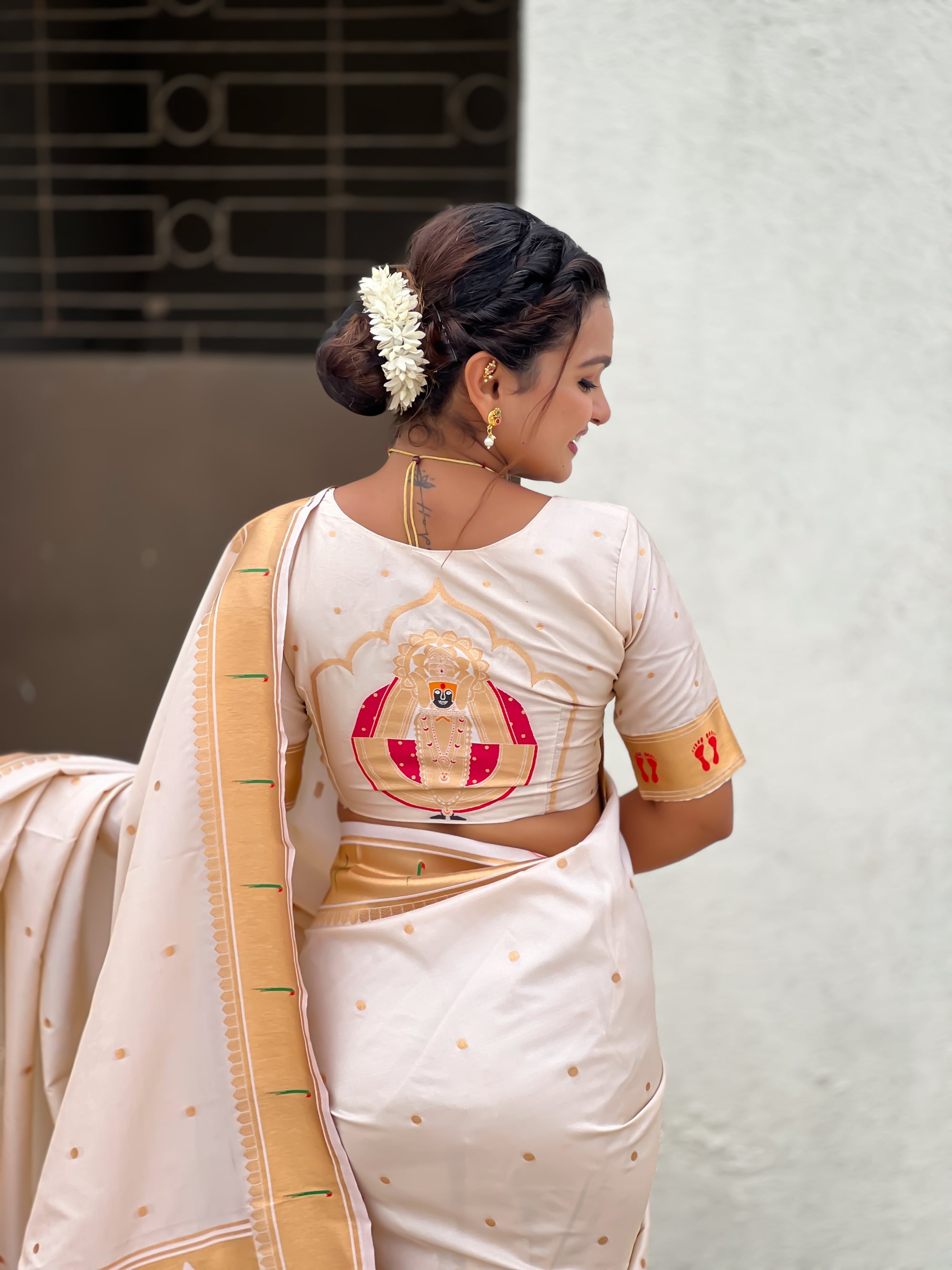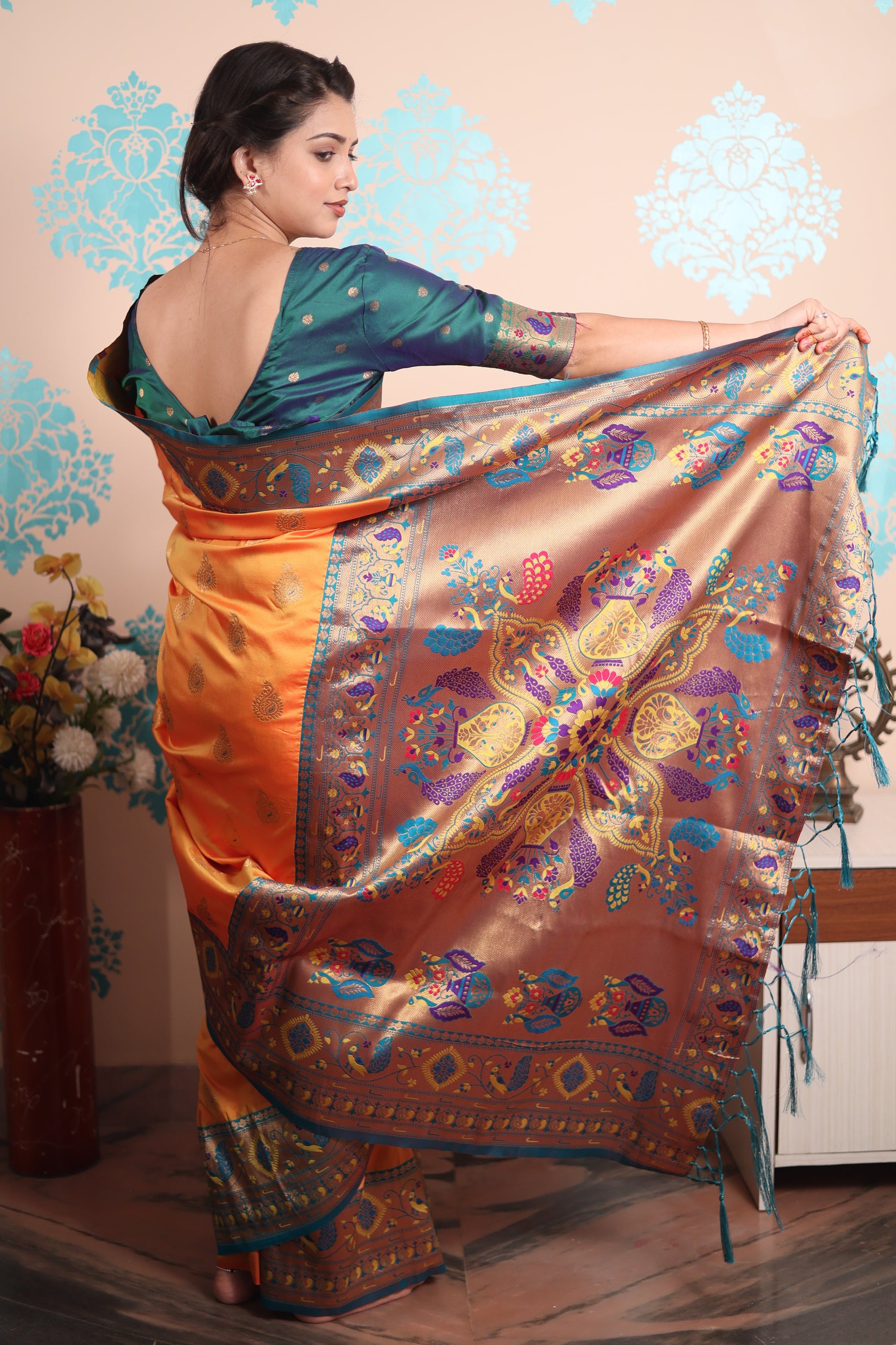 The Paithani saree is a true symbol of grace and heritage, crafted with luxurious silk and vibrant colors. Its intricate zari work, adorned with beautiful peacock and floral motifs, reflects unmatched artistry. A perfect blend of tradition and elegance, it is a treasure that enhances the beauty of every occasion, making every woman feel royal and radiant.