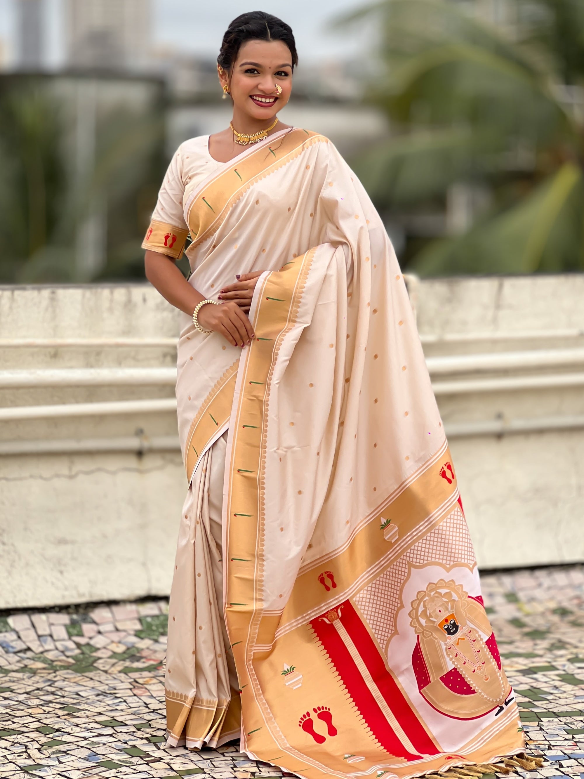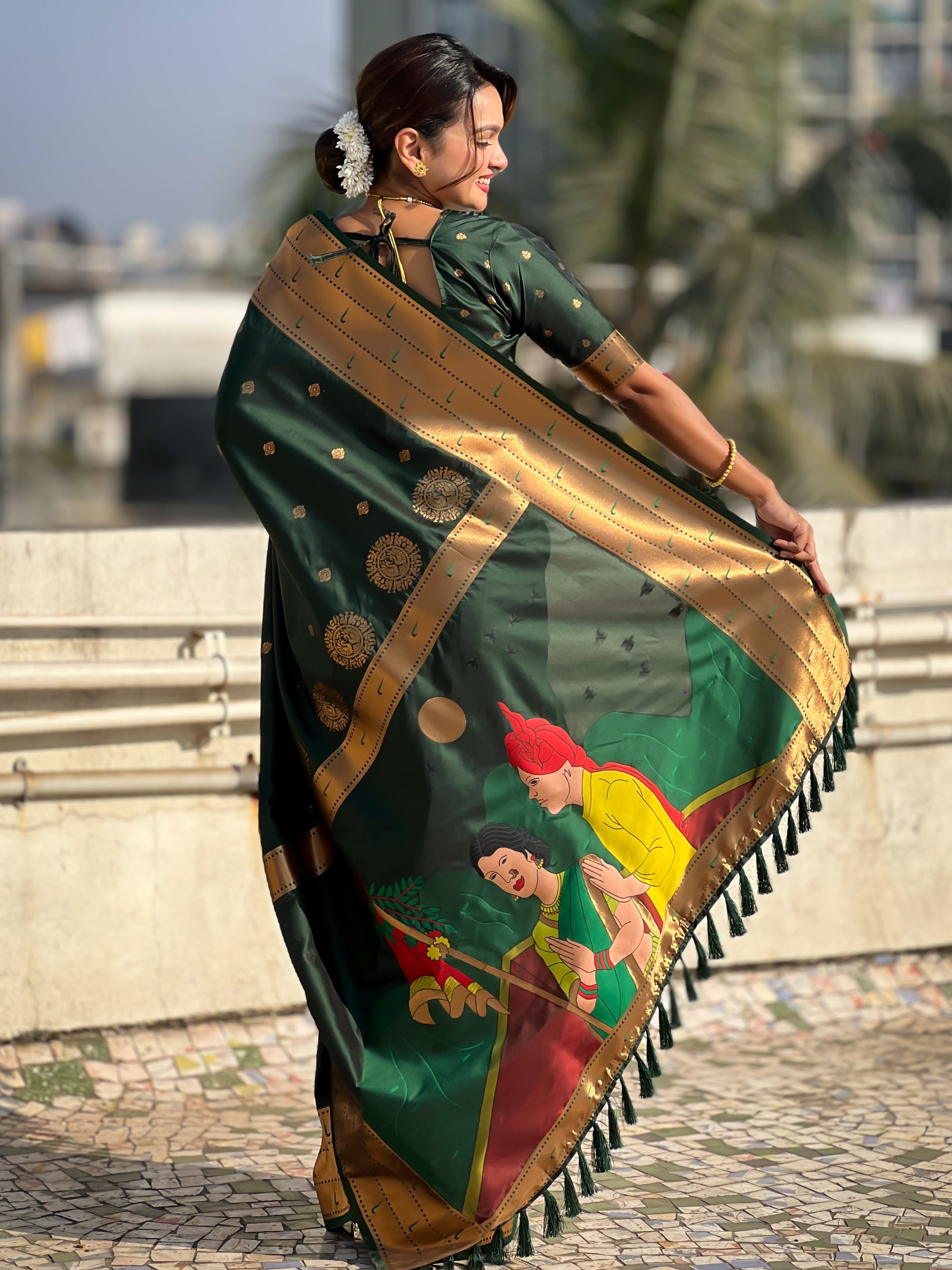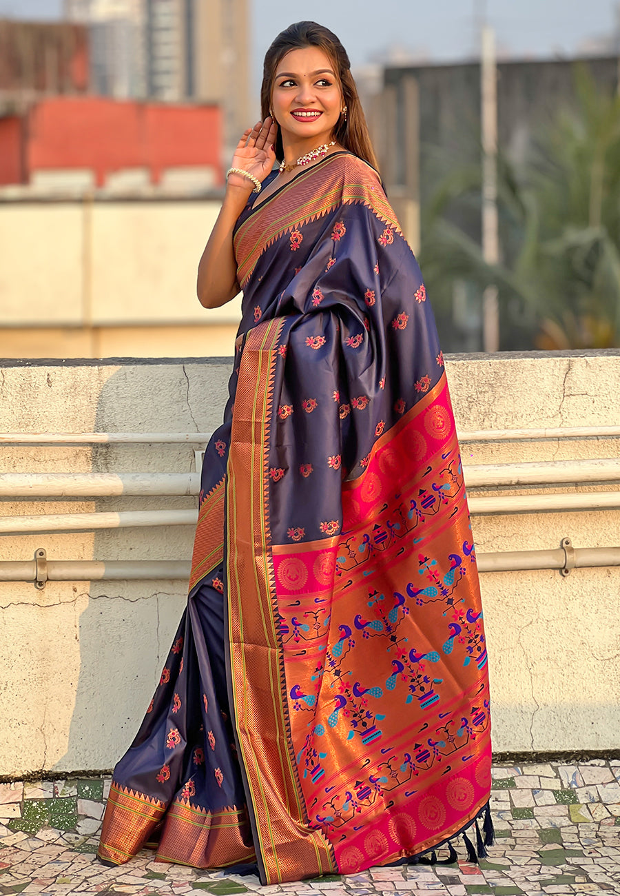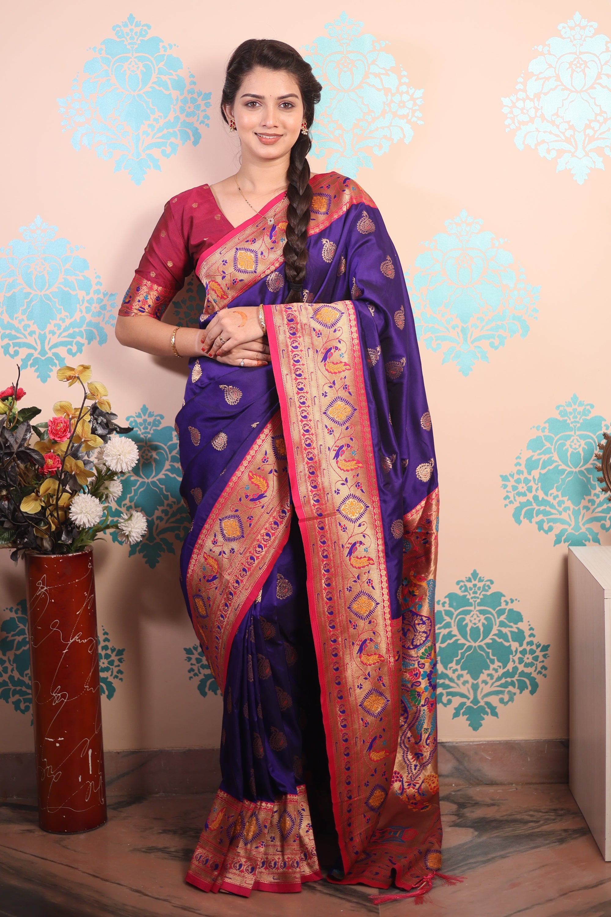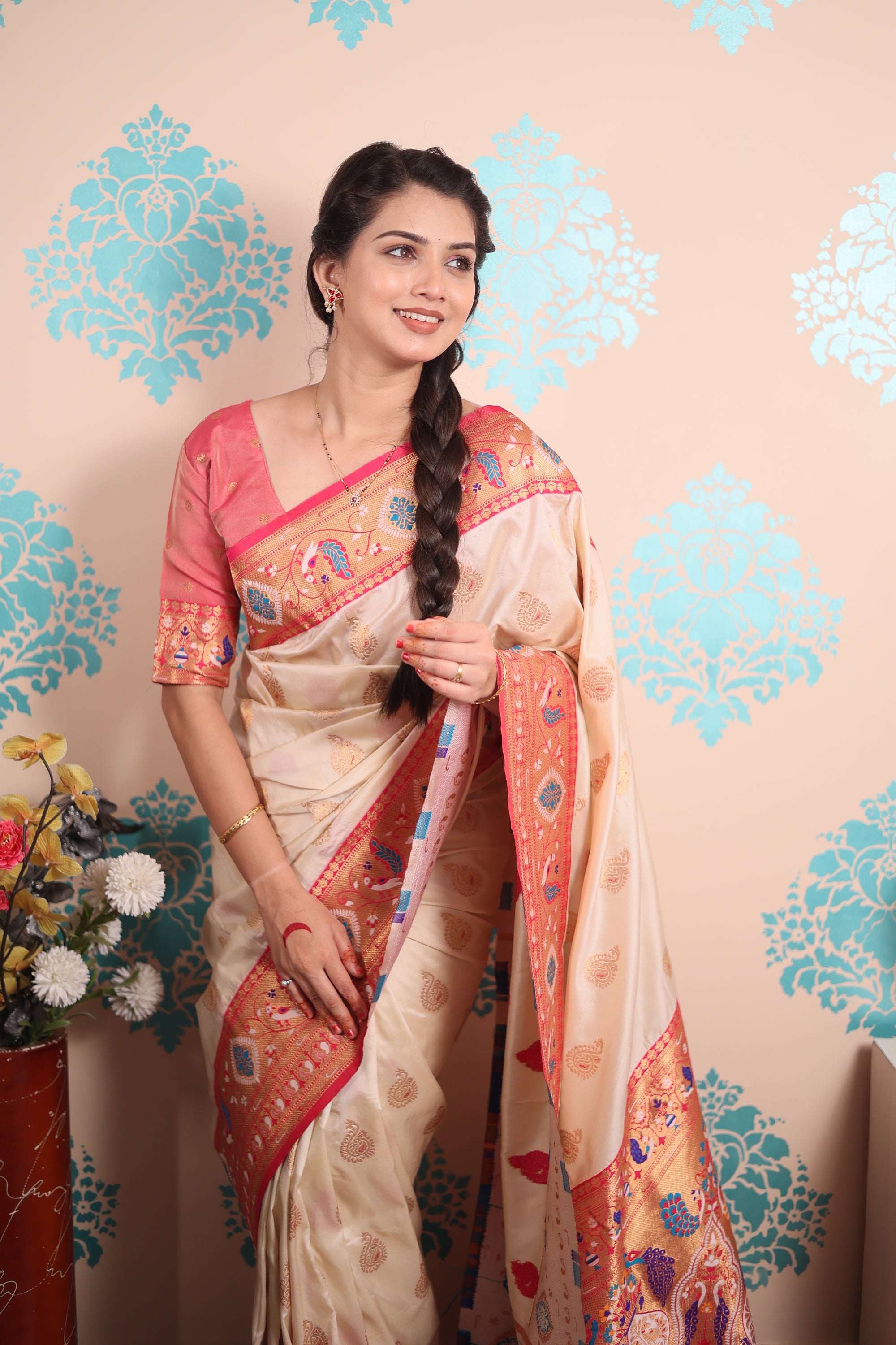 The Paithani saree is a true symbol of grace and heritage, crafted with luxurious silk and vibrant colors. Its intricate zari work, adorned with beautiful peacock and floral motifs, reflects unmatched artistry. A perfect blend of tradition and elegance, it is a treasure that enhances the beauty of every occasion, making every woman feel royal and radiant.
