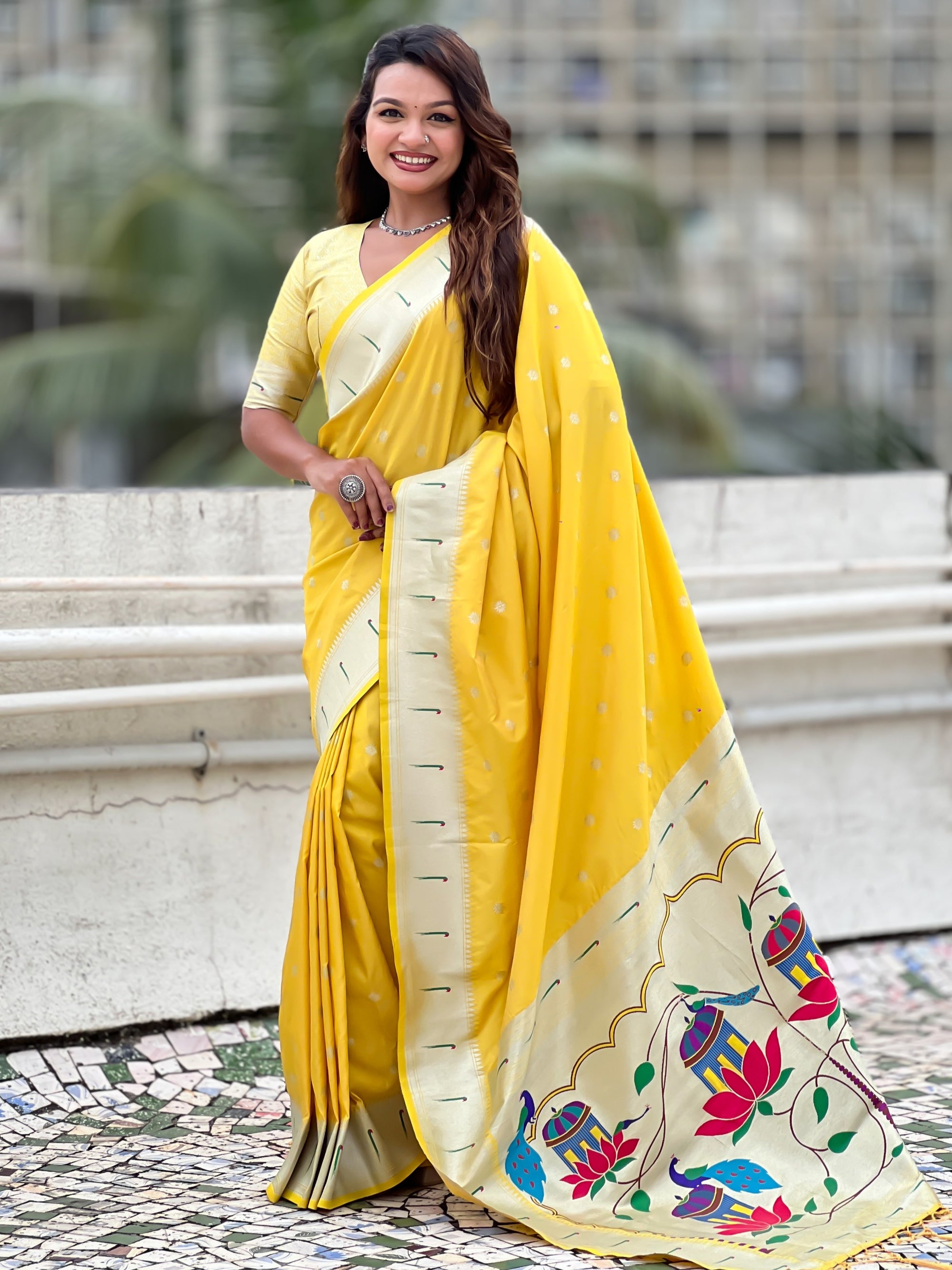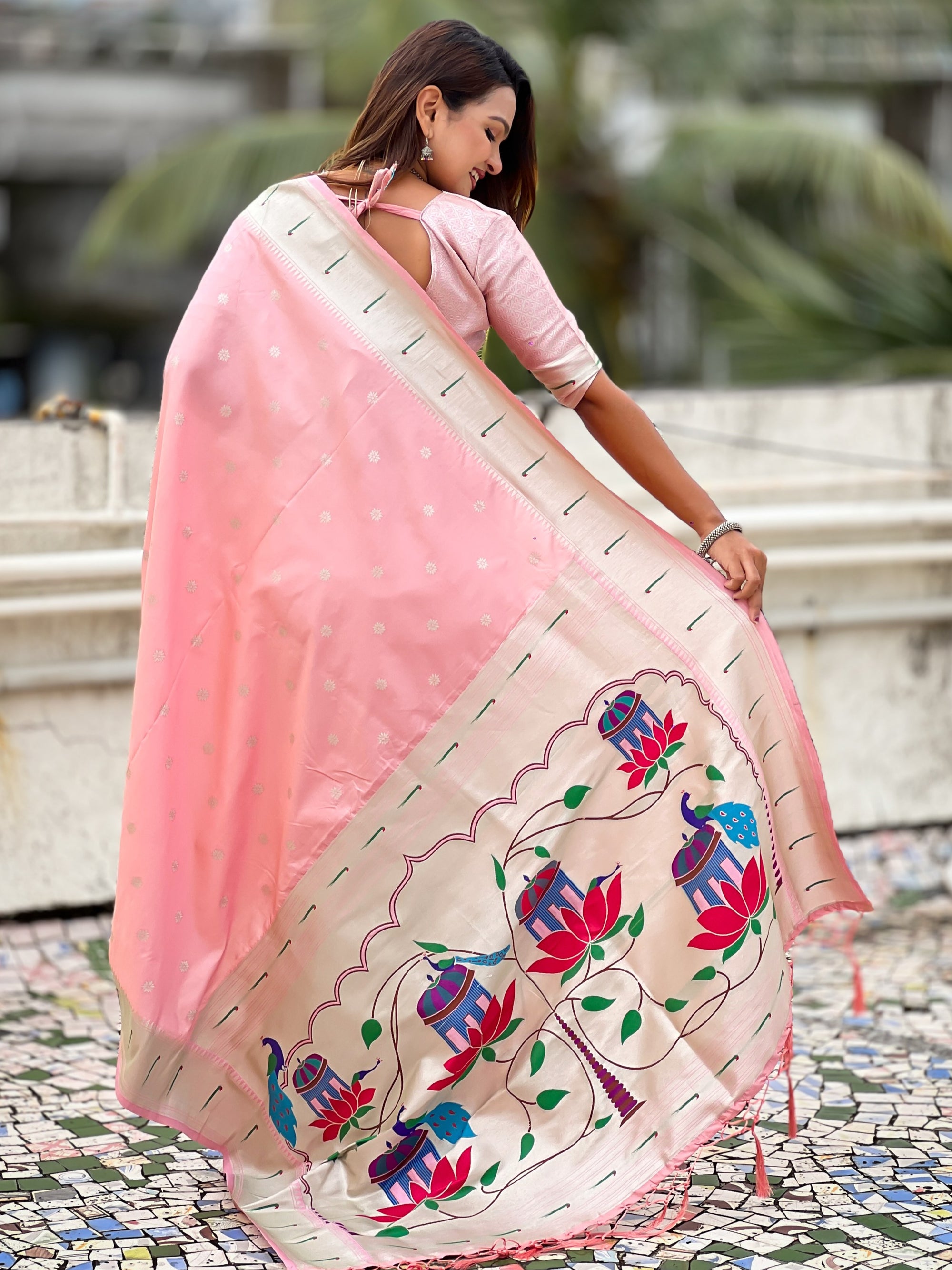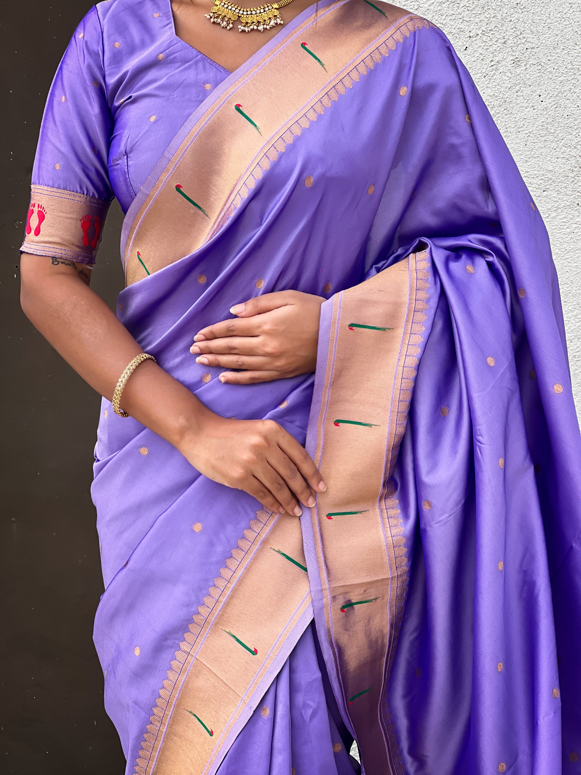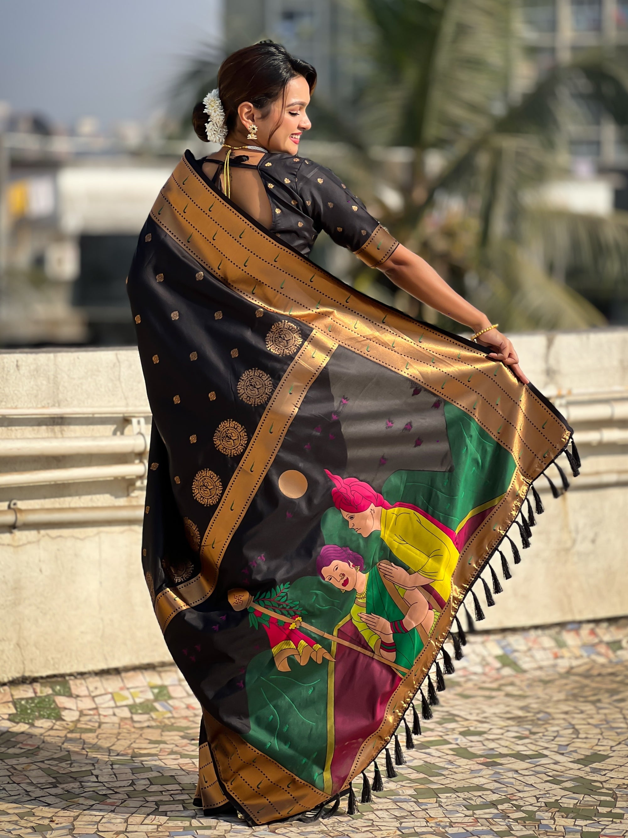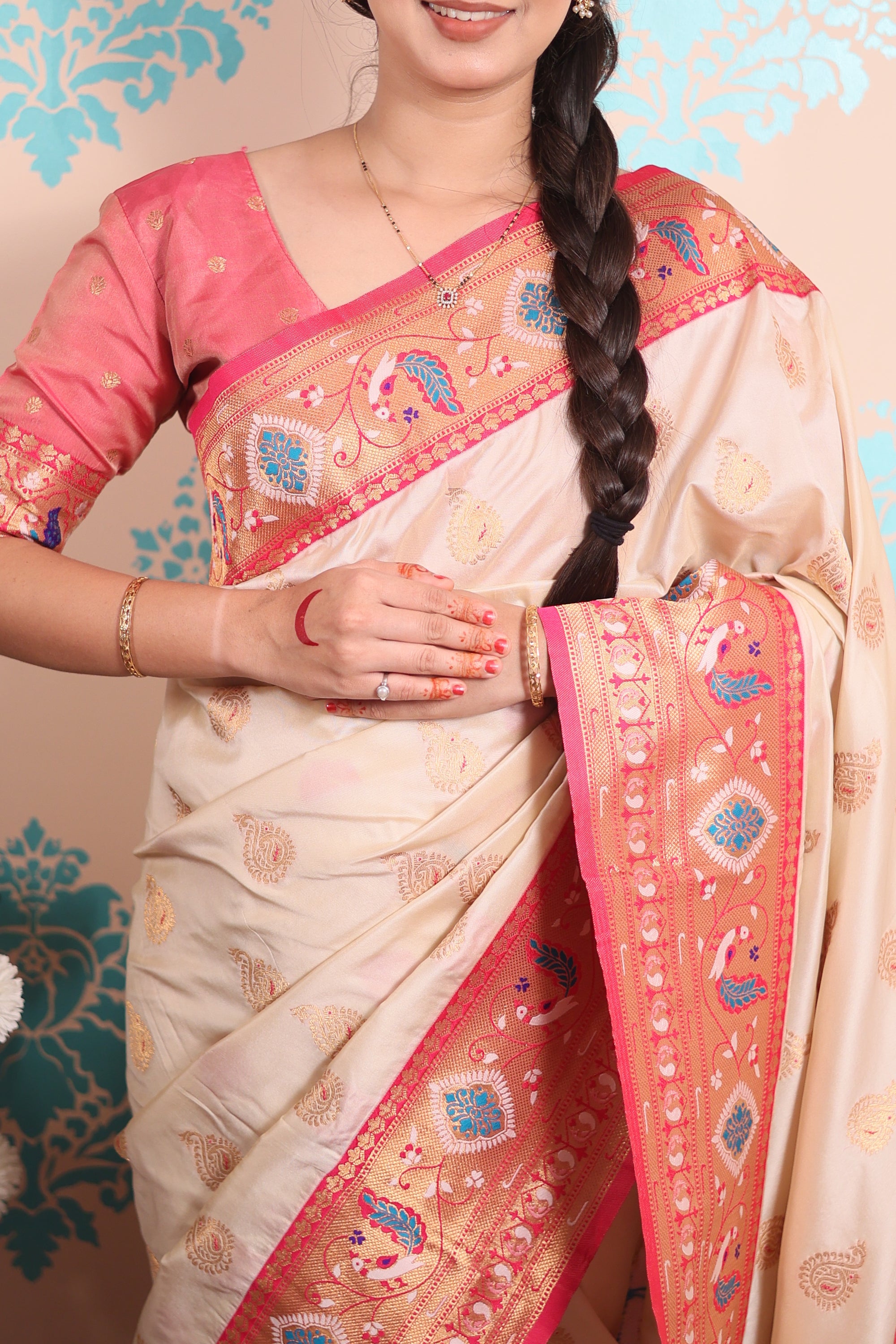 The Paithani saree is a true symbol of grace and heritage, crafted with luxurious silk and vibrant colors. Its intricate zari work, adorned with beautiful peacock and floral motifs, reflects unmatched artistry. A perfect blend of tradition and elegance, it is a treasure that enhances the beauty of every occasion, making every woman feel royal and radiant.