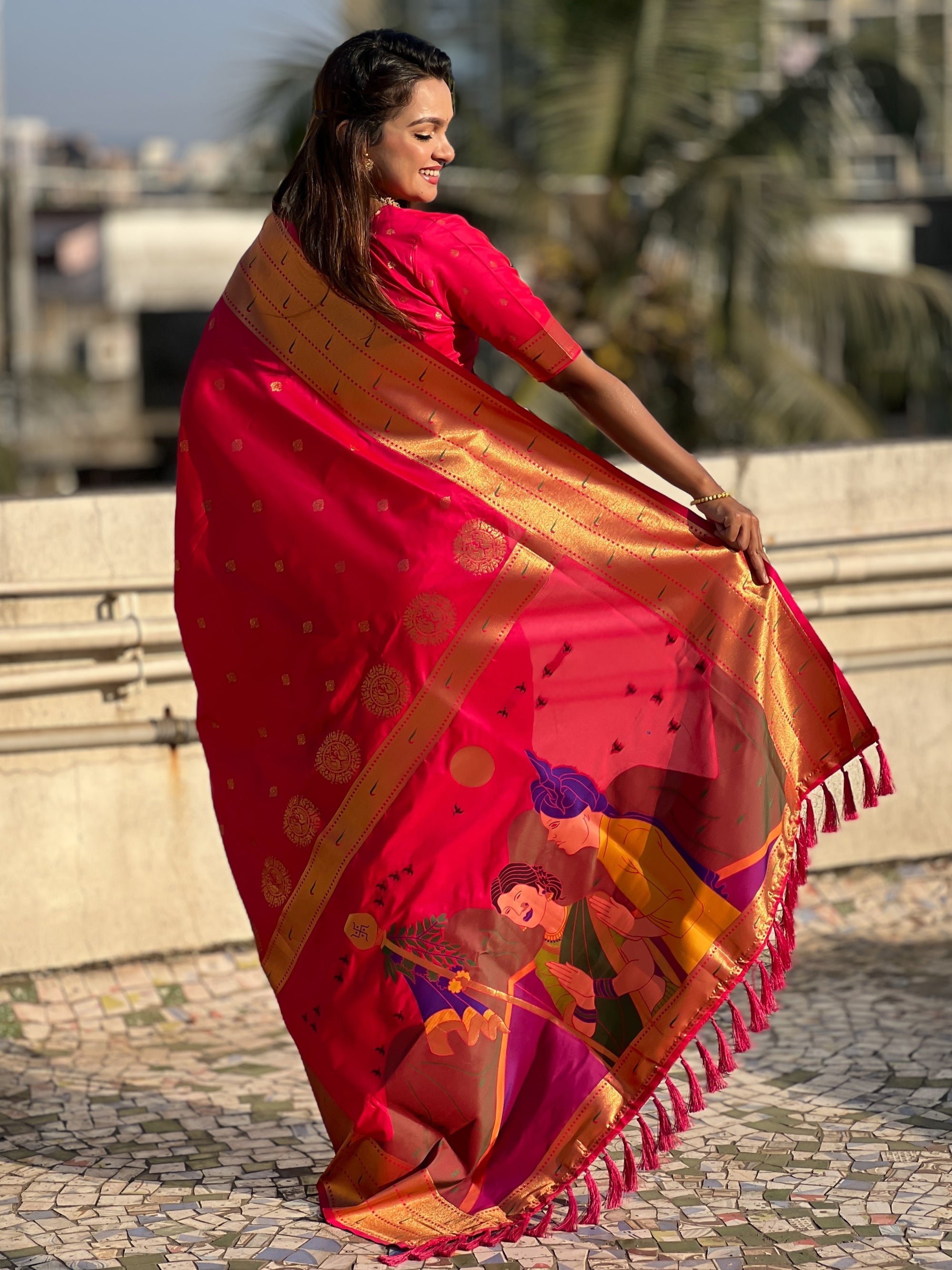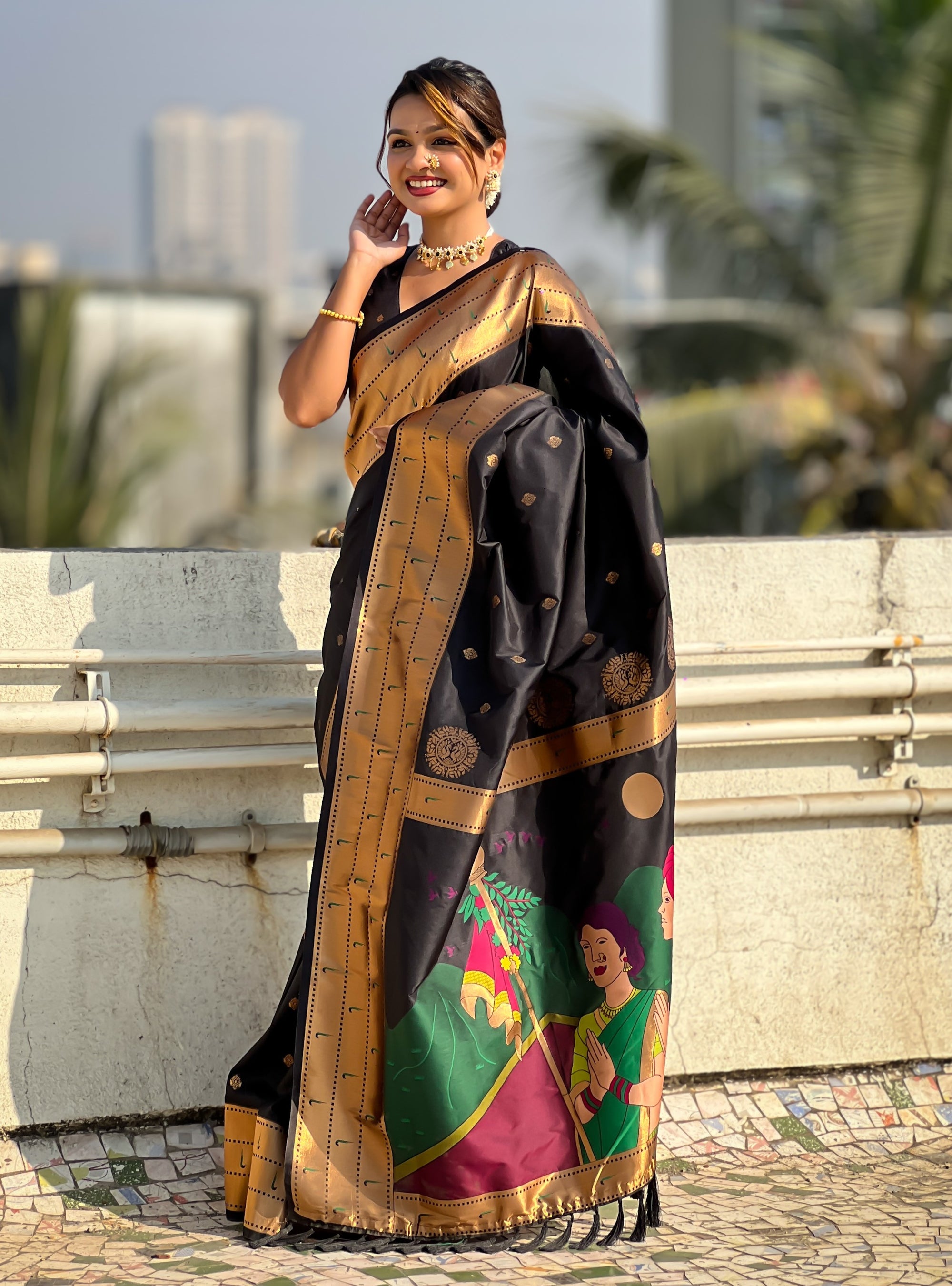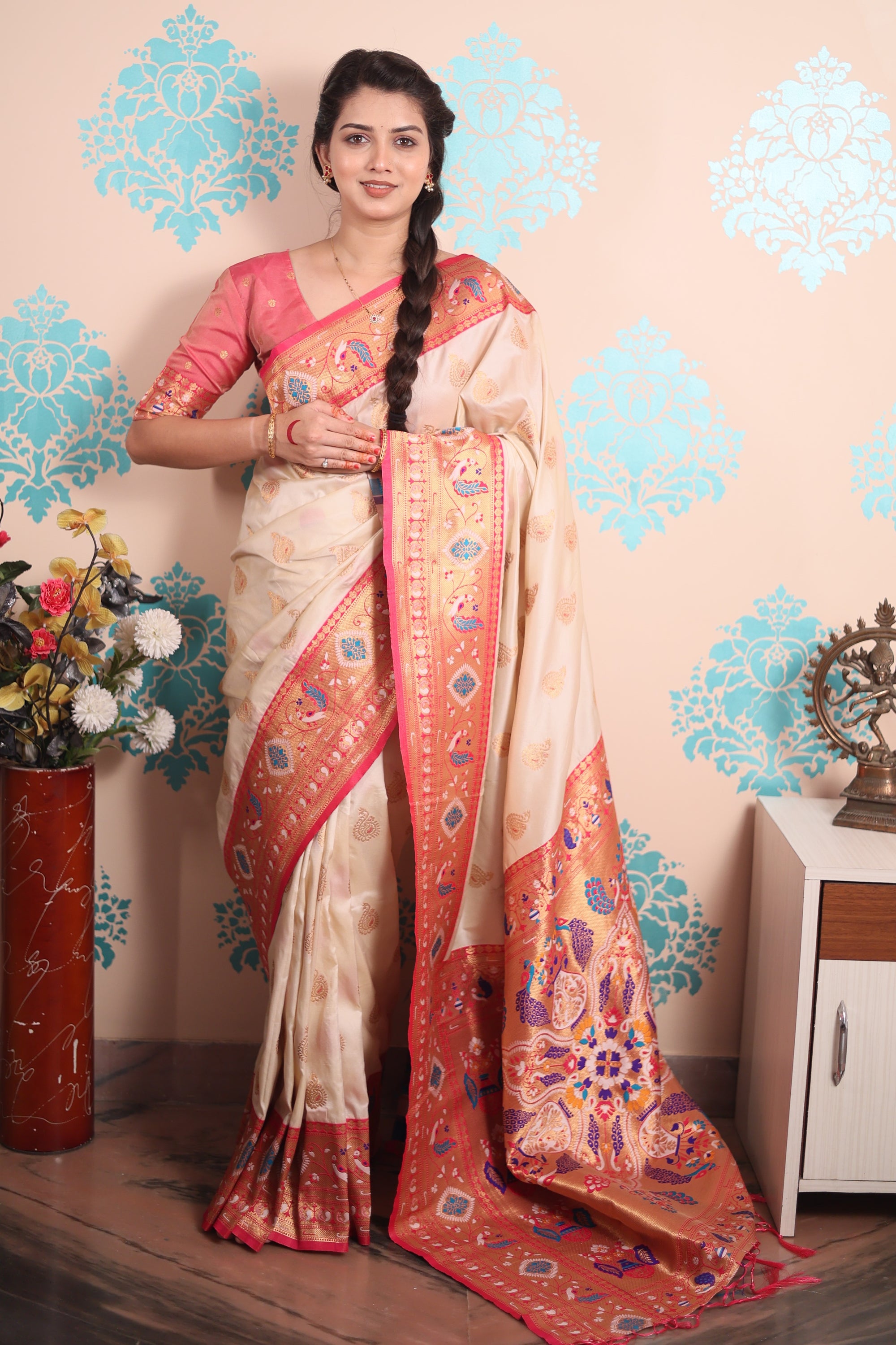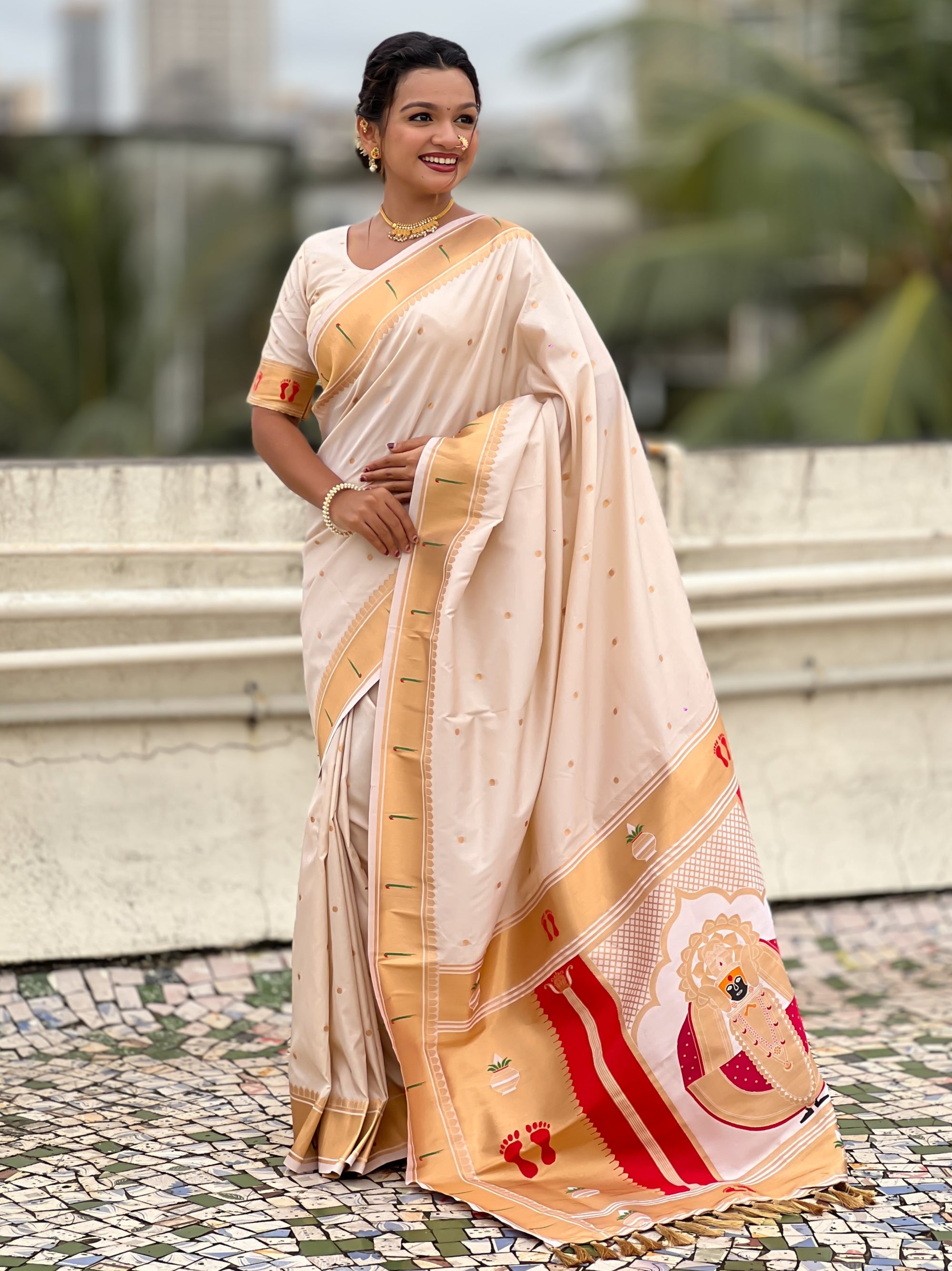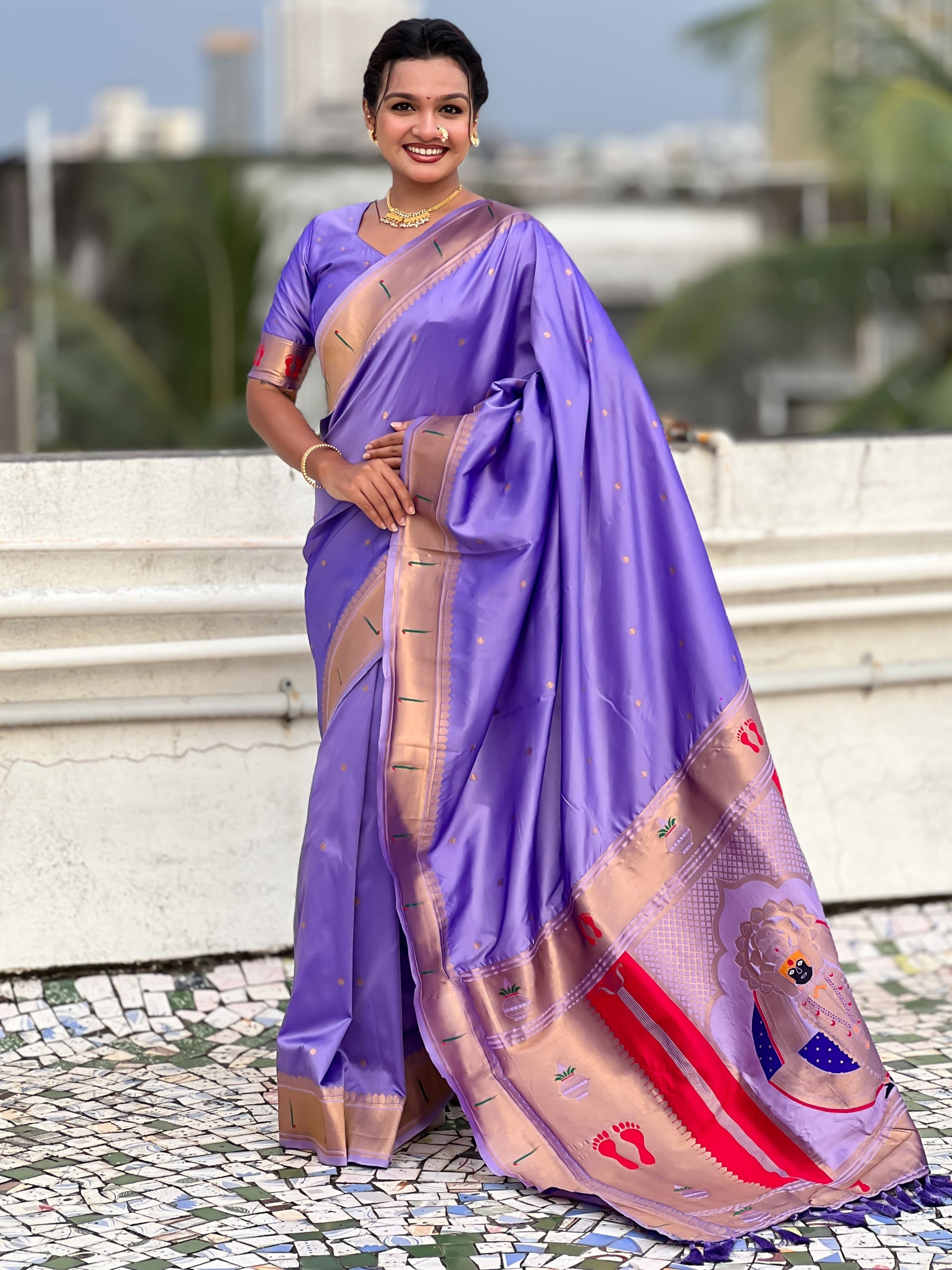 The Paithani saree is a true symbol of grace and heritage, crafted with luxurious silk and vibrant colors. Its intricate zari work, adorned with beautiful peacock and floral motifs, reflects unmatched artistry. A perfect blend of tradition and elegance, it is a treasure that enhances the beauty of every occasion, making every woman feel royal and radiant.