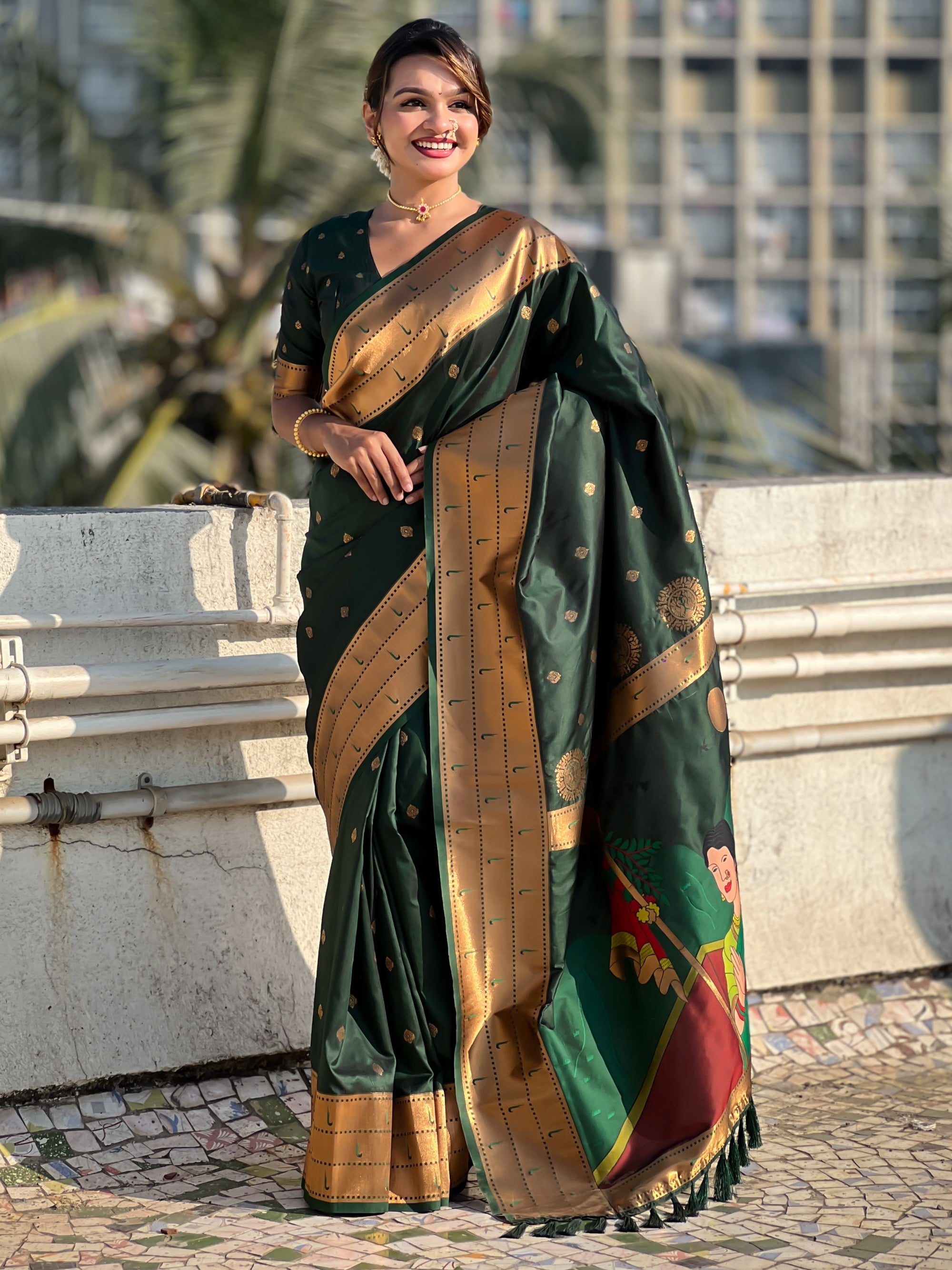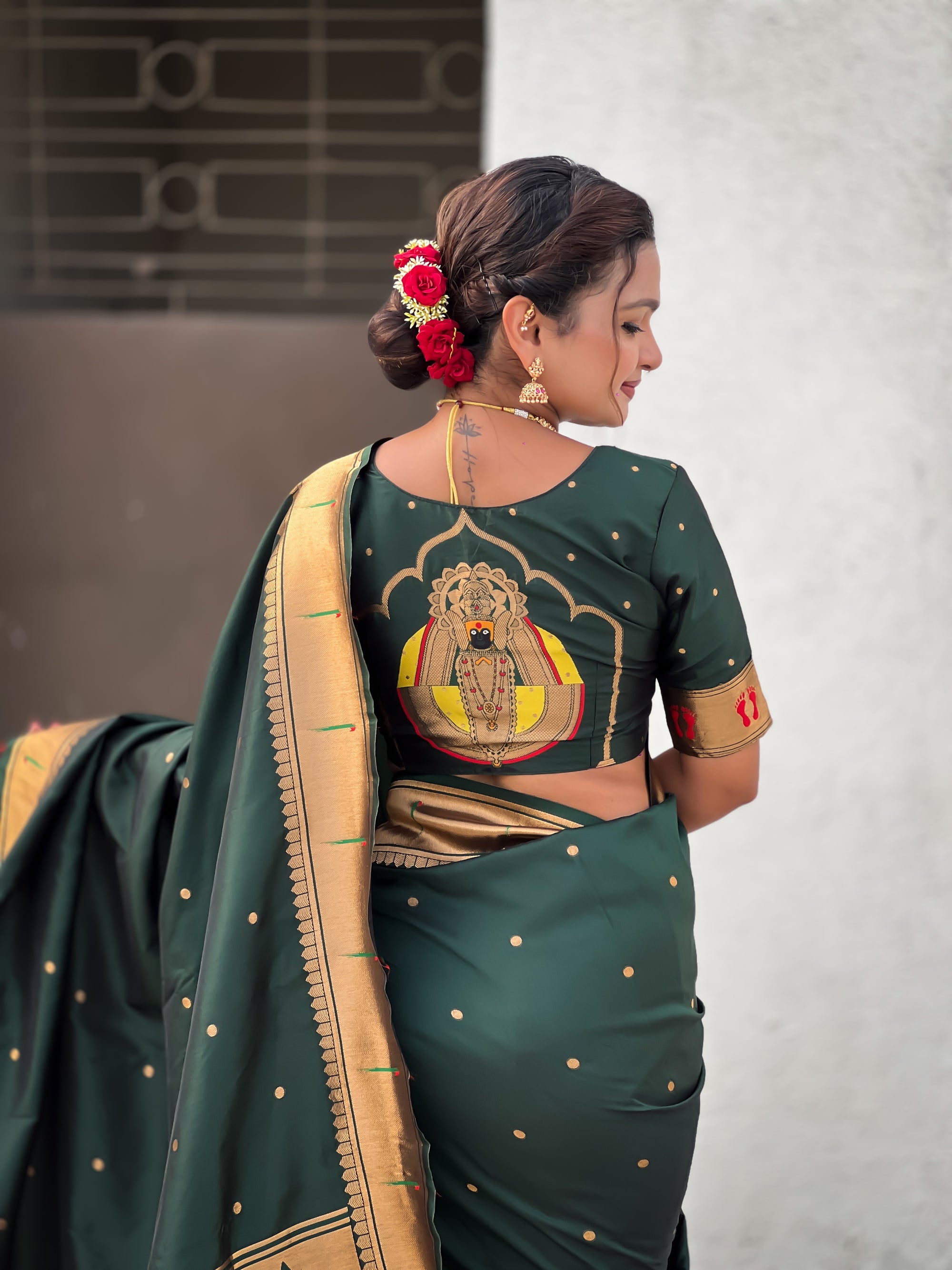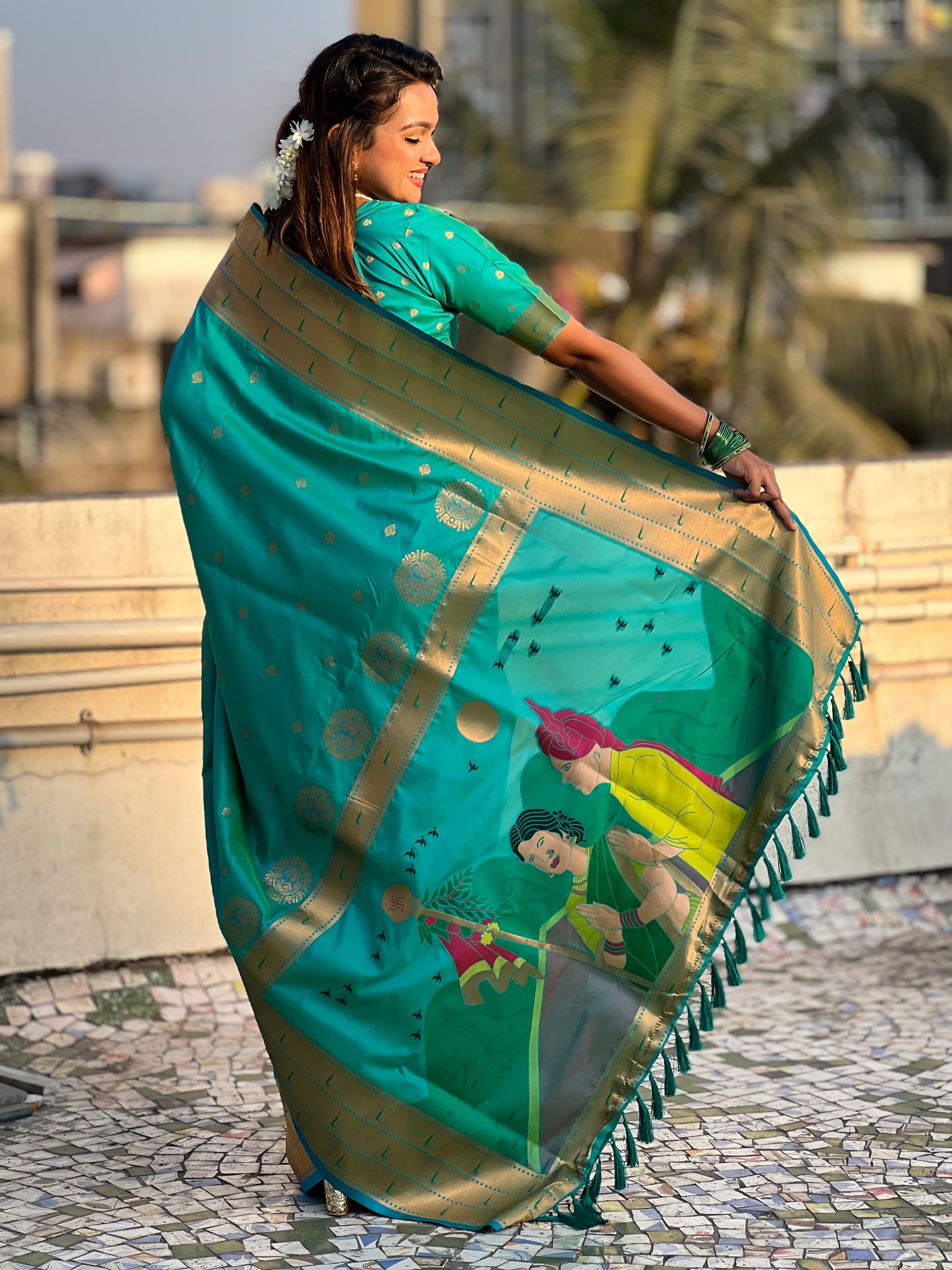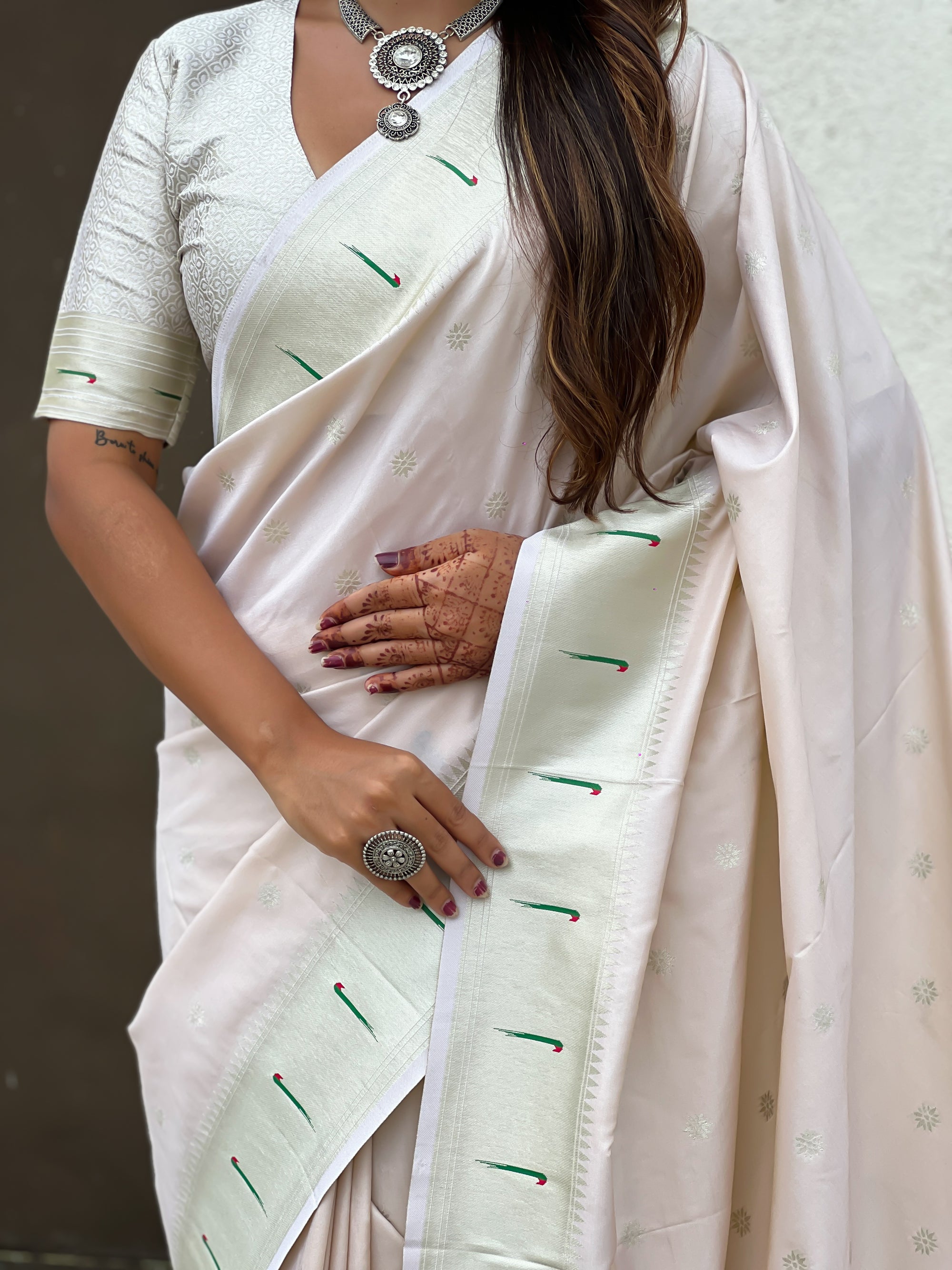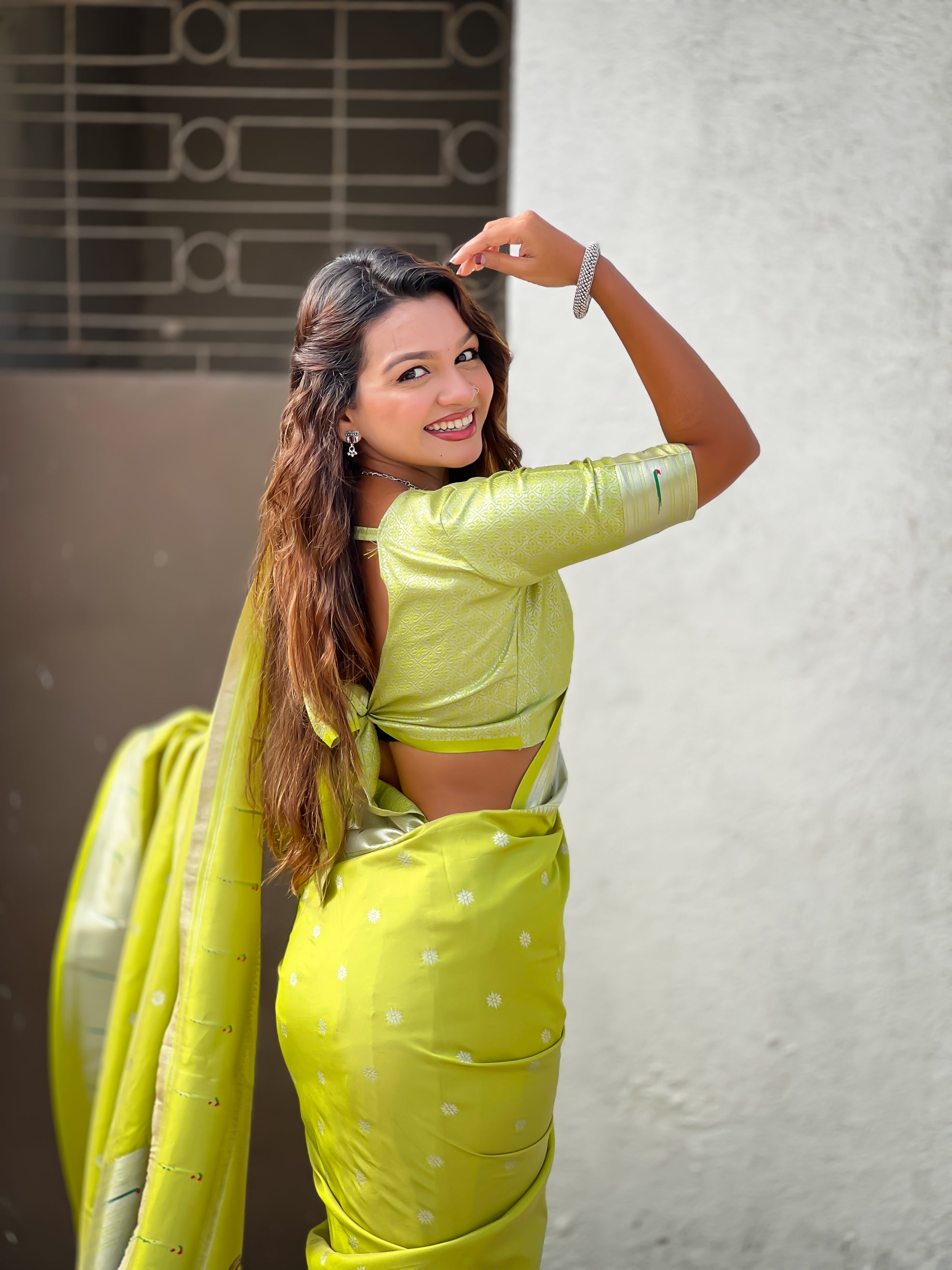 The Paithani saree is a true symbol of grace and heritage, crafted with luxurious silk and vibrant colors. Its intricate zari work, adorned with beautiful peacock and floral motifs, reflects unmatched artistry. A perfect blend of tradition and elegance, it is a treasure that enhances the beauty of every occasion, making every woman feel royal and radiant.