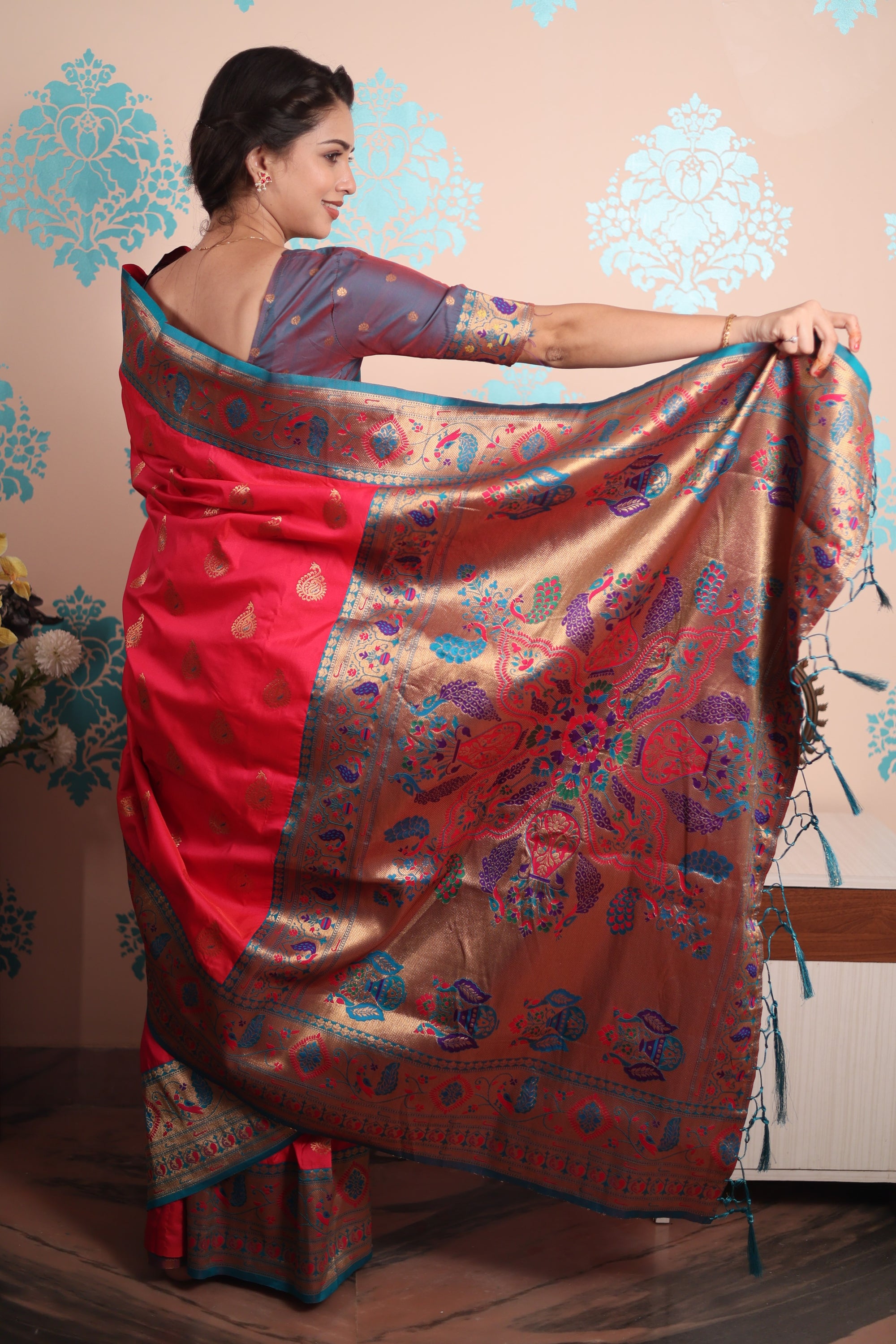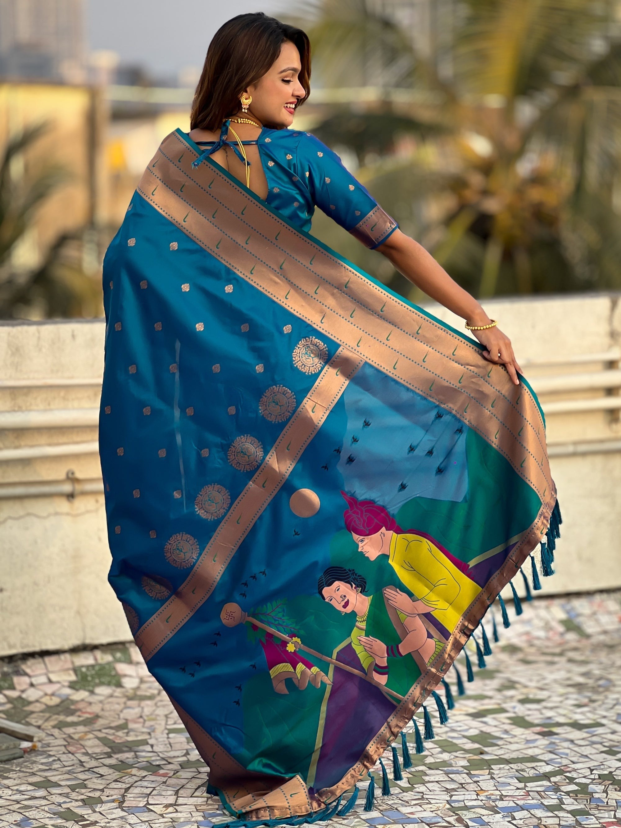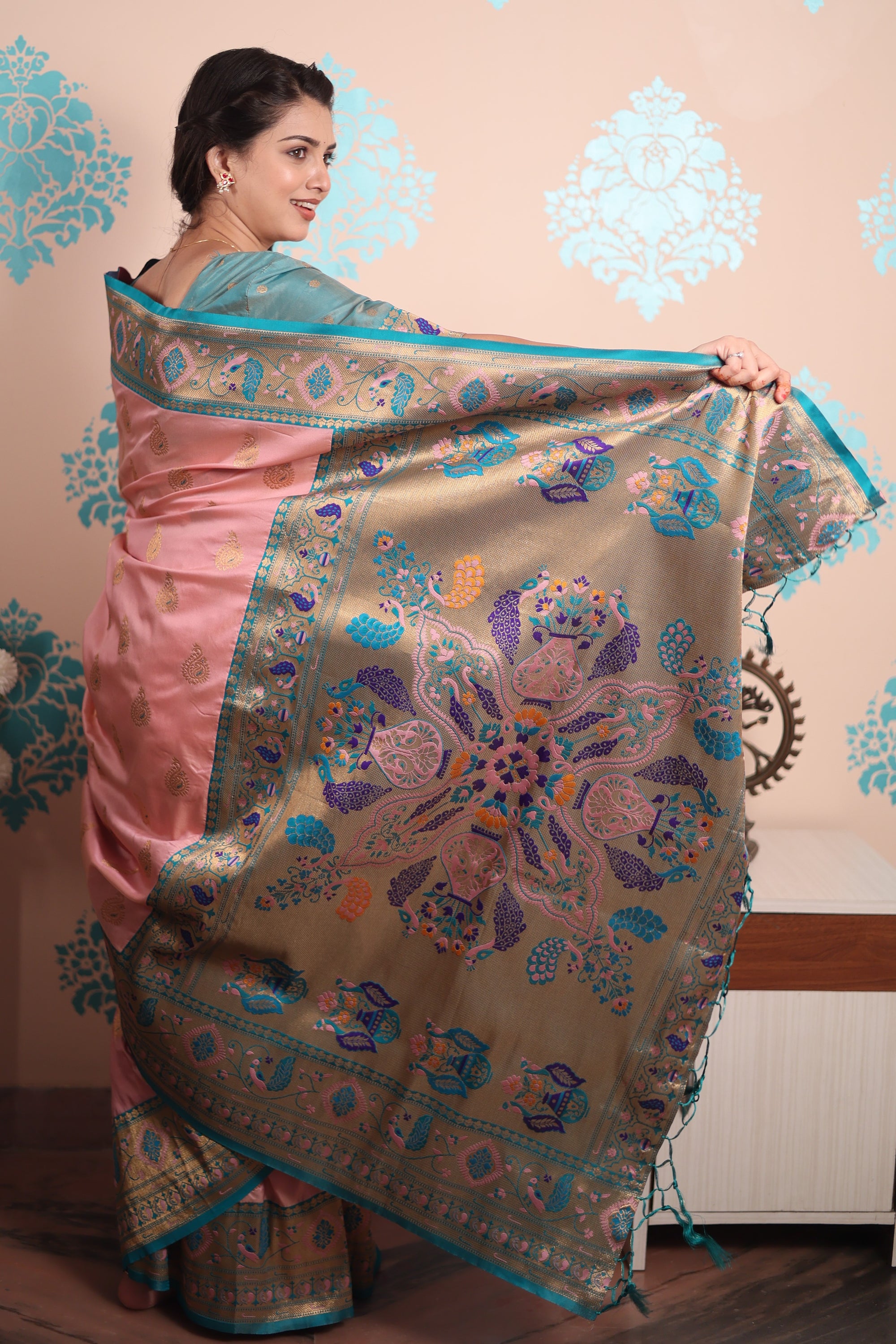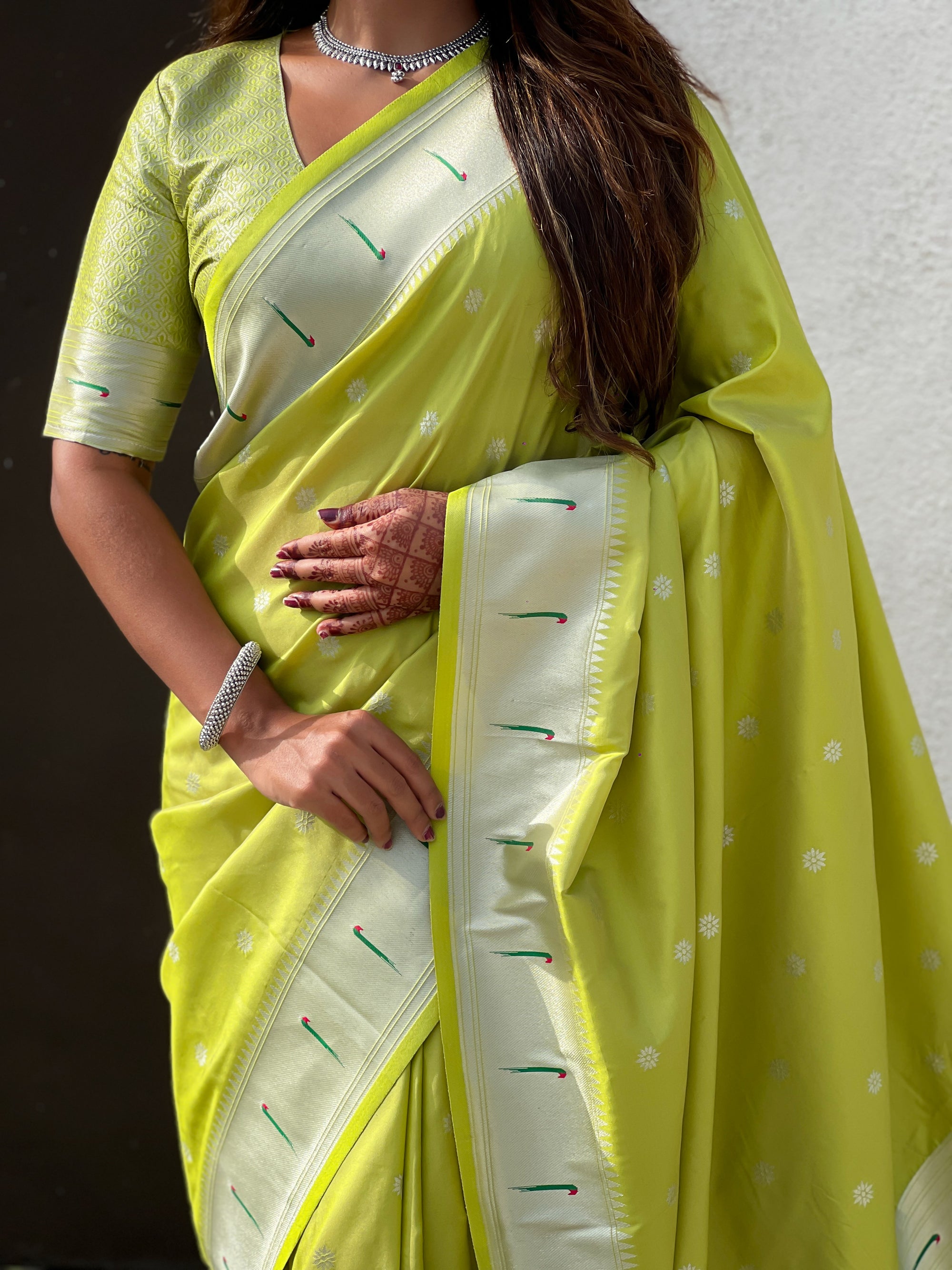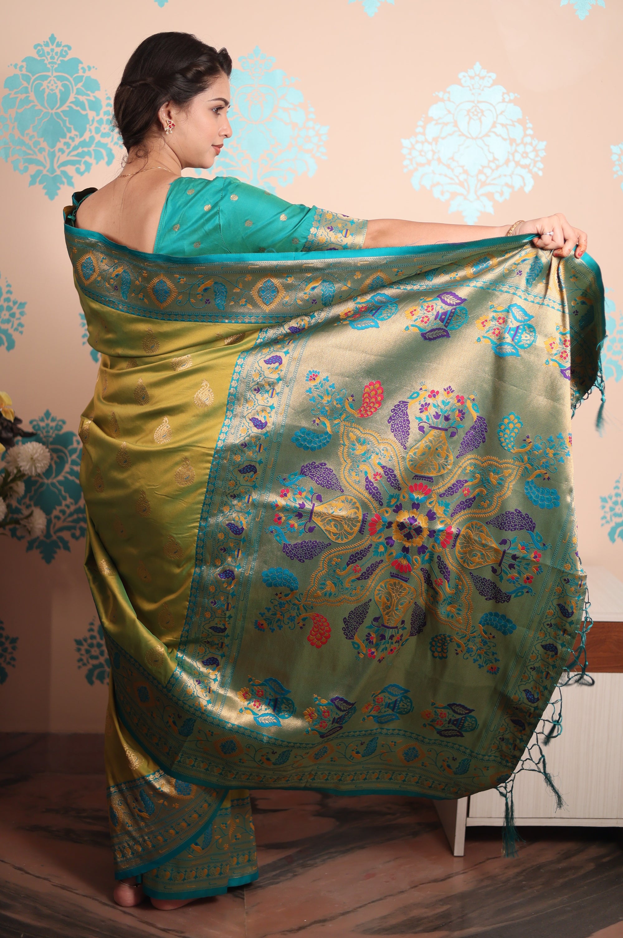 The Paithani saree is a true symbol of grace and heritage, crafted with luxurious silk and vibrant colors. Its intricate zari work, adorned with beautiful peacock and floral motifs, reflects unmatched artistry. A perfect blend of tradition and elegance, it is a treasure that enhances the beauty of every occasion, making every woman feel royal and radiant.