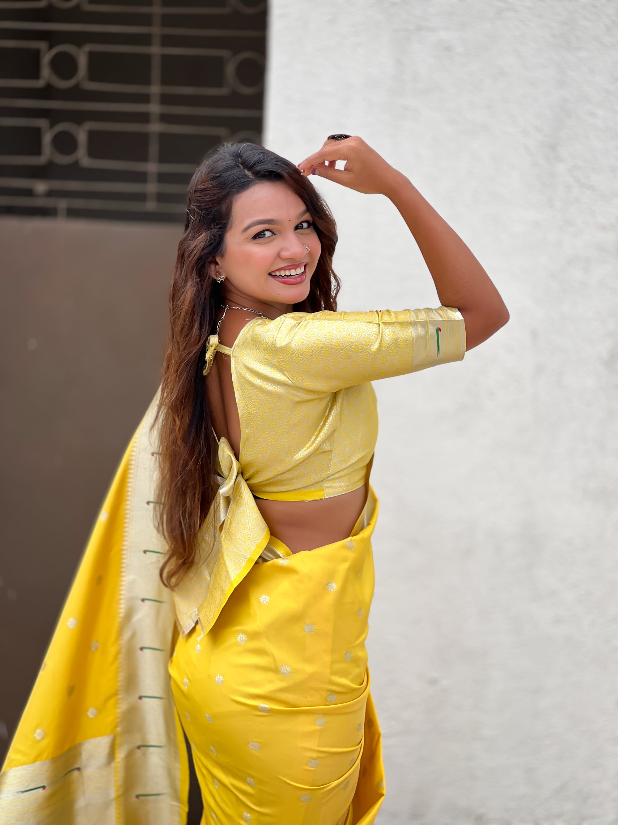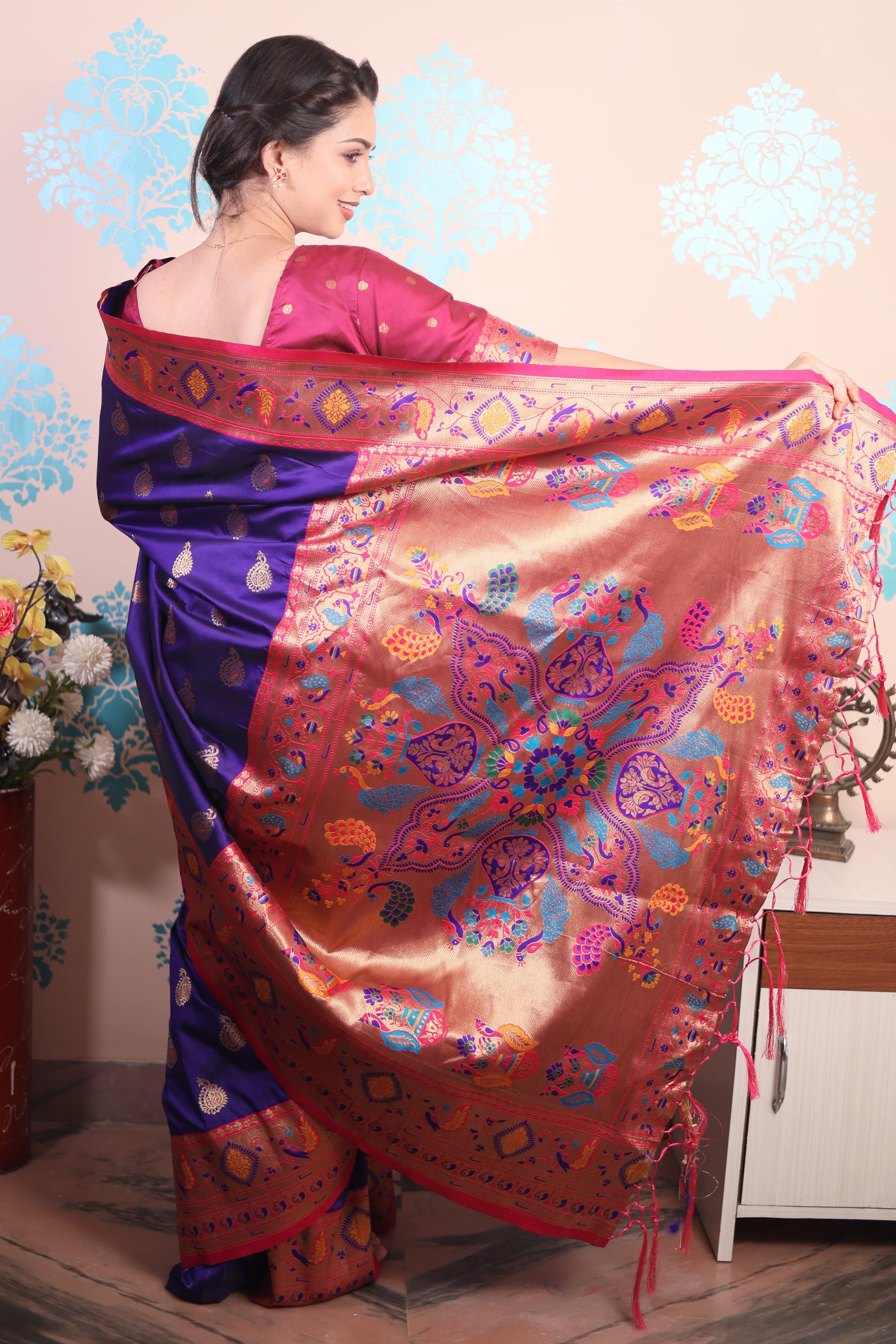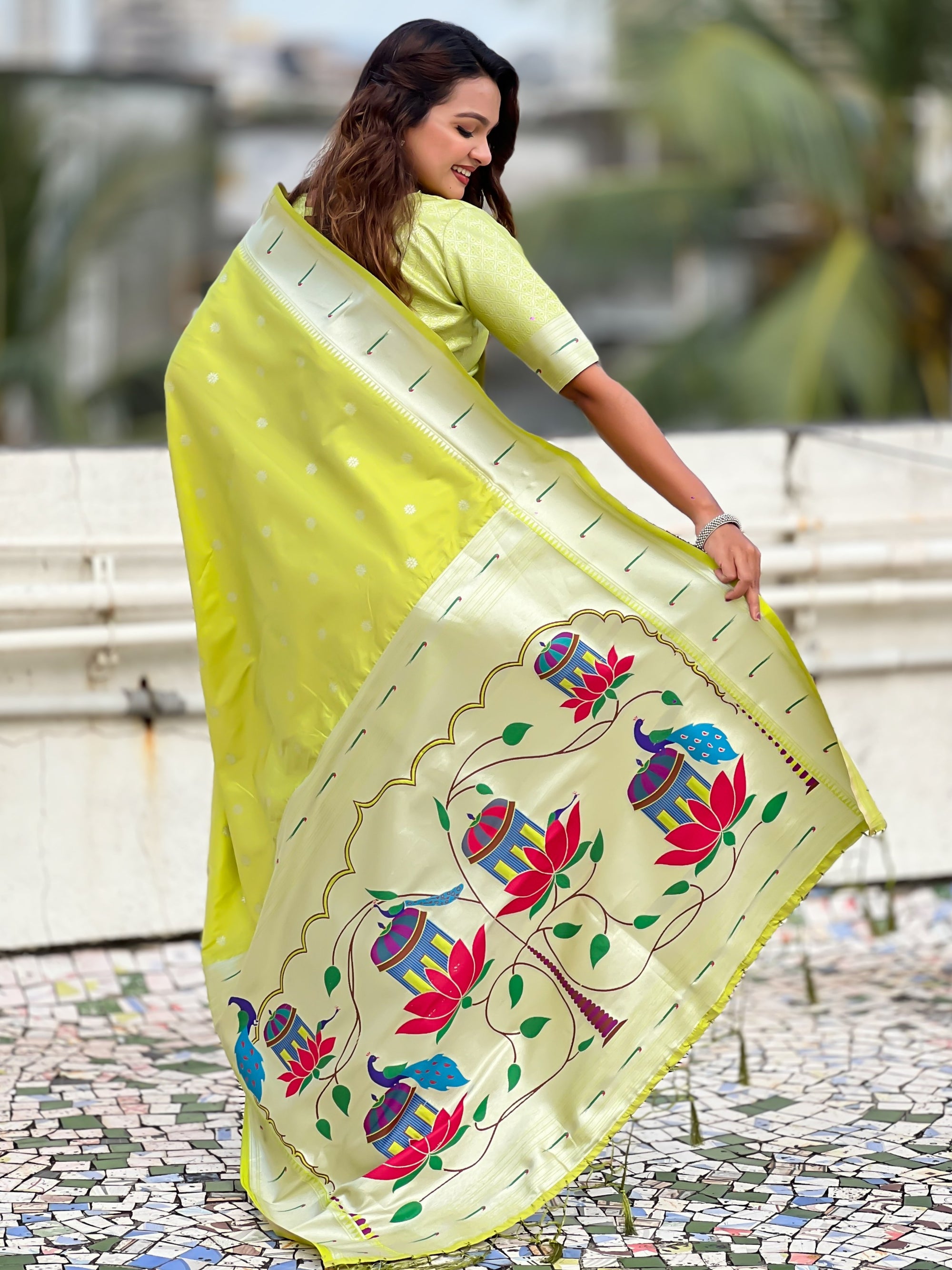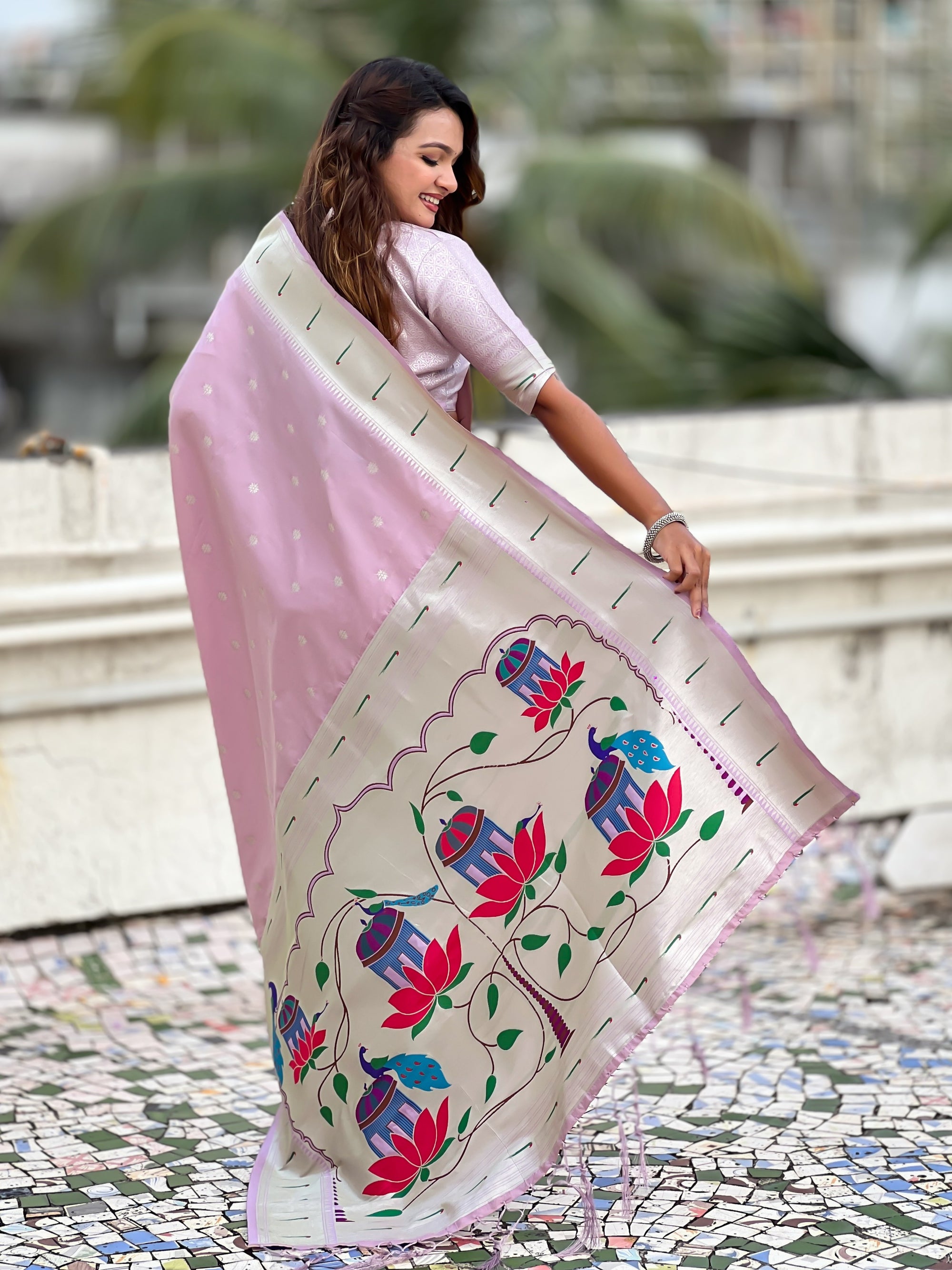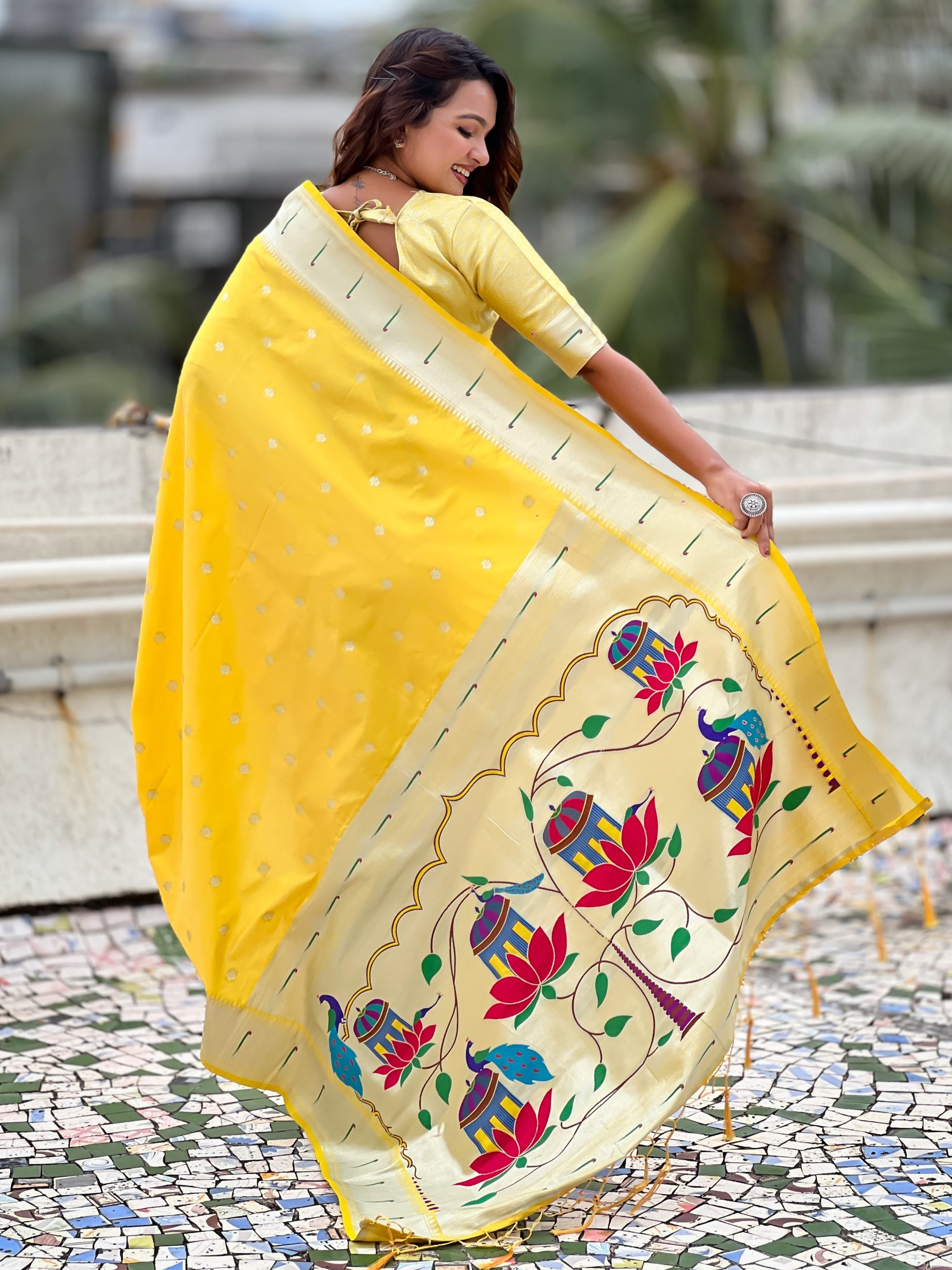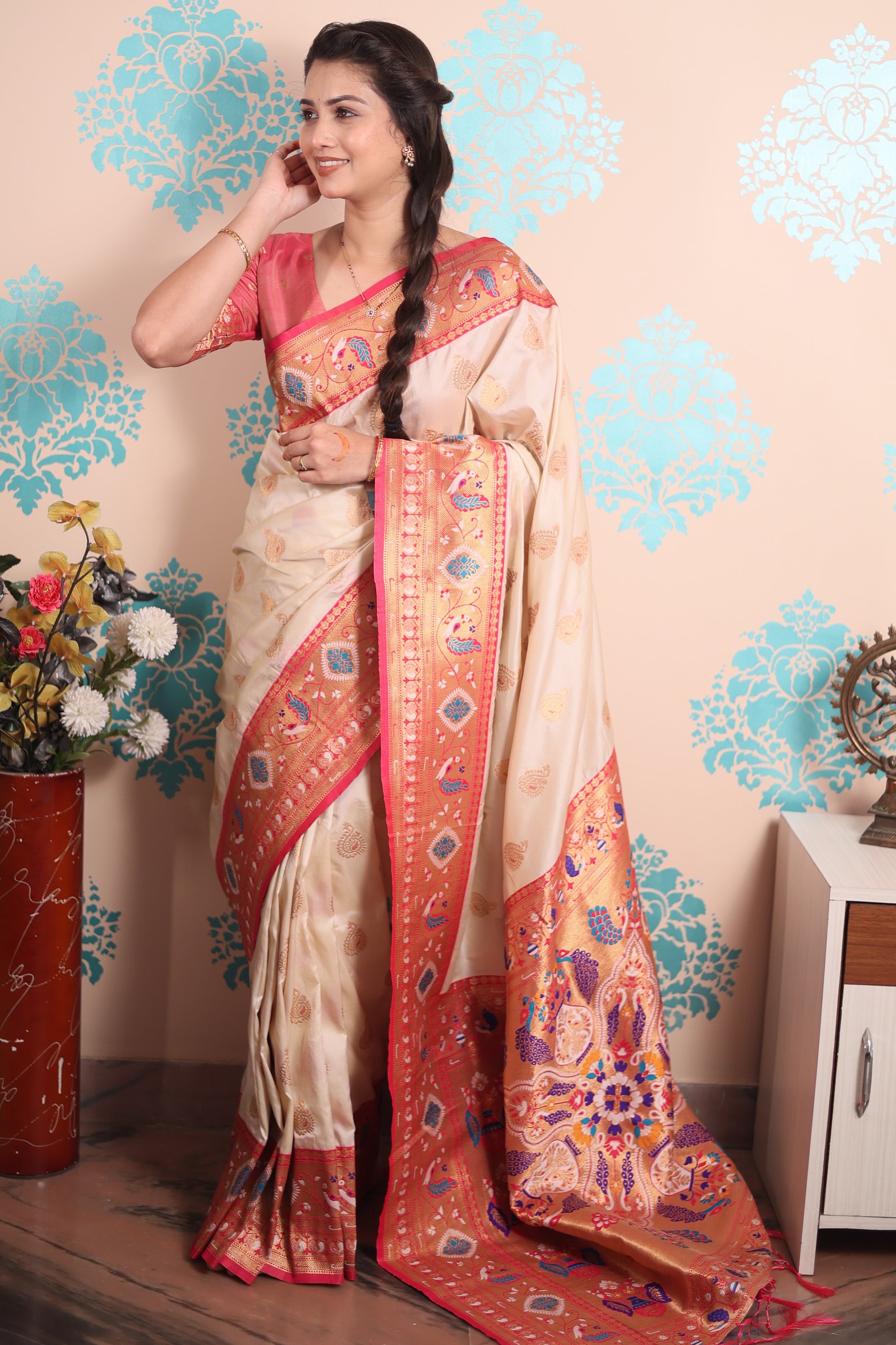 The Paithani saree is a true symbol of grace and heritage, crafted with luxurious silk and vibrant colors. Its intricate zari work, adorned with beautiful peacock and floral motifs, reflects unmatched artistry. A perfect blend of tradition and elegance, it is a treasure that enhances the beauty of every occasion, making every woman feel royal and radiant.