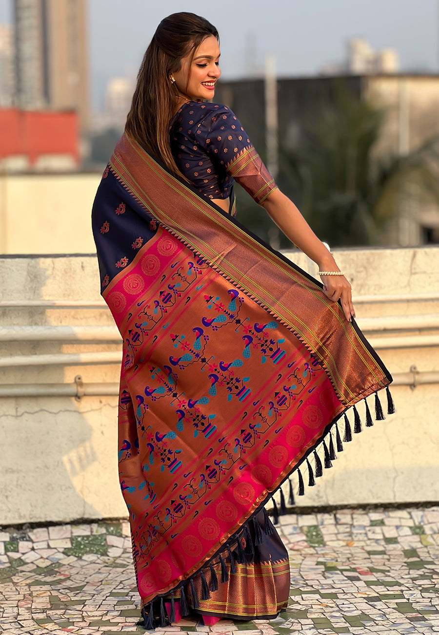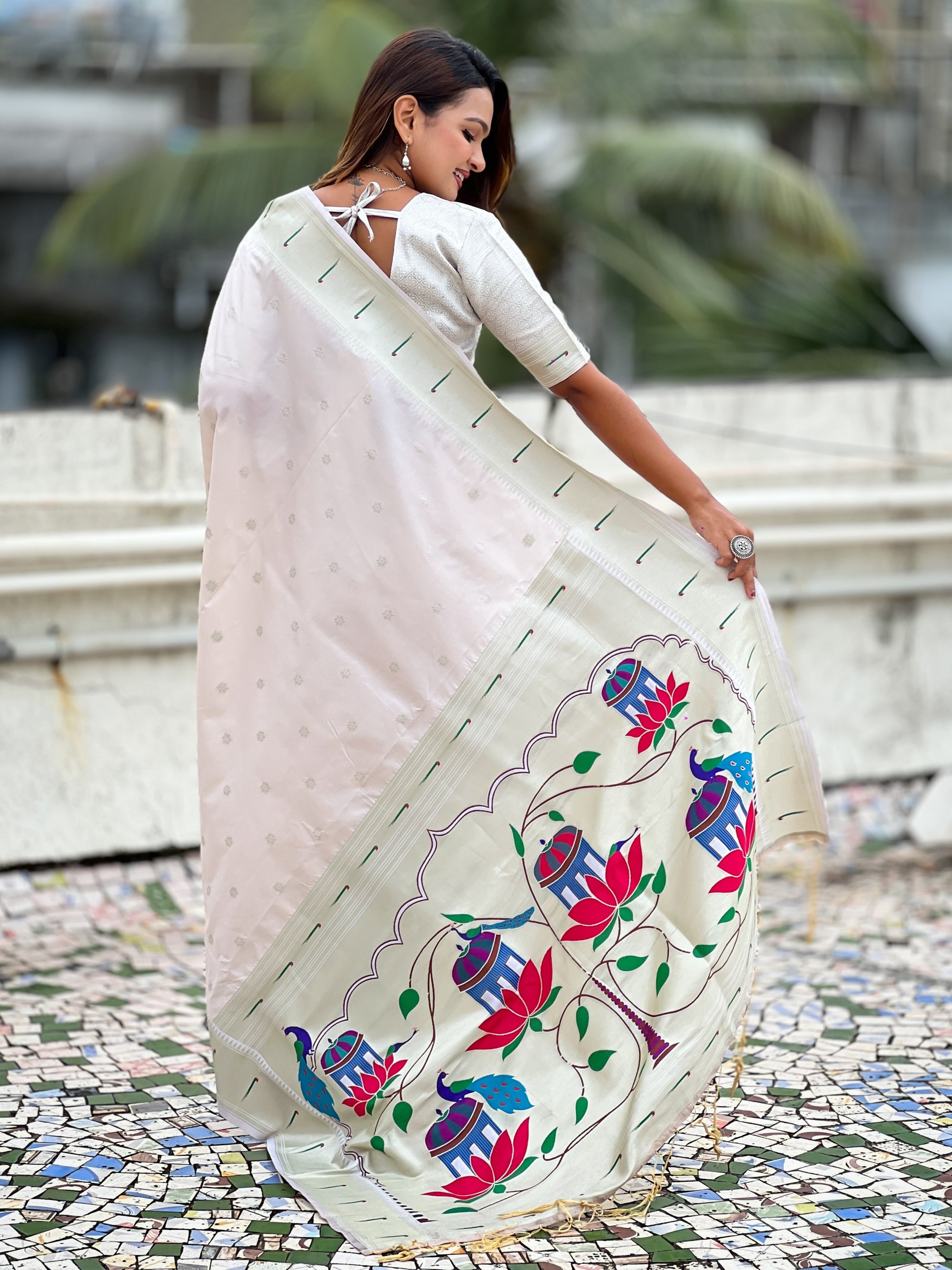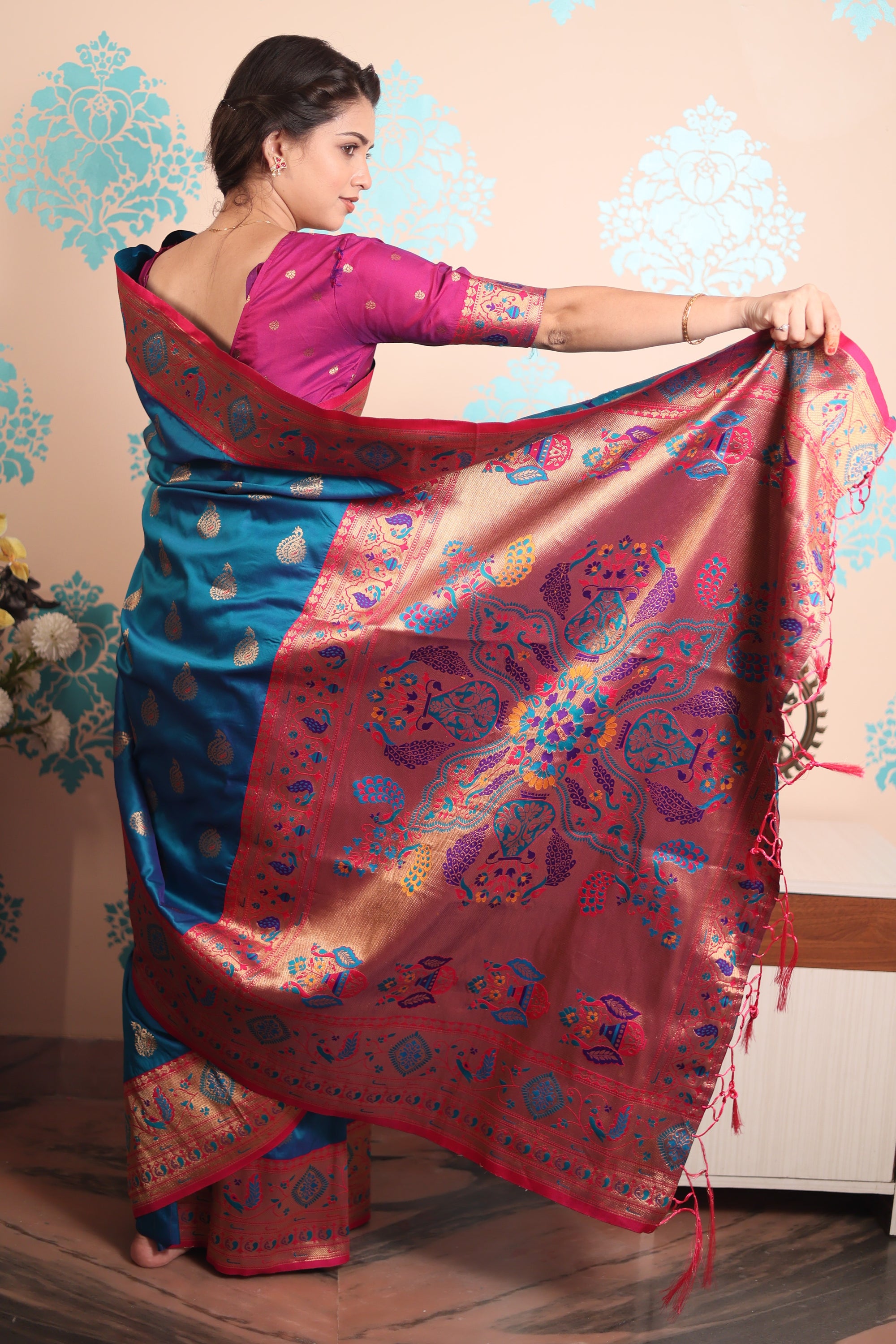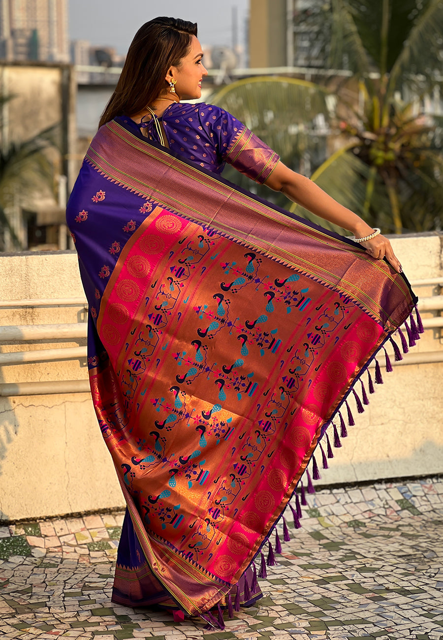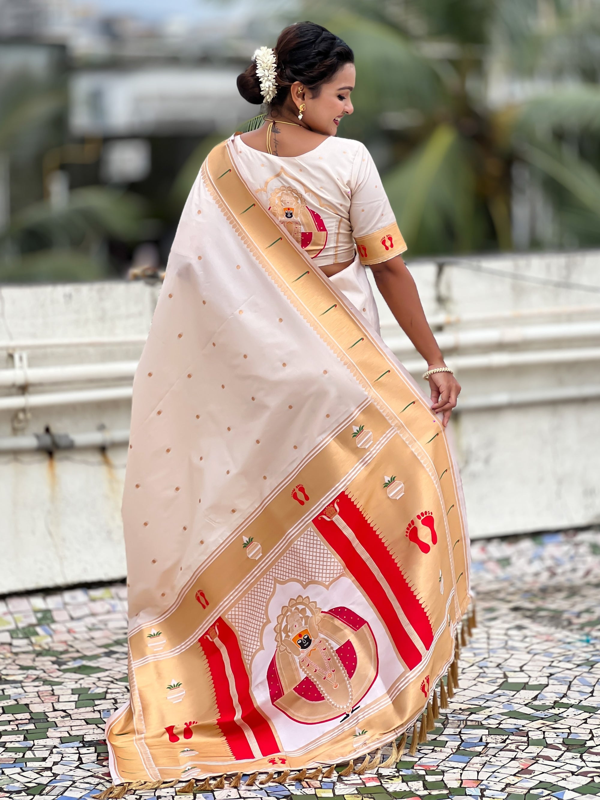 The Paithani saree is a true symbol of grace and heritage, crafted with luxurious silk and vibrant colors. Its intricate zari work, adorned with beautiful peacock and floral motifs, reflects unmatched artistry. A perfect blend of tradition and elegance, it is a treasure that enhances the beauty of every occasion, making every woman feel royal and radiant.
