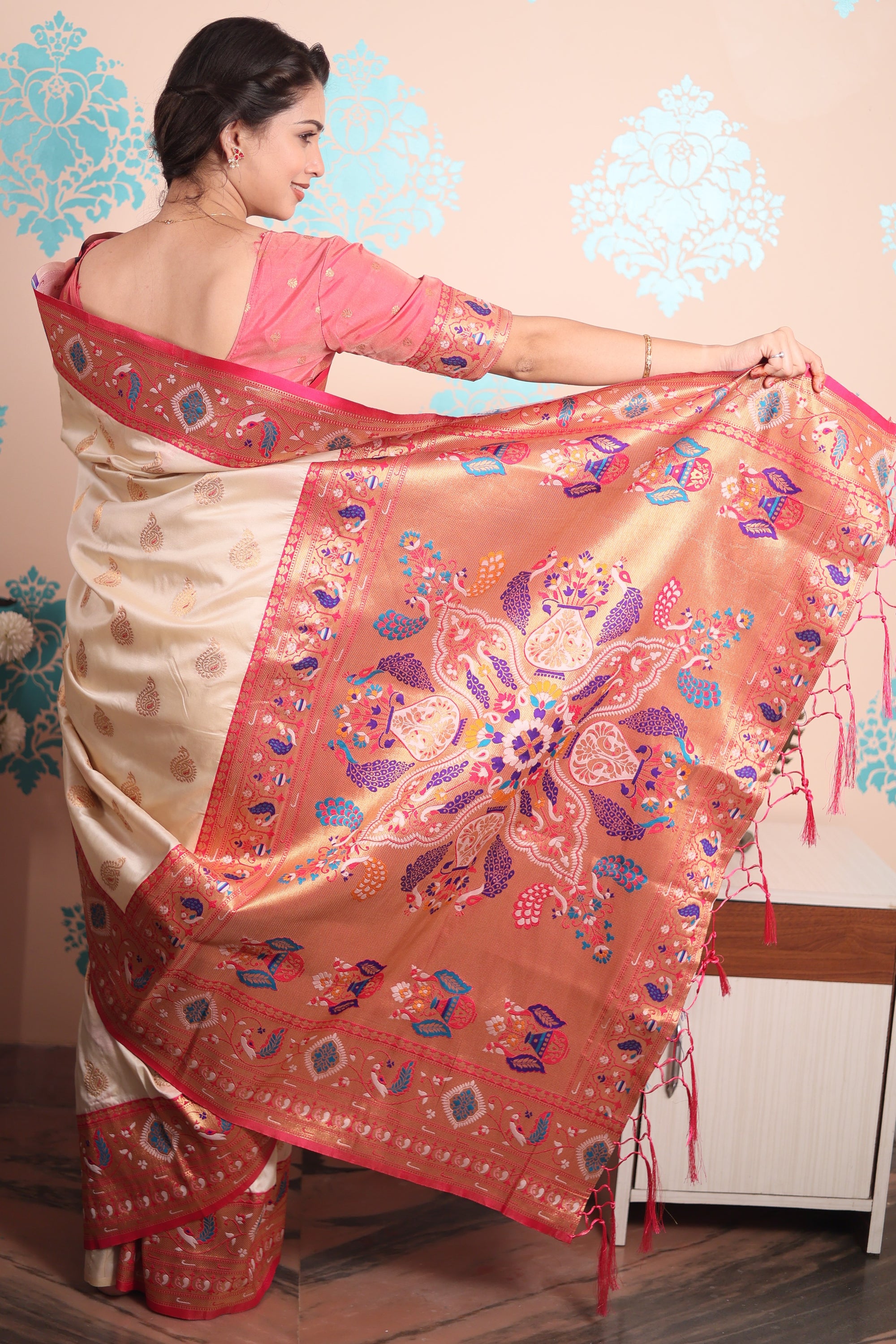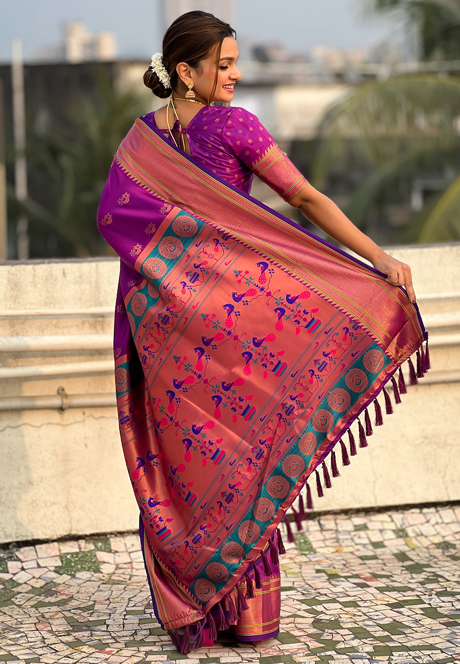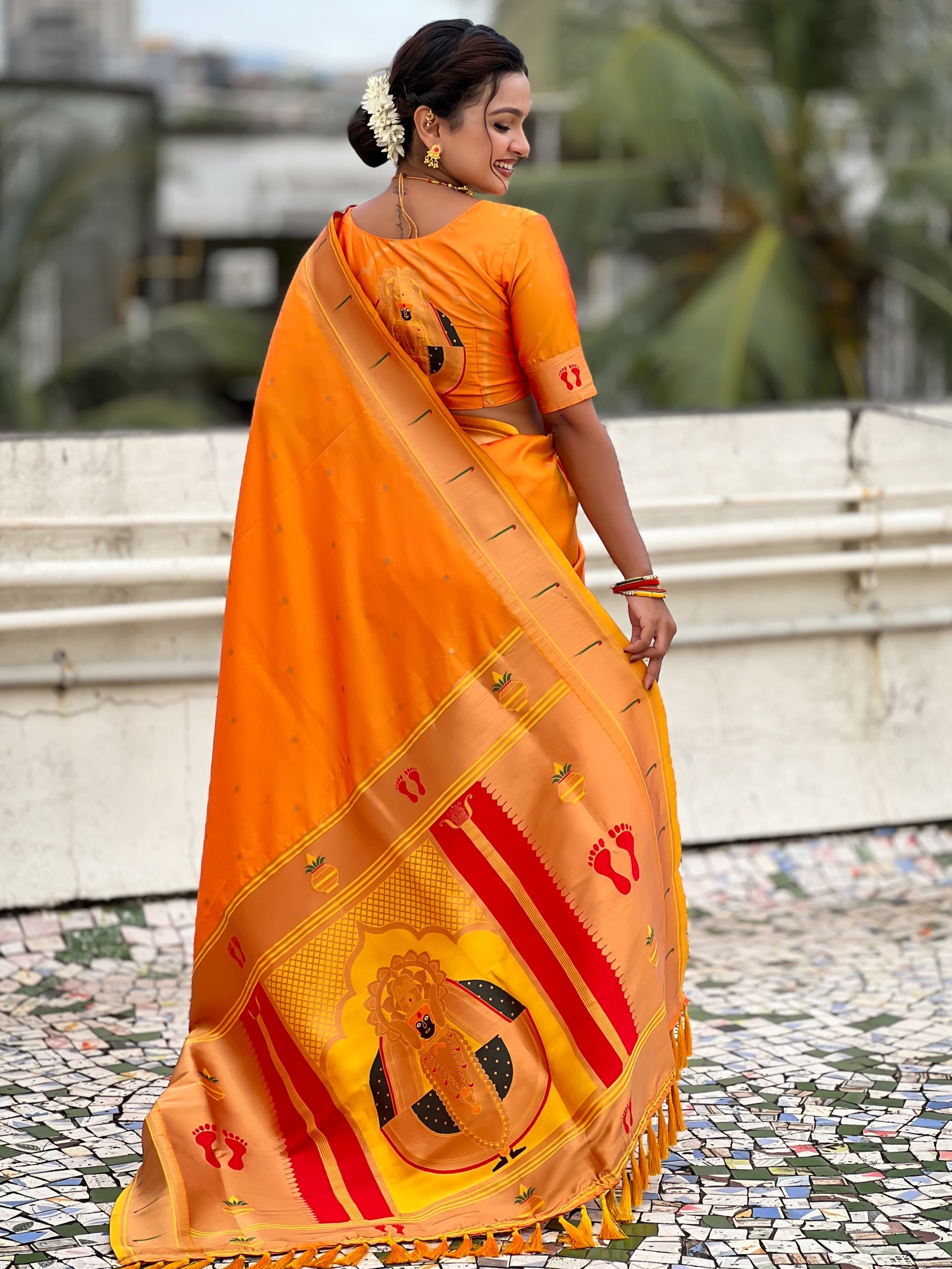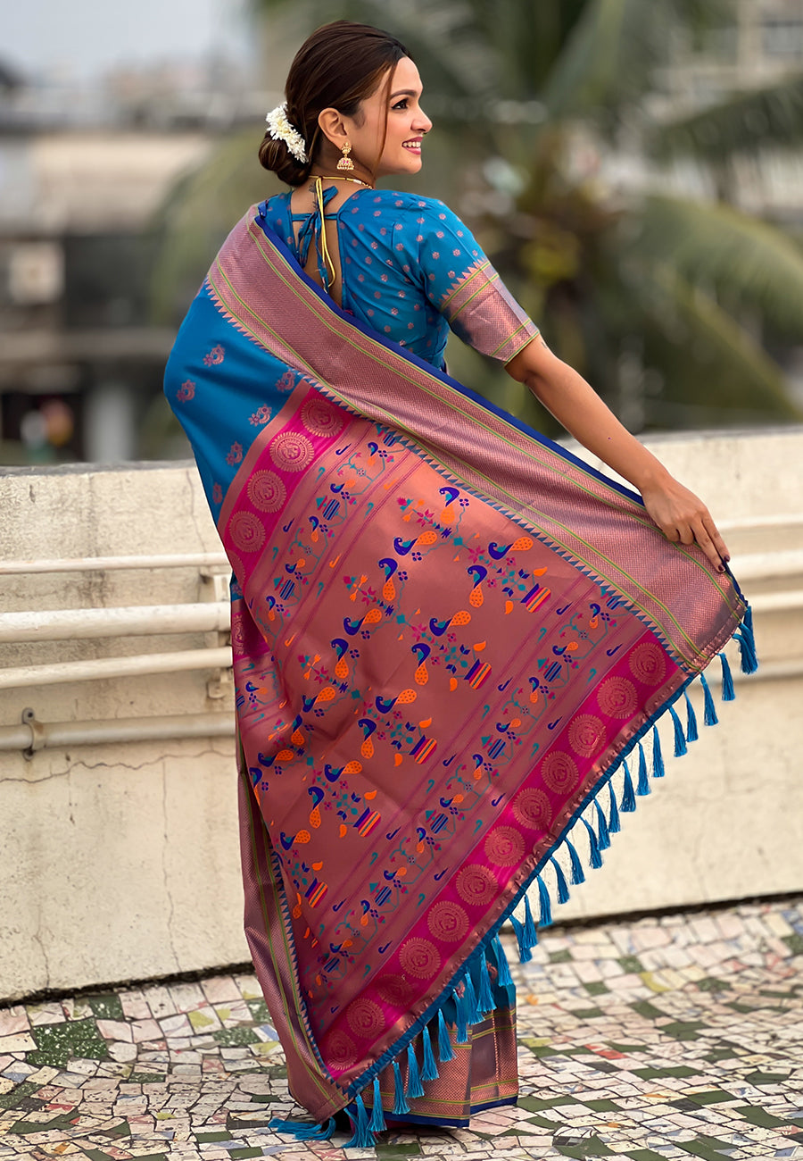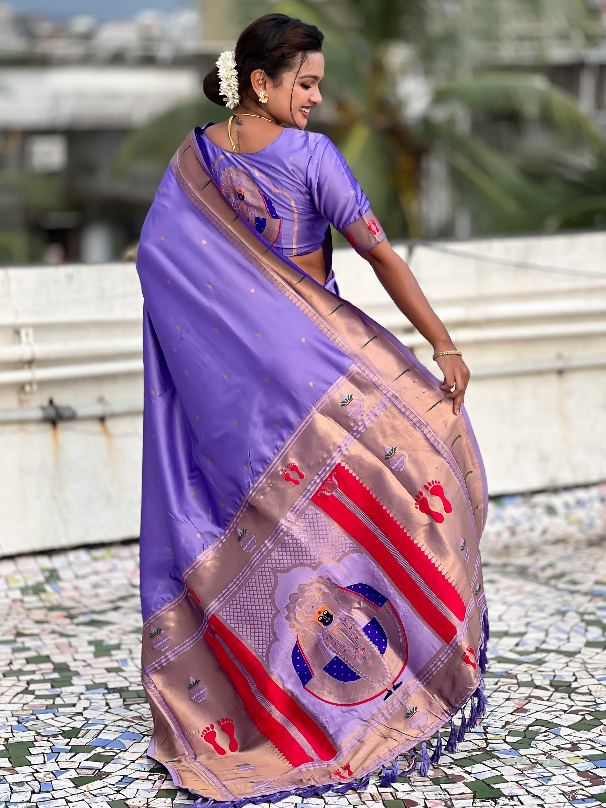 The Paithani saree is a true symbol of grace and heritage, crafted with luxurious silk and vibrant colors. Its intricate zari work, adorned with beautiful peacock and floral motifs, reflects unmatched artistry. A perfect blend of tradition and elegance, it is a treasure that enhances the beauty of every occasion, making every woman feel royal and radiant.