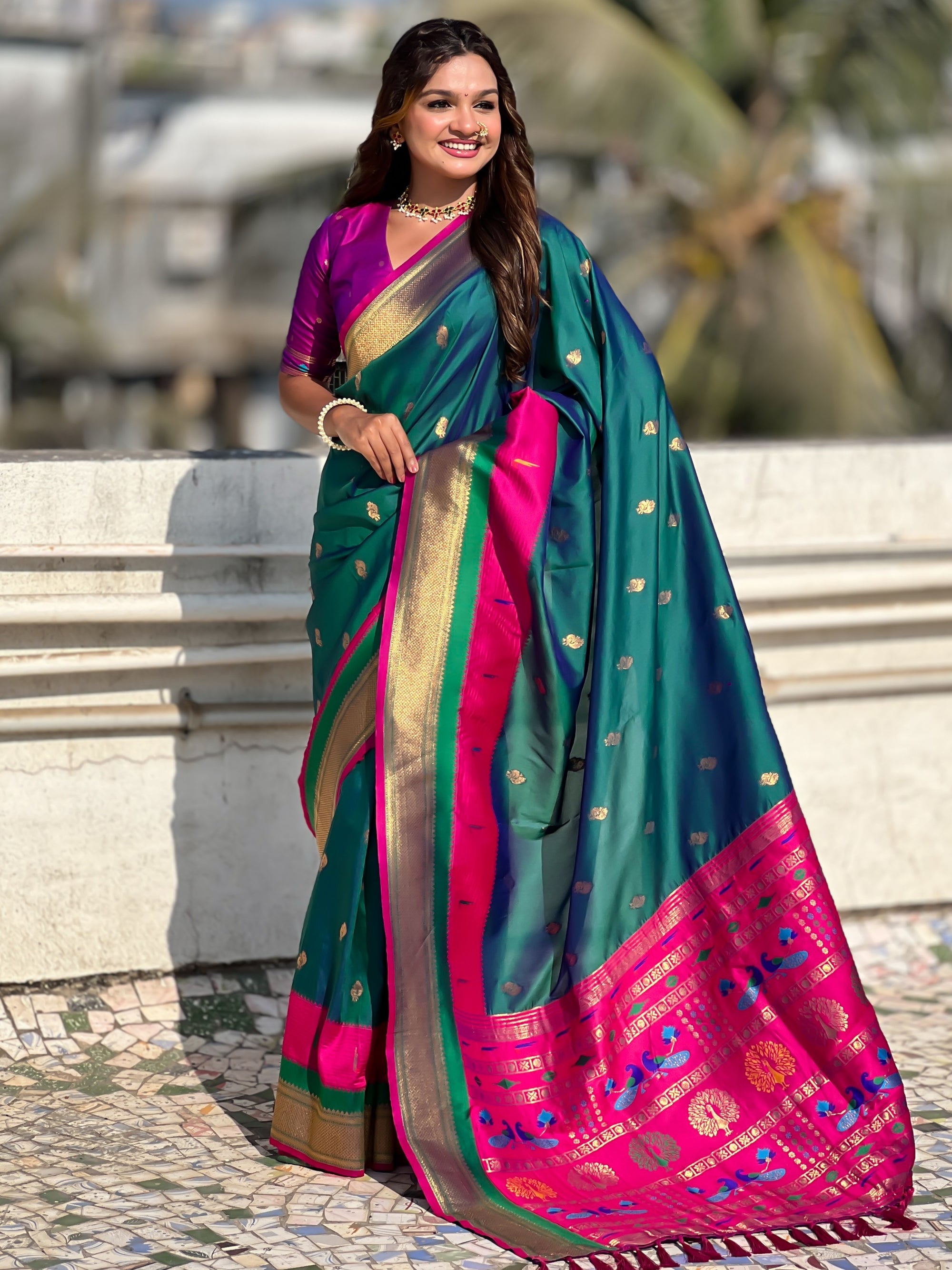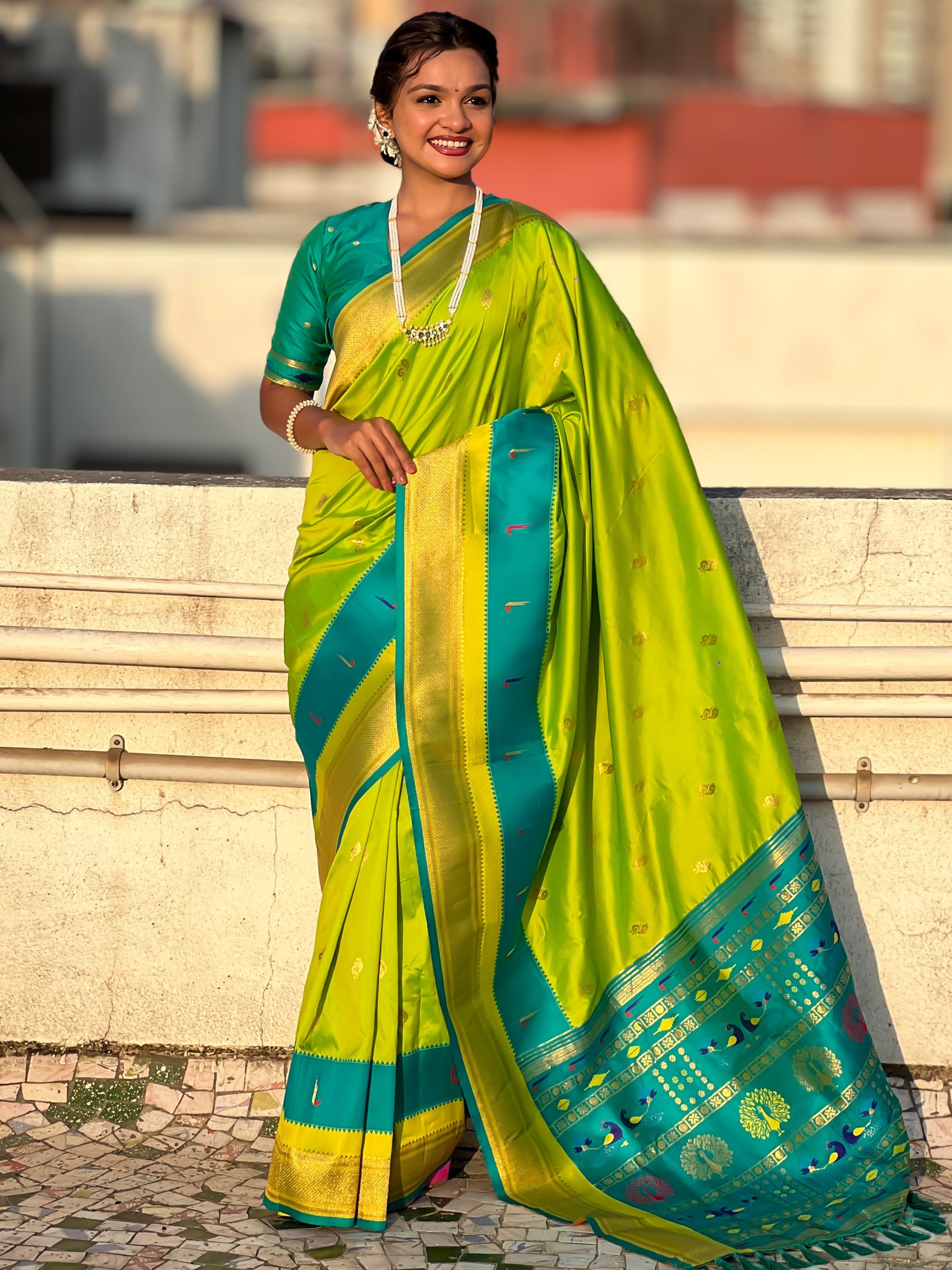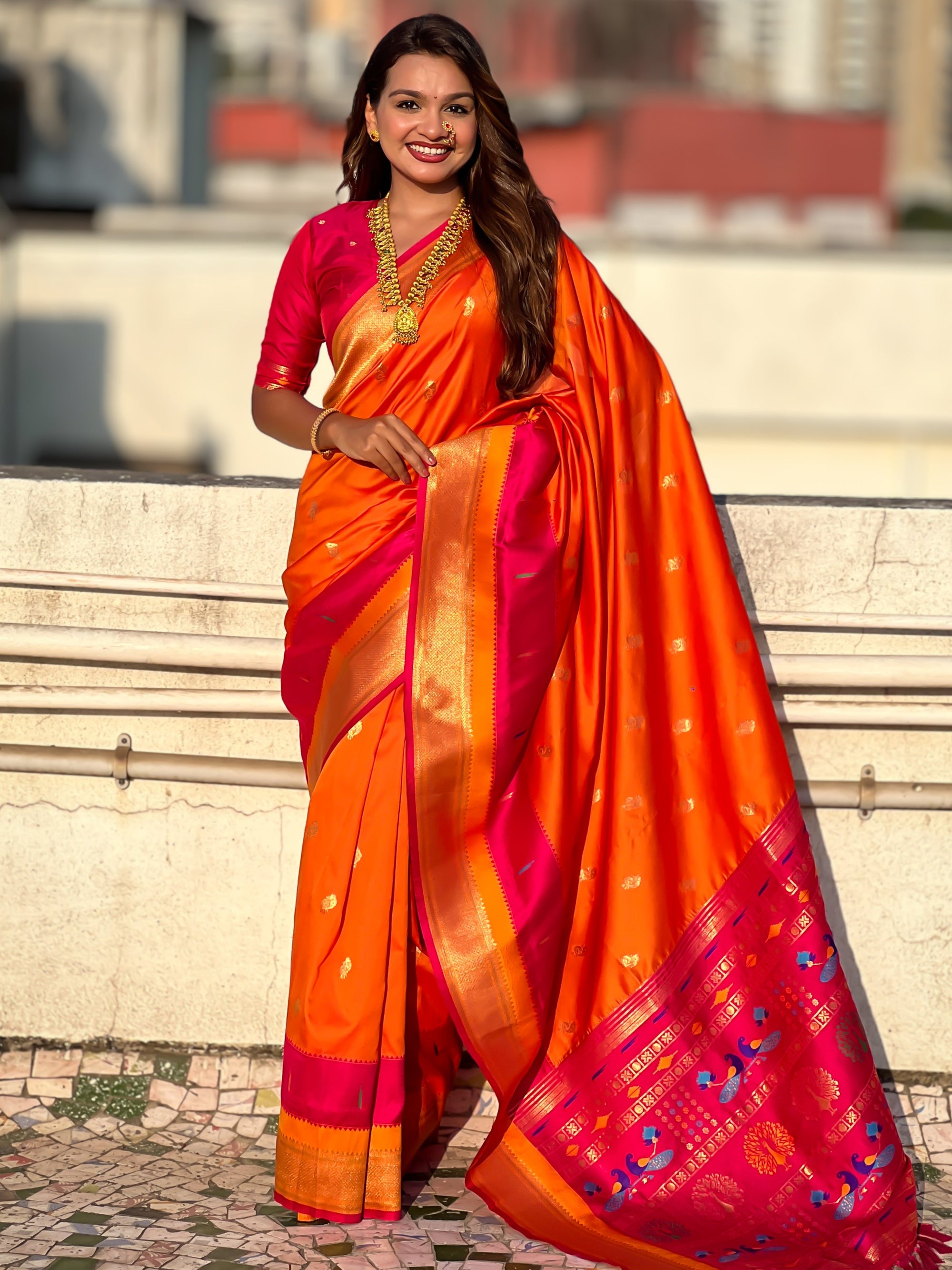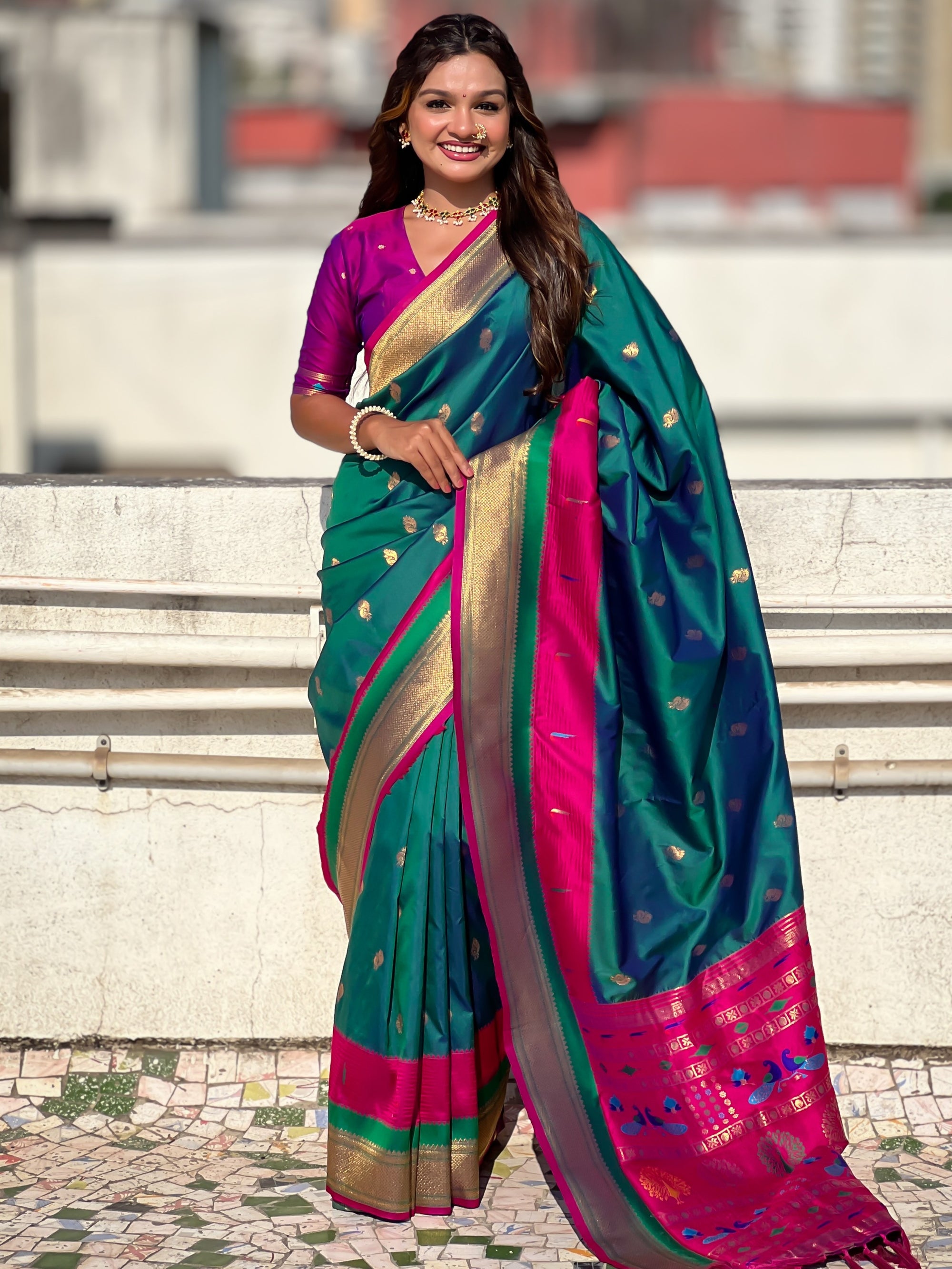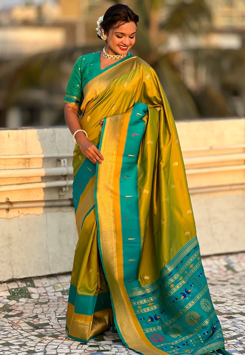The Paithani saree is a true symbol of grace and heritage, crafted with luxurious silk and vibrant colors. Its intricate zari work, adorned with beautiful peacock and floral motifs, reflects unmatched artistry. A perfect blend of tradition and elegance, it is a treasure that enhances the beauty of every occasion, making every woman feel royal and radiant.