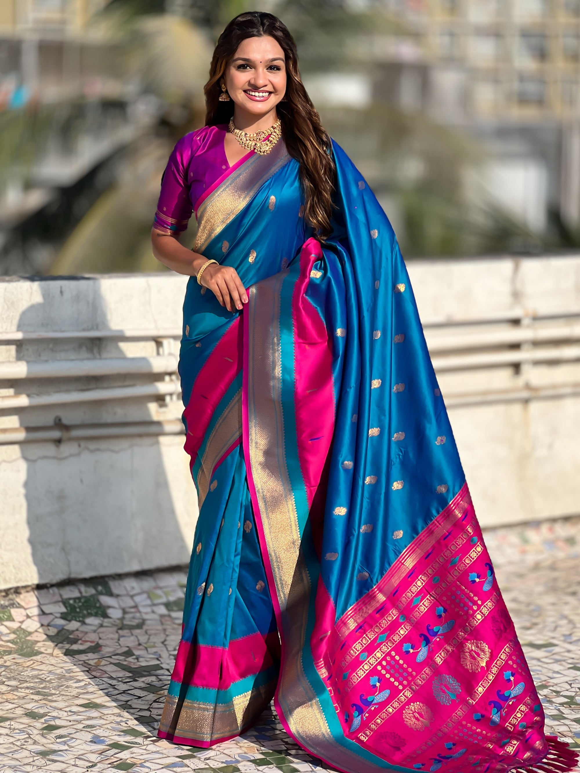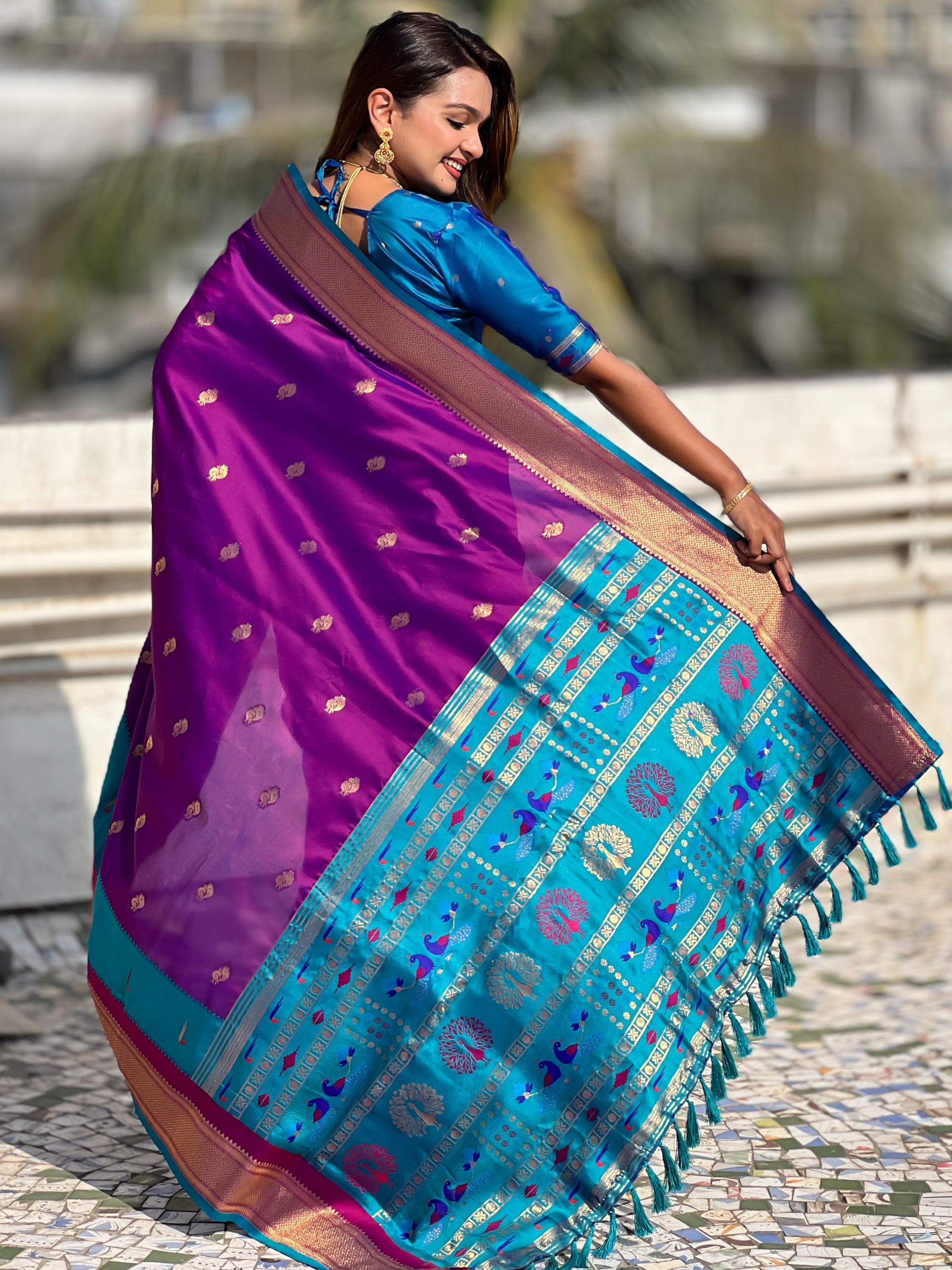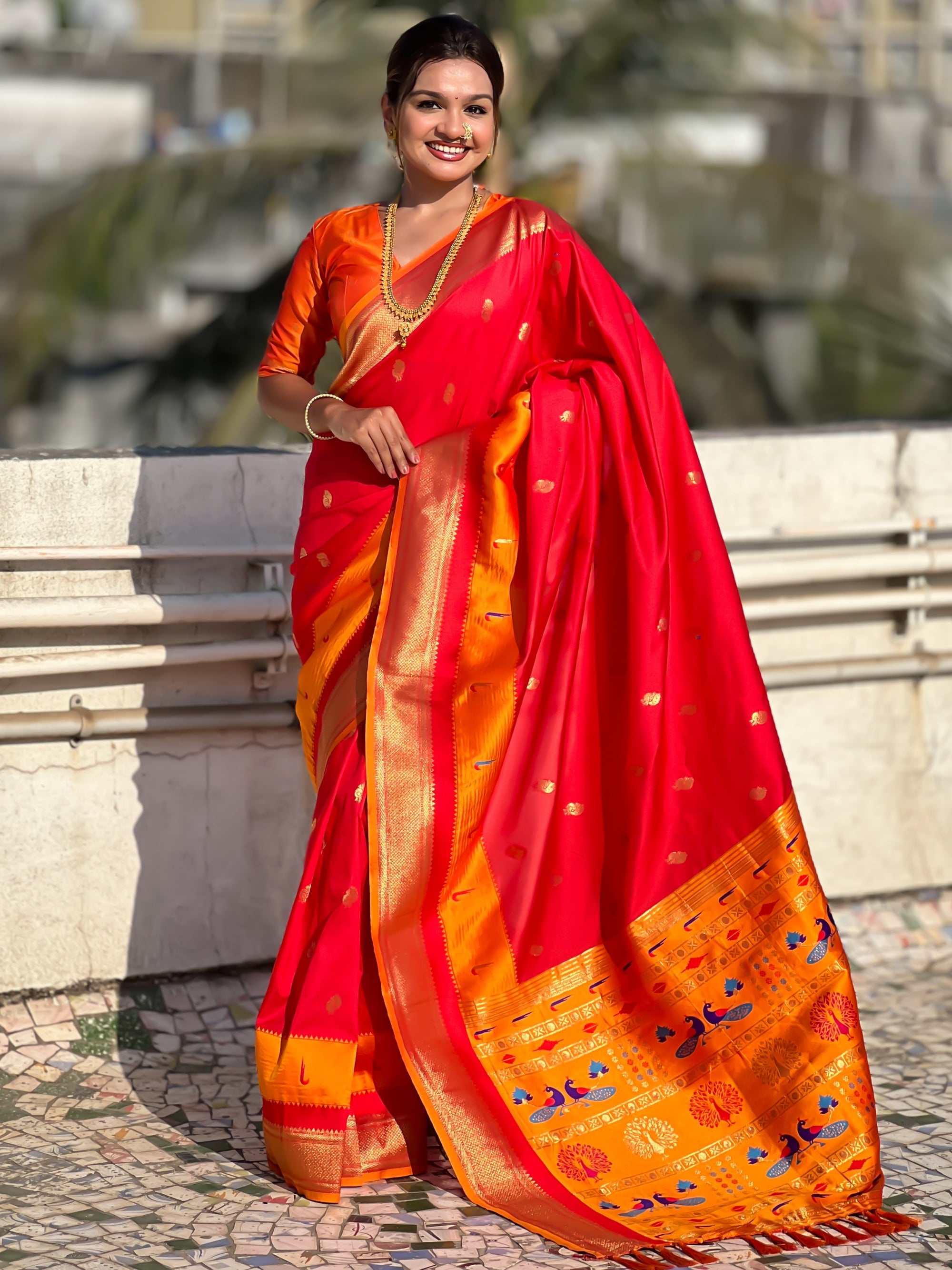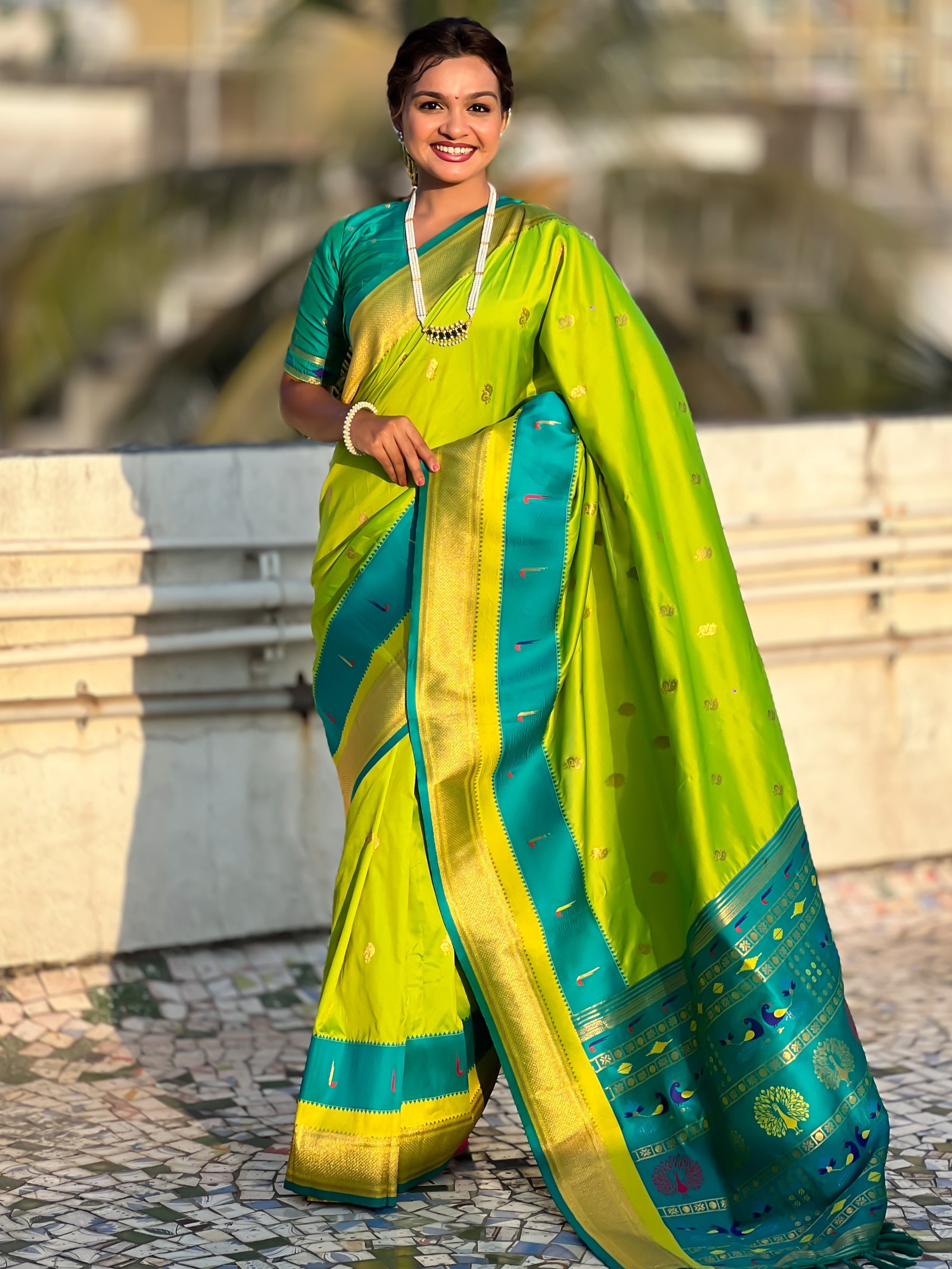 The Paithani saree is a true symbol of grace and heritage, crafted with luxurious silk and vibrant colors. Its intricate zari work, adorned with beautiful peacock and floral motifs, reflects unmatched artistry. A perfect blend of tradition and elegance, it is a treasure that enhances the beauty of every occasion, making every woman feel royal and radiant.