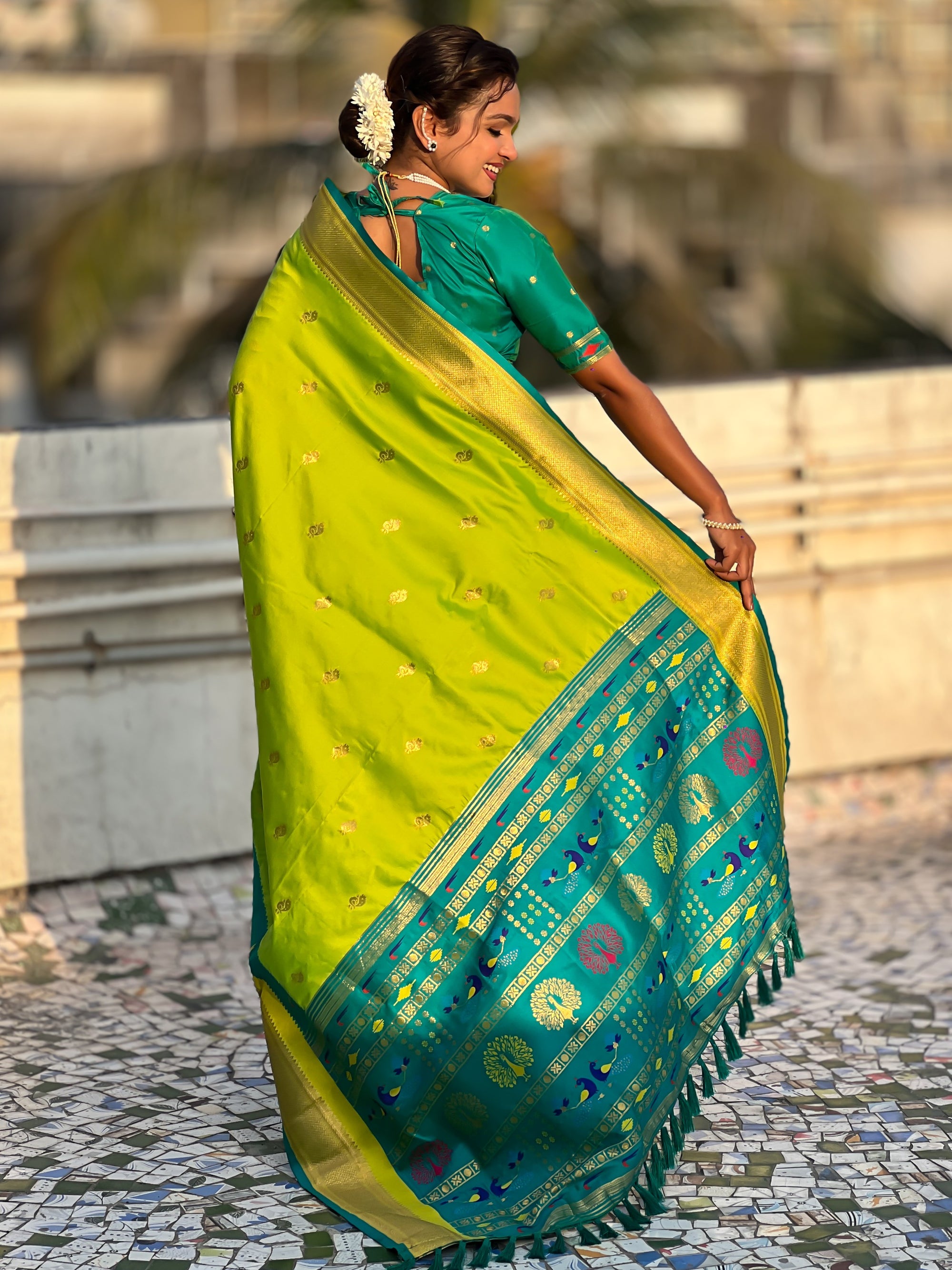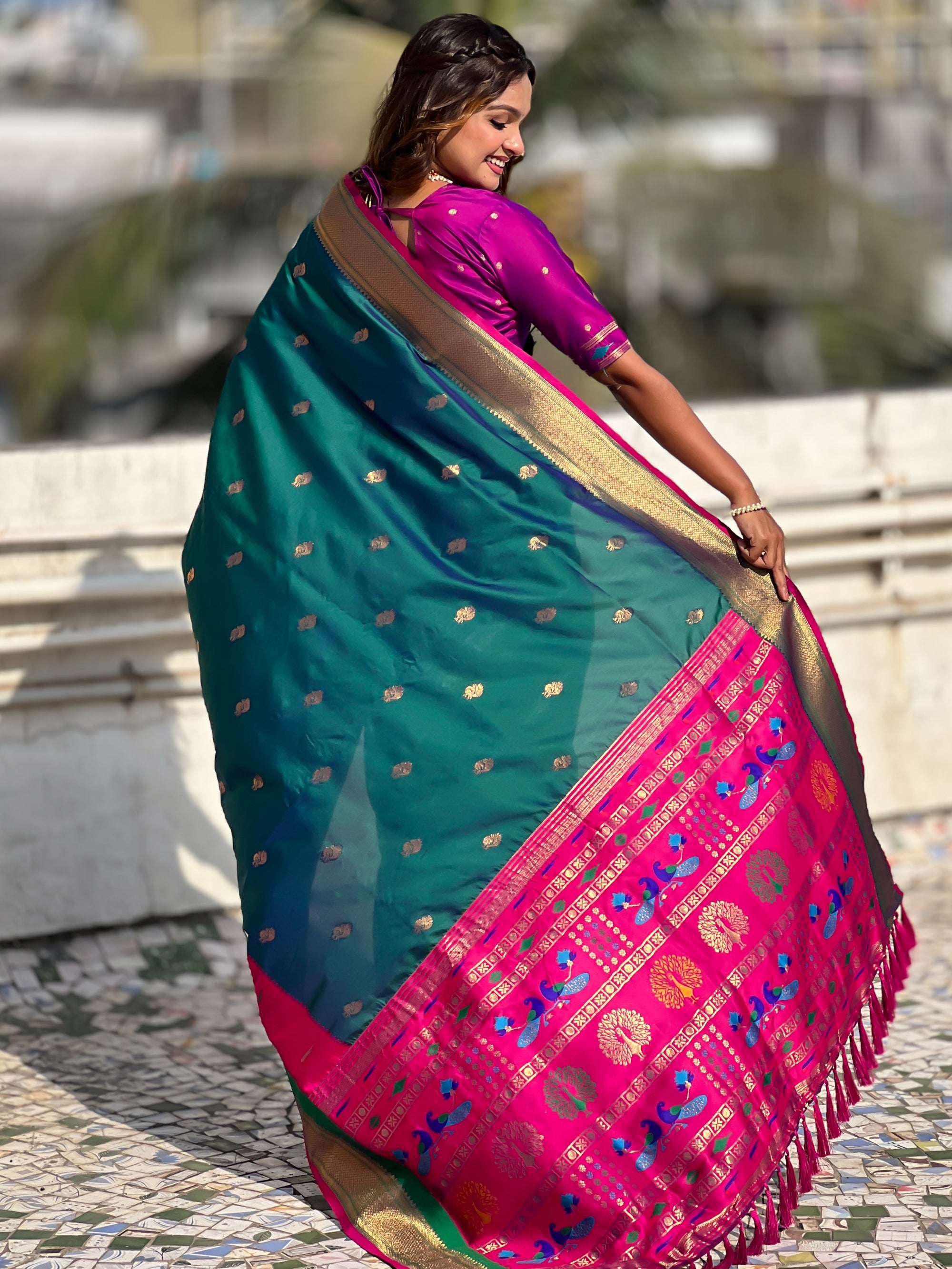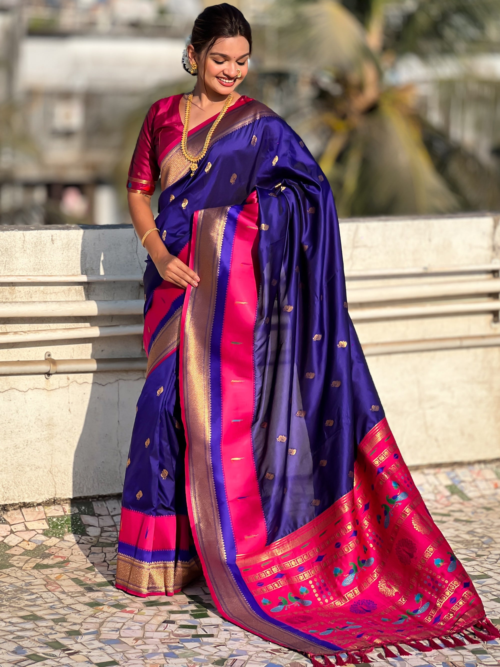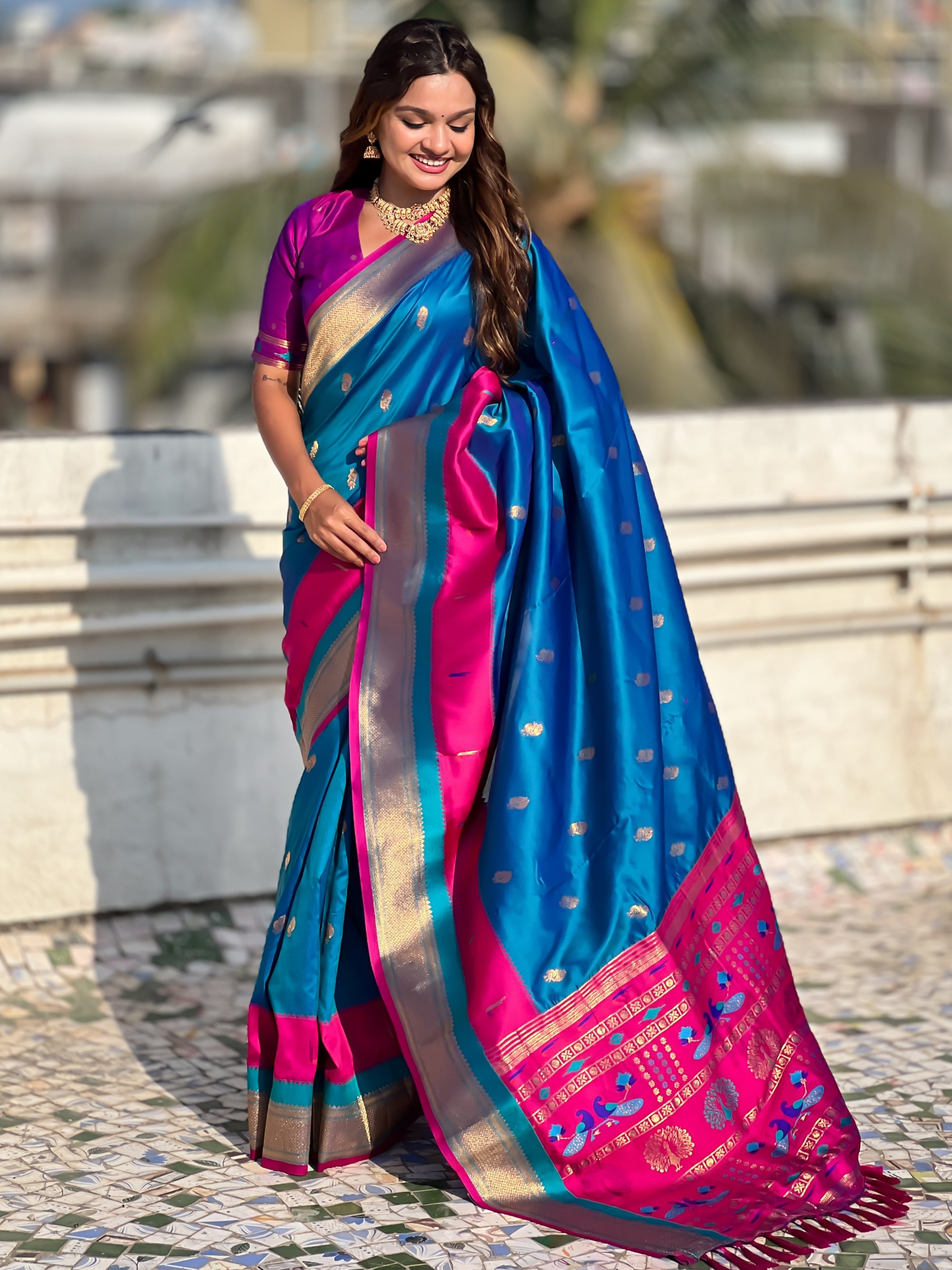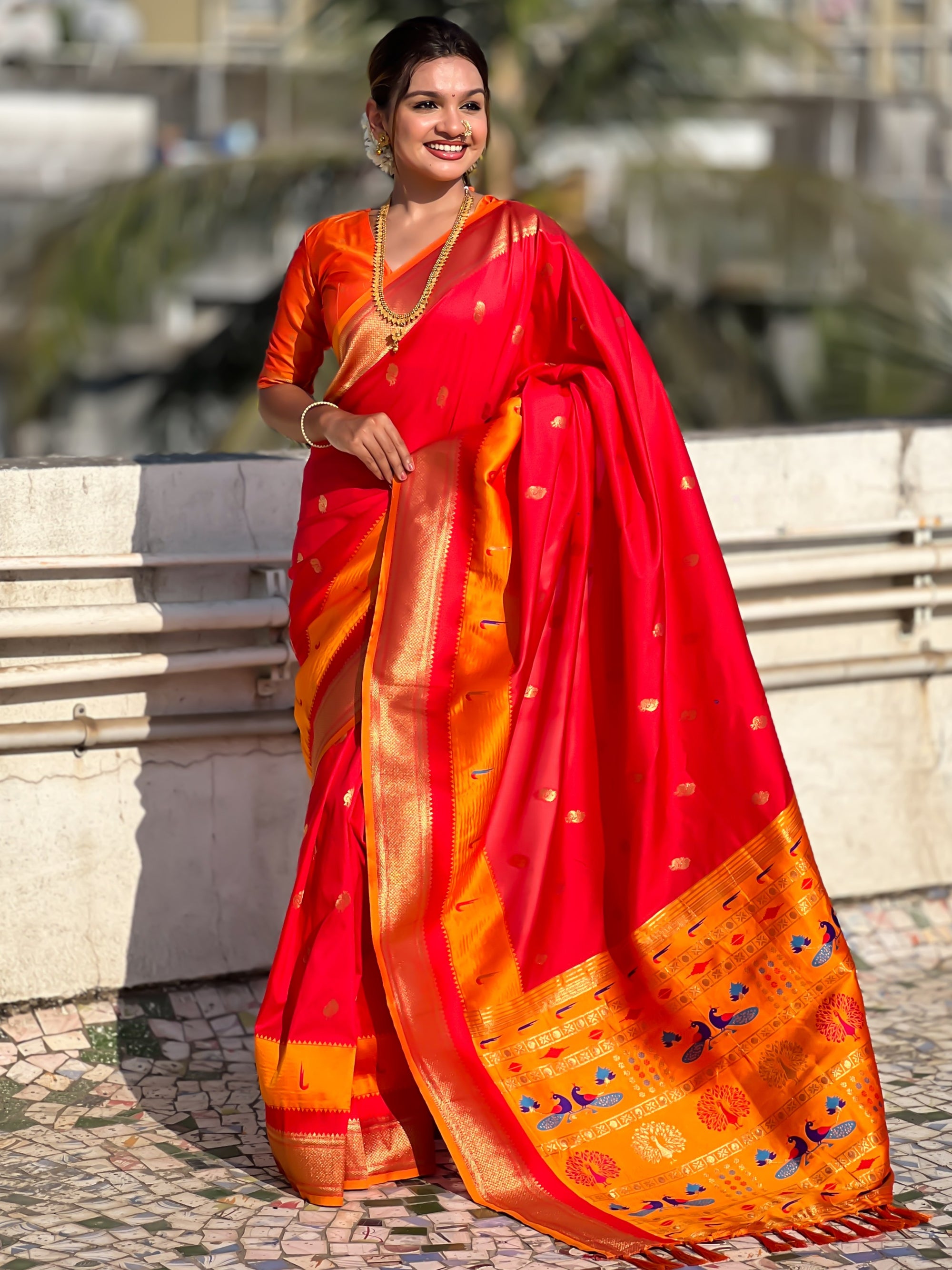 The Paithani saree is a true symbol of grace and heritage, crafted with luxurious silk and vibrant colors. Its intricate zari work, adorned with beautiful peacock and floral motifs, reflects unmatched artistry. A perfect blend of tradition and elegance, it is a treasure that enhances the beauty of every occasion, making every woman feel royal and radiant.