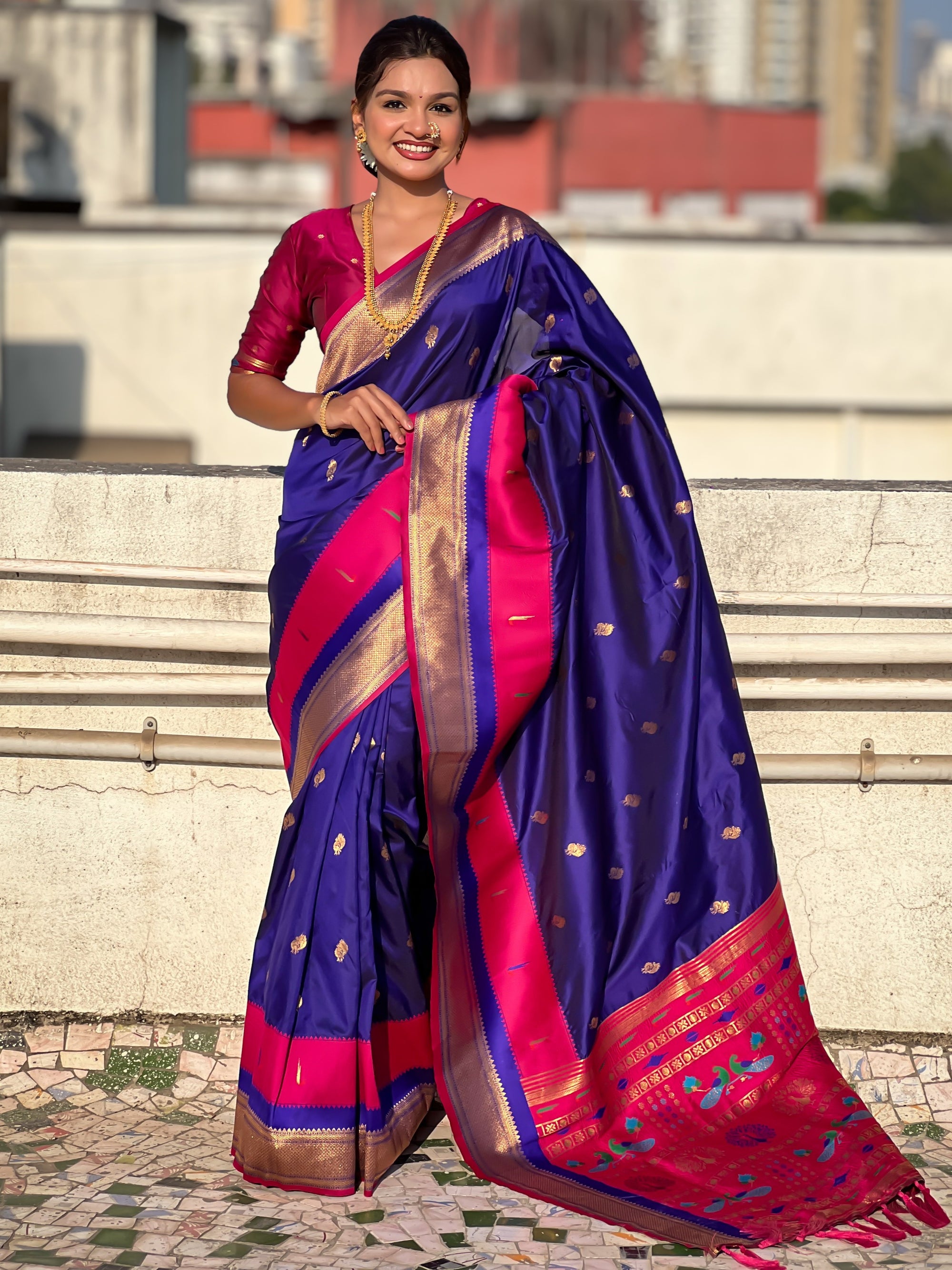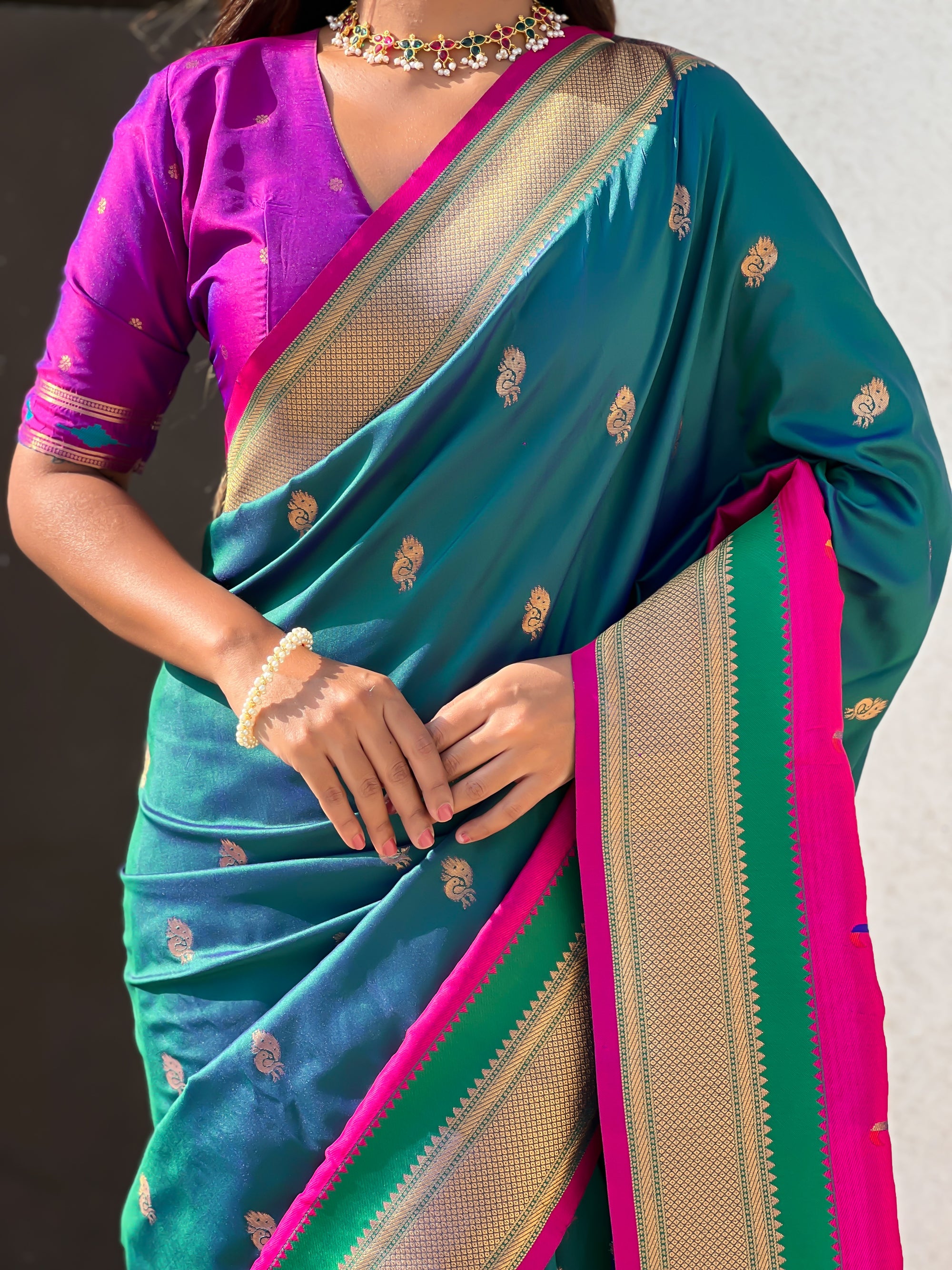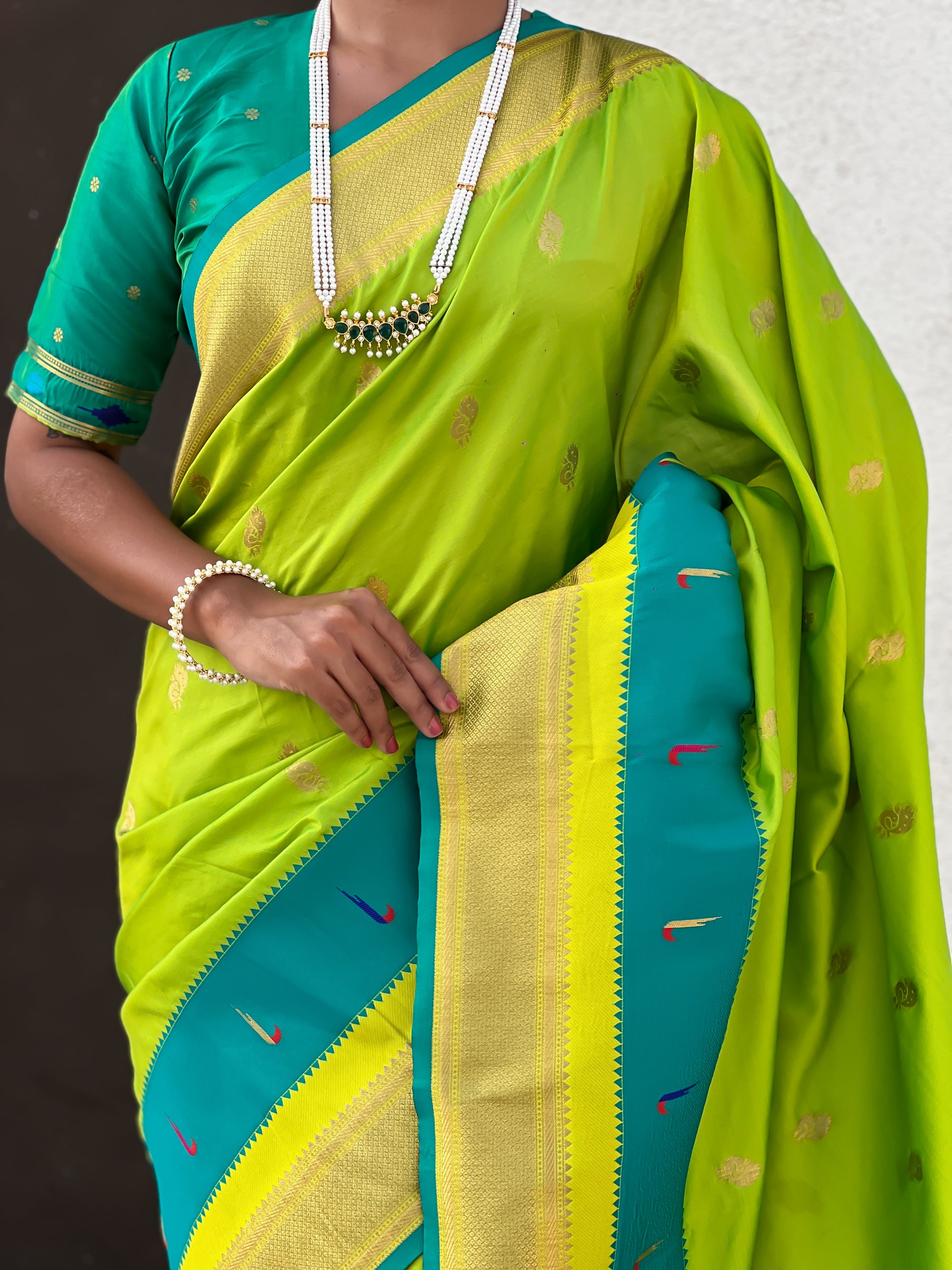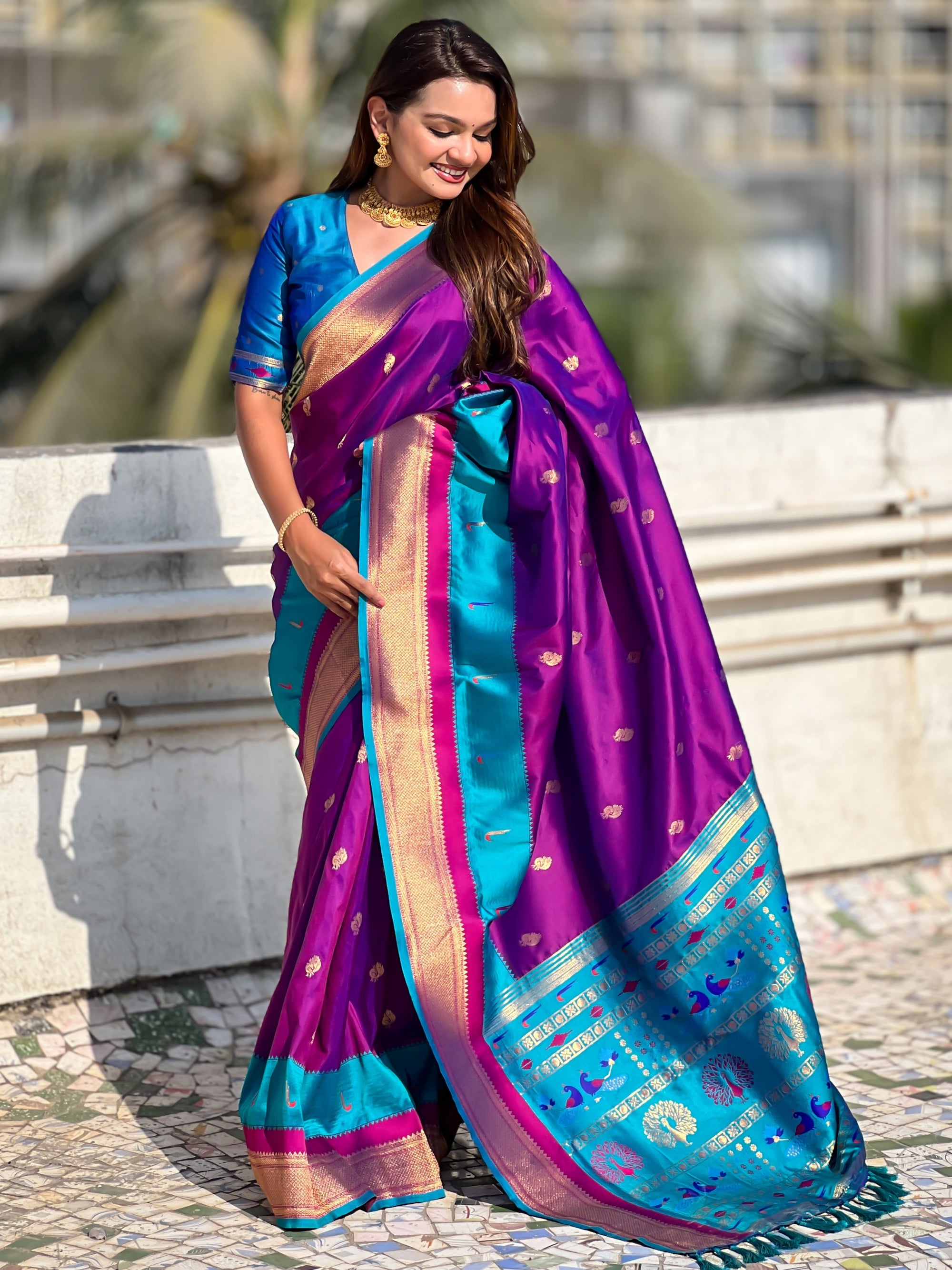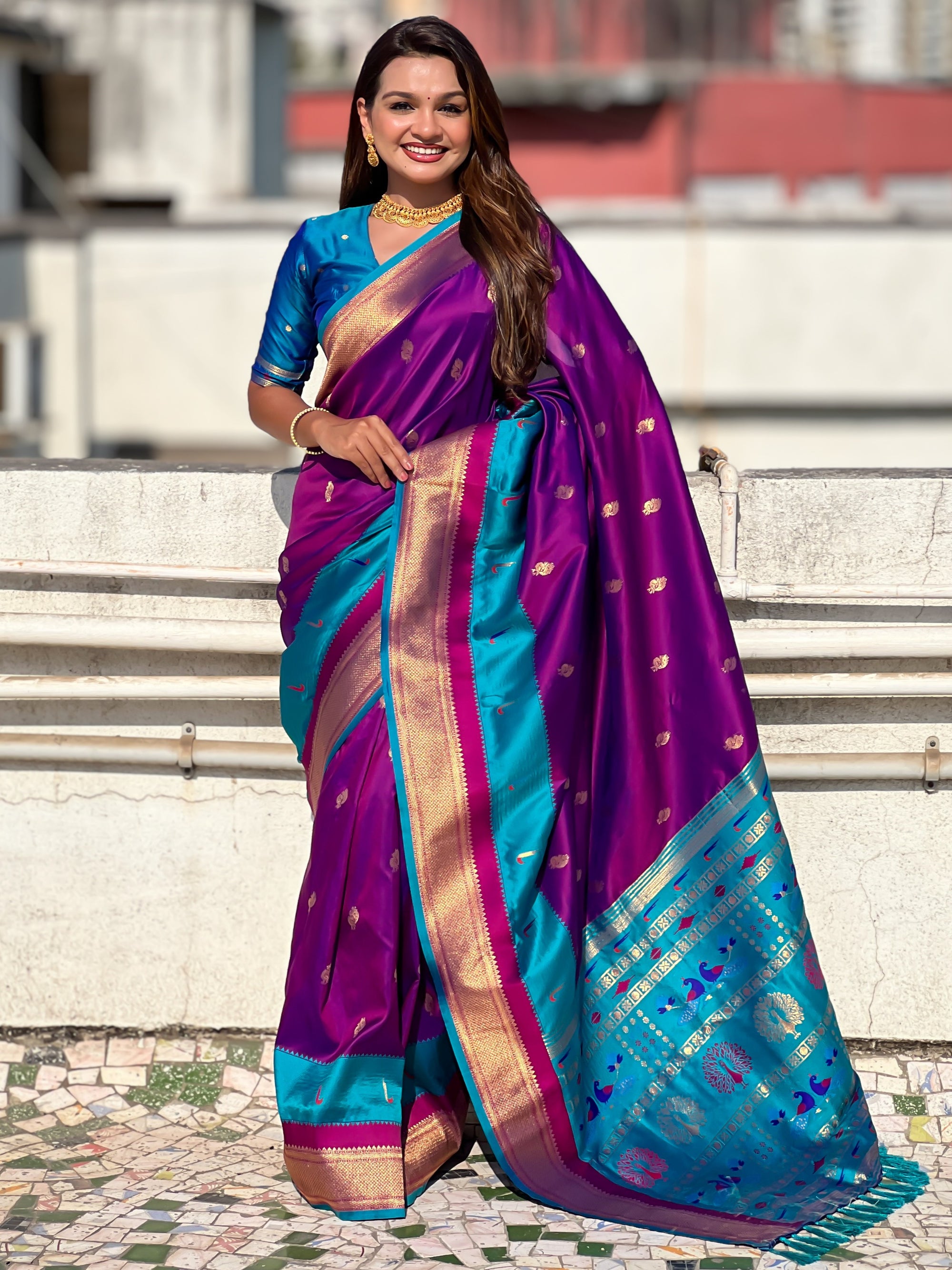 The Paithani saree is a true symbol of grace and heritage, crafted with luxurious silk and vibrant colors. Its intricate zari work, adorned with beautiful peacock and floral motifs, reflects unmatched artistry. A perfect blend of tradition and elegance, it is a treasure that enhances the beauty of every occasion, making every woman feel royal and radiant.