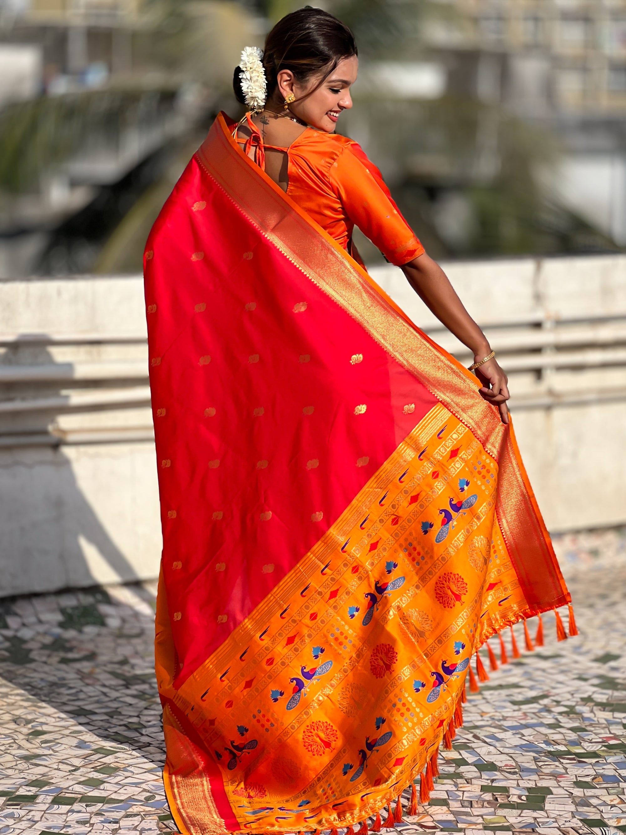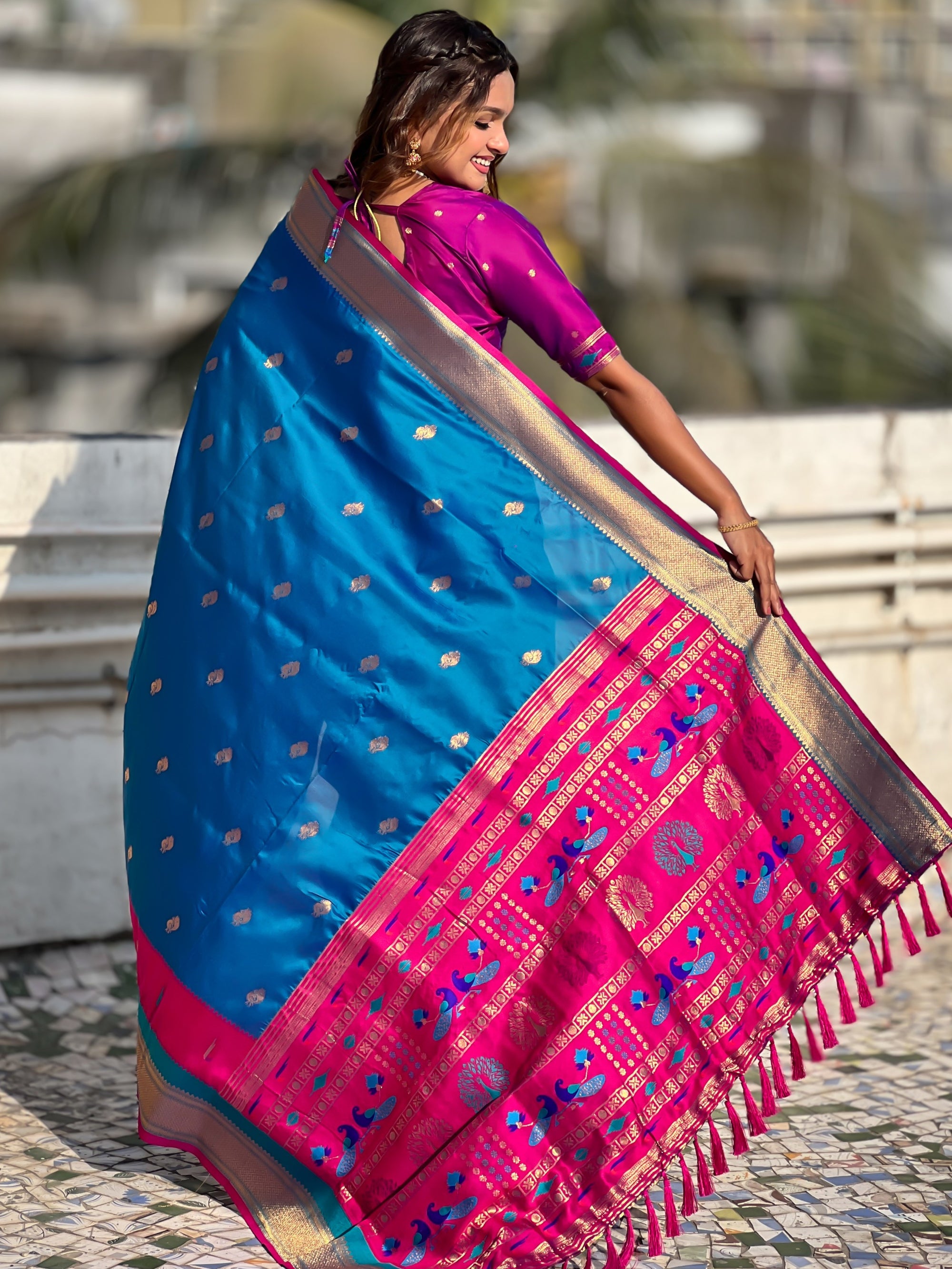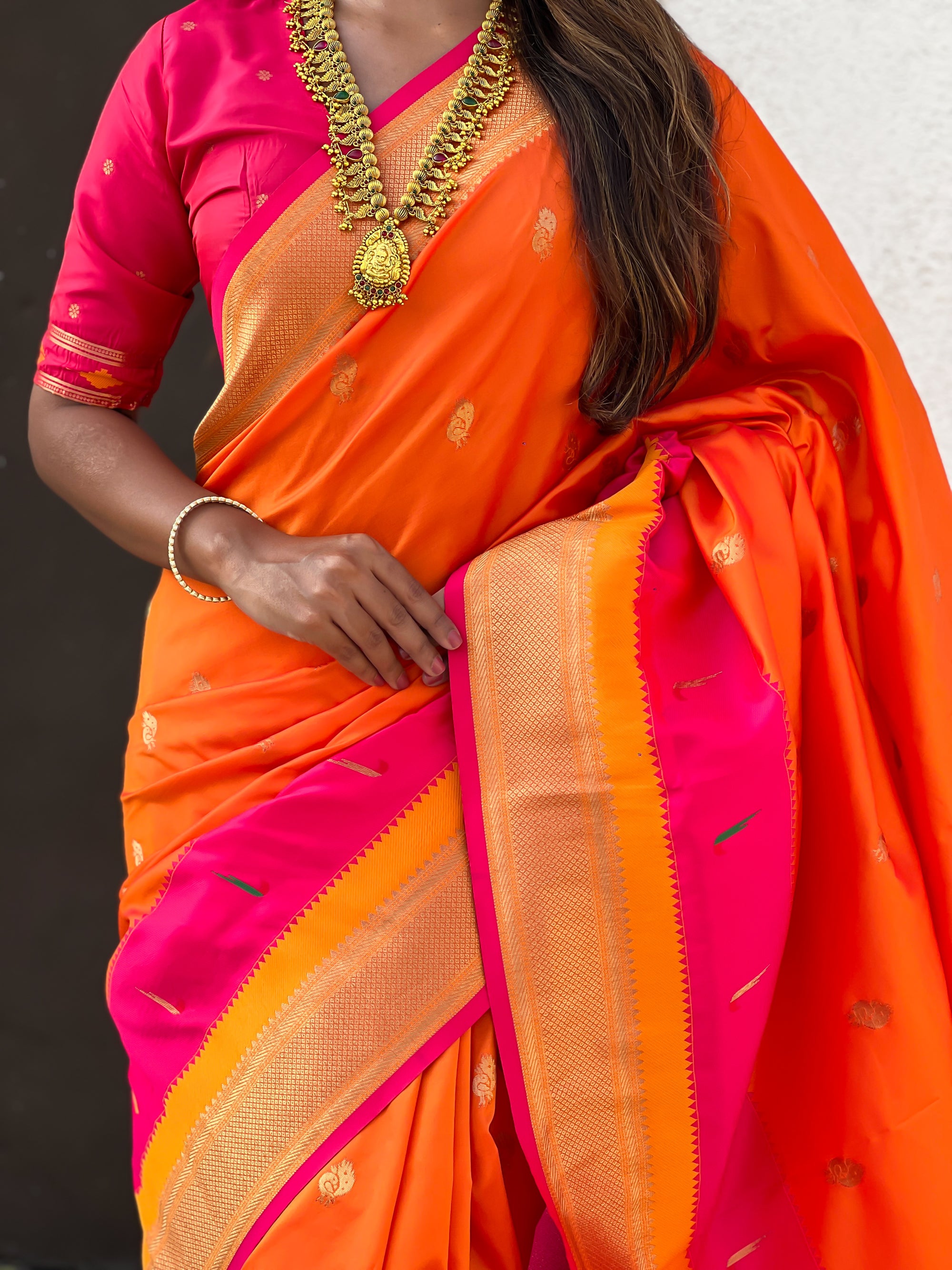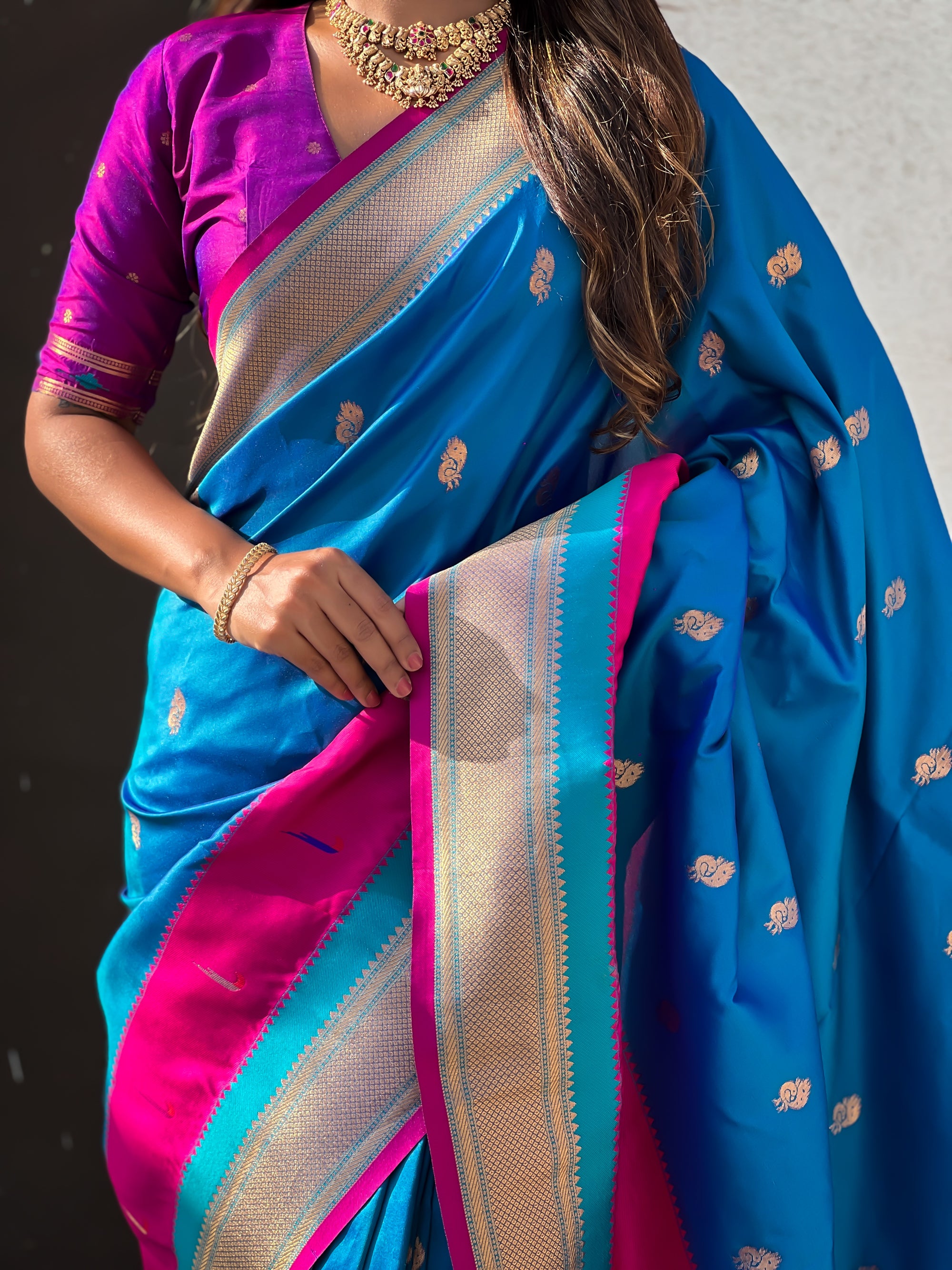 The Paithani saree is a true symbol of grace and heritage, crafted with luxurious silk and vibrant colors. Its intricate zari work, adorned with beautiful peacock and floral motifs, reflects unmatched artistry. A perfect blend of tradition and elegance, it is a treasure that enhances the beauty of every occasion, making every woman feel royal and radiant.
