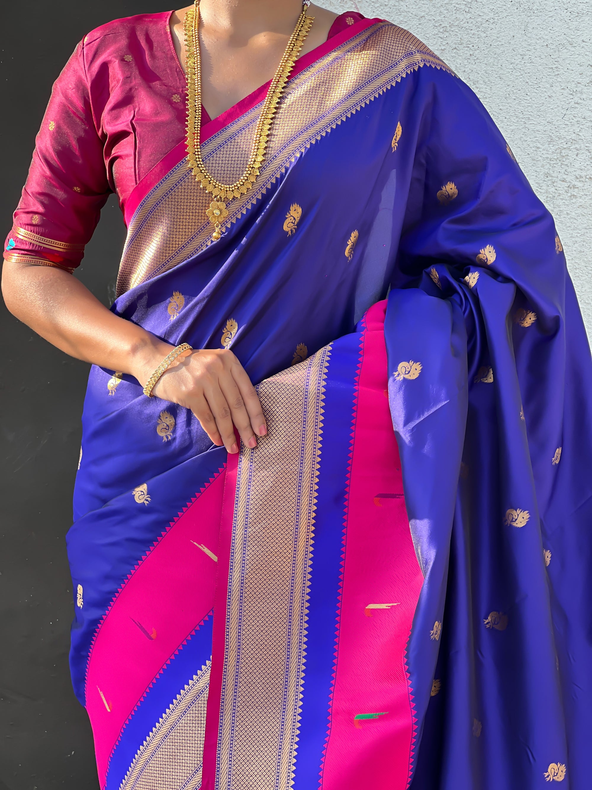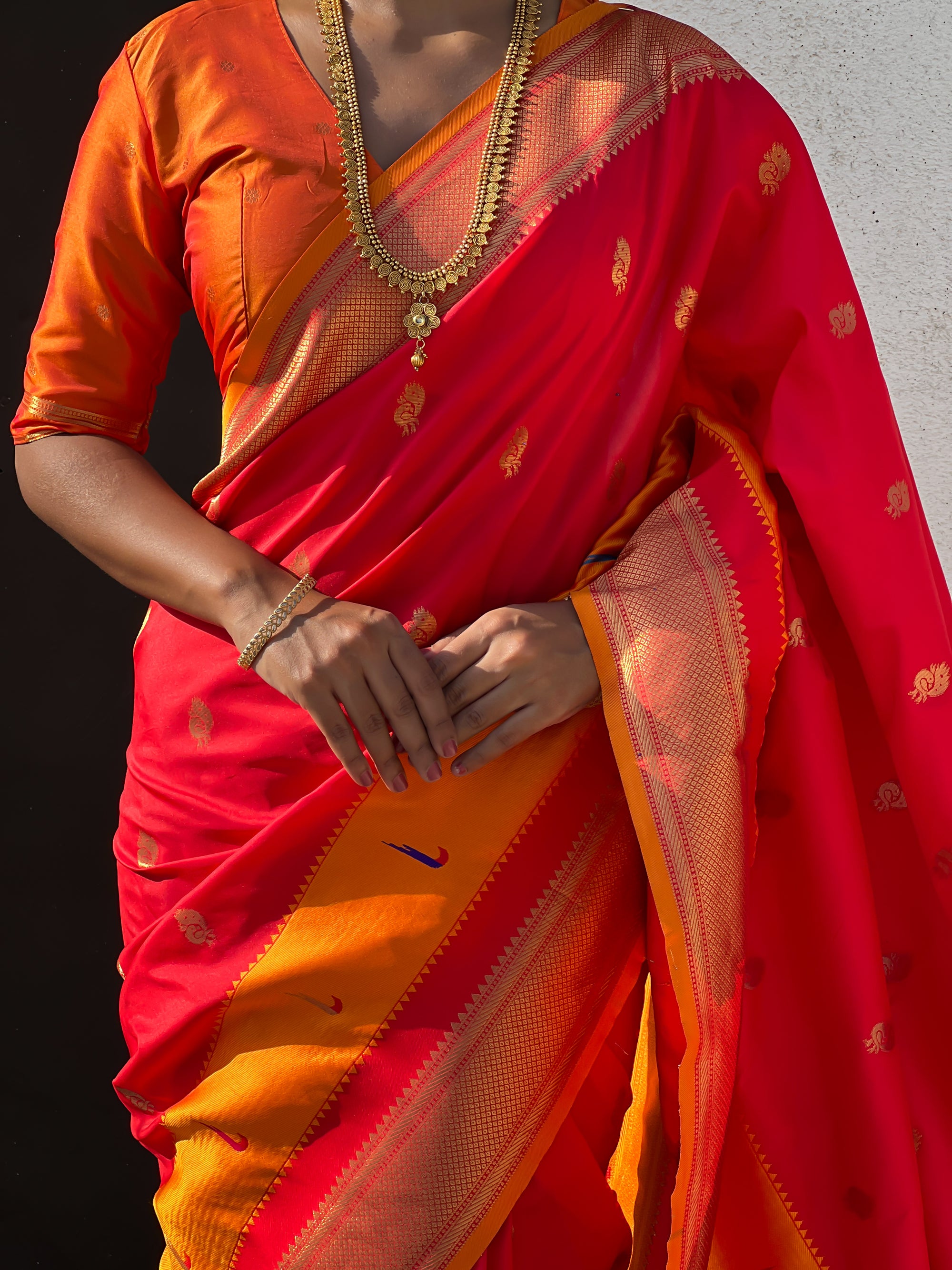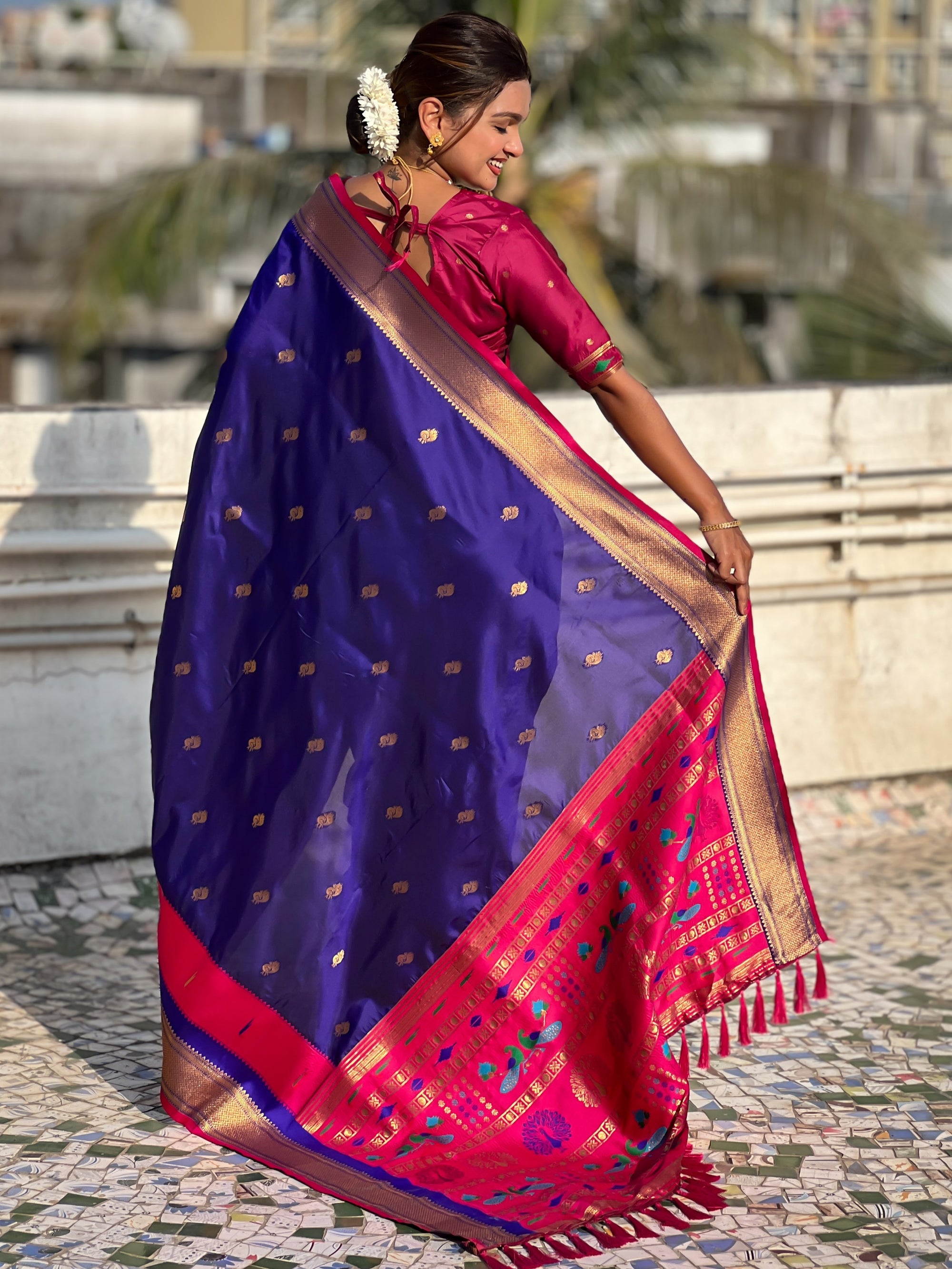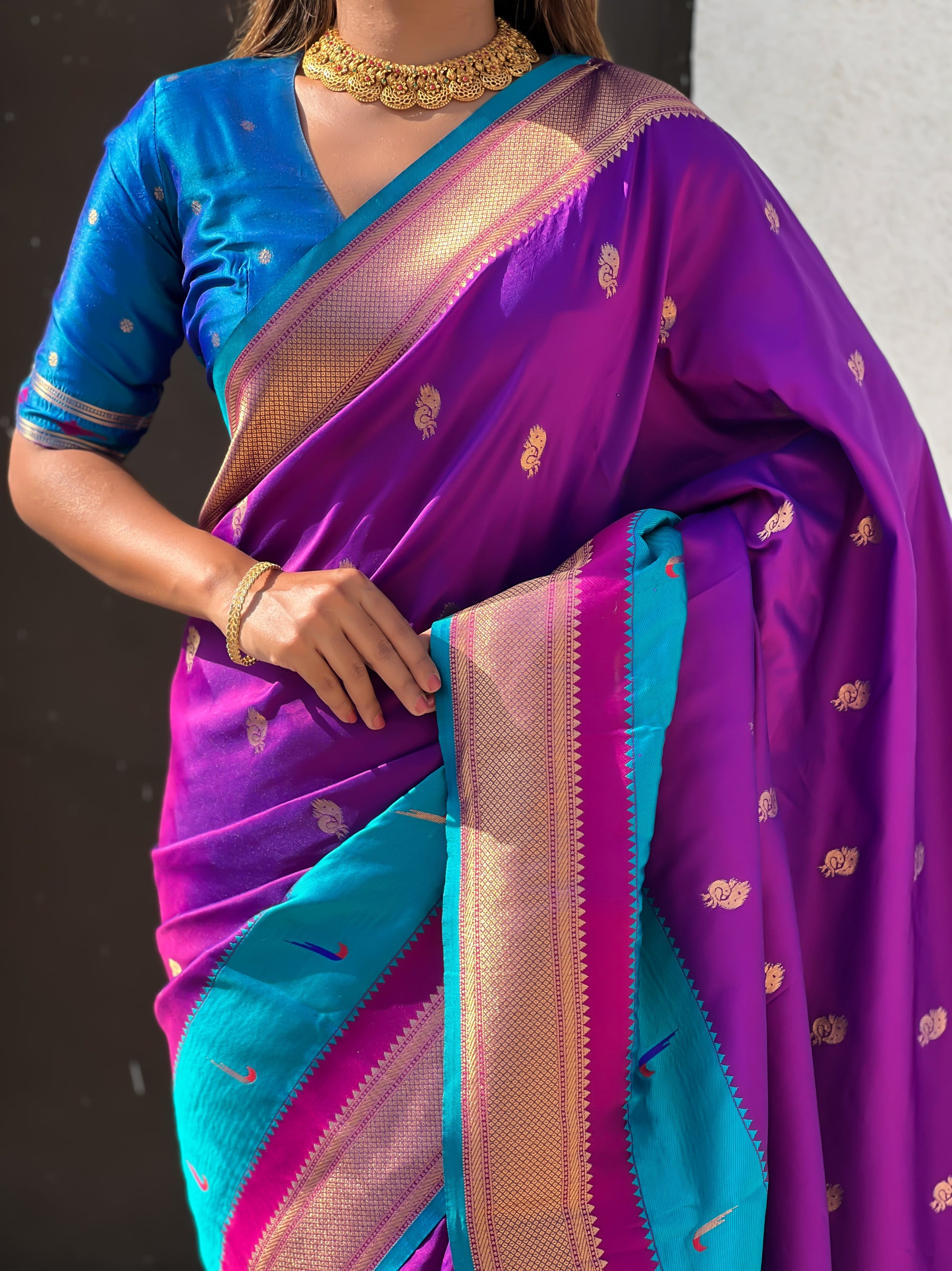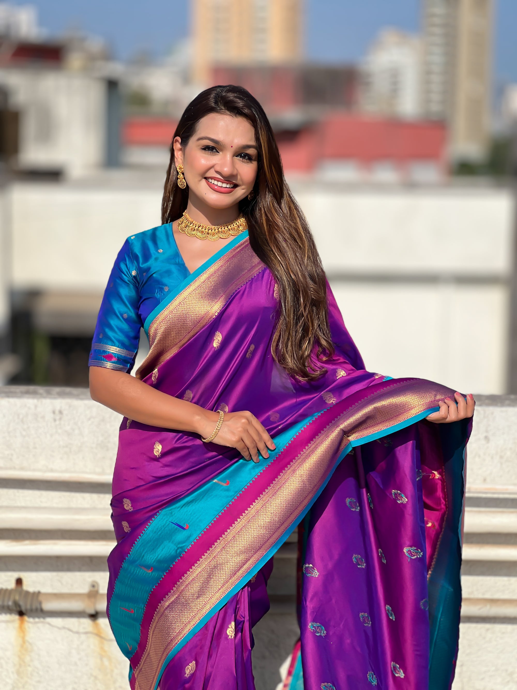 The Paithani saree is a true symbol of grace and heritage, crafted with luxurious silk and vibrant colors. Its intricate zari work, adorned with beautiful peacock and floral motifs, reflects unmatched artistry. A perfect blend of tradition and elegance, it is a treasure that enhances the beauty of every occasion, making every woman feel royal and radiant.